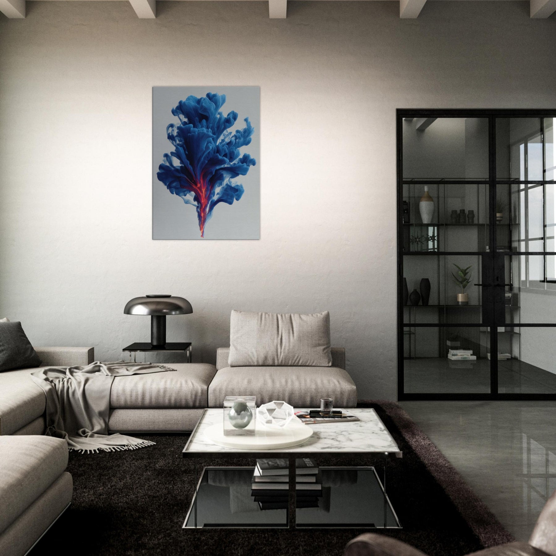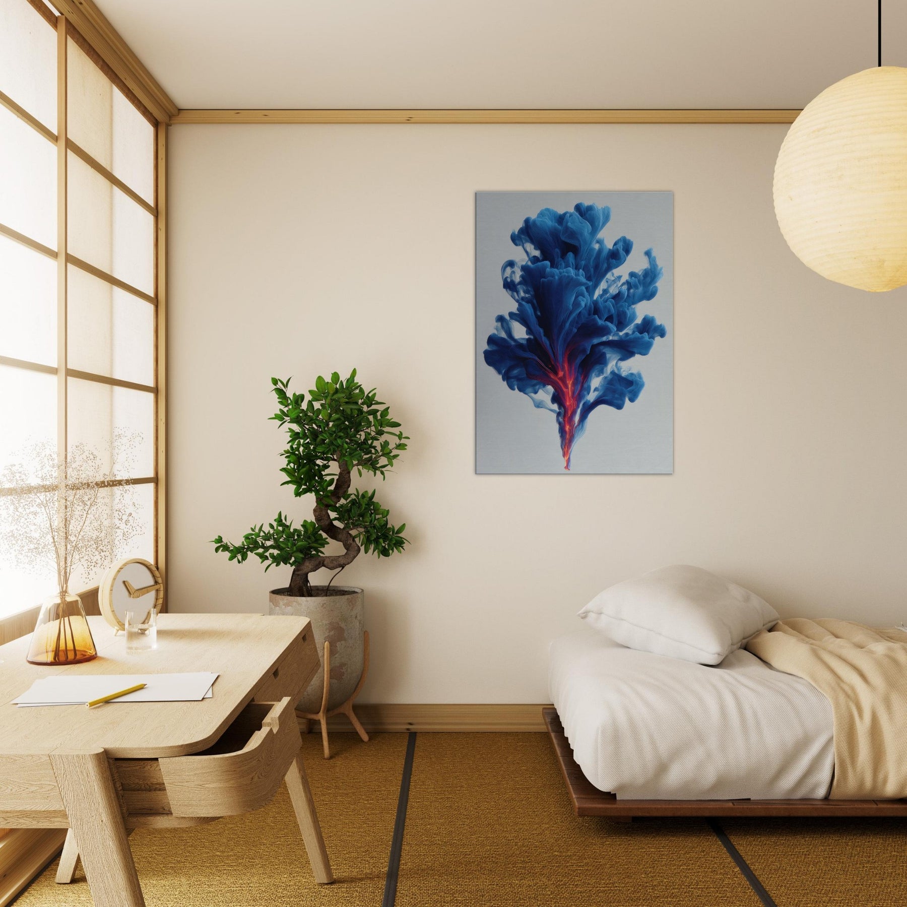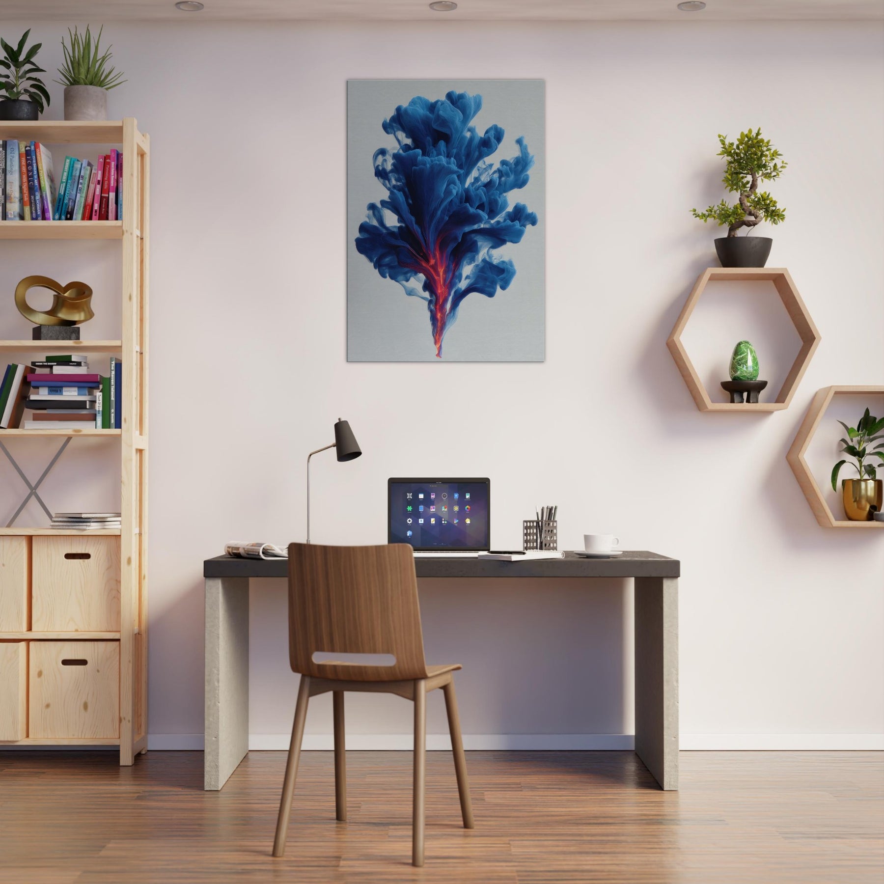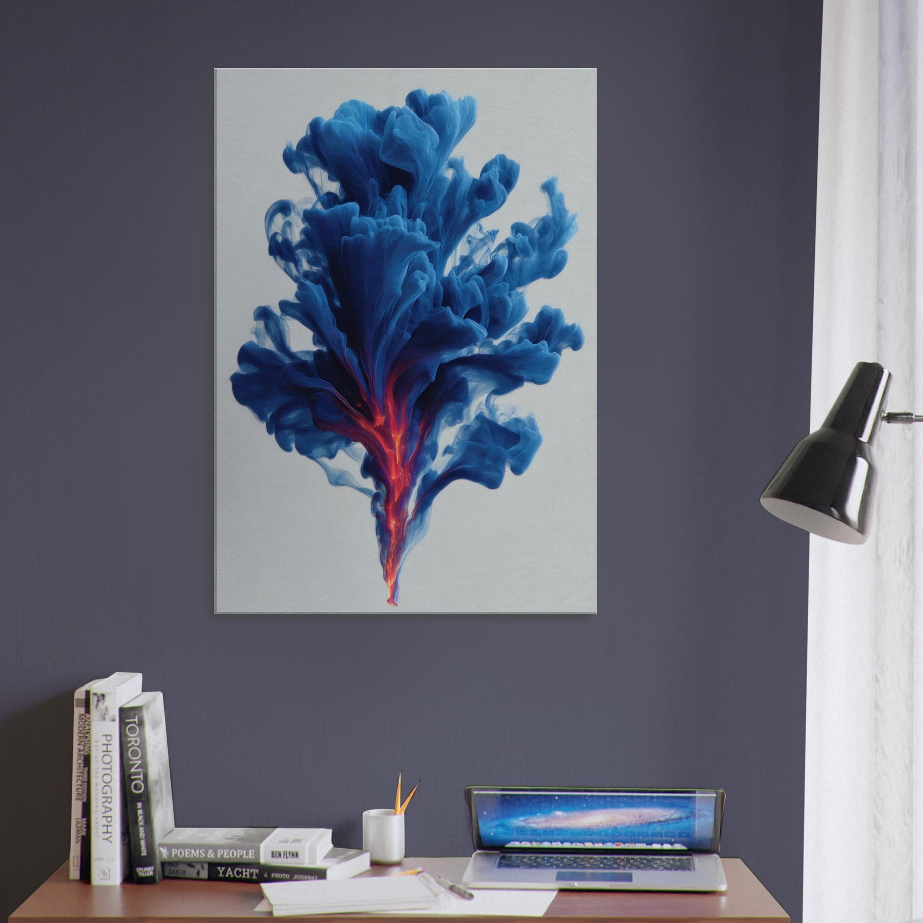Let the Smudge Smoke Swirl drift through your room and settle into your everyday rituals. This mystical composition conjures a serene atmosphere, where blue tides unfurl toward a neon ember core, hinting at dawn and dream in one breath. The soft edges glow against quiet walls, inviting introspection and conversation. Hang it in a living room or study to lift the mood with cool sophistication, a kinetic quiet that wraps spaces in perfume scented stillness.