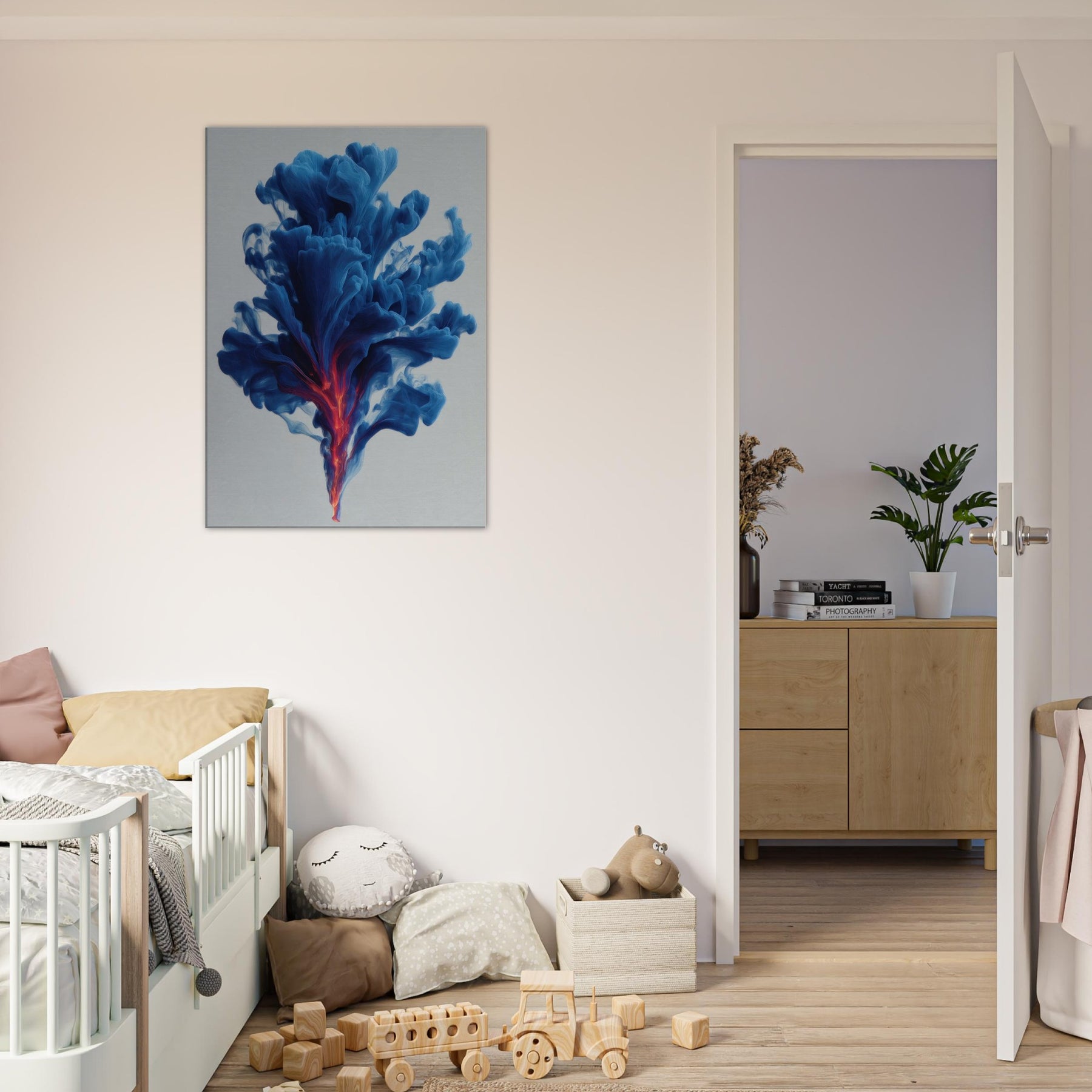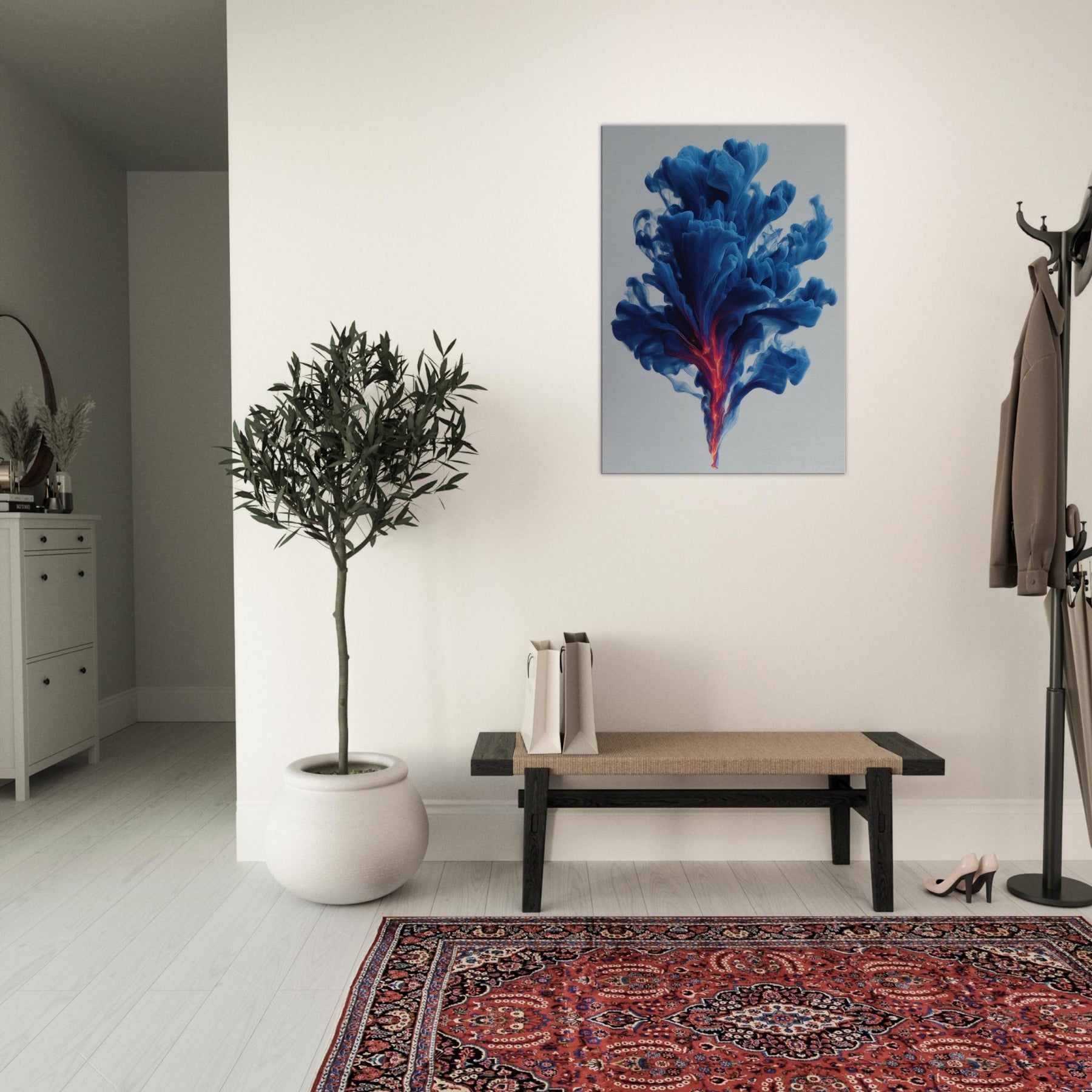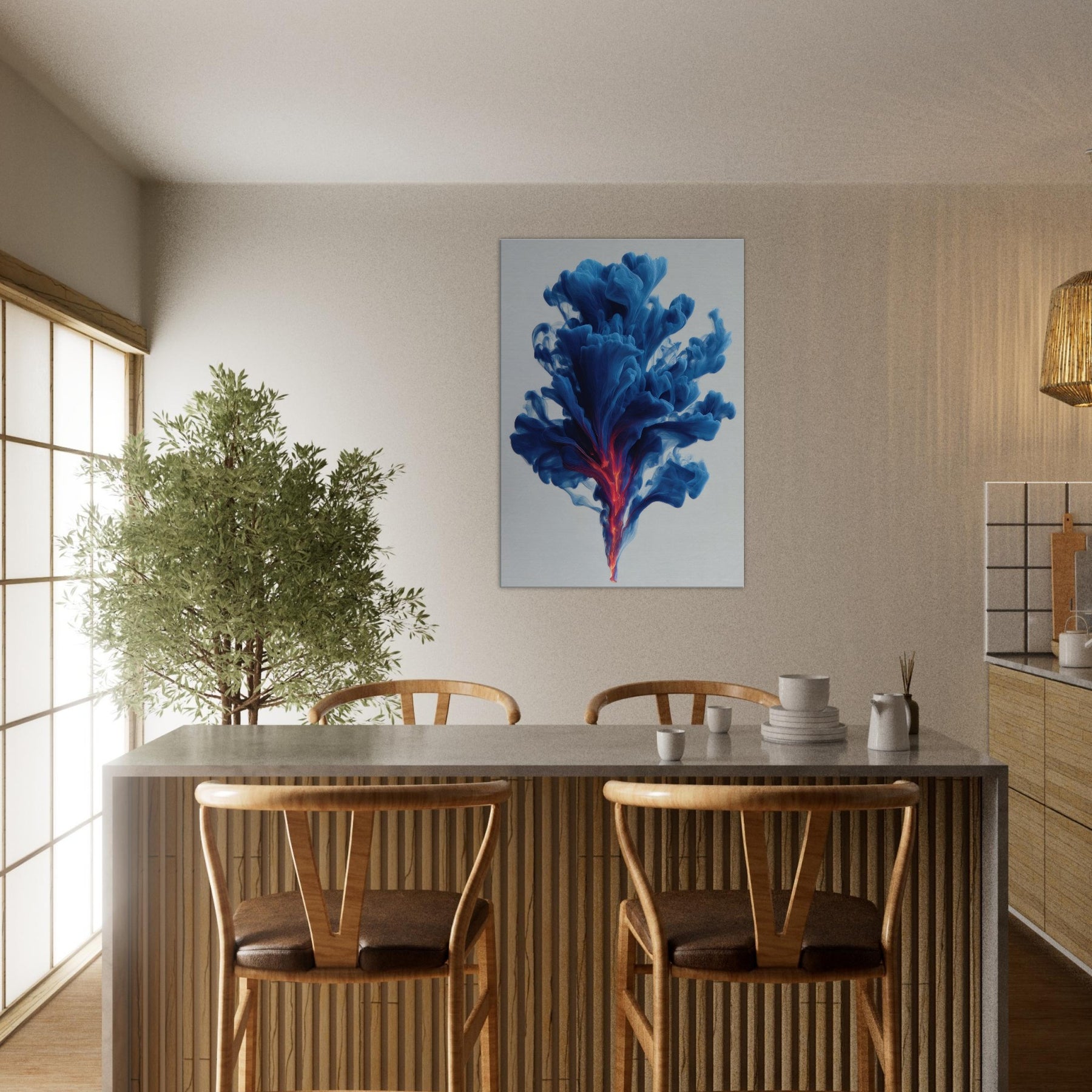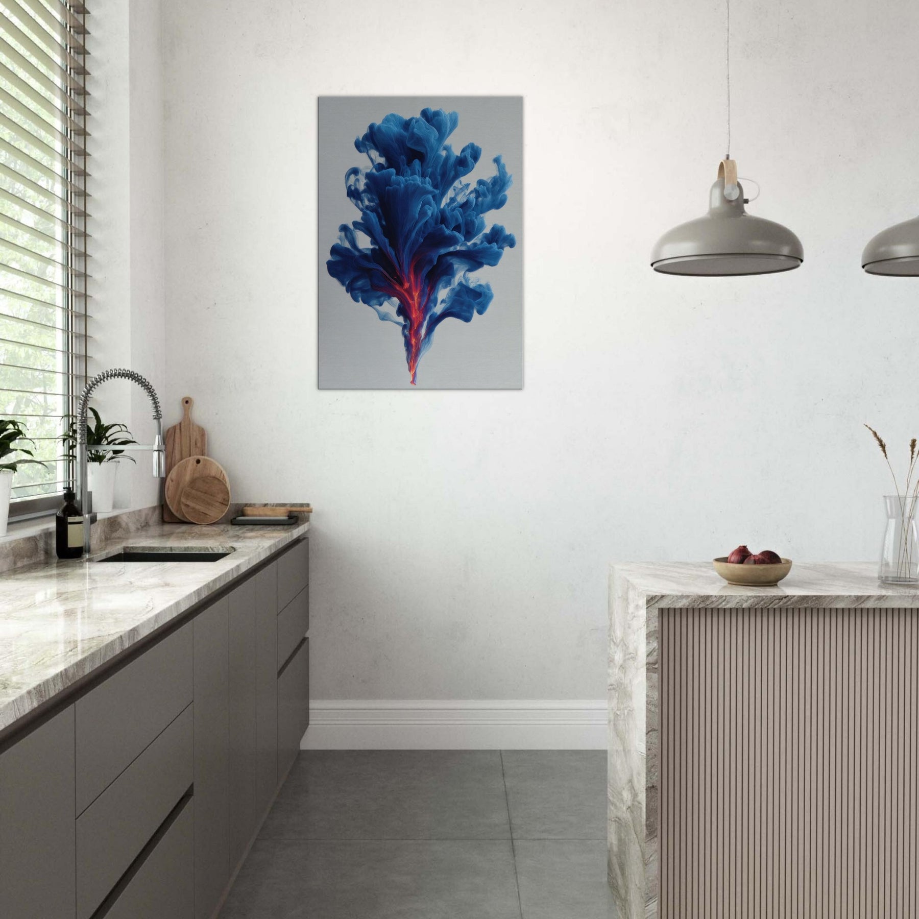 Let the Smudge Smoke Swirl drift through your room and settle into your everyday rituals. This mystical composition conjures a serene atmosphere, where blue tides unfurl toward a neon ember core, hinting at dawn and dream in one breath. The soft edges glow against quiet walls, inviting introspection and conversation. Hang it in a living room or study to lift the mood with cool sophistication, a kinetic quiet that wraps spaces in perfume scented stillness.