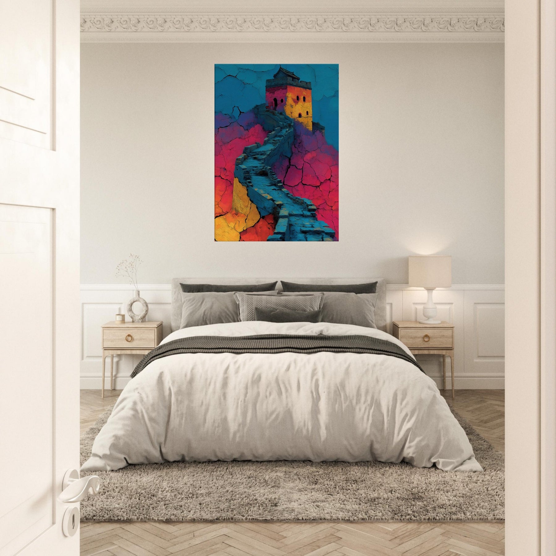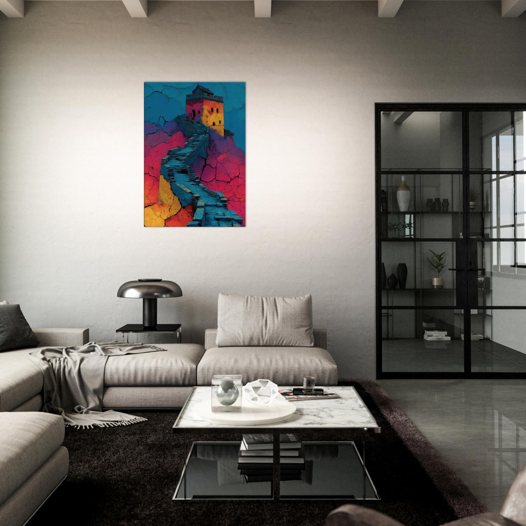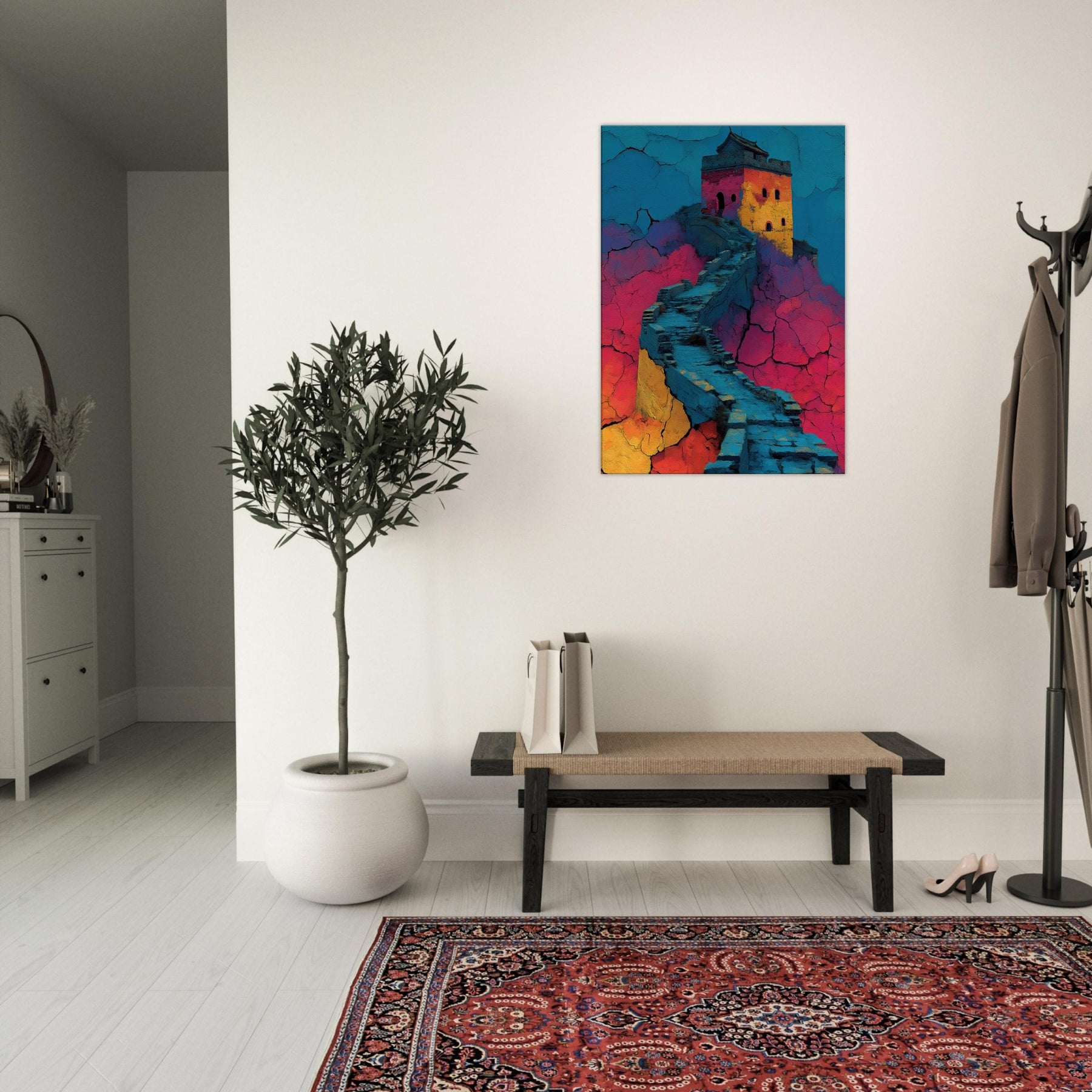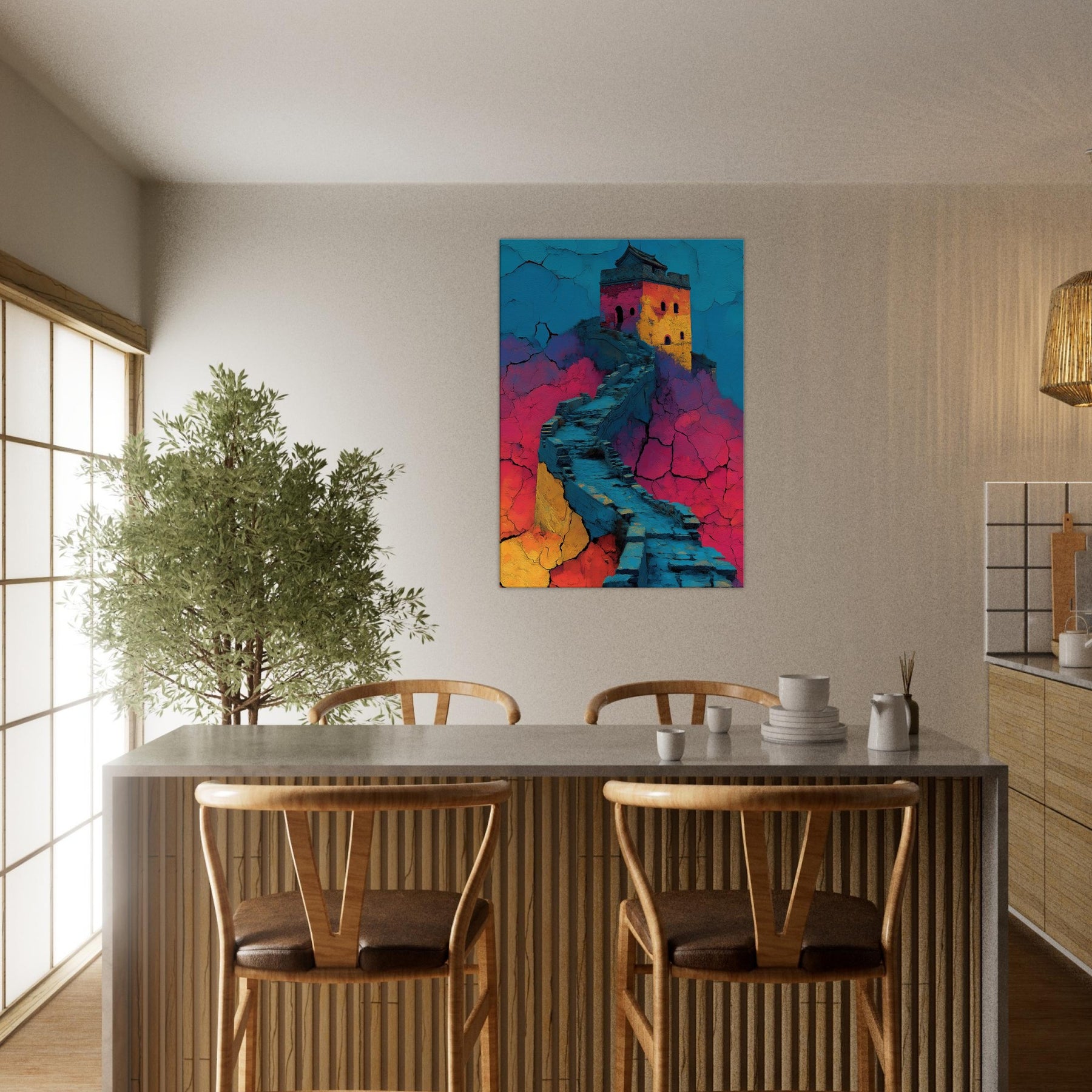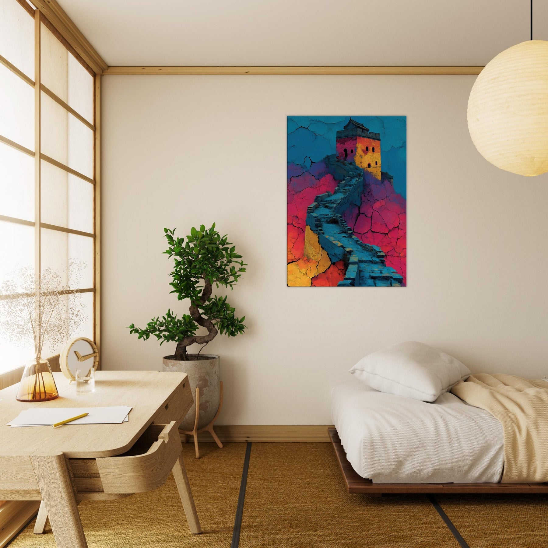 Behold the Great Wall Silhouette rendered as an electric, abstract ascent. The composition mingles ancient stone with a fevered palette teal stairways, magenta shadows, and sunlit yellows that invites the eye to wander and linger. It turns a corridor into a horizon and a room into a quiet, cinematic space. This piece amplifies atmosphere in living rooms, bedrooms, or studios, pairing as a bold focal point with minimalist furnishings for a modern, contemplative retreat.