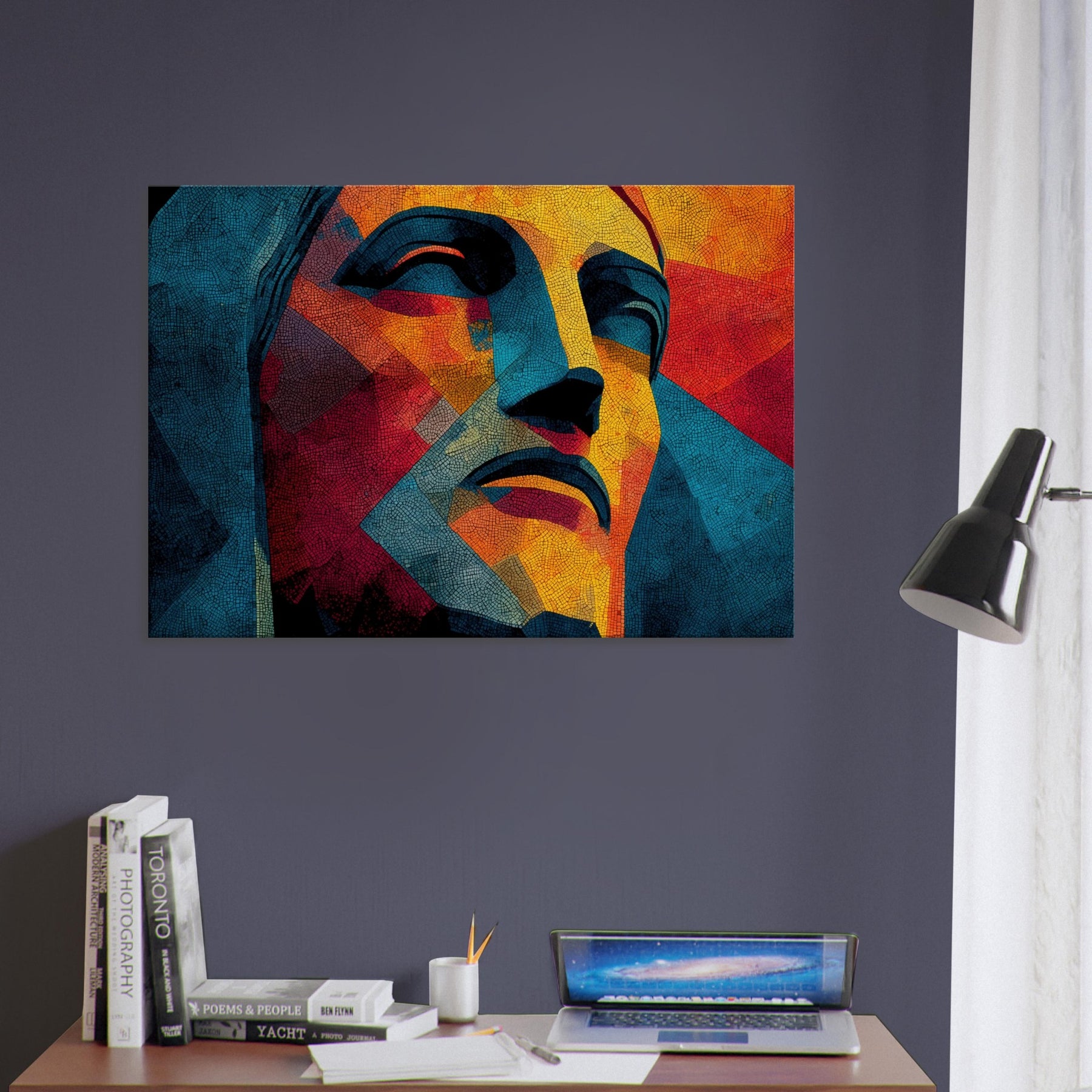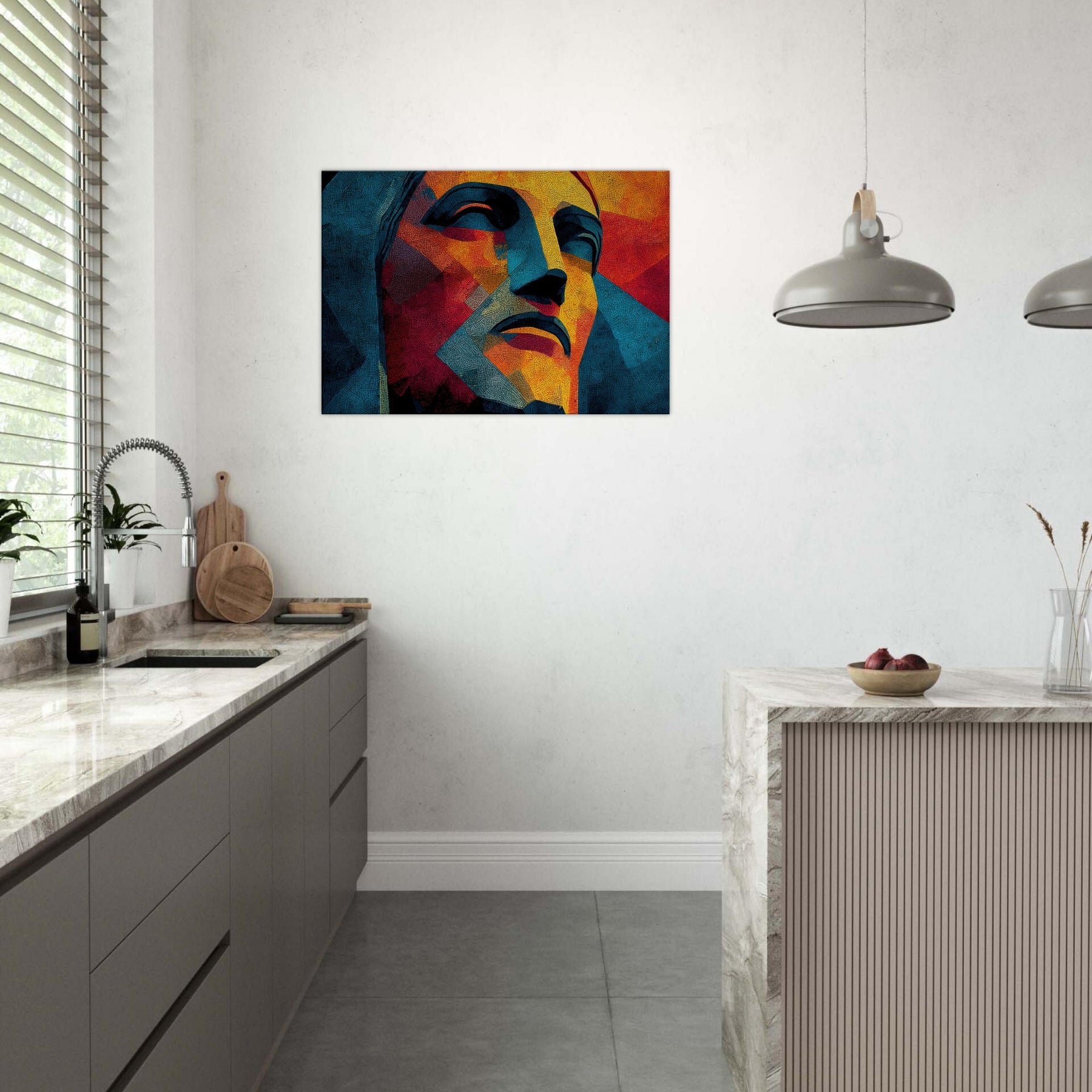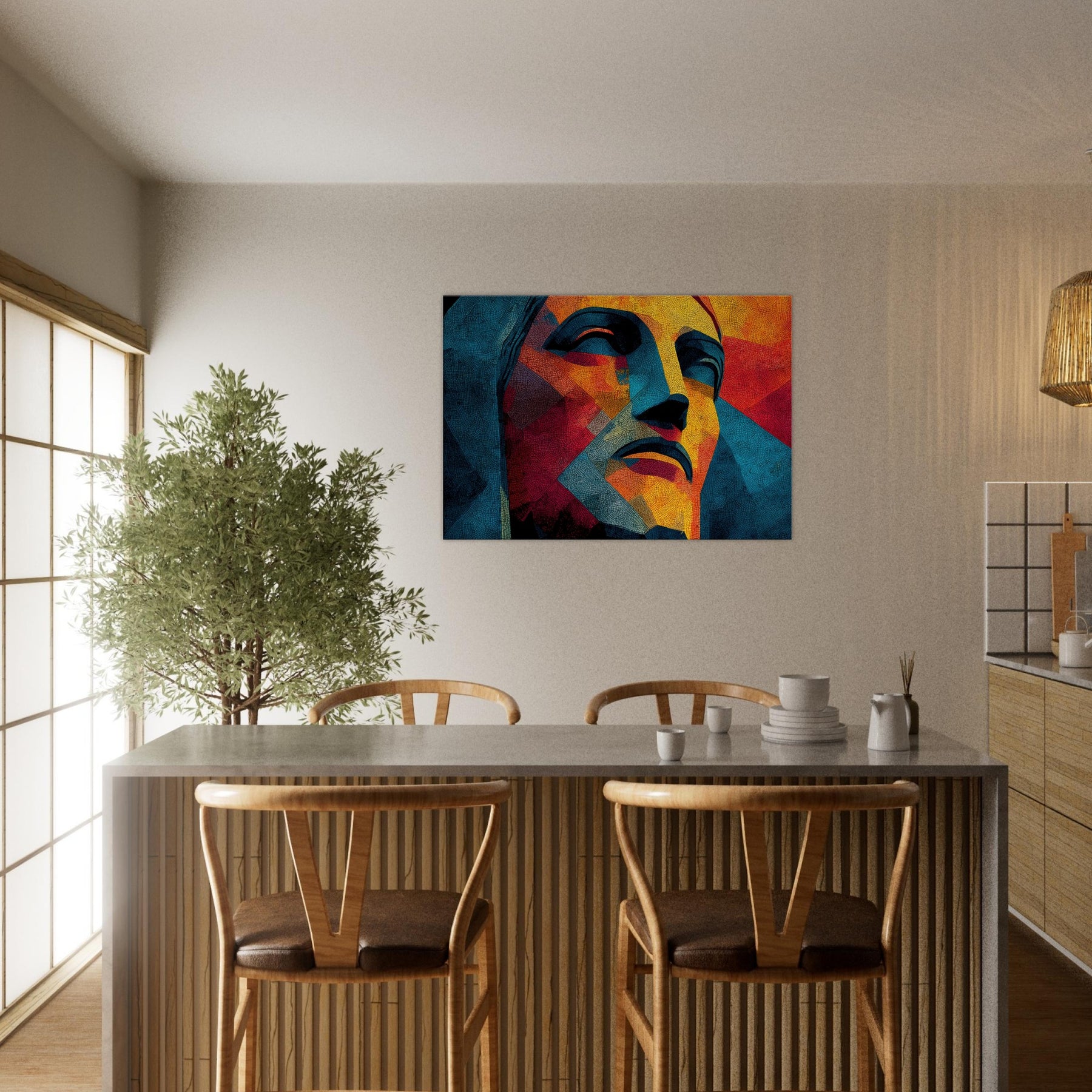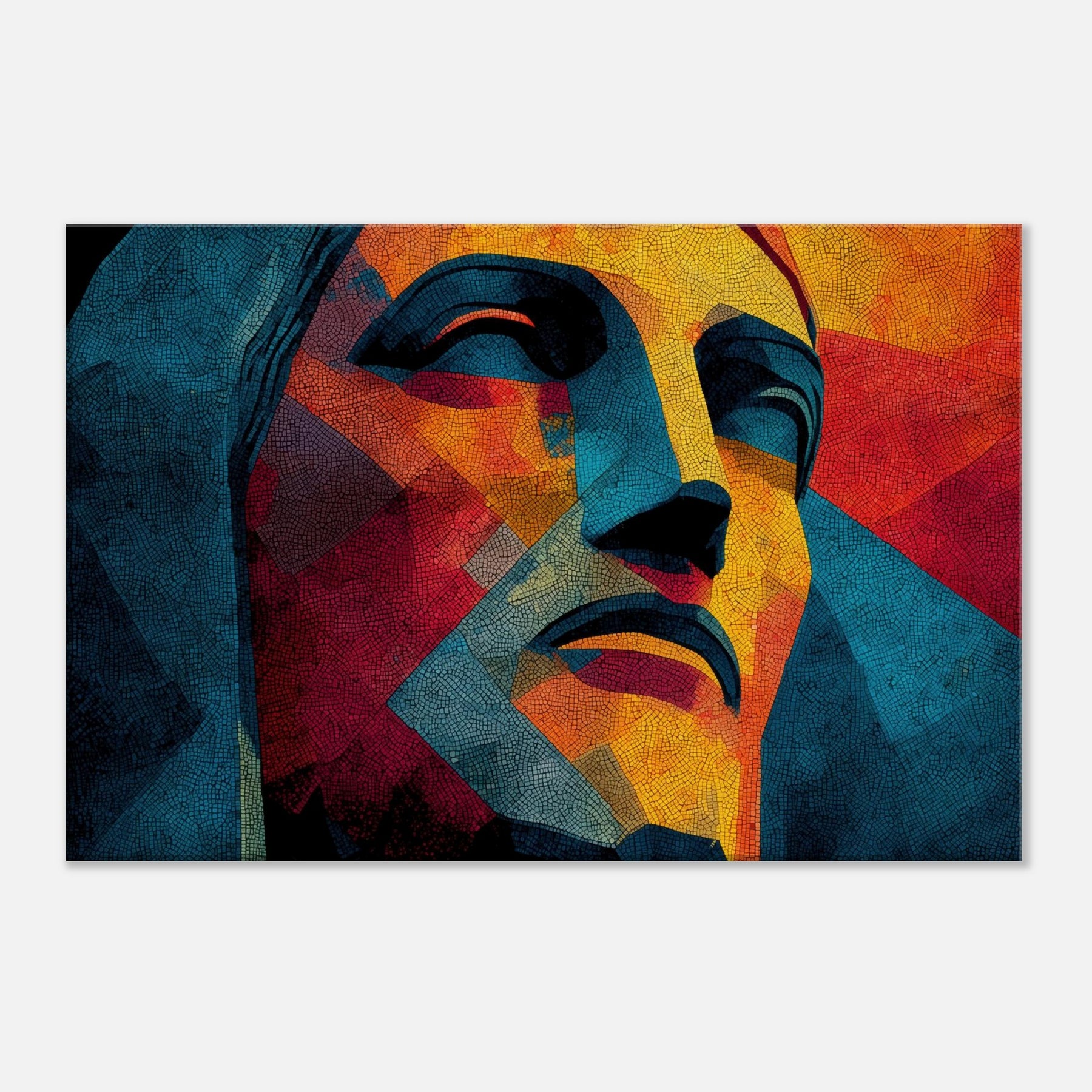 Christ the Redeemer stands reimagined in a mosaic of color and form, its silhouette fractured into luminous facets. The piece radiates warmth and serenity, with sunlit yellows, fiery oranges, and cool blues coalescing into a meditative mood. Abstract yet unmistakable, it infuses a living room with a sense of place and wonder, as if a sun drenched balcony overlooking Rio could breathe through the wall. Perfect for contemporary spaces seeking drama, poetry, and a quiet, enduring presence.