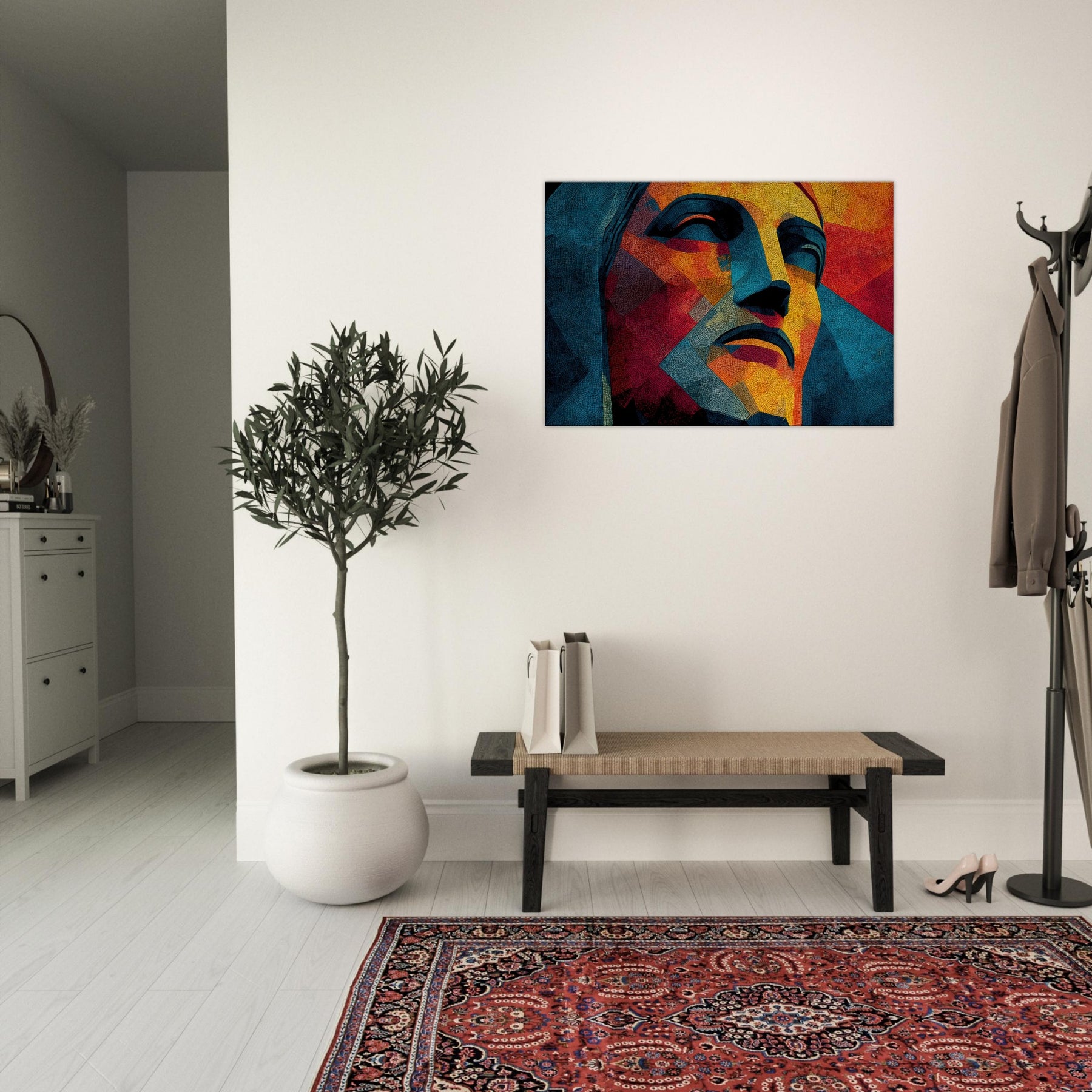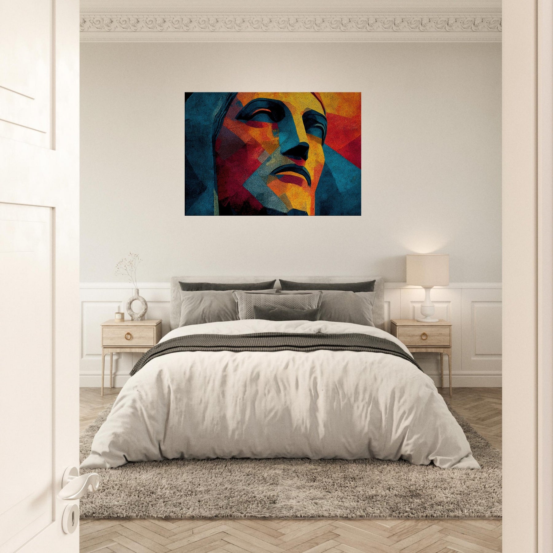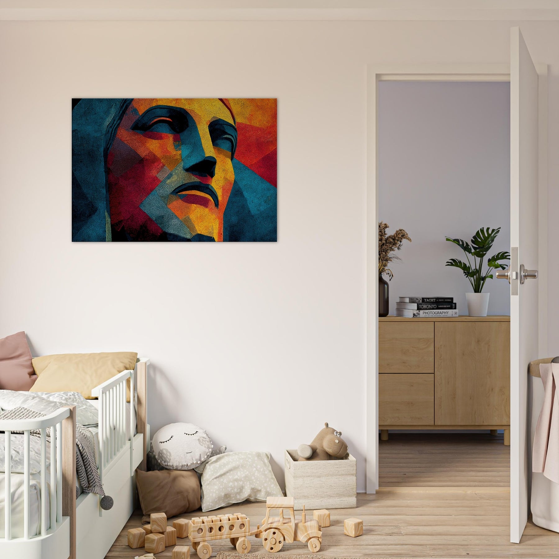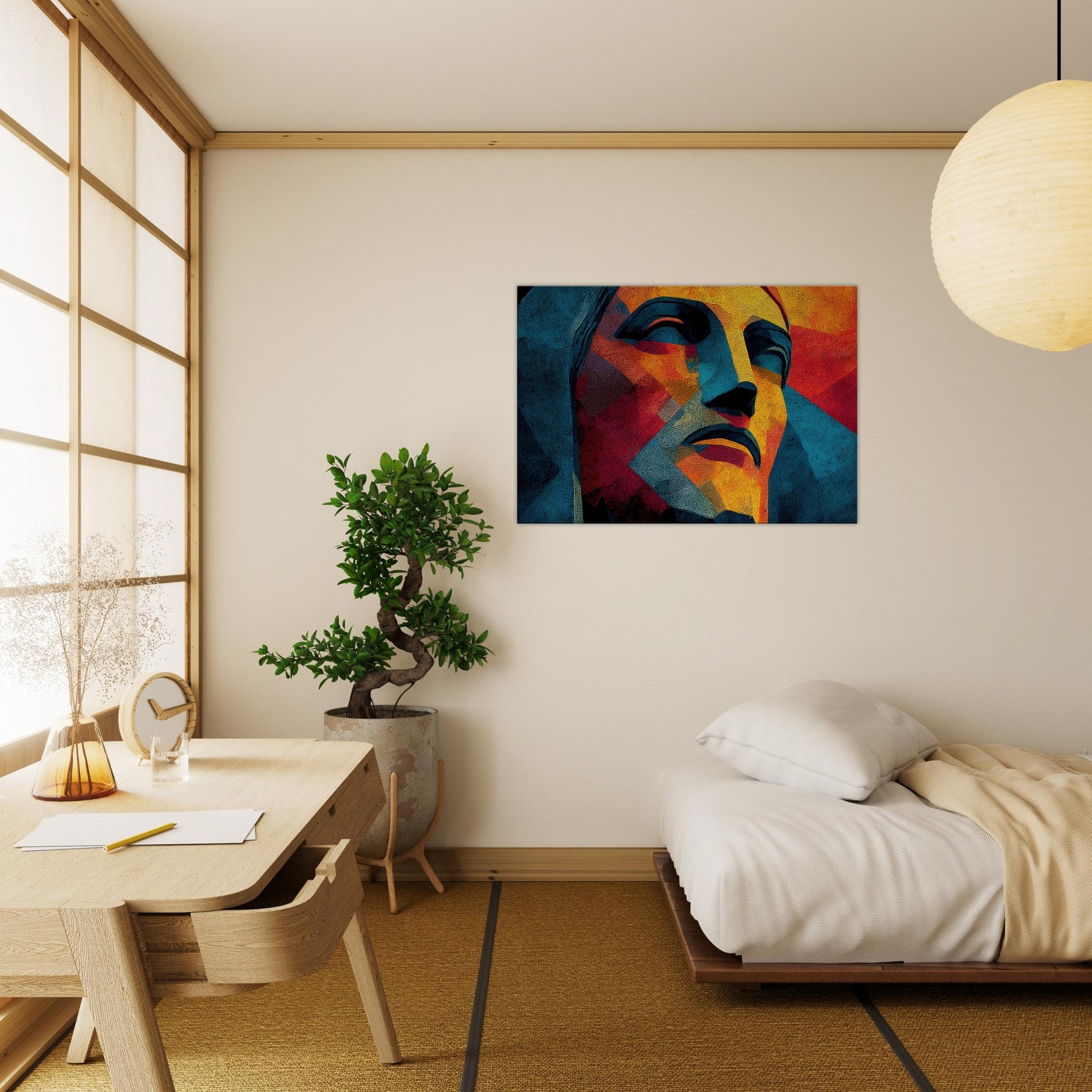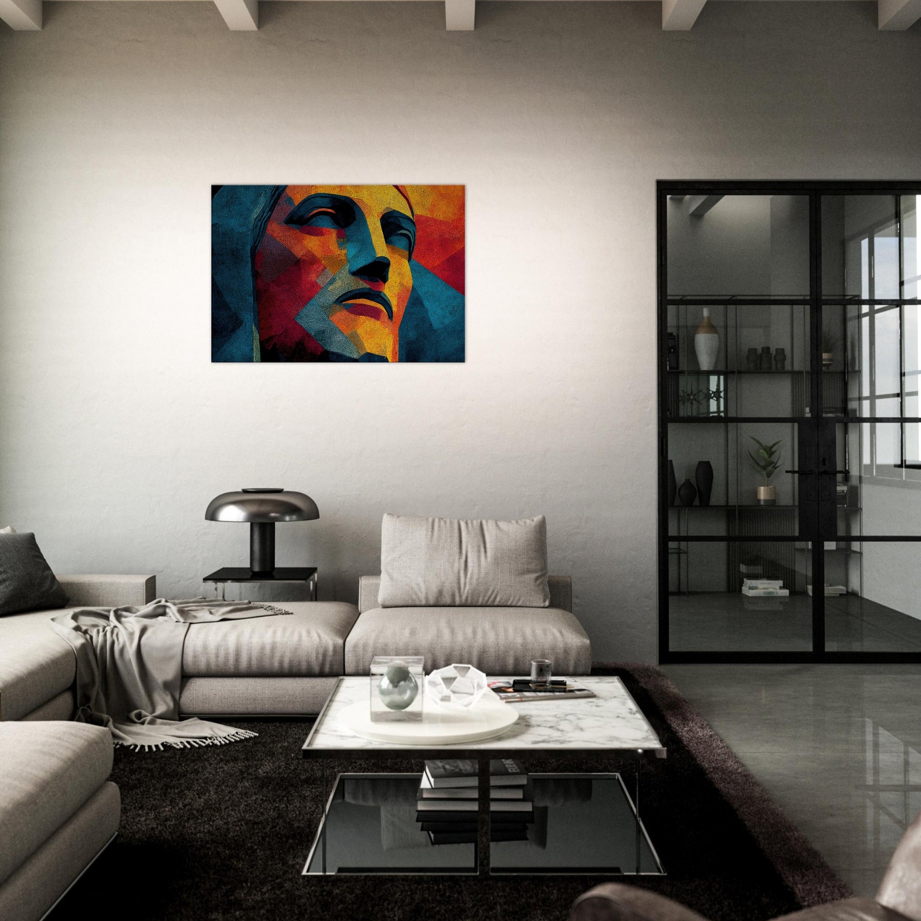 Christ the Redeemer stands reimagined in a mosaic of color and form, its silhouette fractured into luminous facets. The piece radiates warmth and serenity, with sunlit yellows, fiery oranges, and cool blues coalescing into a meditative mood. Abstract yet unmistakable, it infuses a living room with a sense of place and wonder, as if a sun drenched balcony overlooking Rio could breathe through the wall. Perfect for contemporary spaces seeking drama, poetry, and a quiet, enduring presence.