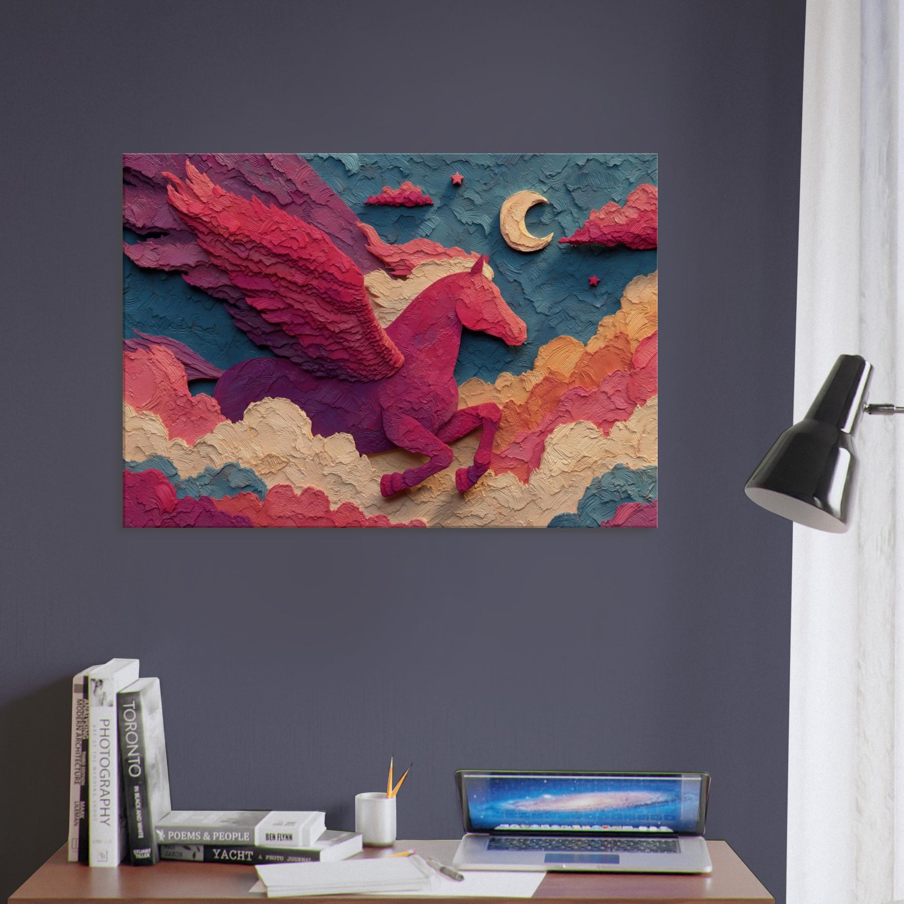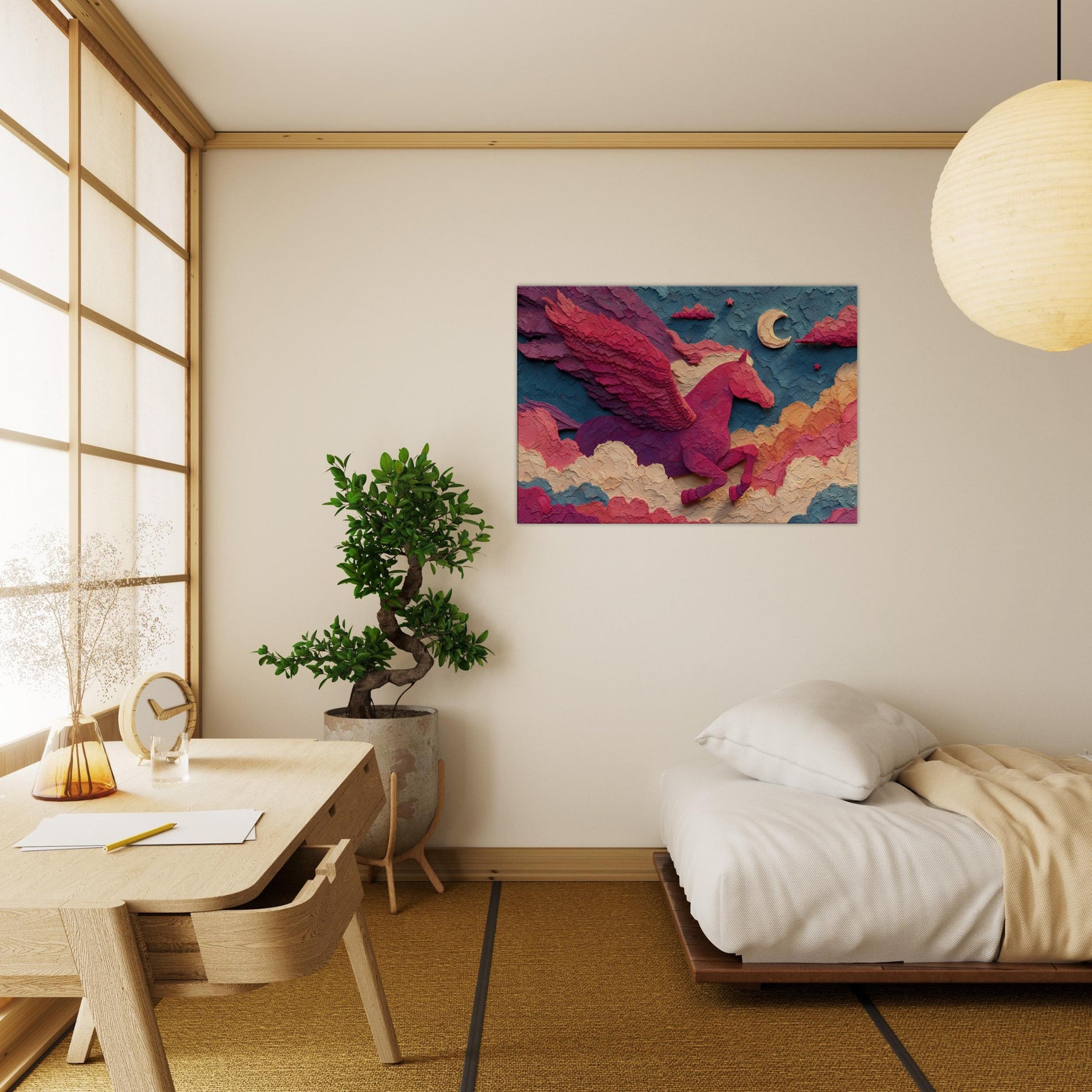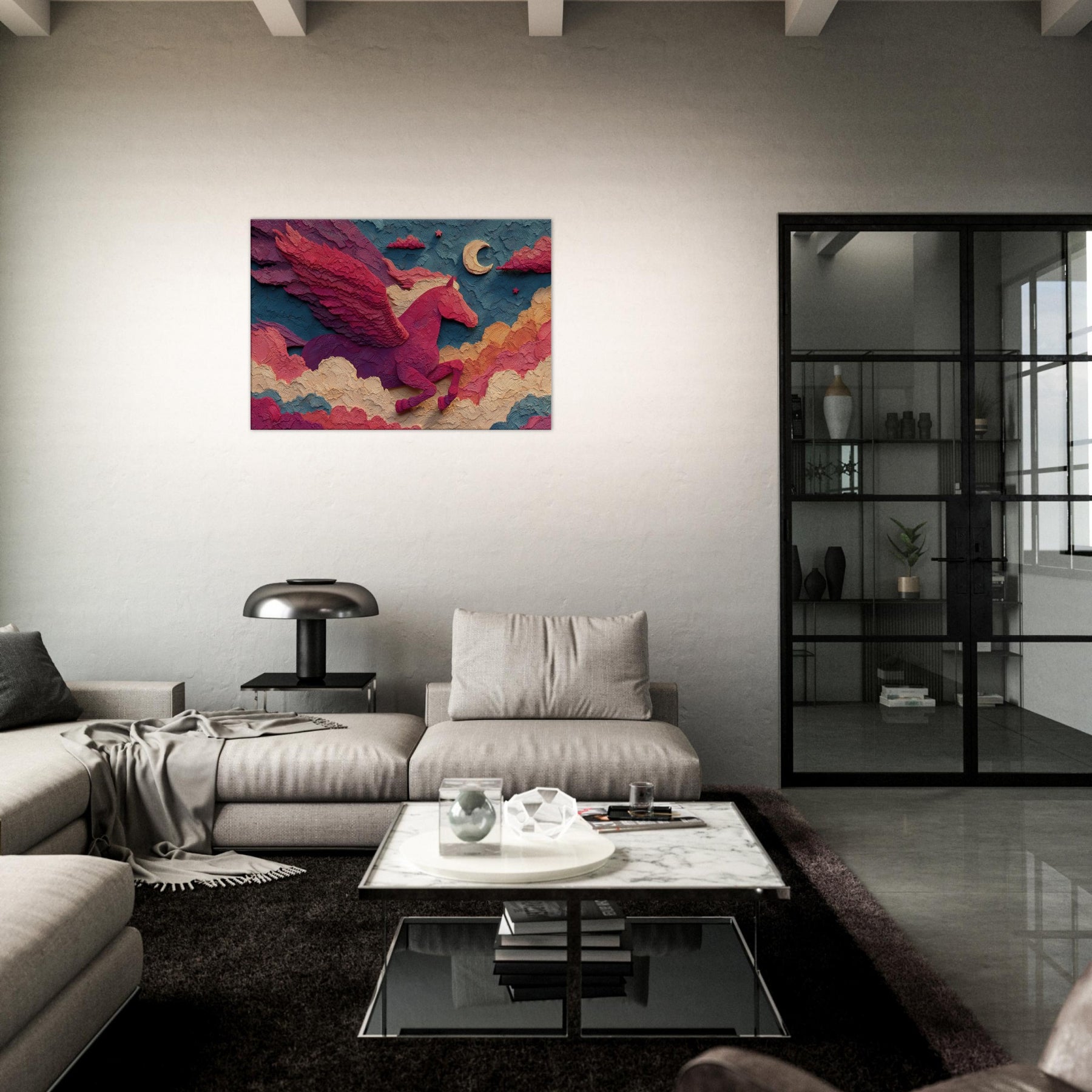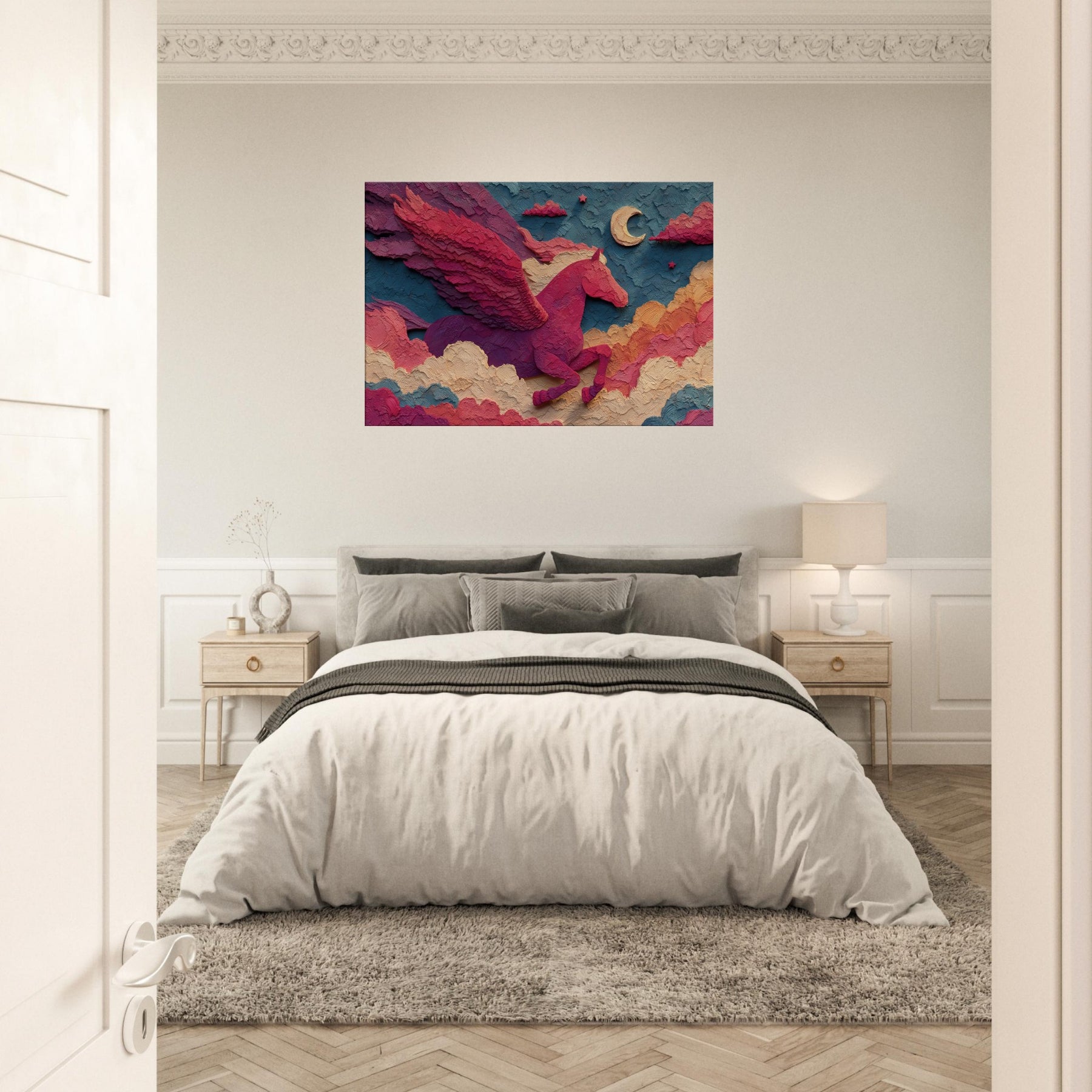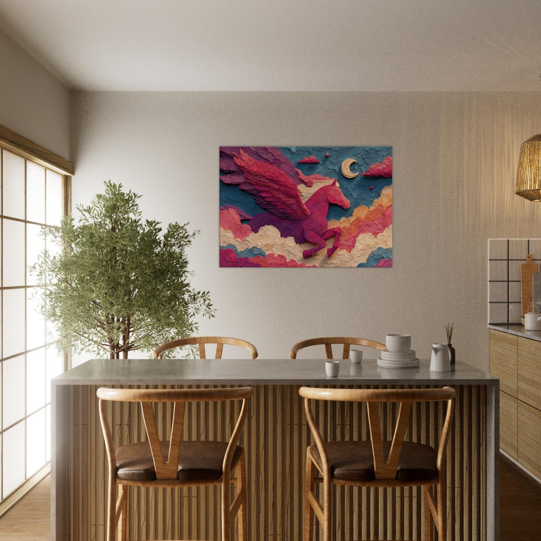 Let the Celestial Pegasus Flying Through Clouds lead your space into a dreamscape of color and light. This abstract composition threads shimmering pinks, blues, and golds into a mist of clouds, yielding a tranquil, uplifting atmosphere. The sculpture like texture invites touch and curiosity, while the soaring form elevates any room above a sofa, by a bedside, or in a gallery style hall. A modern ode to myth, it turns daily moments into quiet wonder and luminous conversation.