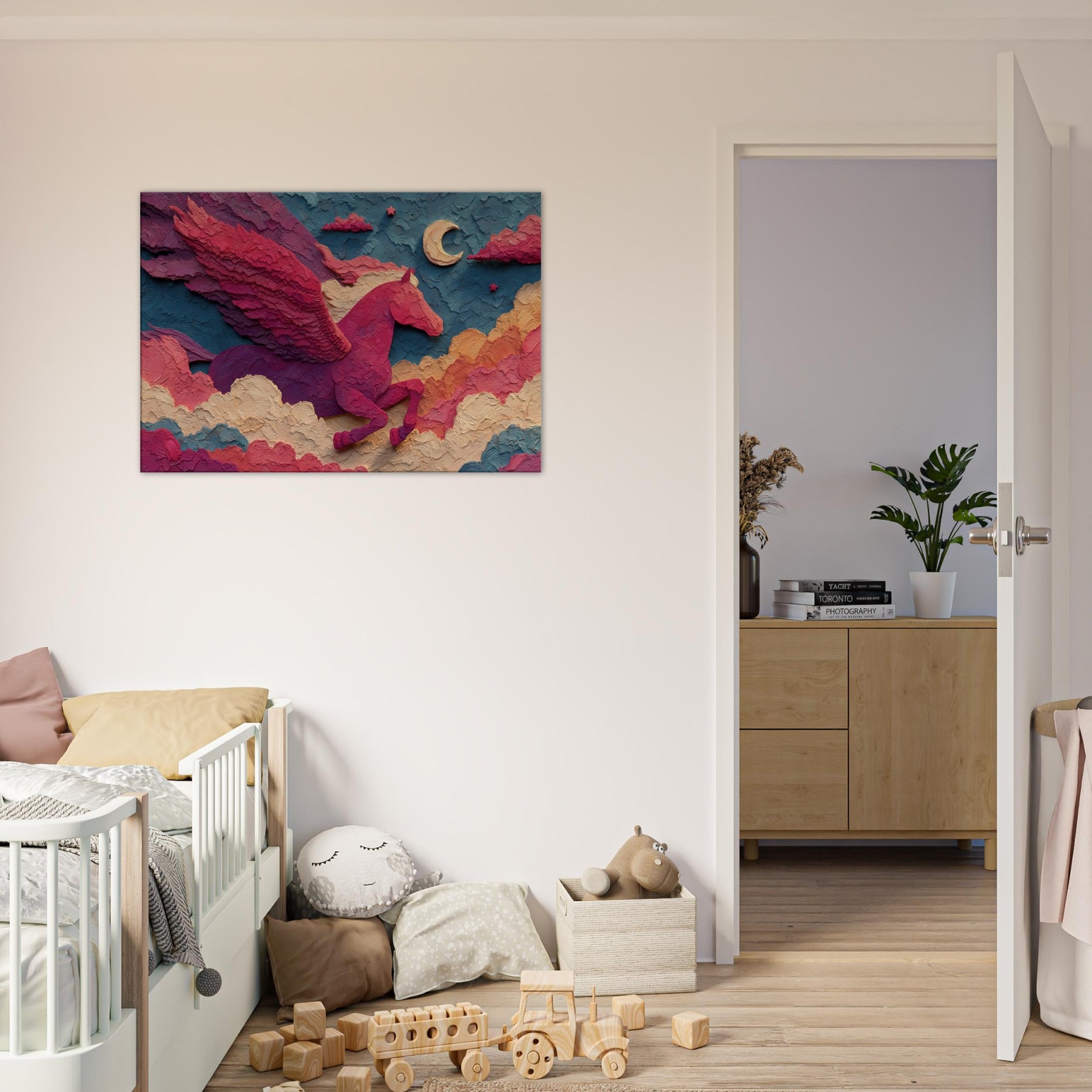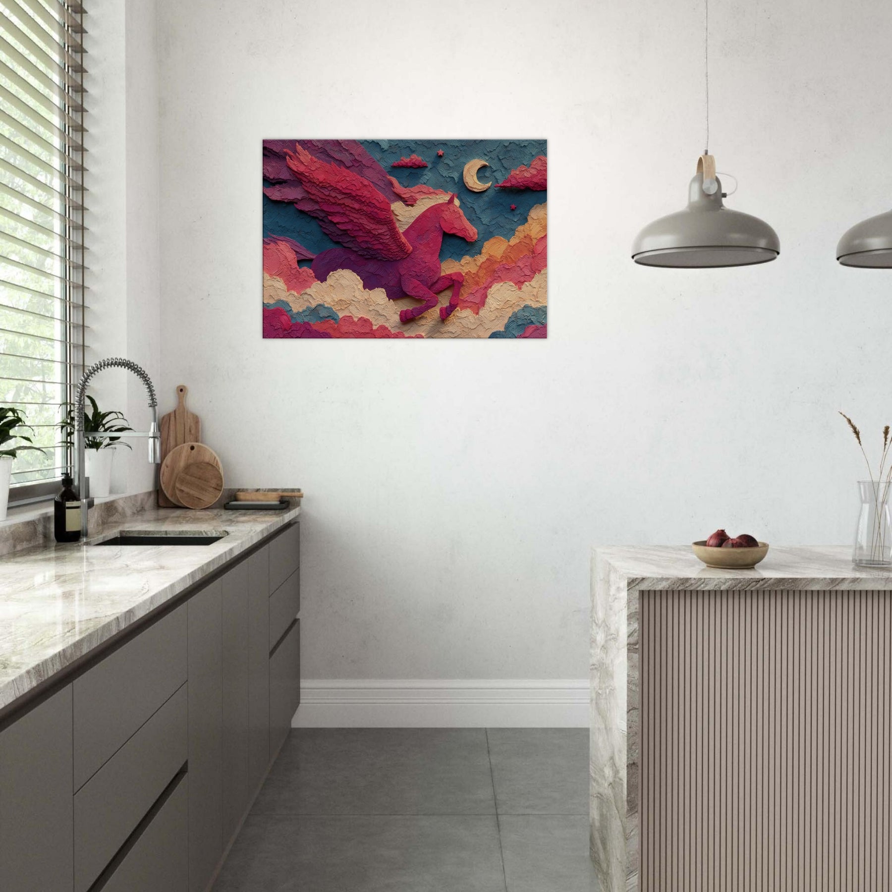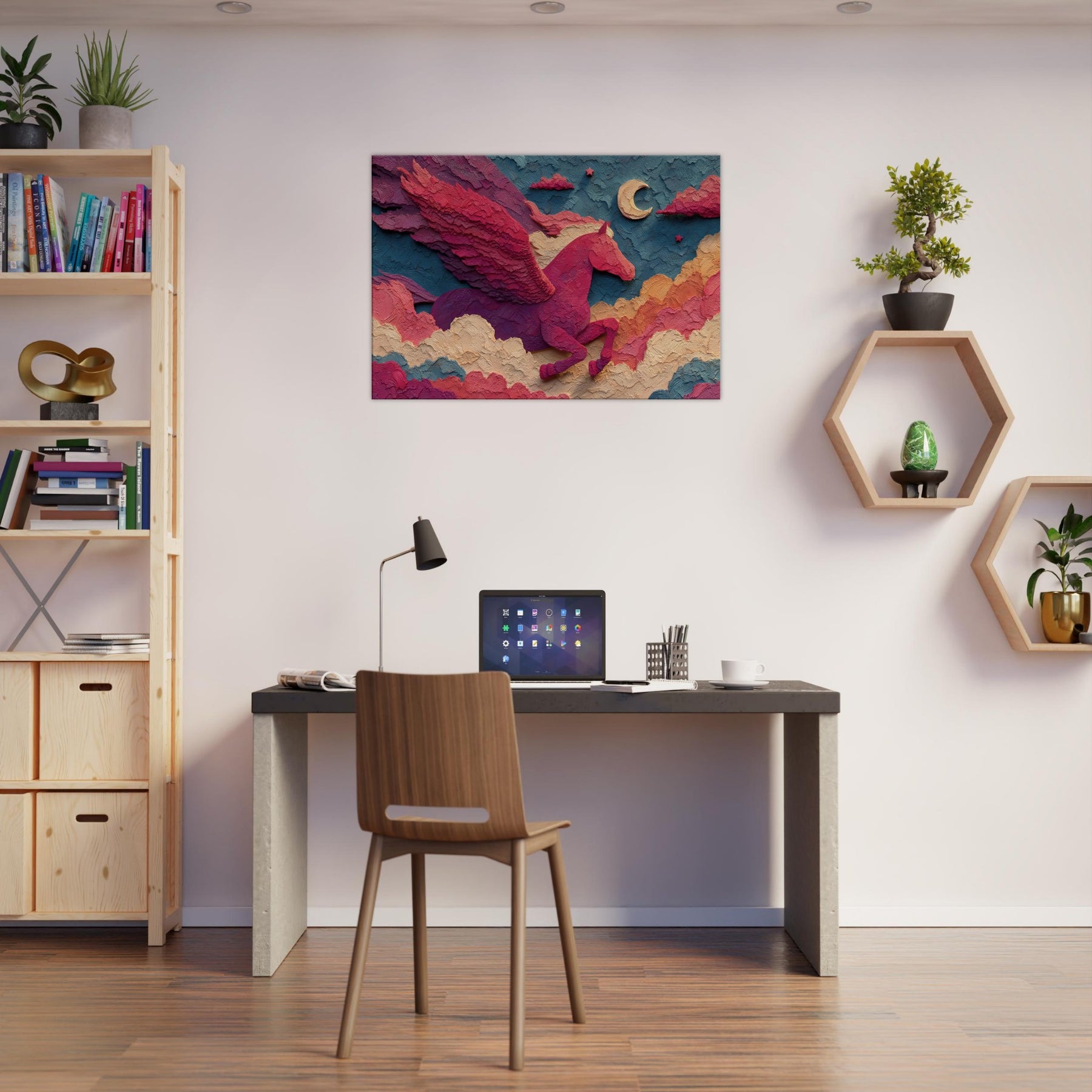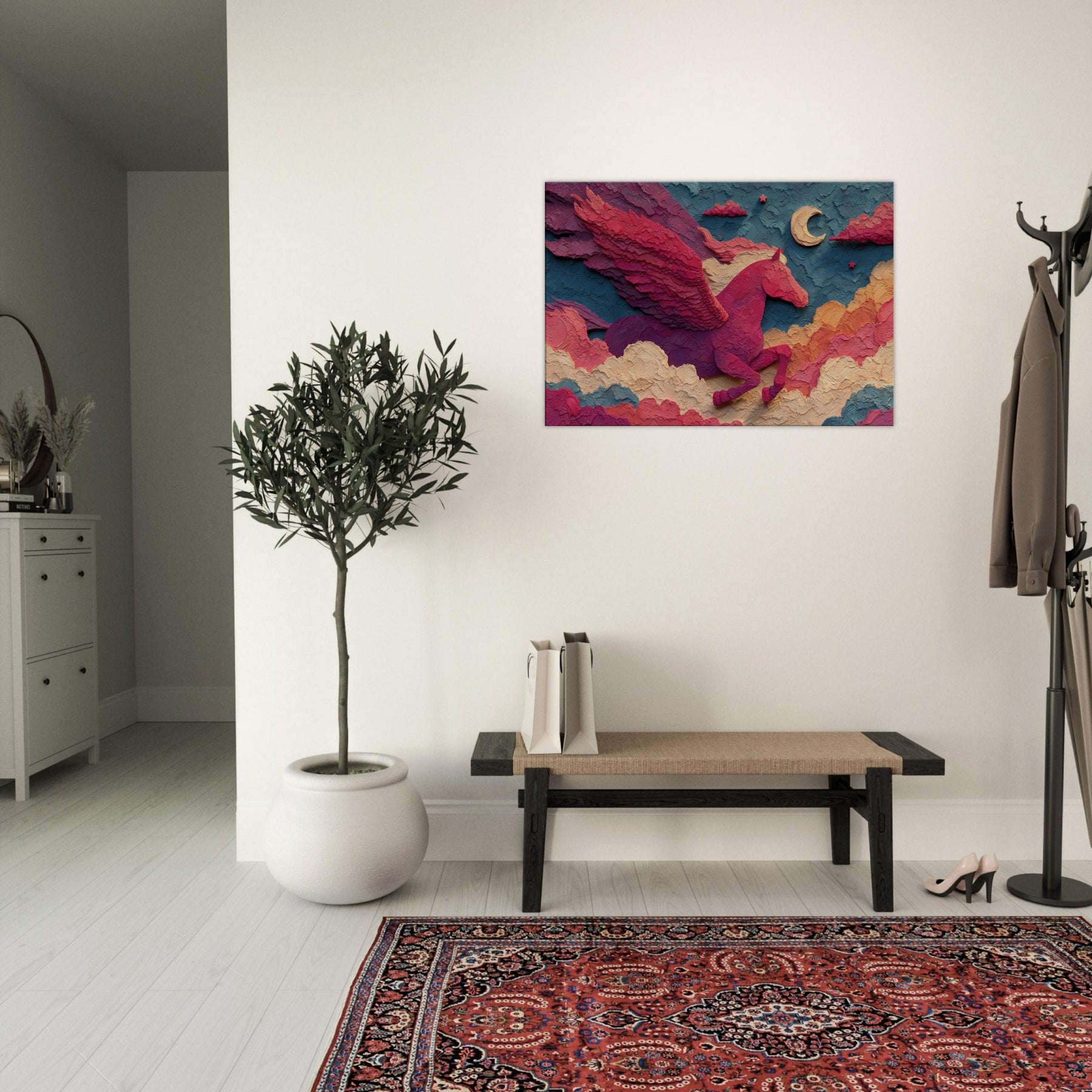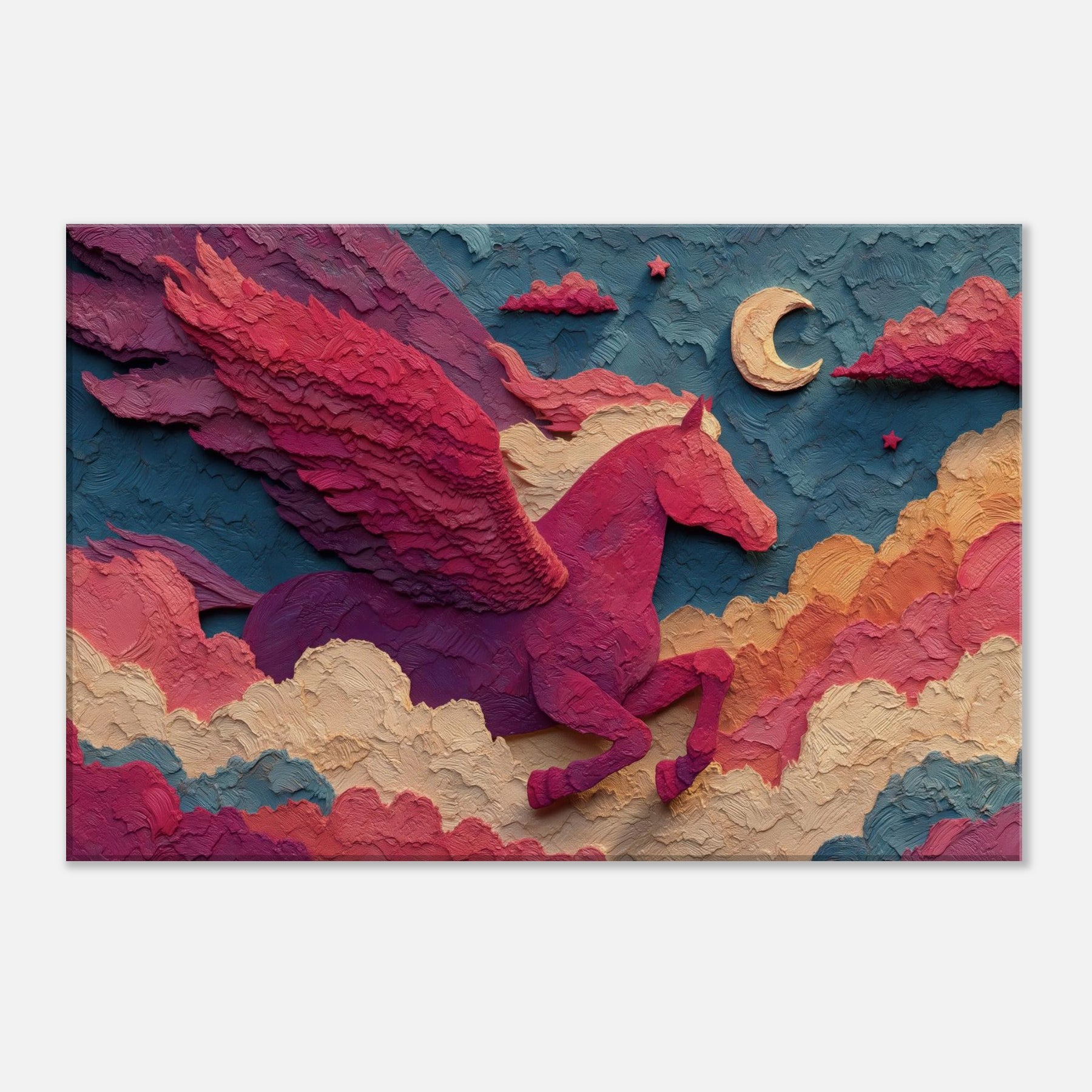 Let the Celestial Pegasus Flying Through Clouds lead your space into a dreamscape of color and light. This abstract composition threads shimmering pinks, blues, and golds into a mist of clouds, yielding a tranquil, uplifting atmosphere. The sculpture like texture invites touch and curiosity, while the soaring form elevates any room above a sofa, by a bedside, or in a gallery style hall. A modern ode to myth, it turns daily moments into quiet wonder and luminous conversation.