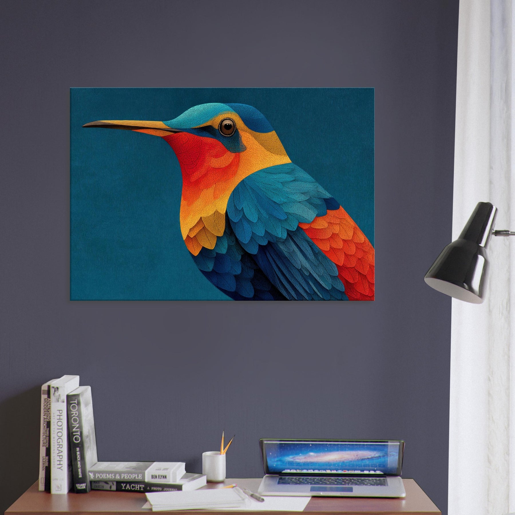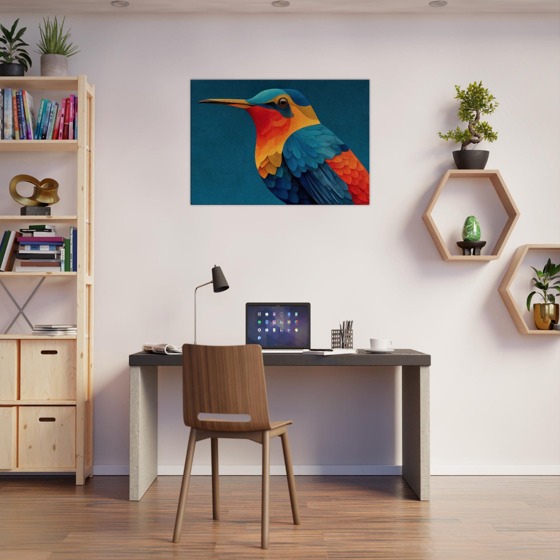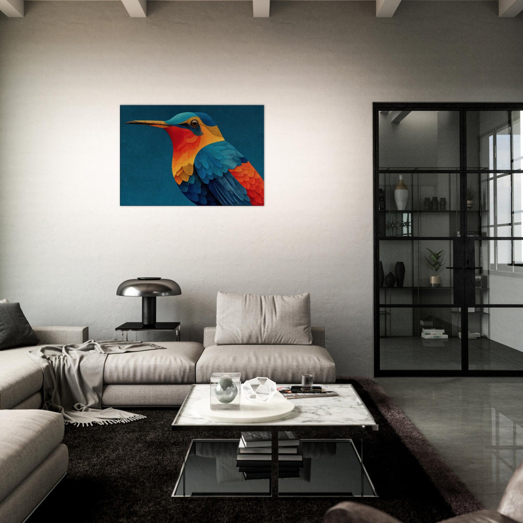 An electric breath of color, this Hummingbird bursts into your room as if the dawn were caught in flight. Abstract shapes ripple like satin feathers, layering turquoise, cobalt, flame orange, and gold to create a living shimmer. The Primary Subject glides through the atmosphere, inviting quiet awe and playful energy in equal measure. Display it where morning sun can skim the surface, and watch the space become a sanctuary the hum of life, the tempo of nature, the promise of everyday wonder.