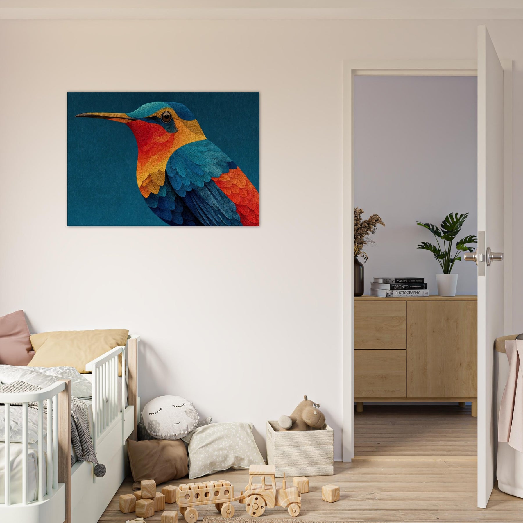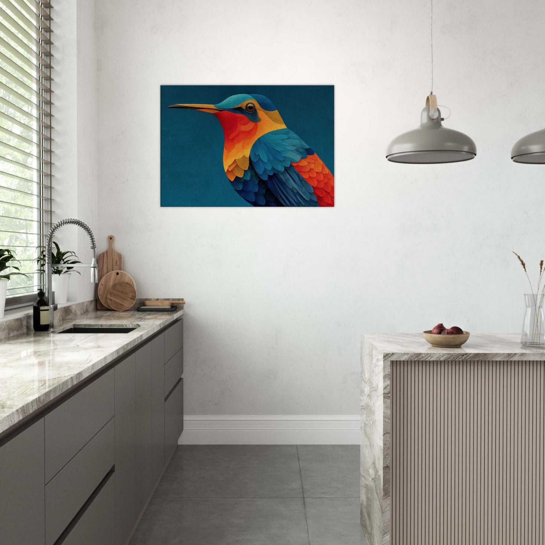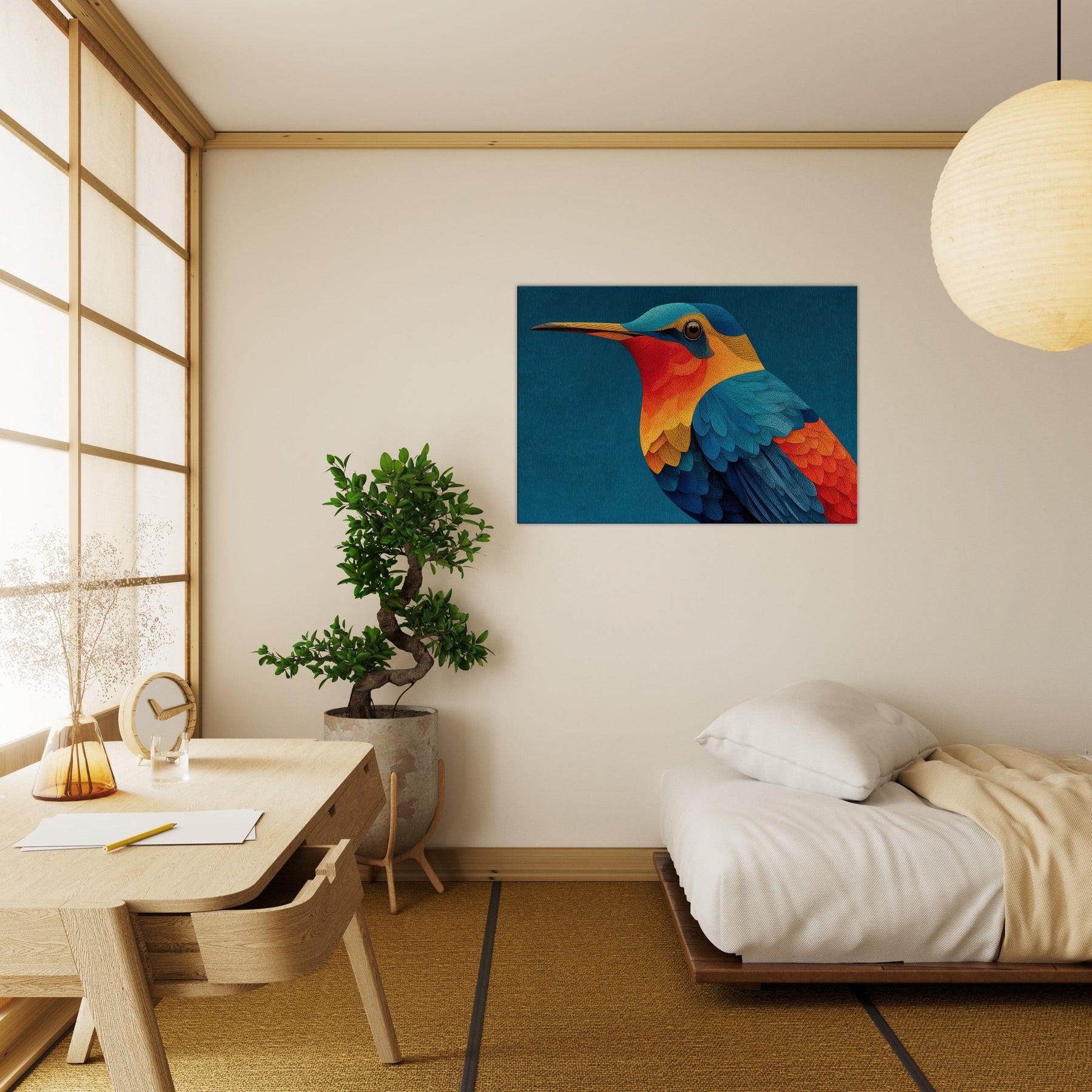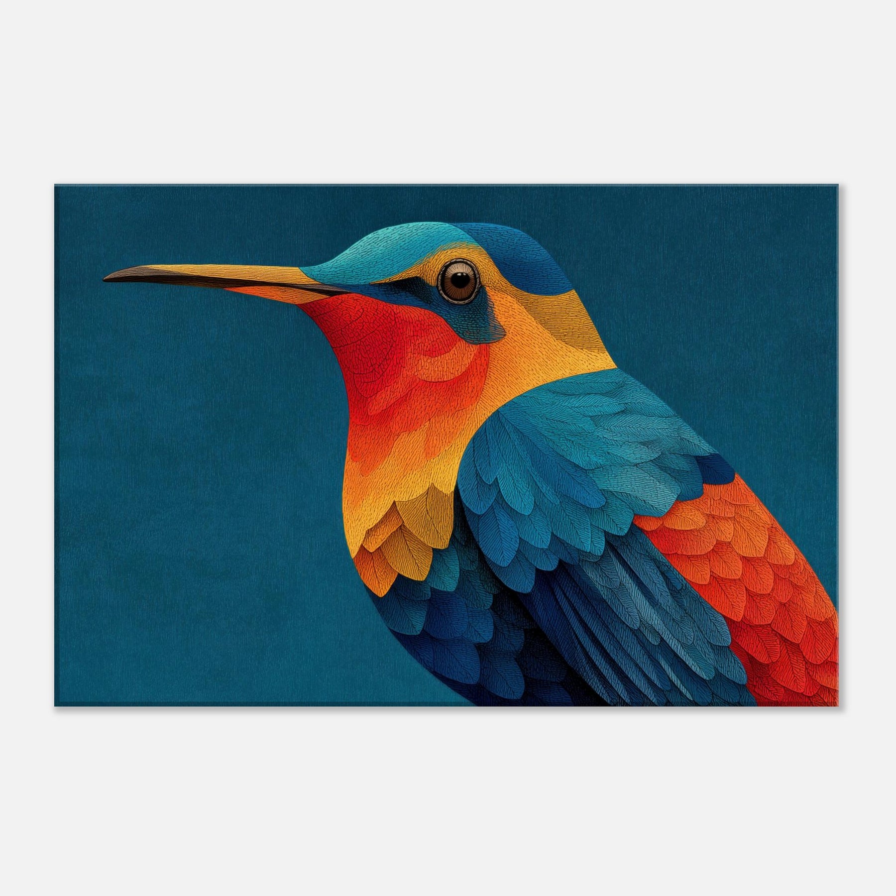 An electric breath of color, this Hummingbird bursts into your room as if the dawn were caught in flight. Abstract shapes ripple like satin feathers, layering turquoise, cobalt, flame orange, and gold to create a living shimmer. The Primary Subject glides through the atmosphere, inviting quiet awe and playful energy in equal measure. Display it where morning sun can skim the surface, and watch the space become a sanctuary the hum of life, the tempo of nature, the promise of everyday wonder.