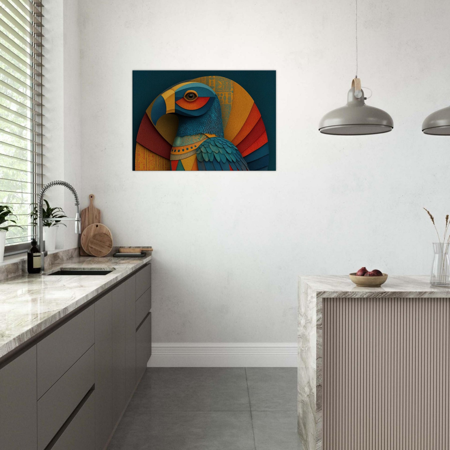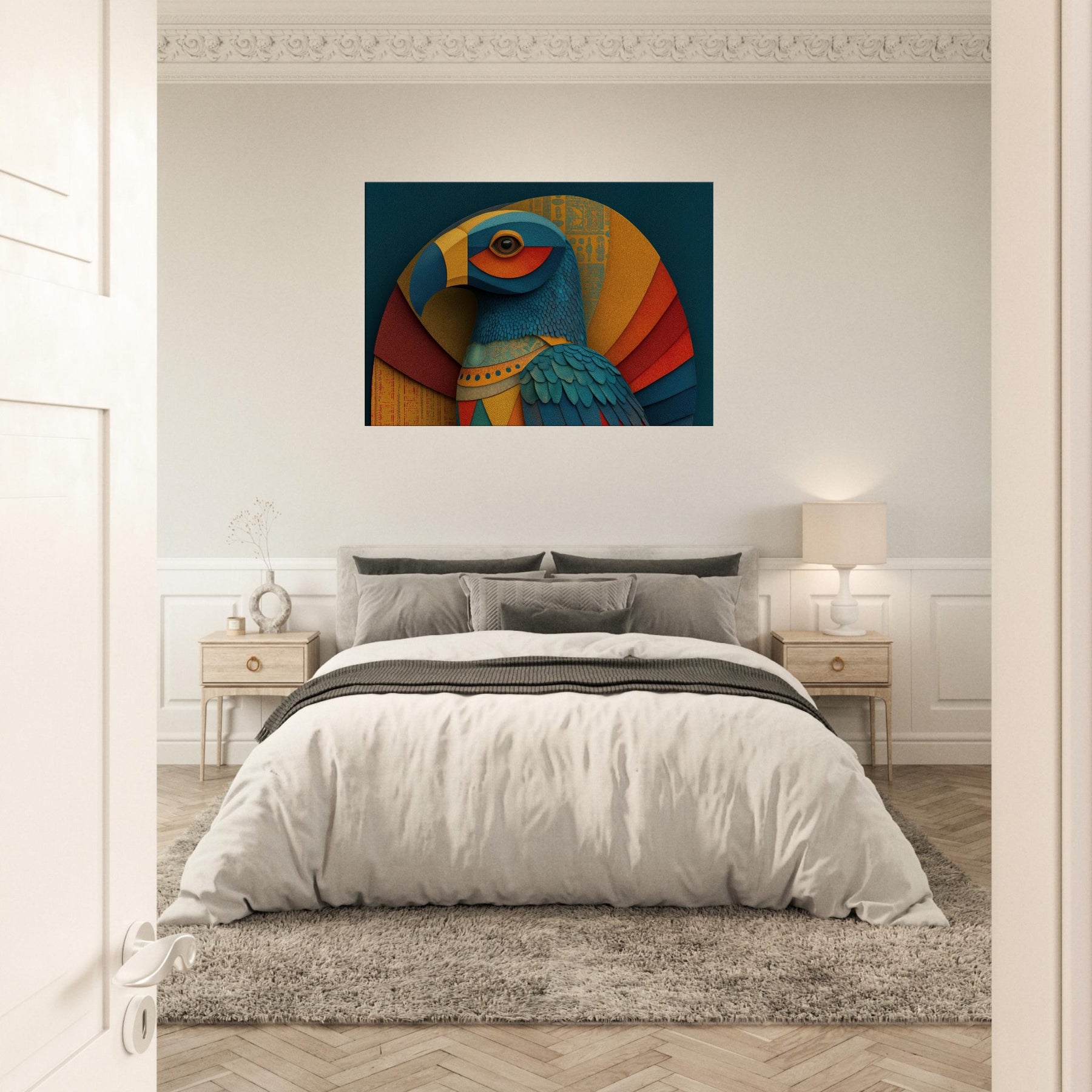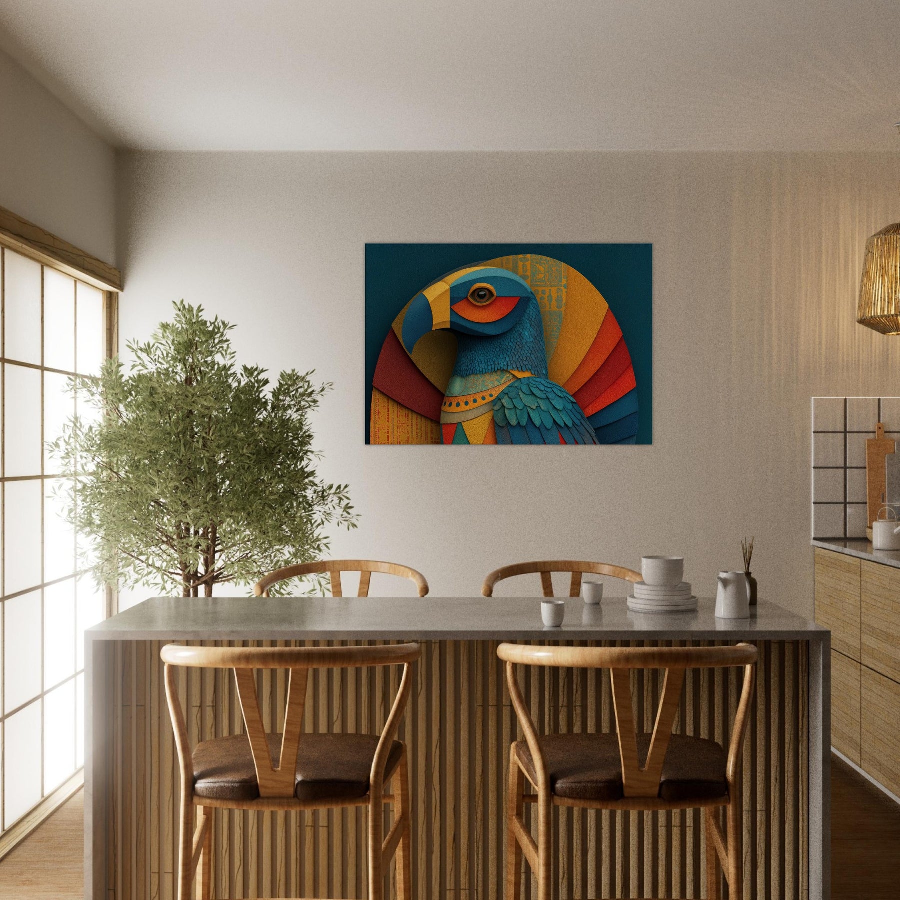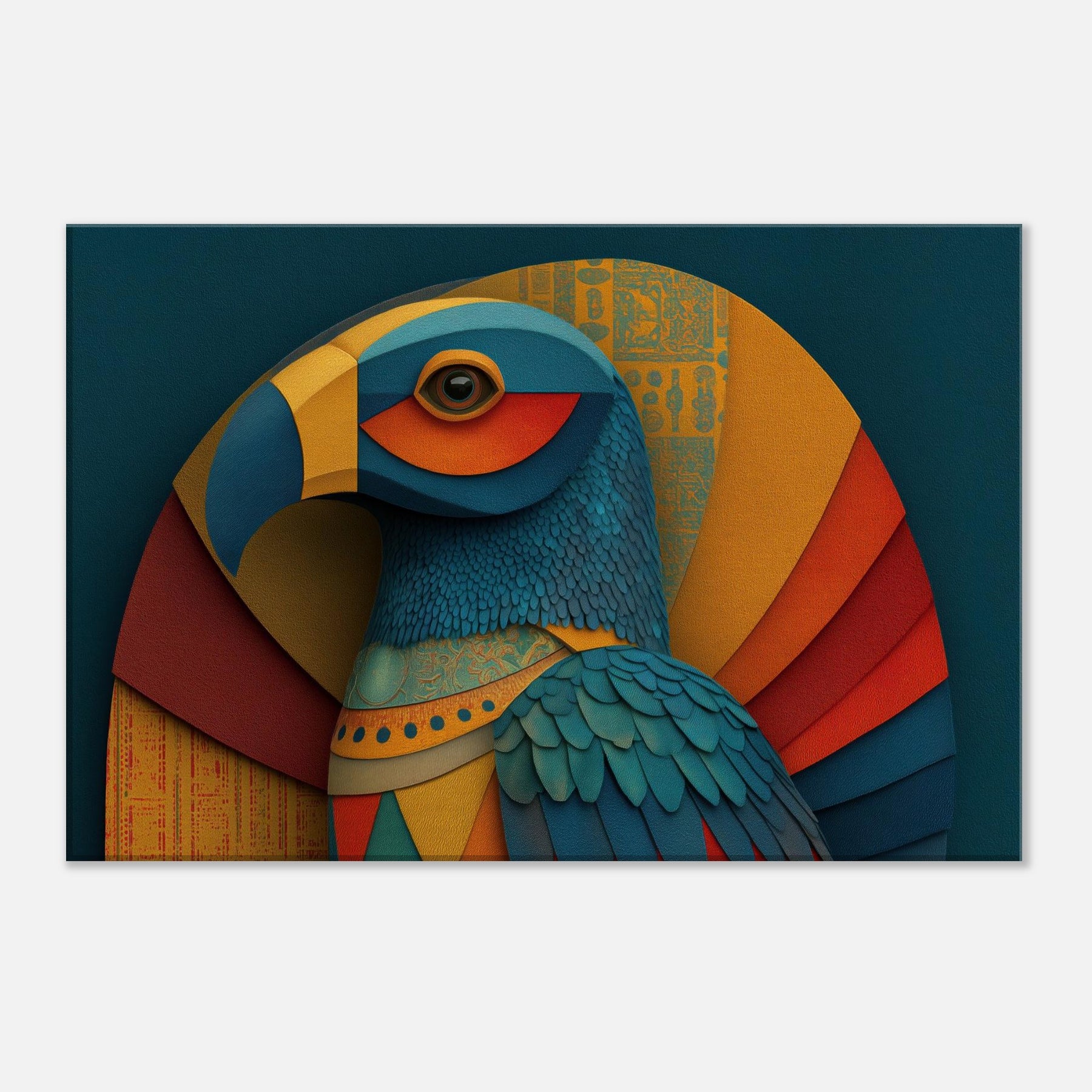 Ra, the Egyptian Sun God with A Falcon Head and Solar Crown glides through color and form in a revelatory abstraction. This wall piece breathes a warm, solar hush into any room, where teal, gold, and coral layers ripple like dawn light across textured surfaces. The birds' feathered texture becomes a tactile rhythm, while celestial arcs evoke the sun's arc through the sky. Hang it in a living space to invite mythic energy, luminous focus, and a sense of timeless ceremony.