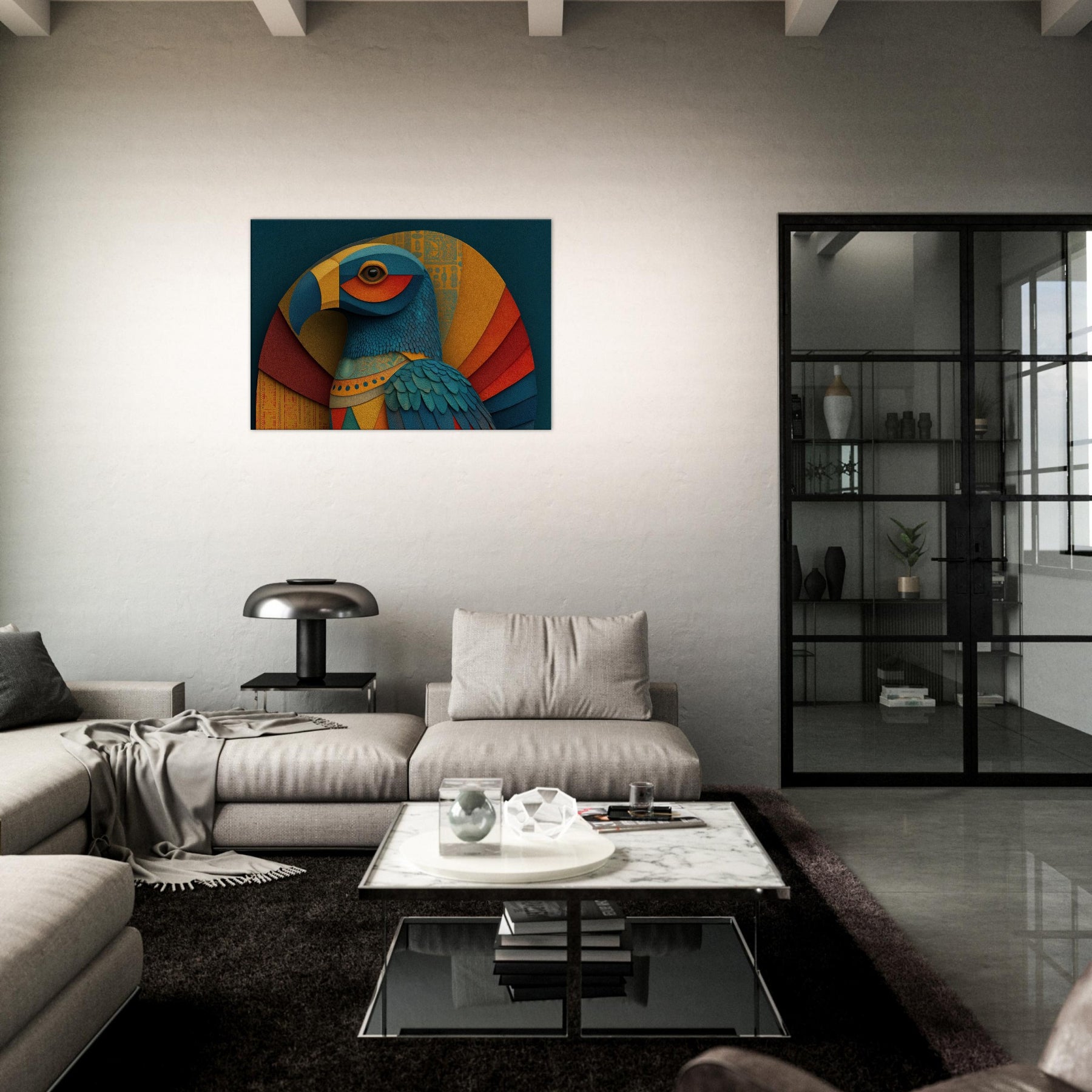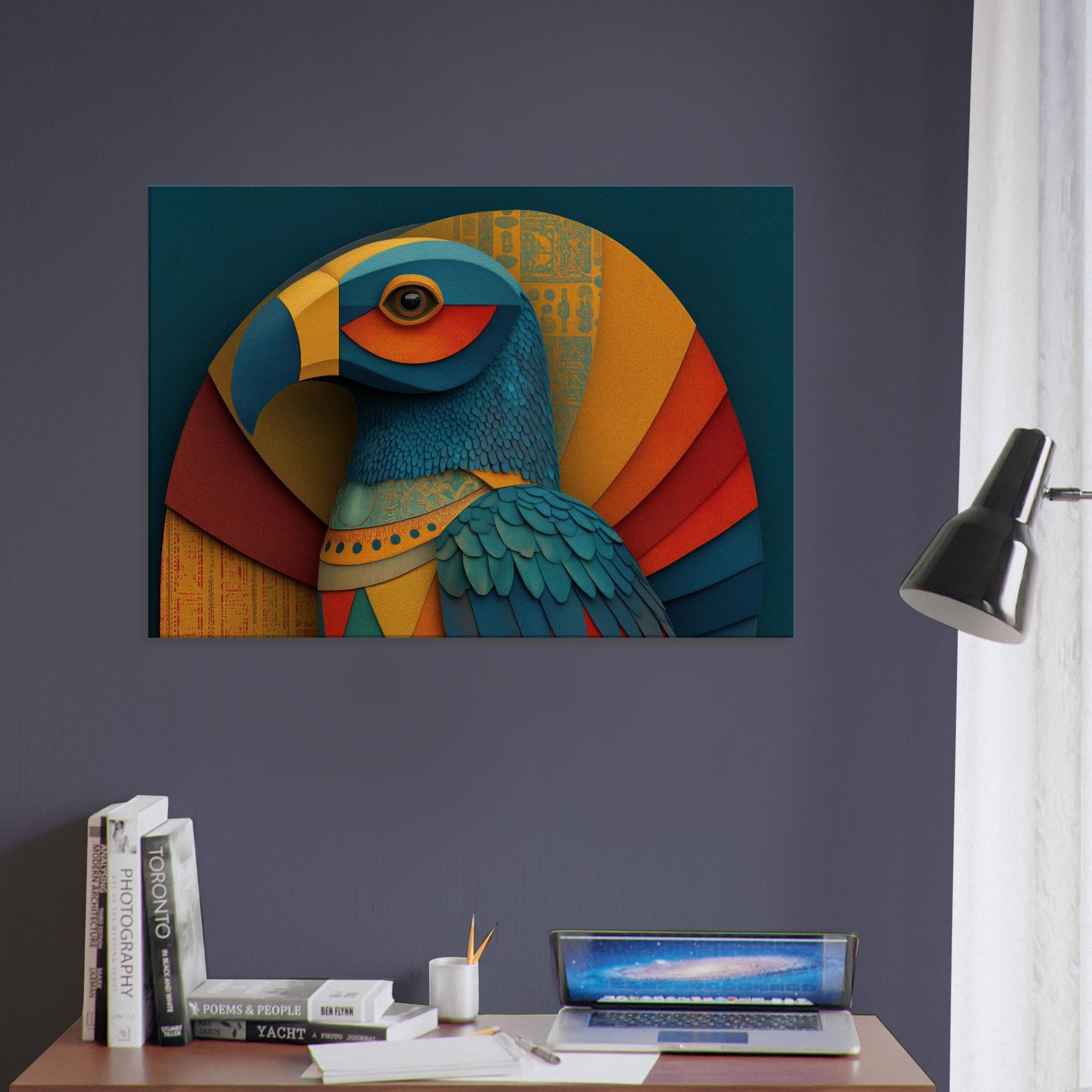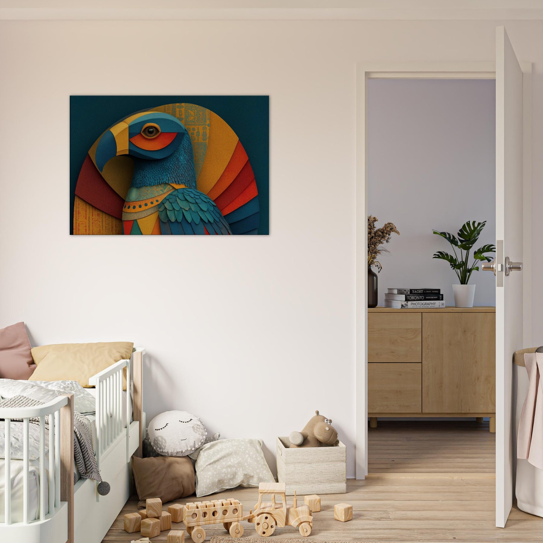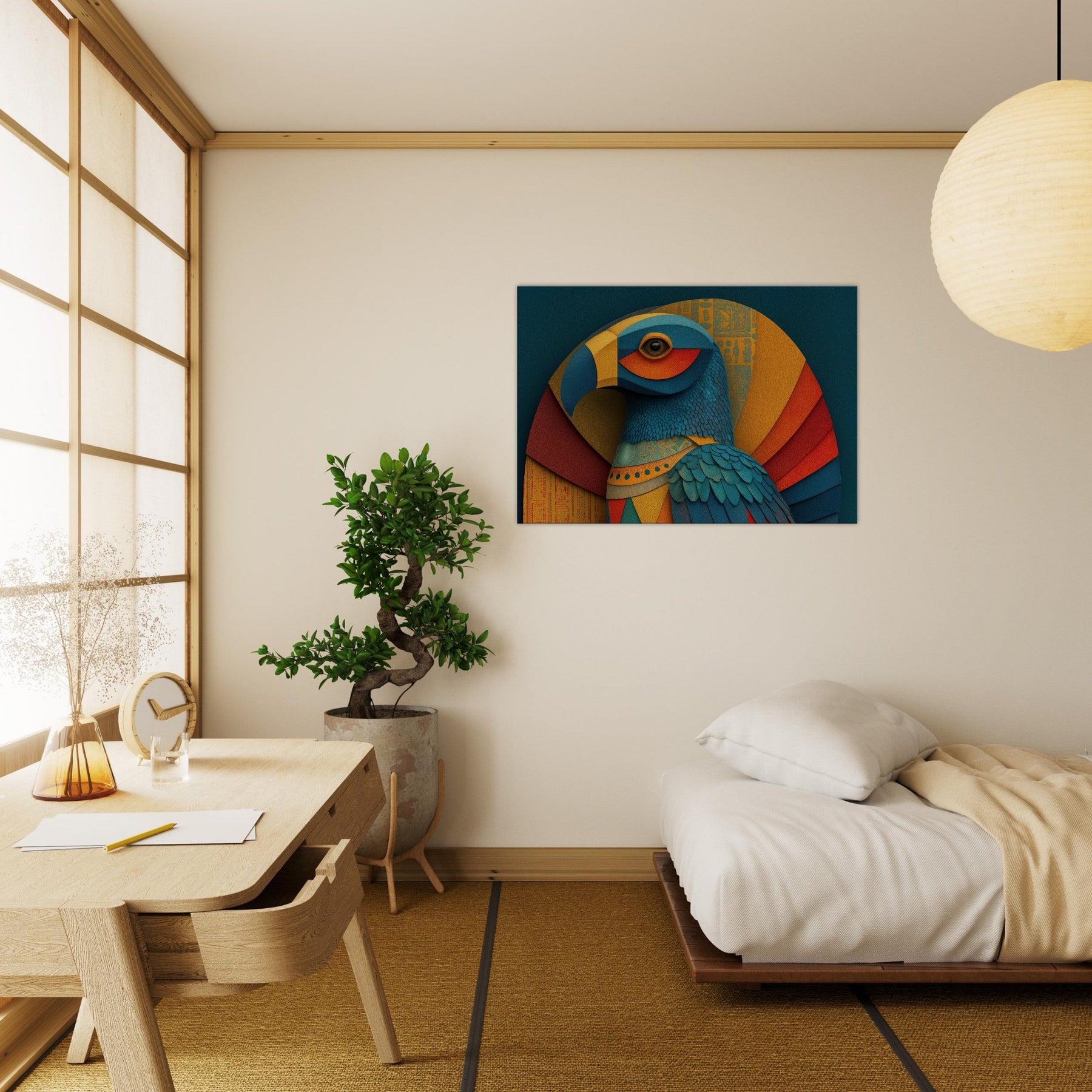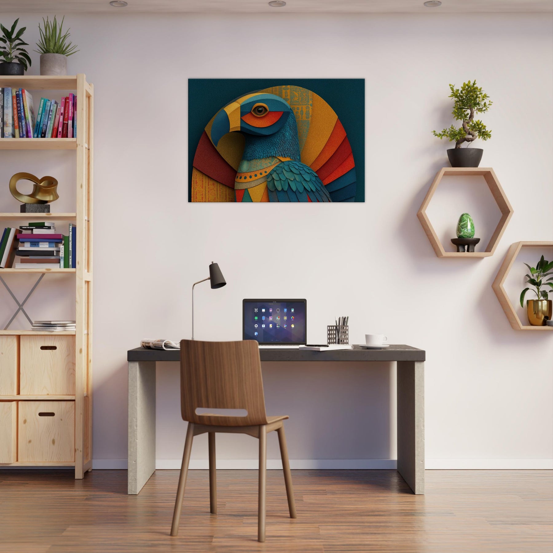 Ra, the Egyptian Sun God with A Falcon Head and Solar Crown glides through color and form in a revelatory abstraction. This wall piece breathes a warm, solar hush into any room, where teal, gold, and coral layers ripple like dawn light across textured surfaces. The birds' feathered texture becomes a tactile rhythm, while celestial arcs evoke the sun's arc through the sky. Hang it in a living space to invite mythic energy, luminous focus, and a sense of timeless ceremony.