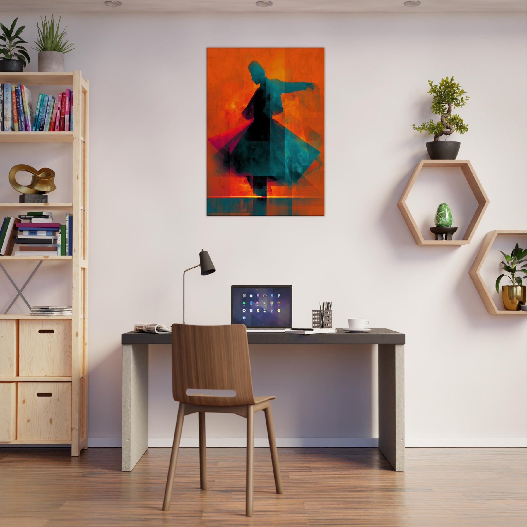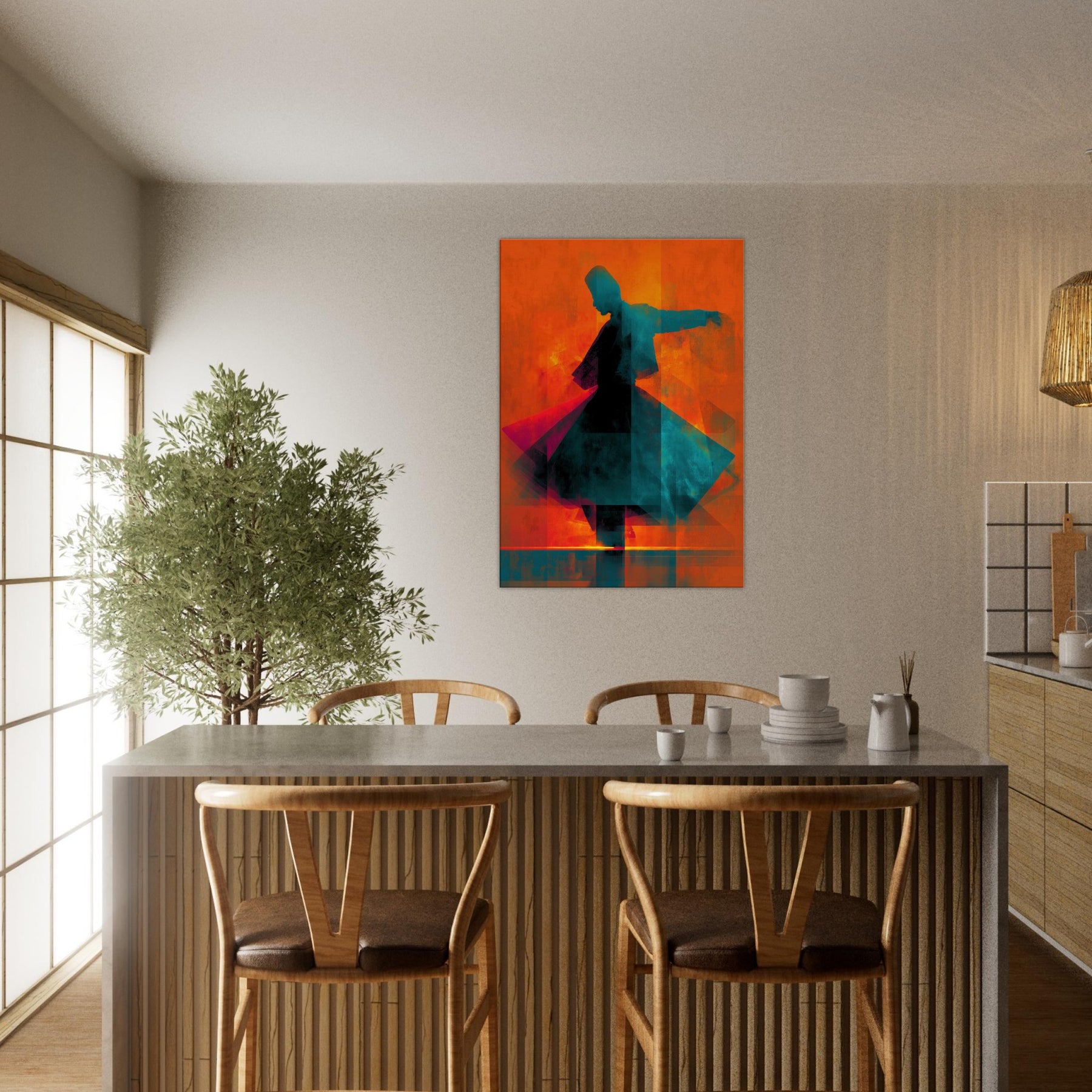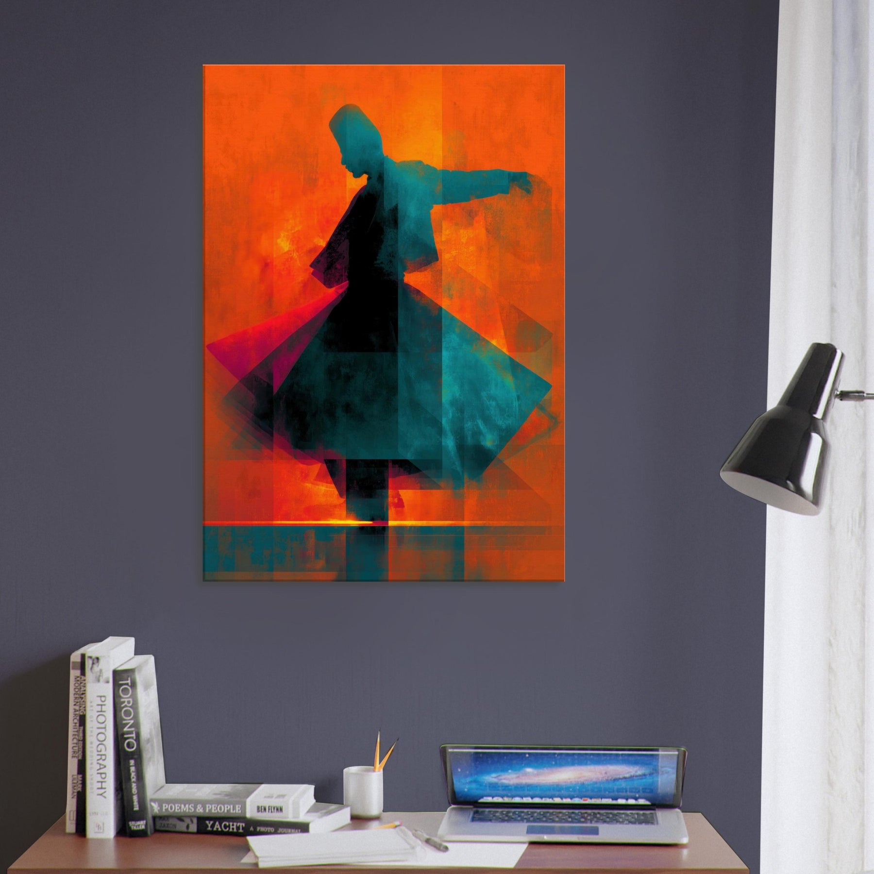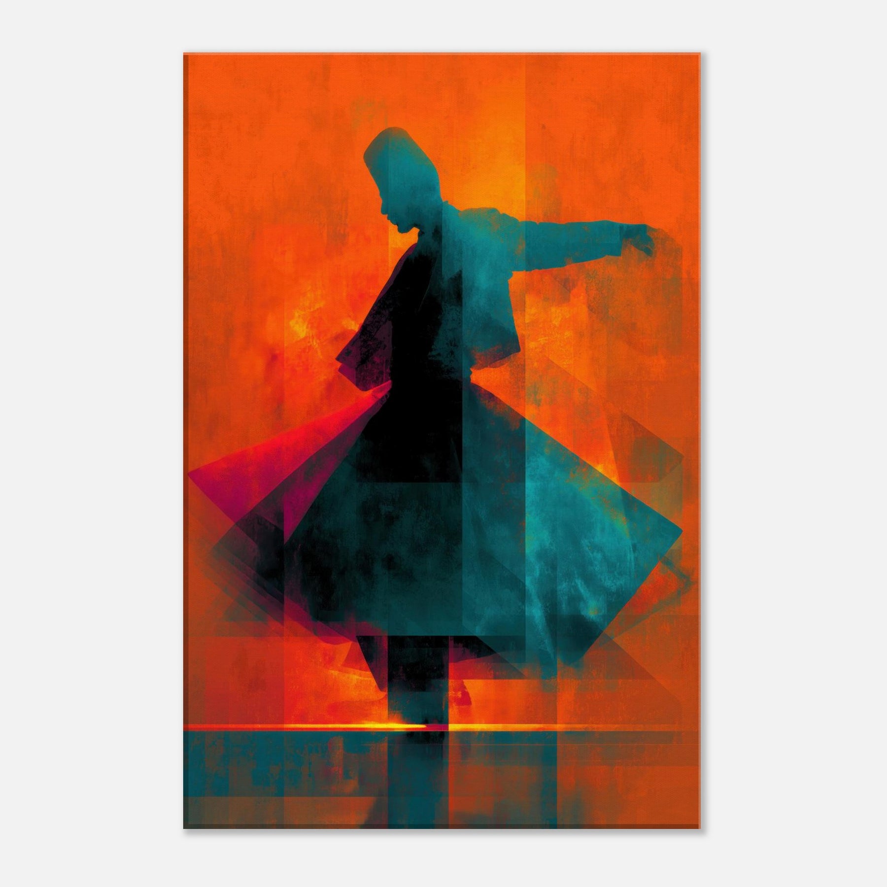 Let the Whirling Dervish Silhouette glide into your room and awaken a rhythmic hush. The abstract forms swirl in blazing oranges and cool teals, echoing a meditative wind that folds time and space. This piece channels movement and stillness at once, inviting conversation and reflection. Hang it where morning light skim the wall or where evening glow softens the edges of furniture; it will warm the room with mystic energy, transforming an ordinary living space into a quiet, kinetic sanctuary.