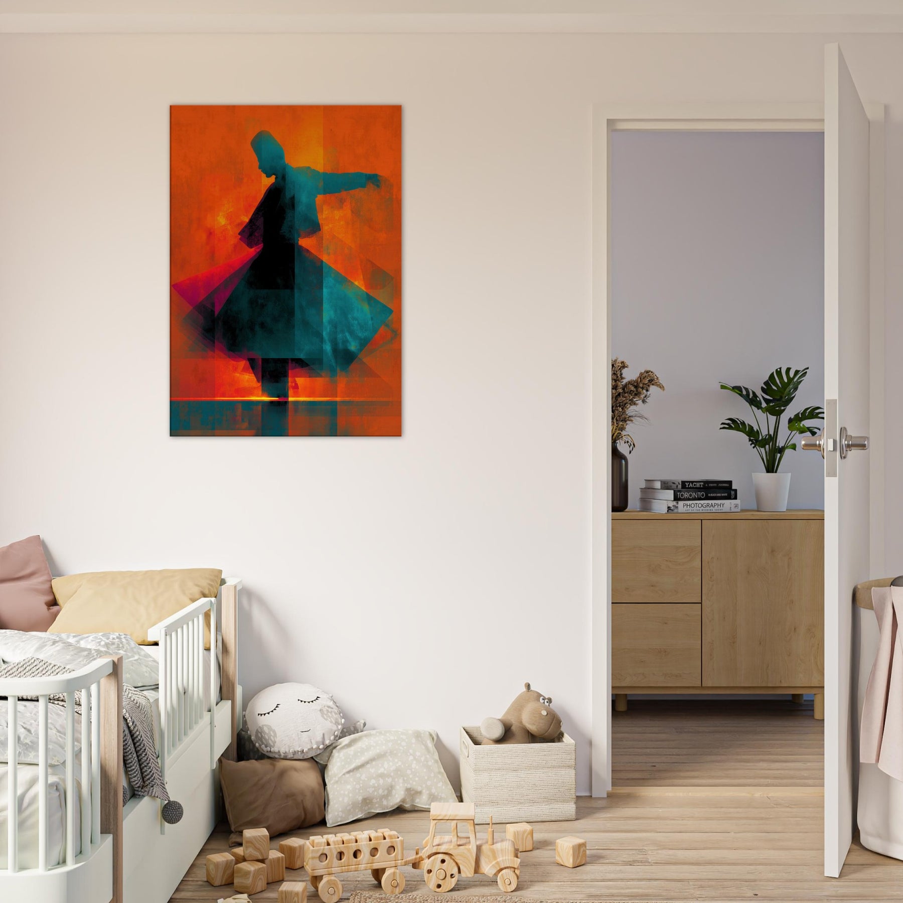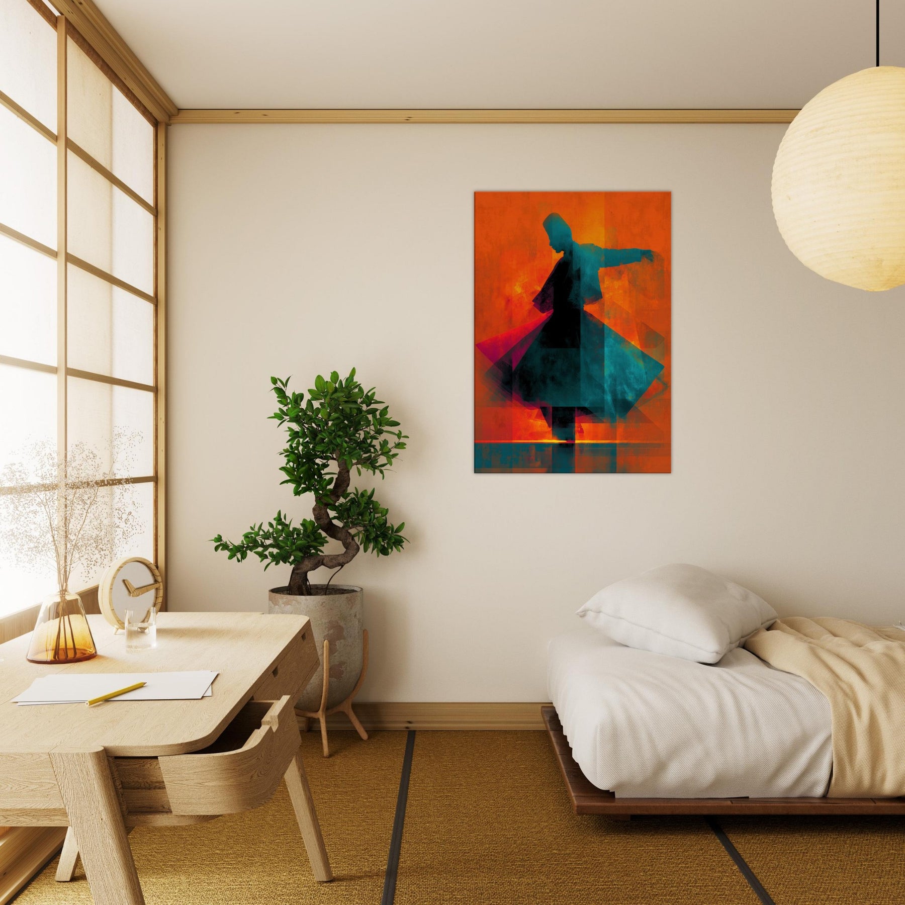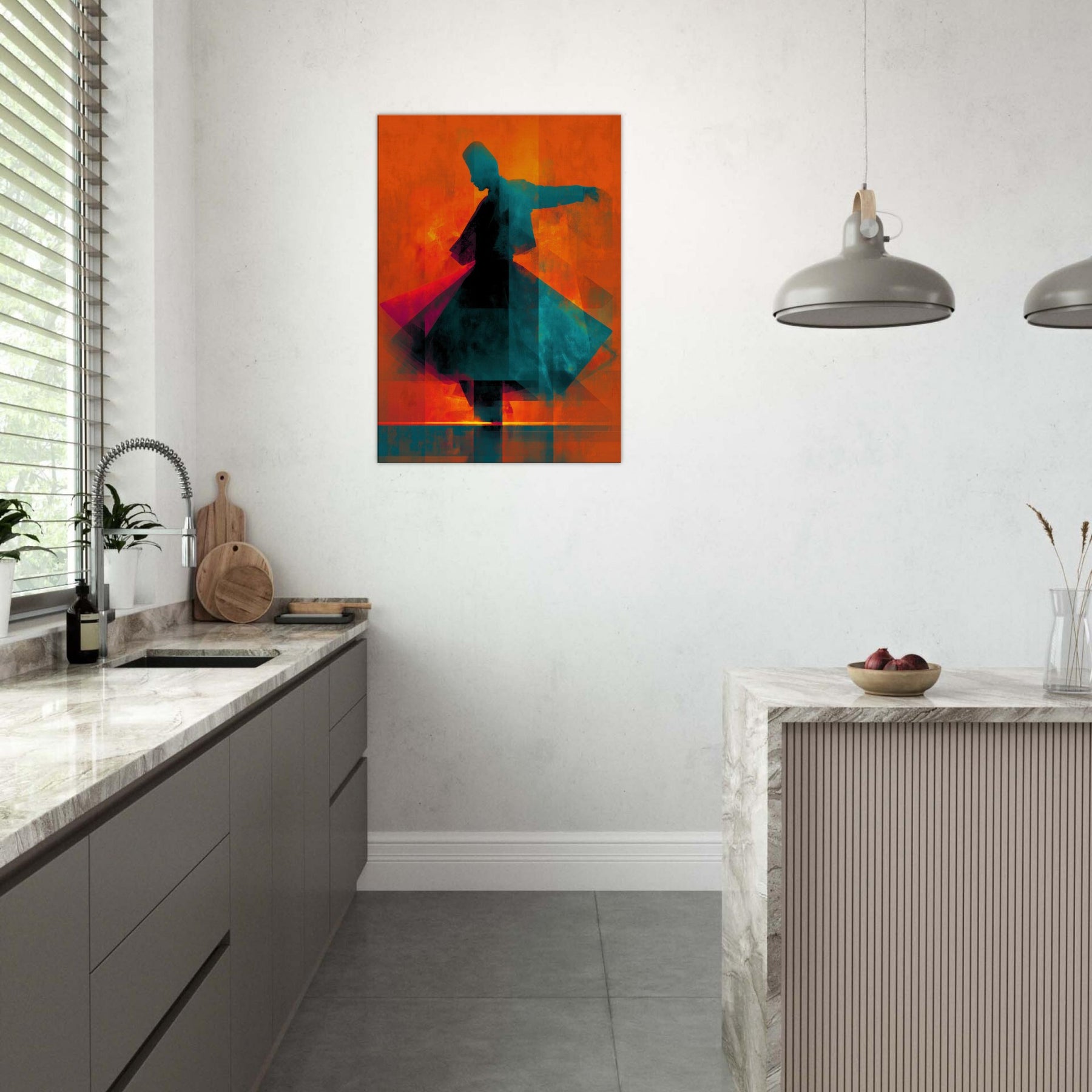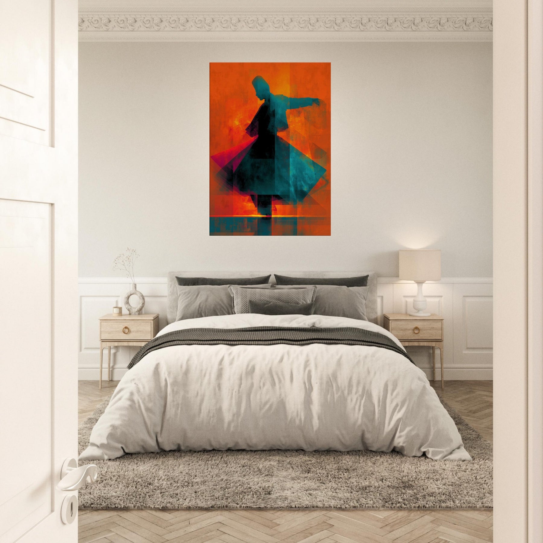 Let the Whirling Dervish Silhouette glide into your room and awaken a rhythmic hush. The abstract forms swirl in blazing oranges and cool teals, echoing a meditative wind that folds time and space. This piece channels movement and stillness at once, inviting conversation and reflection. Hang it where morning light skim the wall or where evening glow softens the edges of furniture; it will warm the room with mystic energy, transforming an ordinary living space into a quiet, kinetic sanctuary.