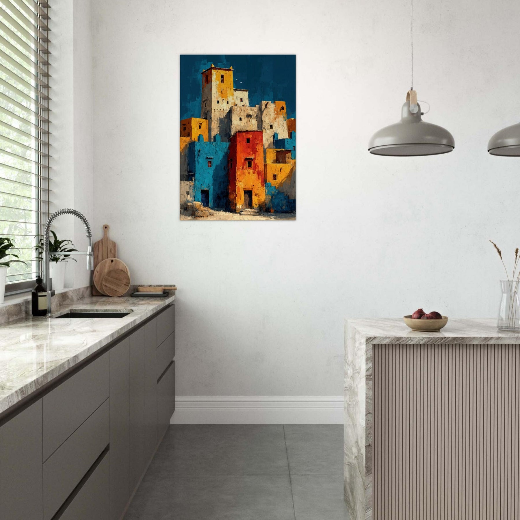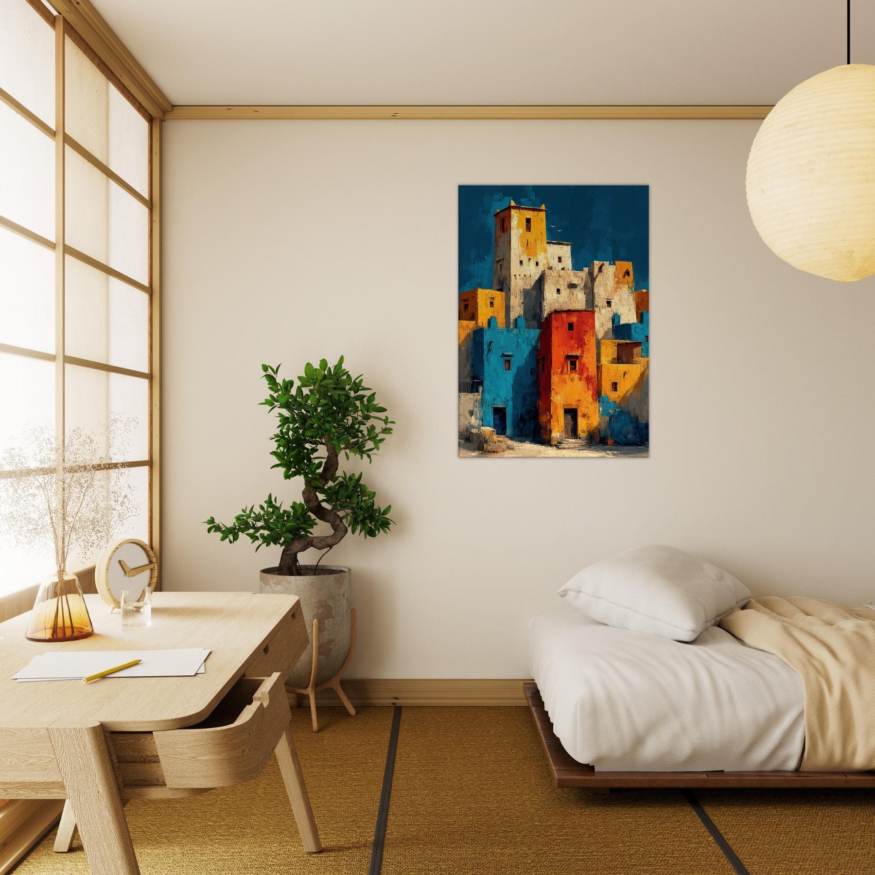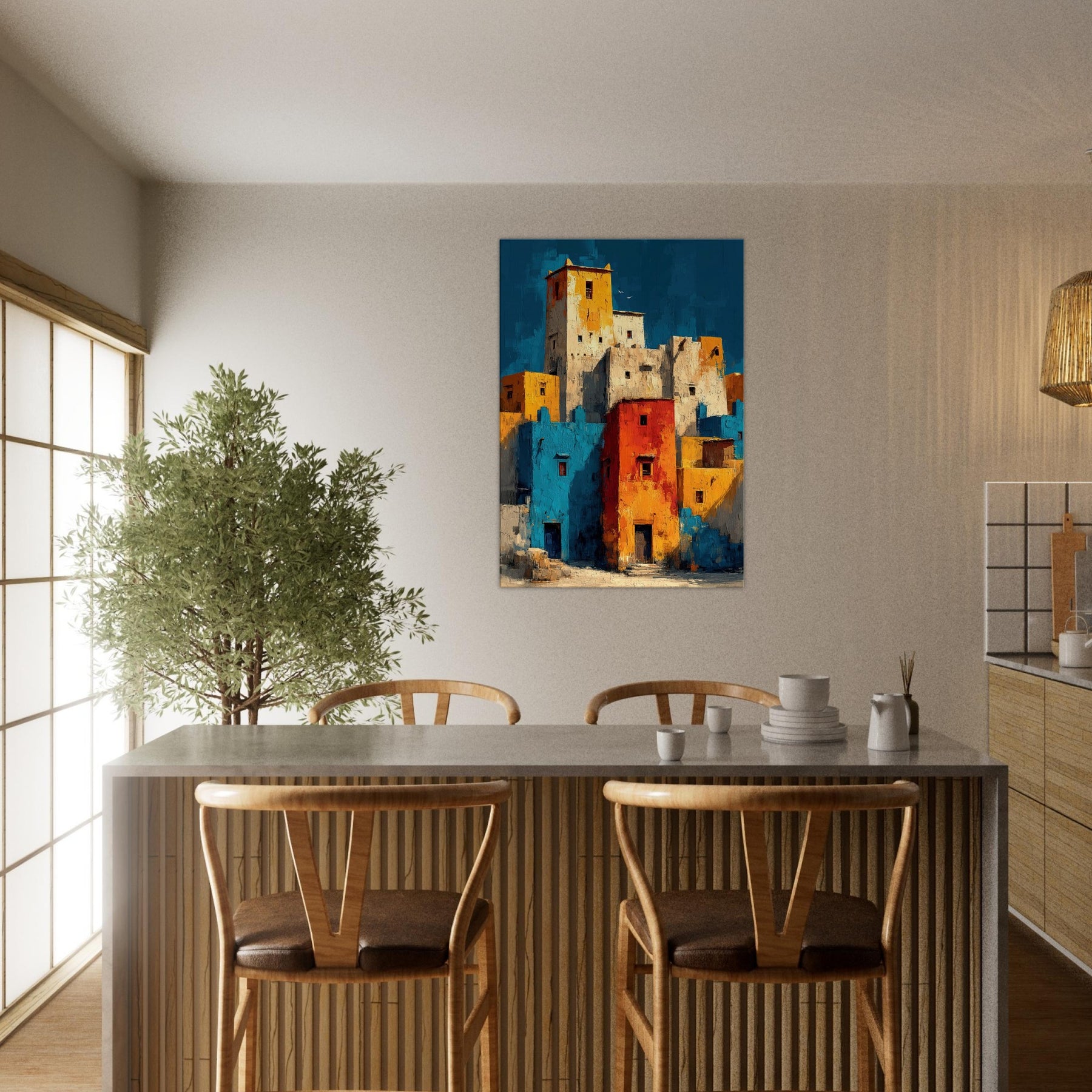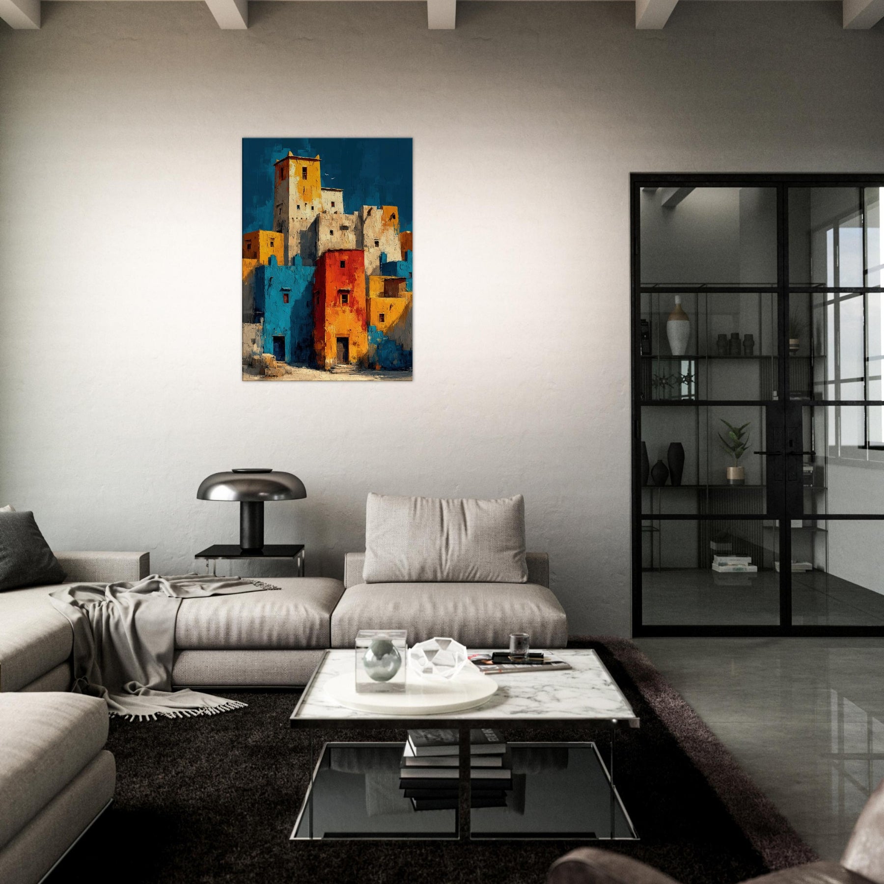 Immerse your space in the sun washed atmosphere of Marrakech, reimagined as a bold rhythm of color and texture. This abstract cityscape dissolves architectural grids into towers of ochre, turquoise, and clay, as if the sun itself were painting the walls. The result is a warm, luminous presence that elevates a living room with a sense of wandering markets, whispering alleys, and evening breeze. It invites quiet contemplation while energizing everyday moments with color and light.