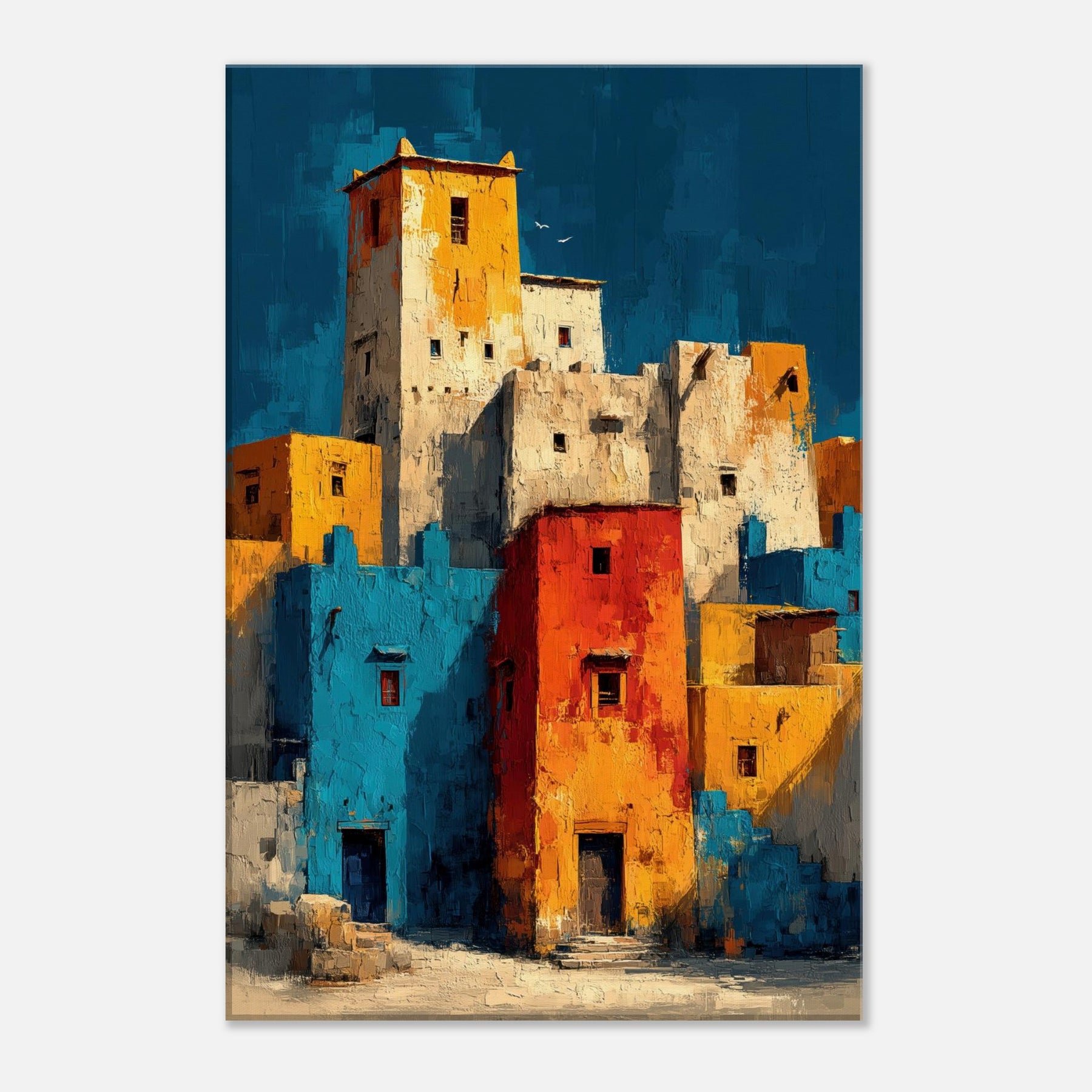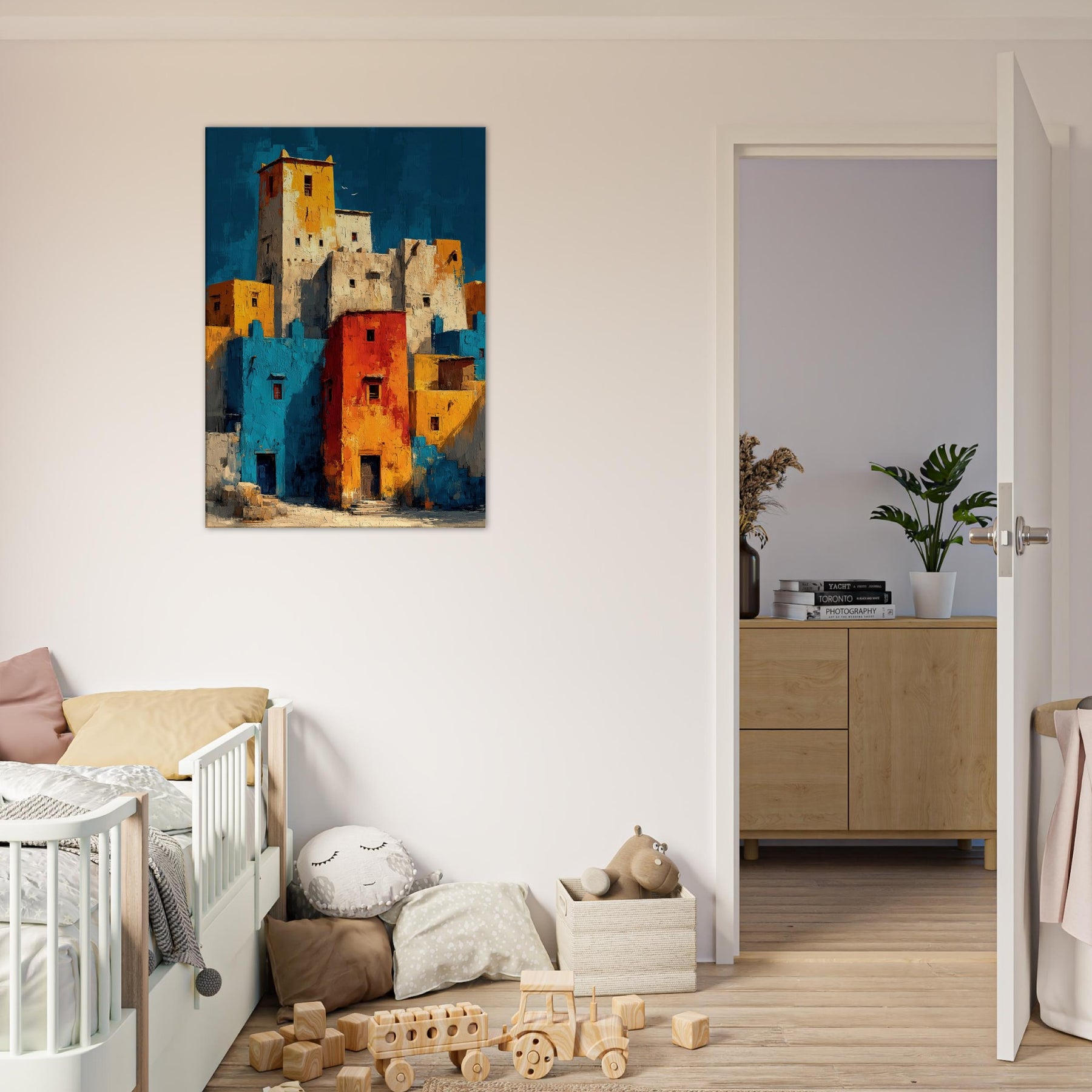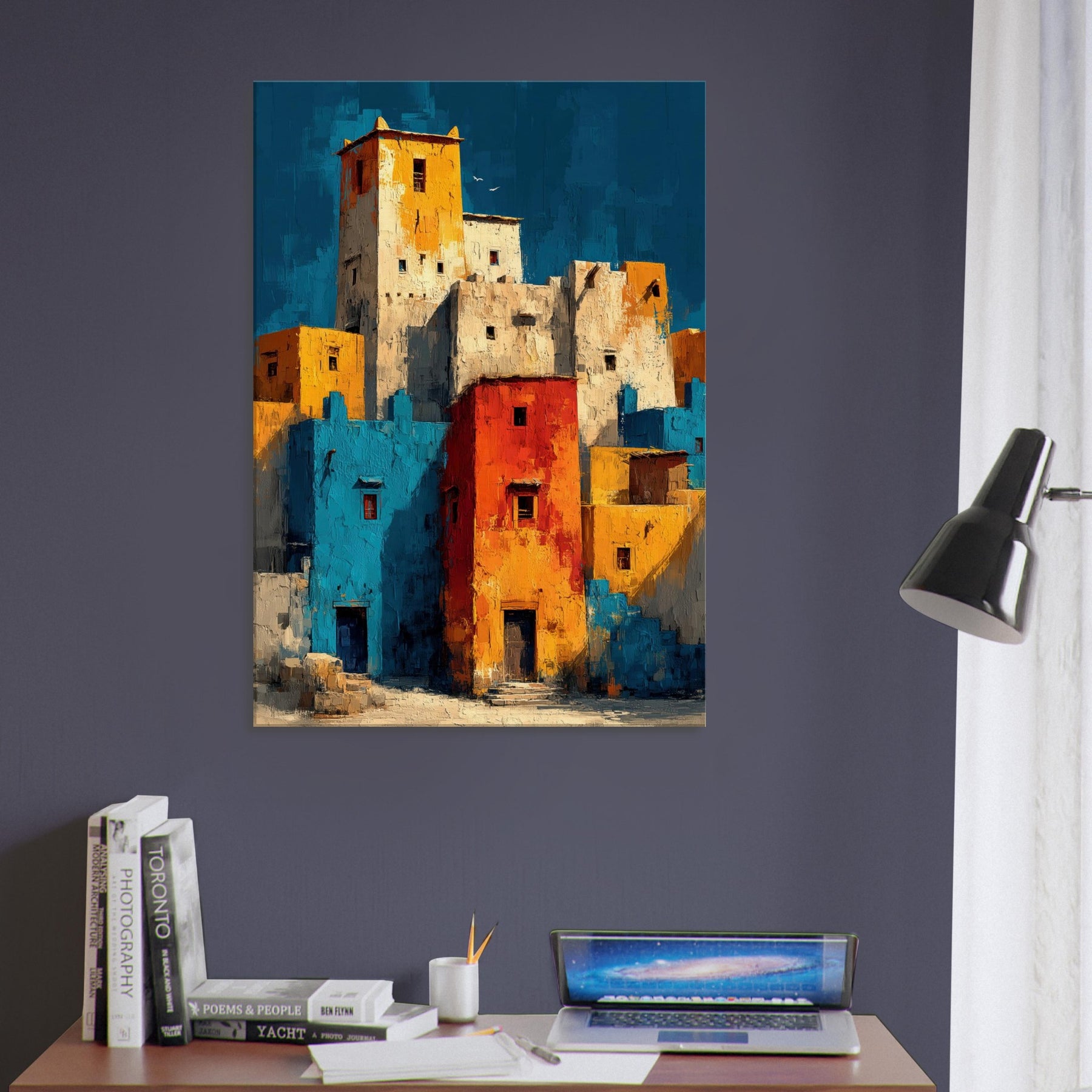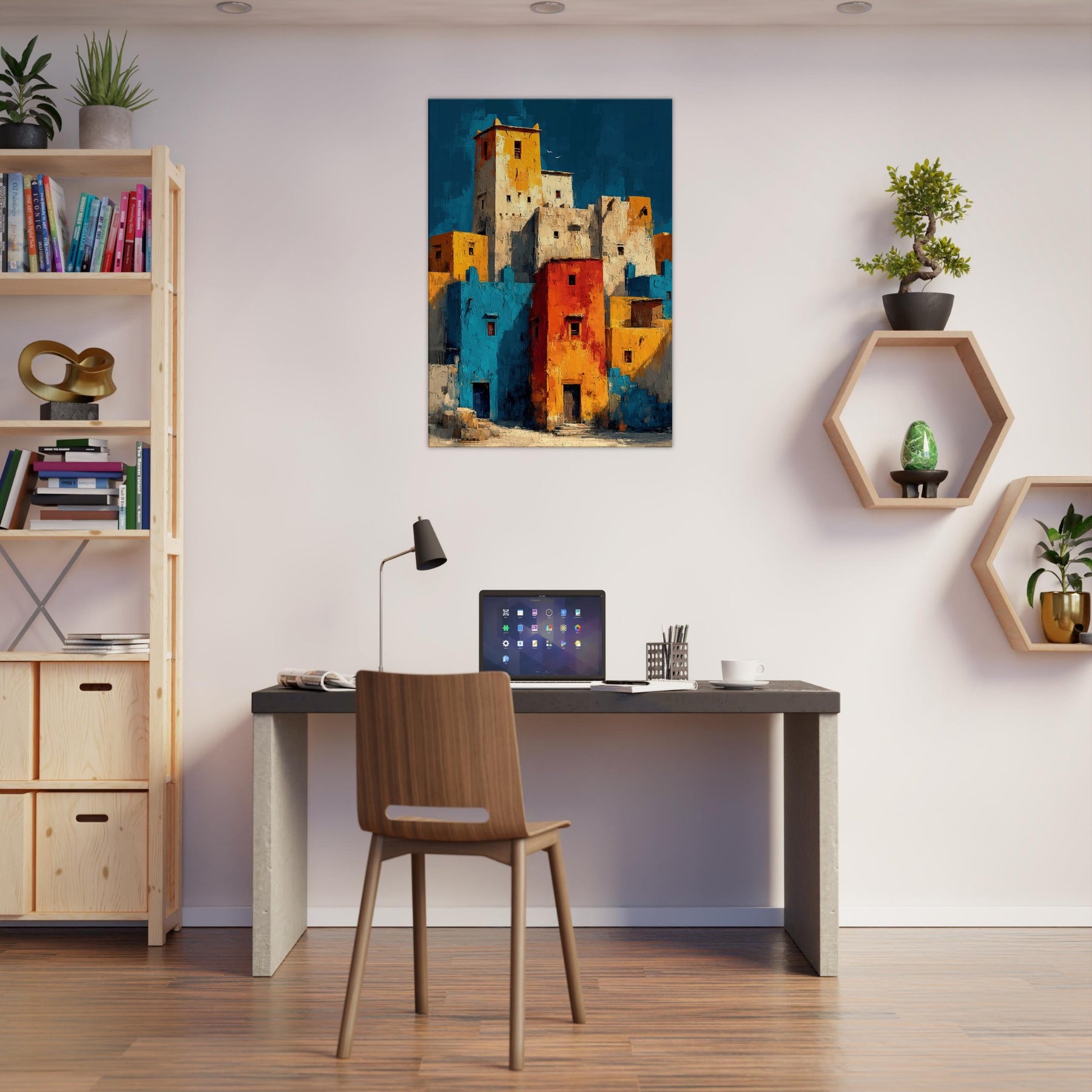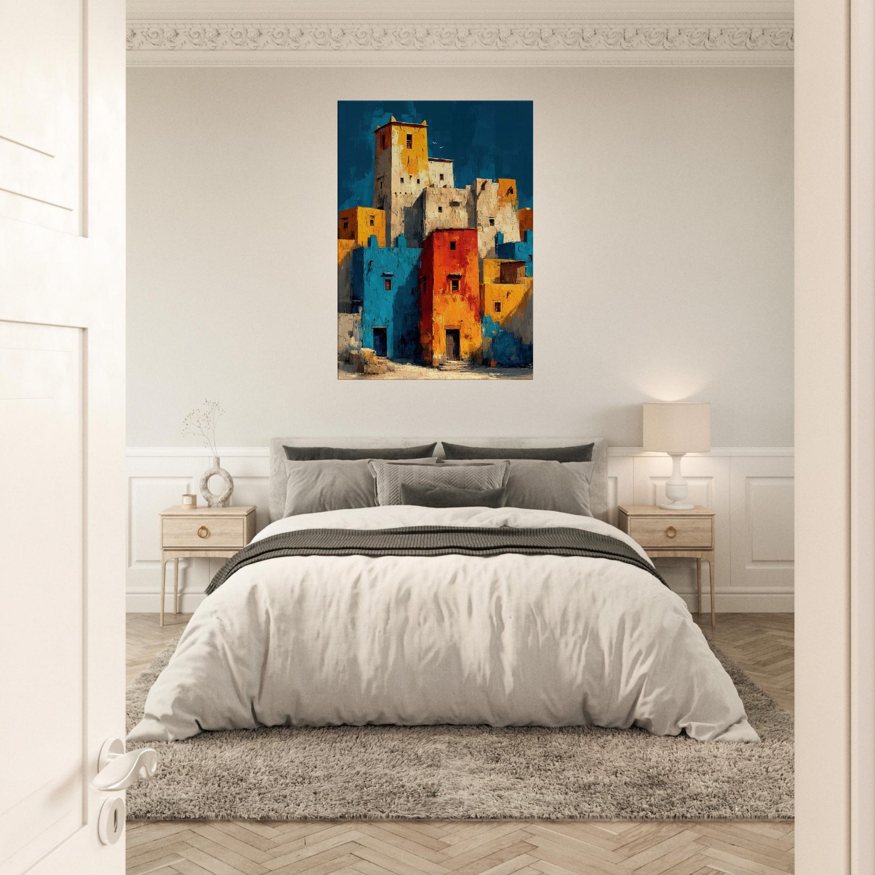 Immerse your space in the sun washed atmosphere of Marrakech, reimagined as a bold rhythm of color and texture. This abstract cityscape dissolves architectural grids into towers of ochre, turquoise, and clay, as if the sun itself were painting the walls. The result is a warm, luminous presence that elevates a living room with a sense of wandering markets, whispering alleys, and evening breeze. It invites quiet contemplation while energizing everyday moments with color and light.
