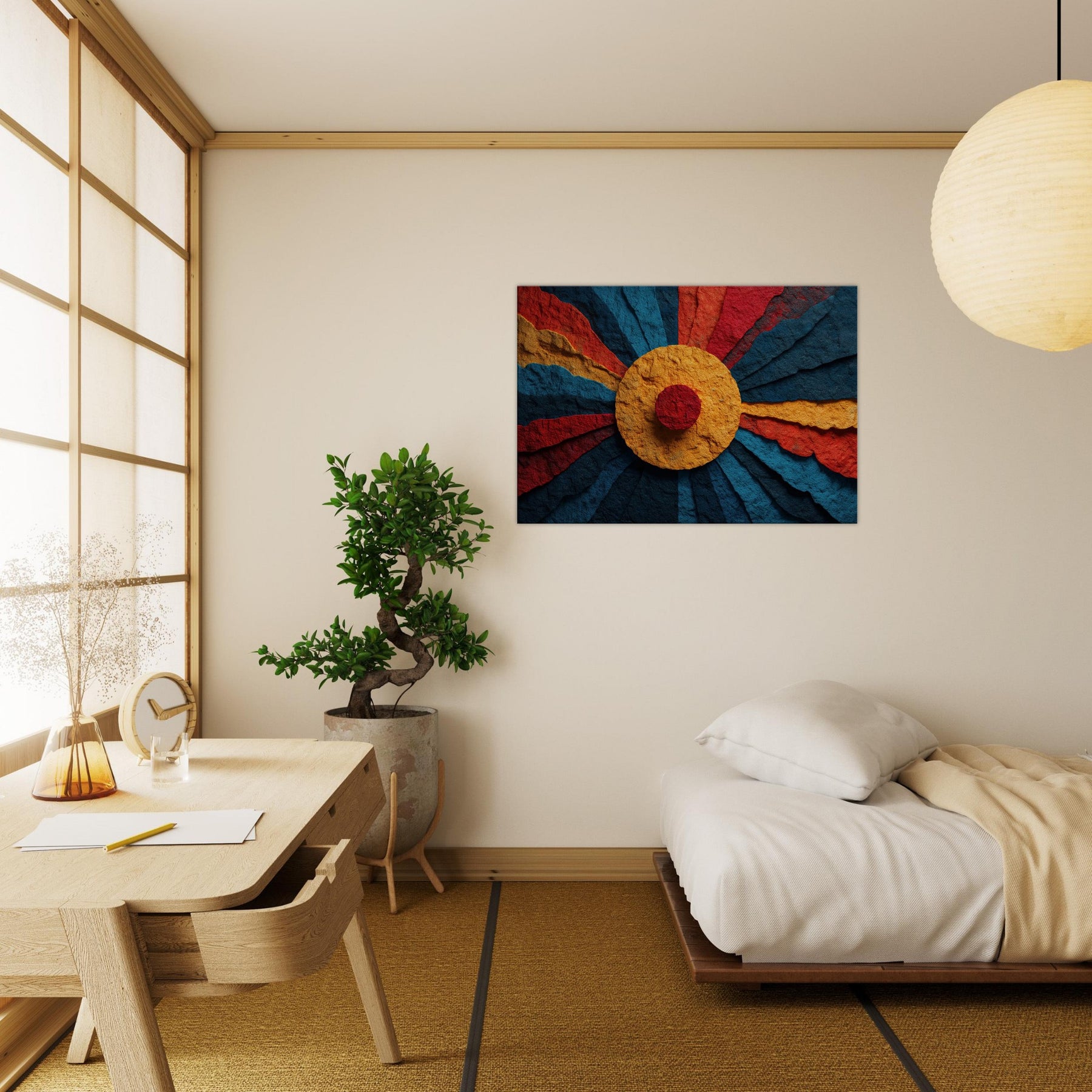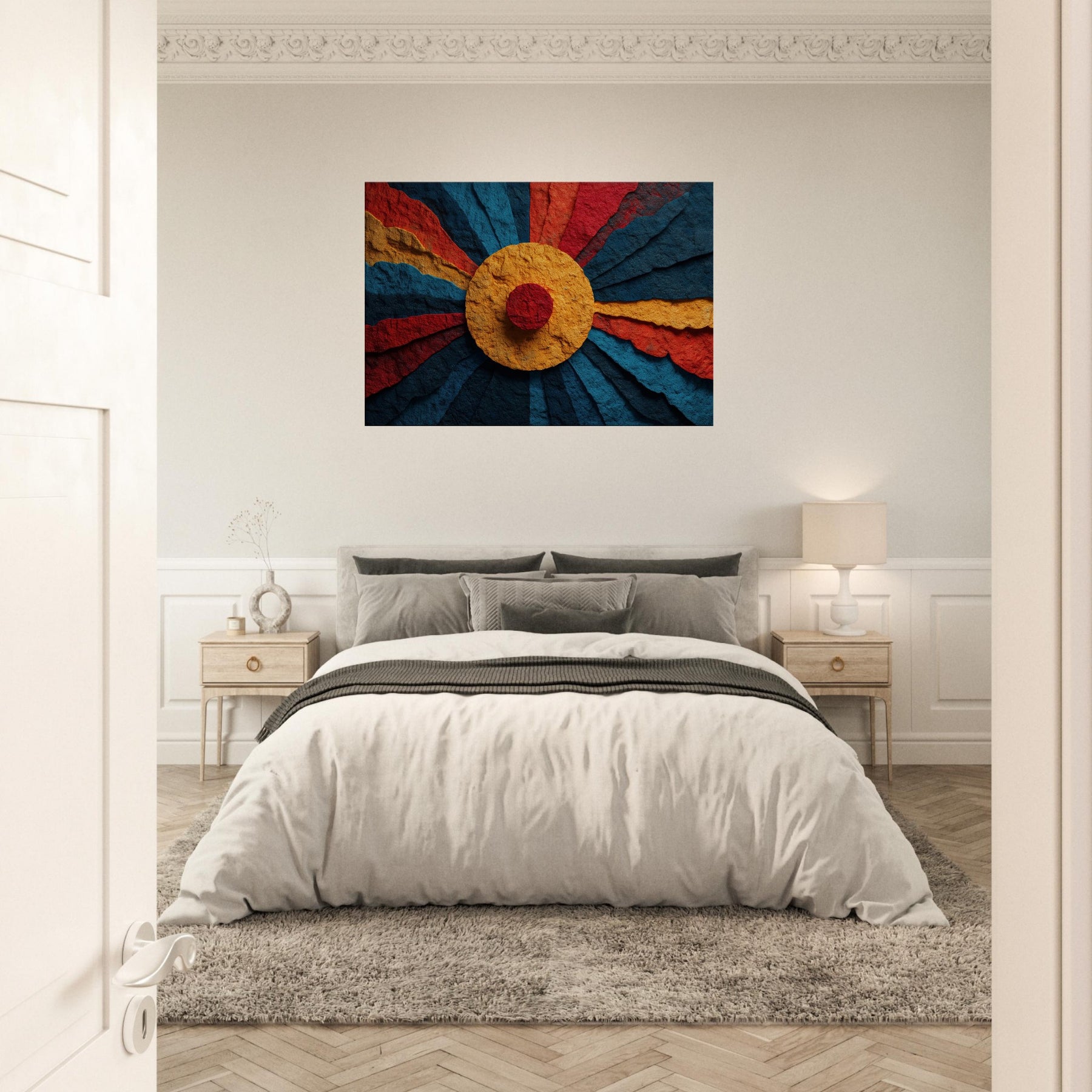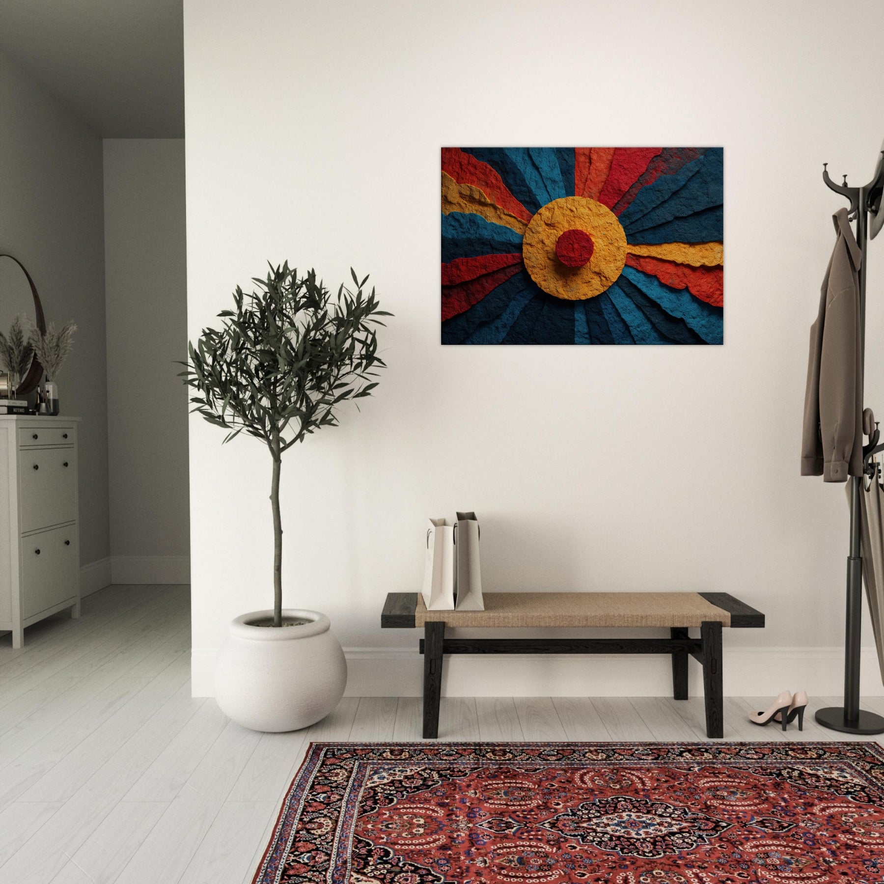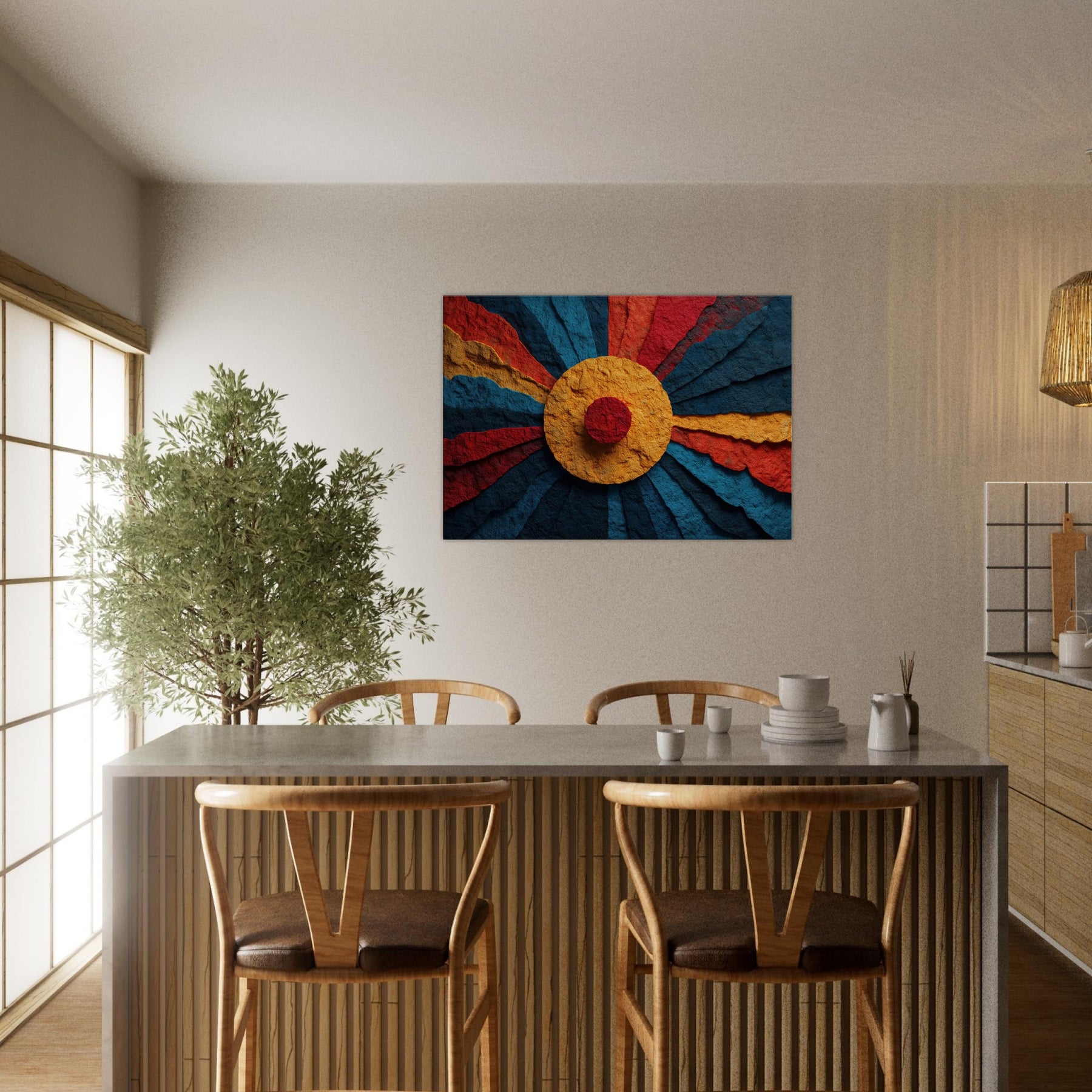 A luminous abstraction that circles inward, the Dharma Wheel pulses with color and motion. Each ring of textured pigment suggests breath, a quiet mantra you can feel under your fingertips. In a living room or studio, this piece breathes with you, turning walls into a meditation alcove. The mystical energy of the wheel invites reflection, while the vivid hues amber, cobalt, ruby create a warm, contemporary atmosphere that elevates any space. The central subject is Dharma Wheel (Dharmachakra).