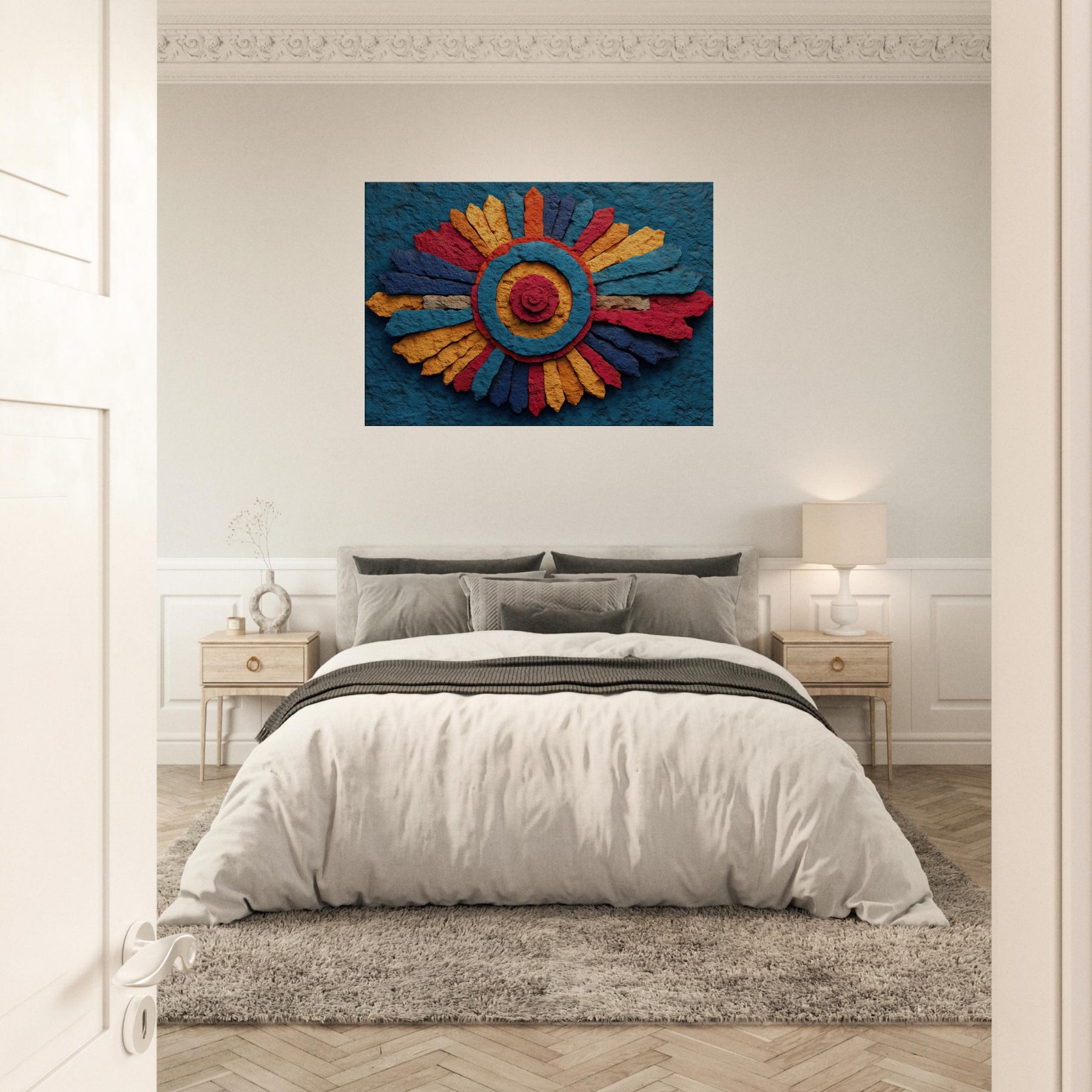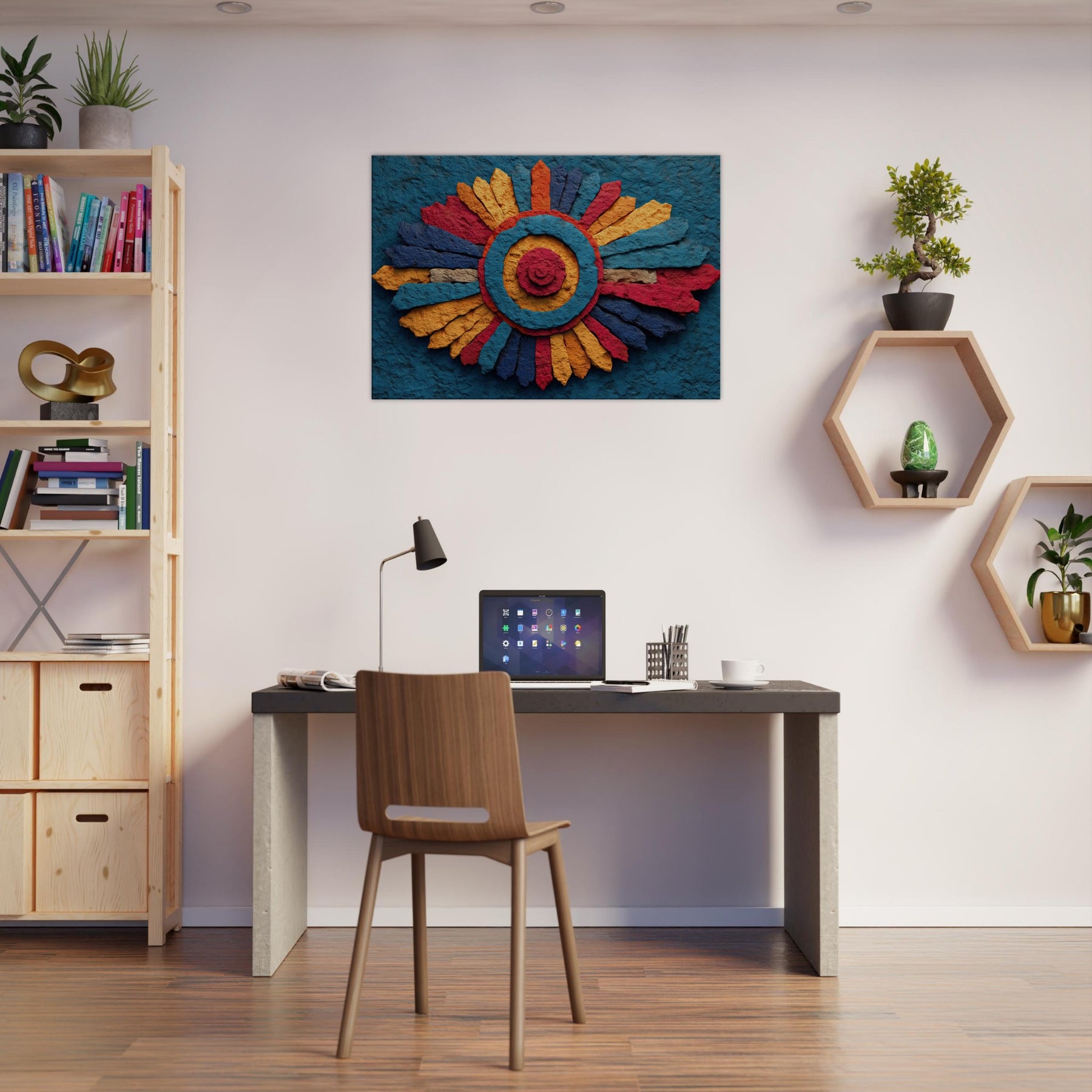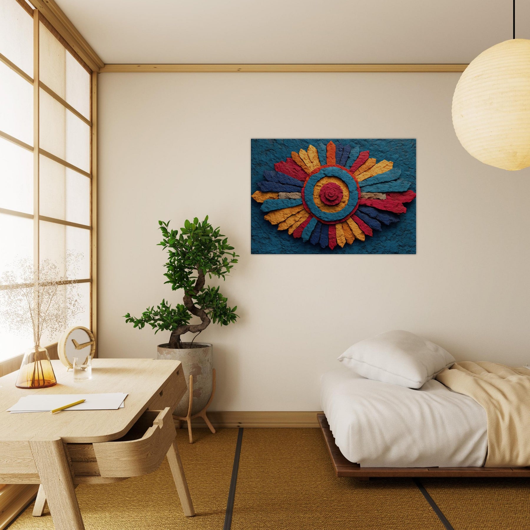 A meditative centerpiece, this Dharmachakra inspired sculpture unfolds in vibrant, tactile layers. The Dharma Wheel radiates from a coiled focal point, rings of turquoise and saffron spiraling outward into radiant segments. The abstract palette blue, orange, red, gold suggests sunrise over a distant mandala, inviting contemplation and a sense of calm through the living room. Perfect above a sofa or in a hallway, it adds warmth, depth, and a mystical hush. The central subject is Dharma Wheel (Dharmachakra).