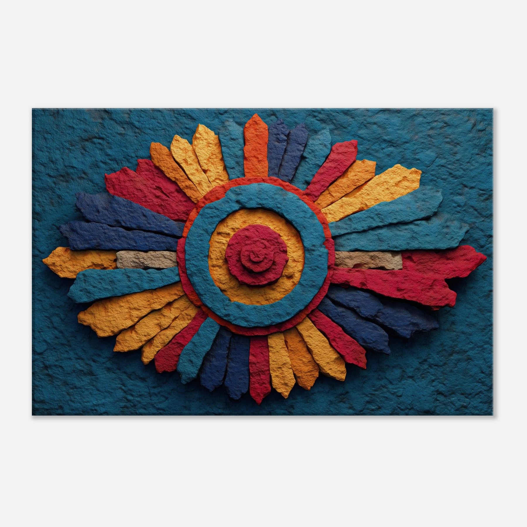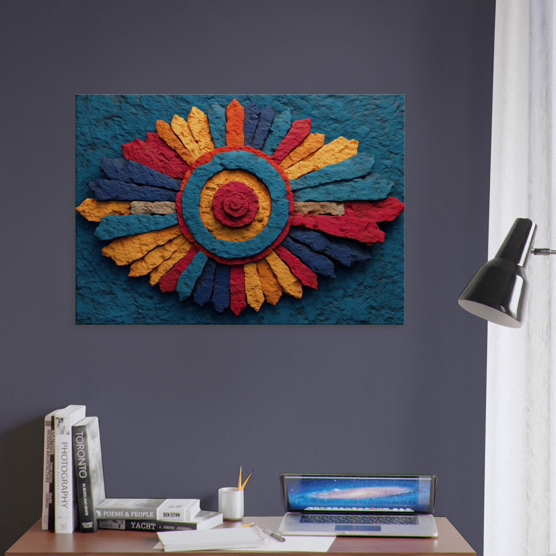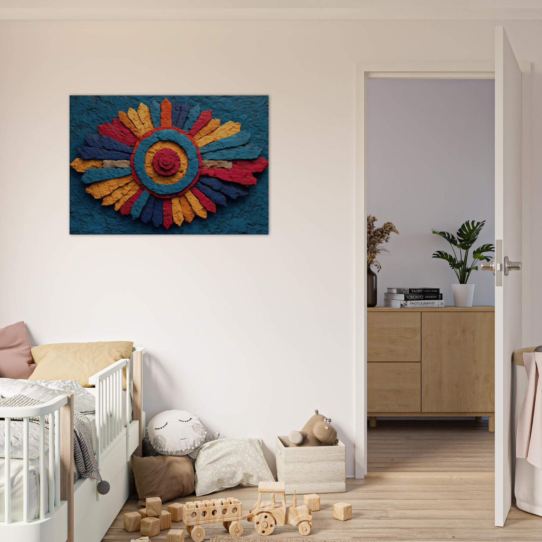 A meditative centerpiece, this Dharmachakra inspired sculpture unfolds in vibrant, tactile layers. The Dharma Wheel radiates from a coiled focal point, rings of turquoise and saffron spiraling outward into radiant segments. The abstract palette blue, orange, red, gold suggests sunrise over a distant mandala, inviting contemplation and a sense of calm through the living room. Perfect above a sofa or in a hallway, it adds warmth, depth, and a mystical hush. The central subject is Dharma Wheel (Dharmachakra).