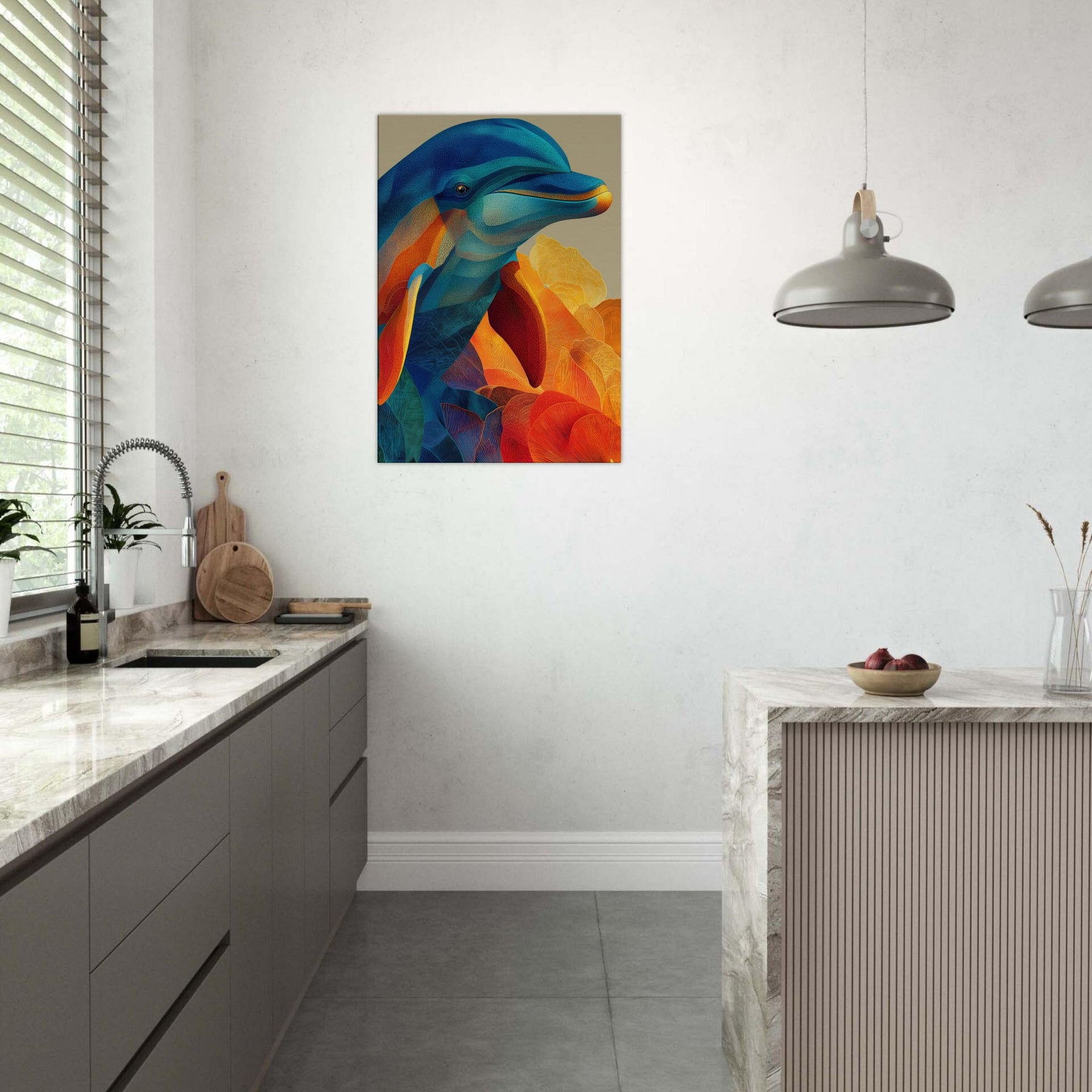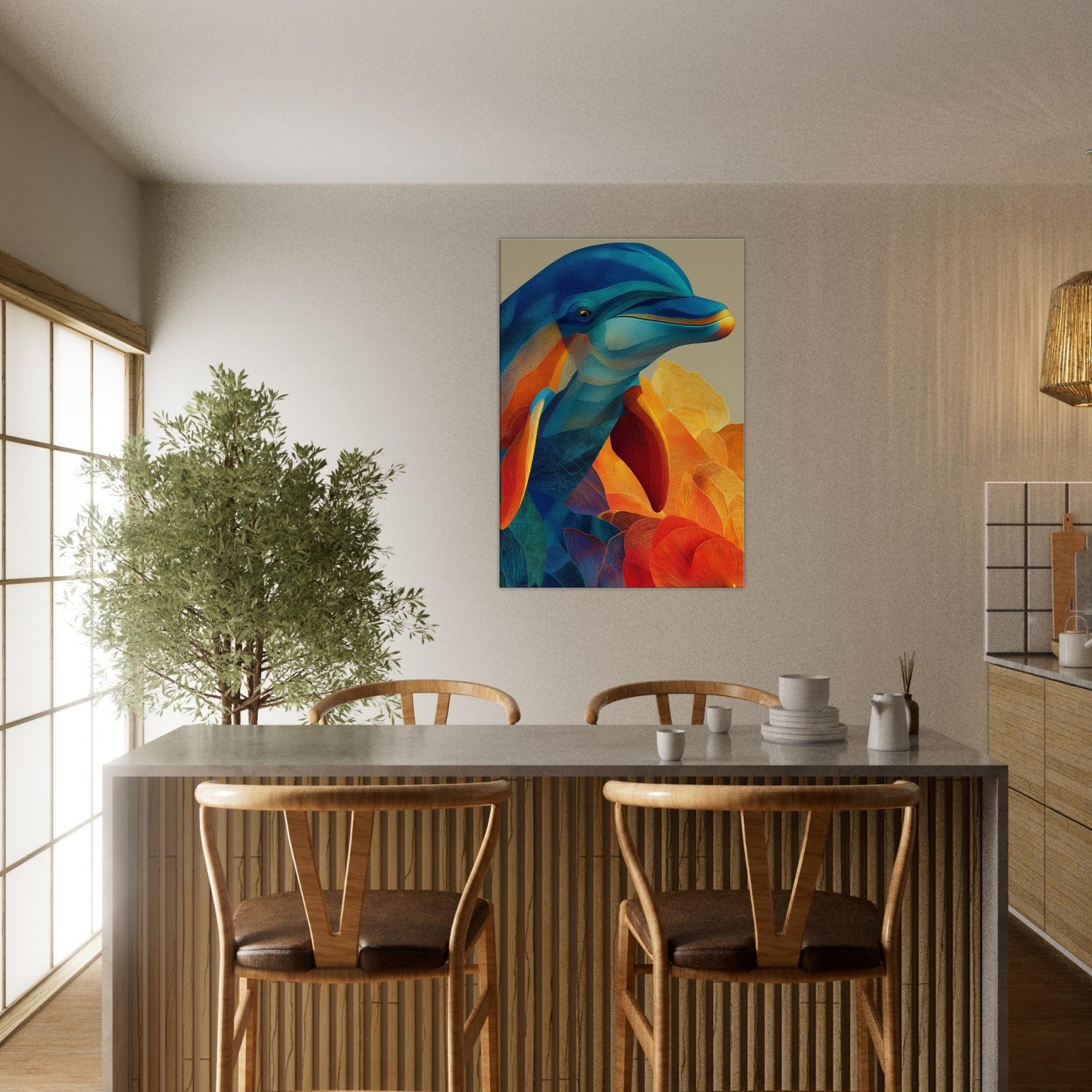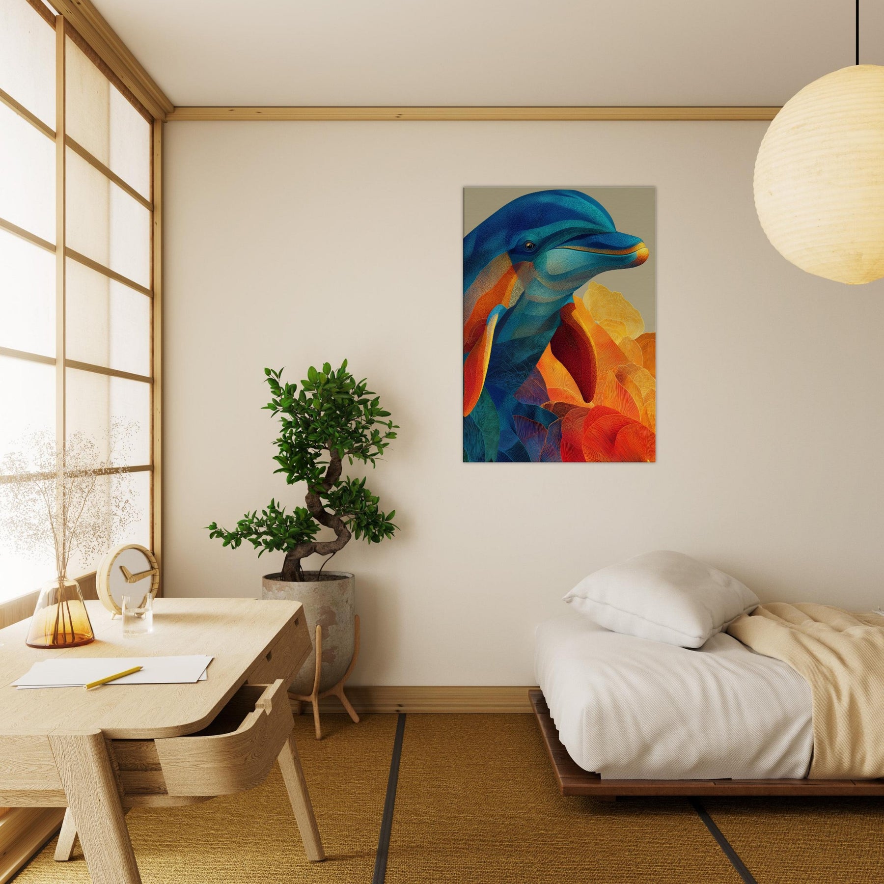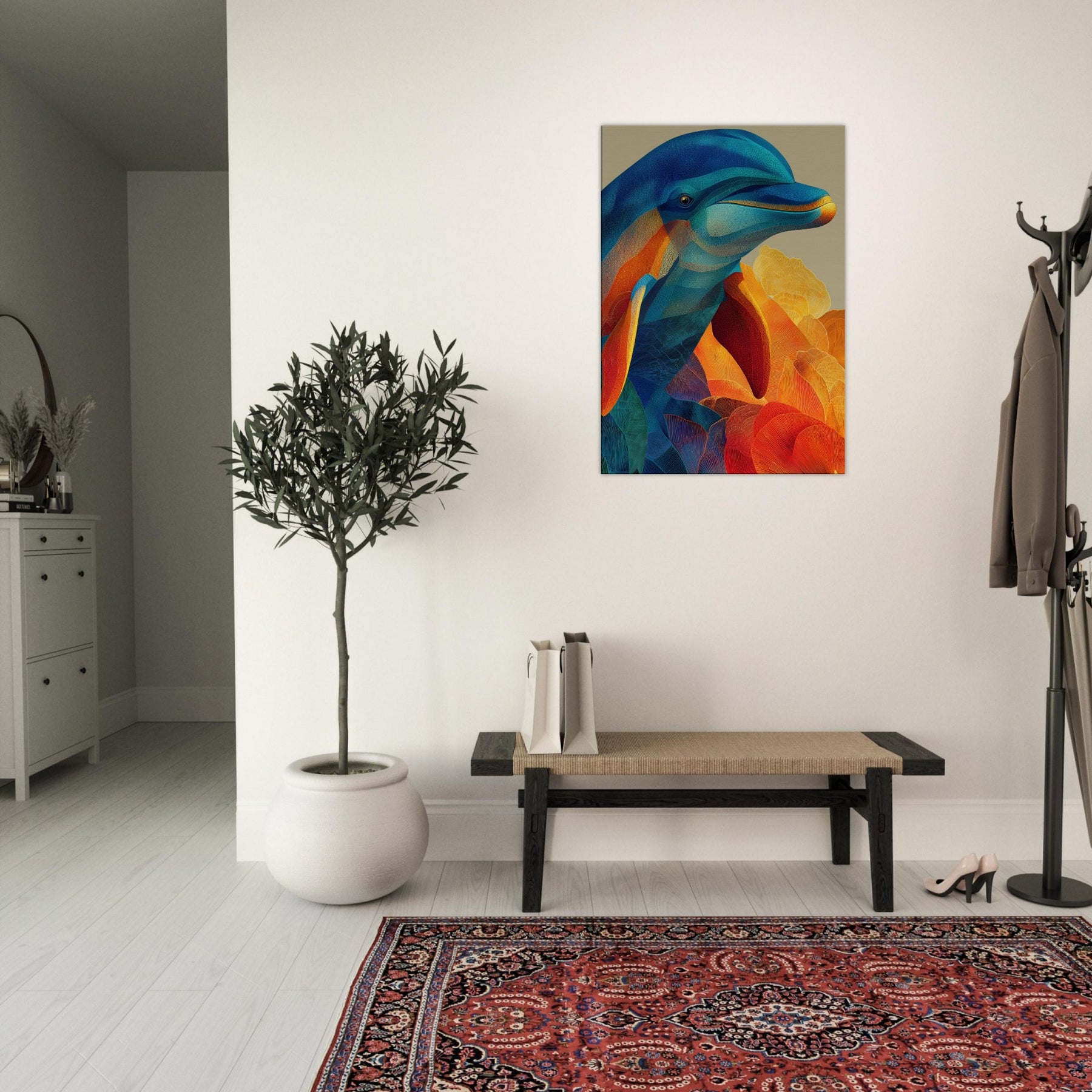 Let this abstract dolphin wash your living room in color and calm. The dolphin silhouette glides through a luminous sea of citrus, cobalt, and coral, as sunlight ripples across a tranquil underwater . The piece invites quiet reflection and movement, turning a plain wall into a living moment where form dissolves into feeling. A graceful focal point for modern decor, it pairs beautifully with textured textiles and warm wood, creating an inviting ambience that lingers after sunset.