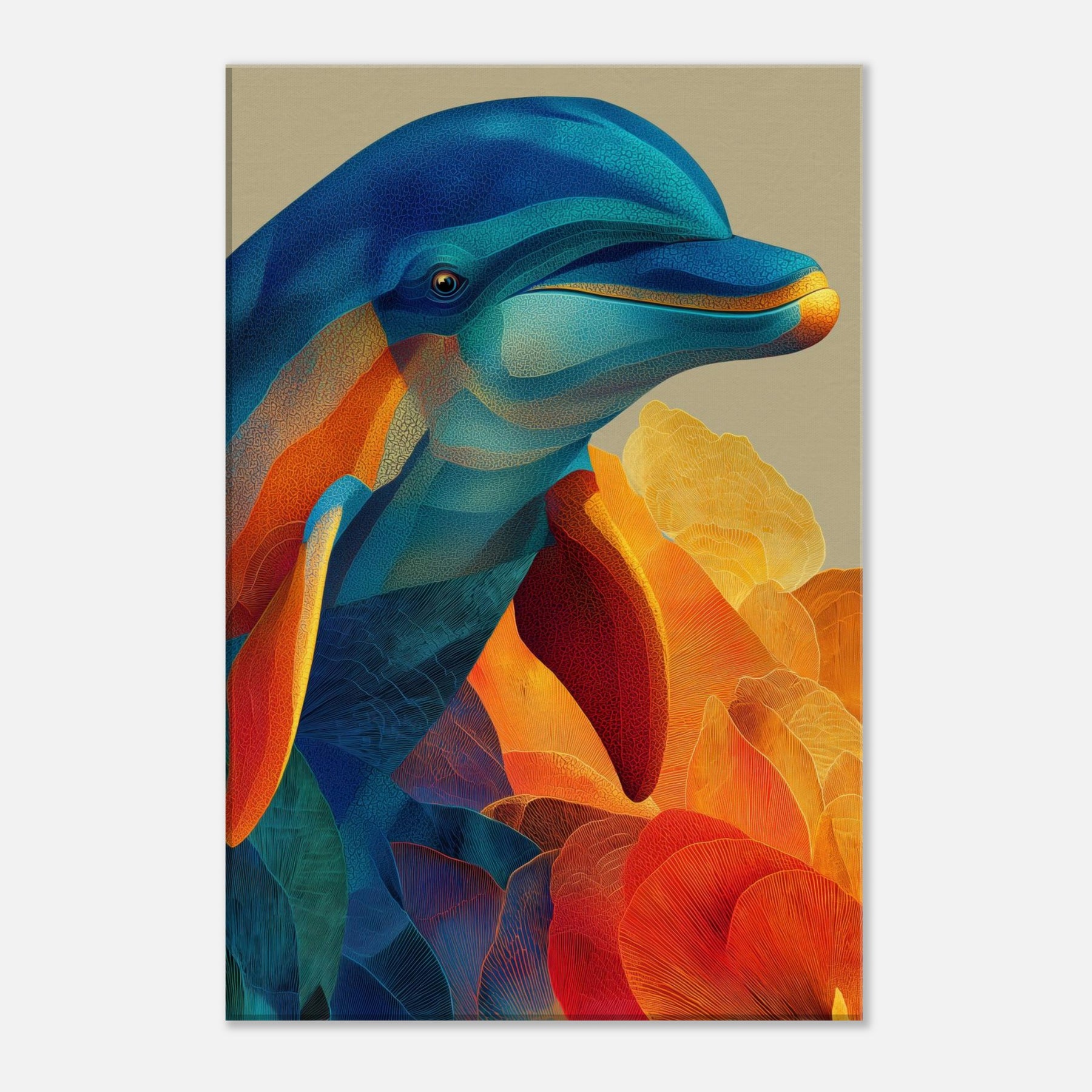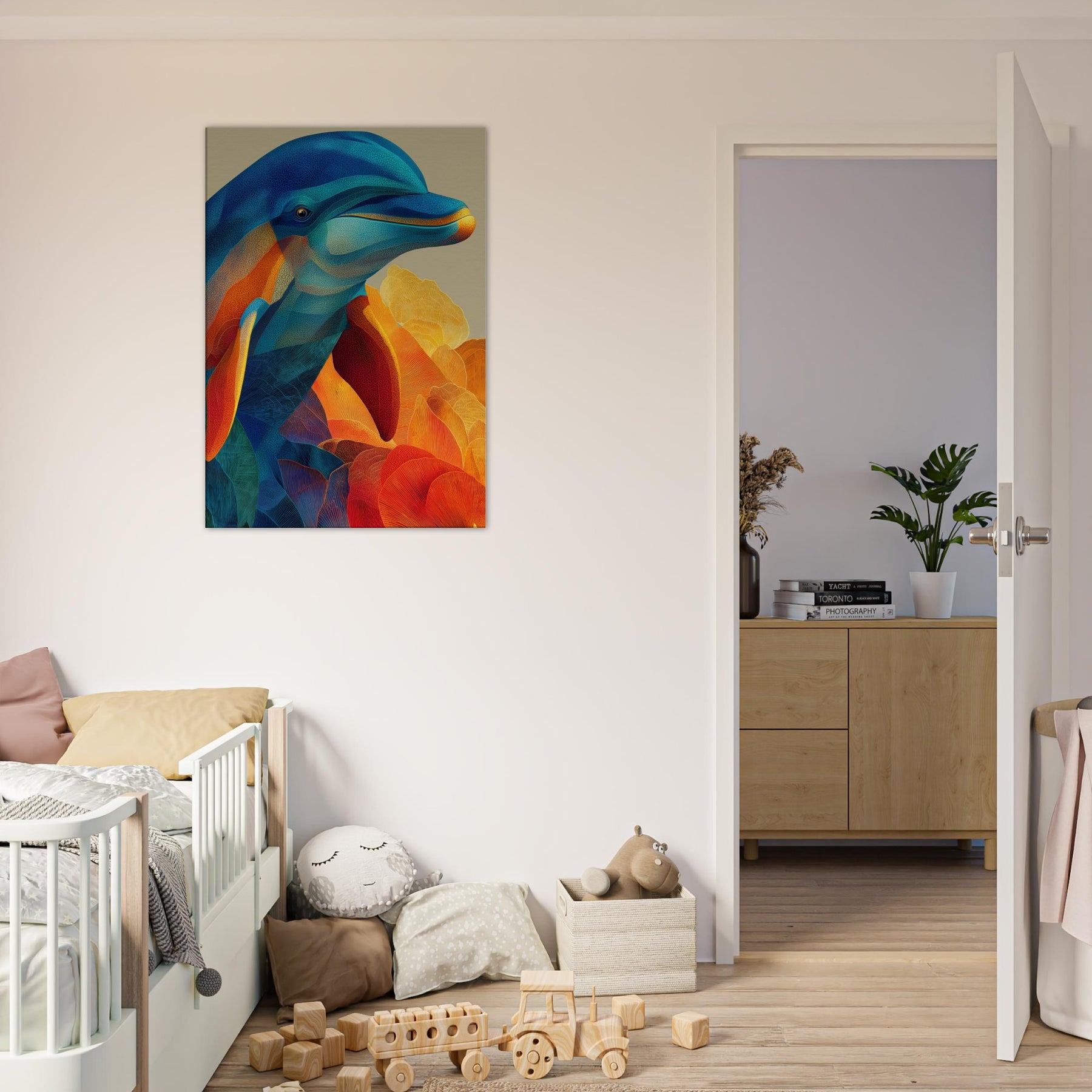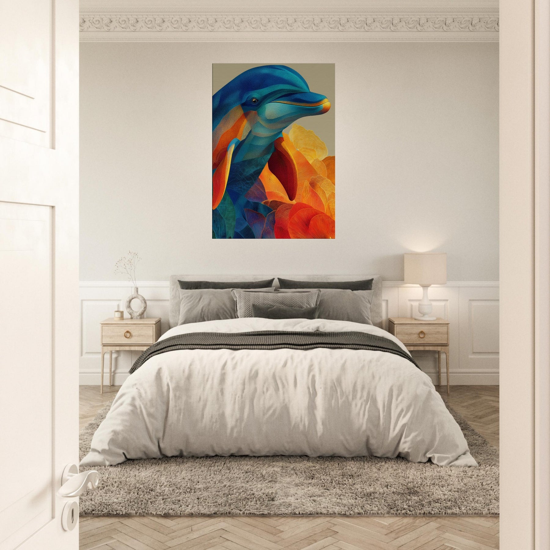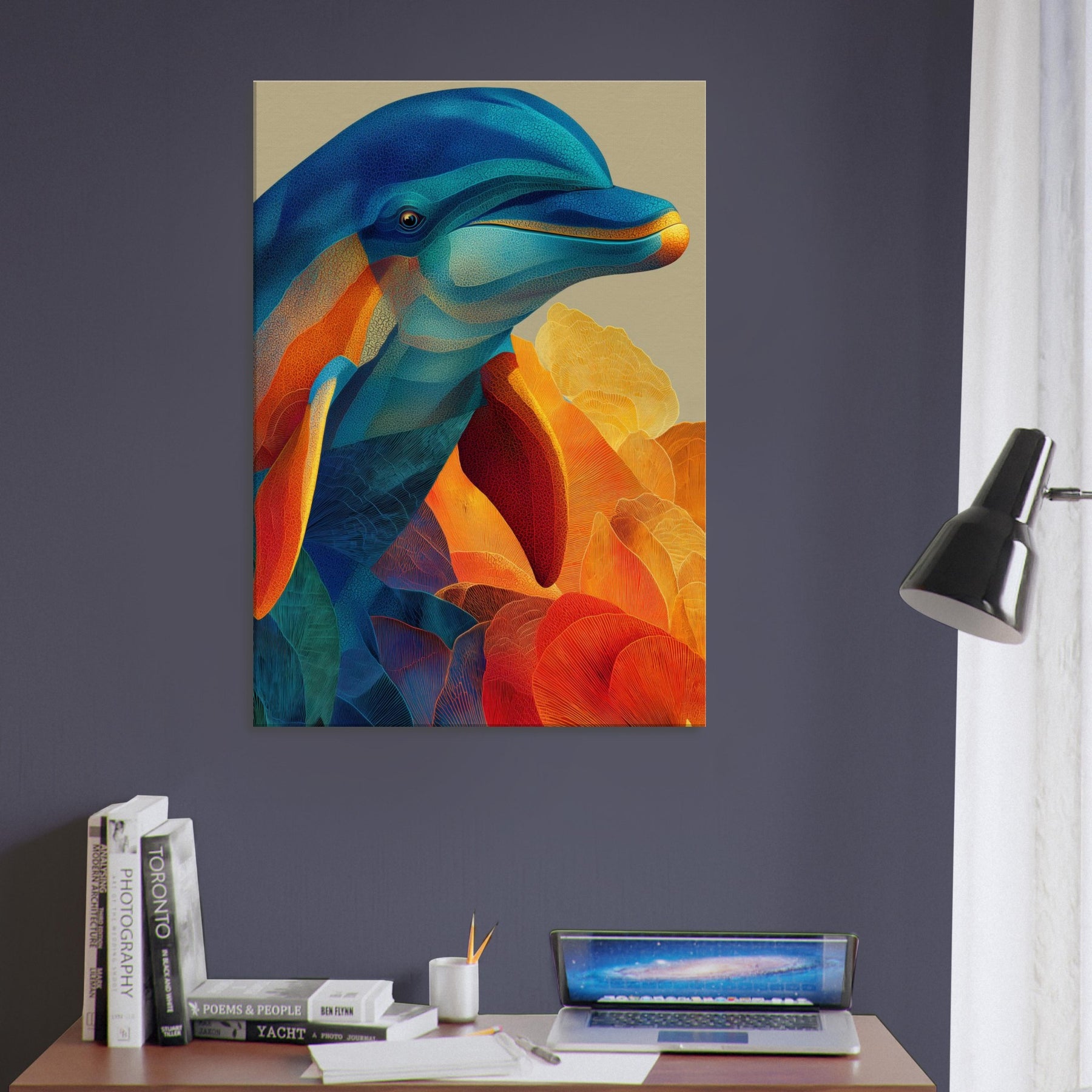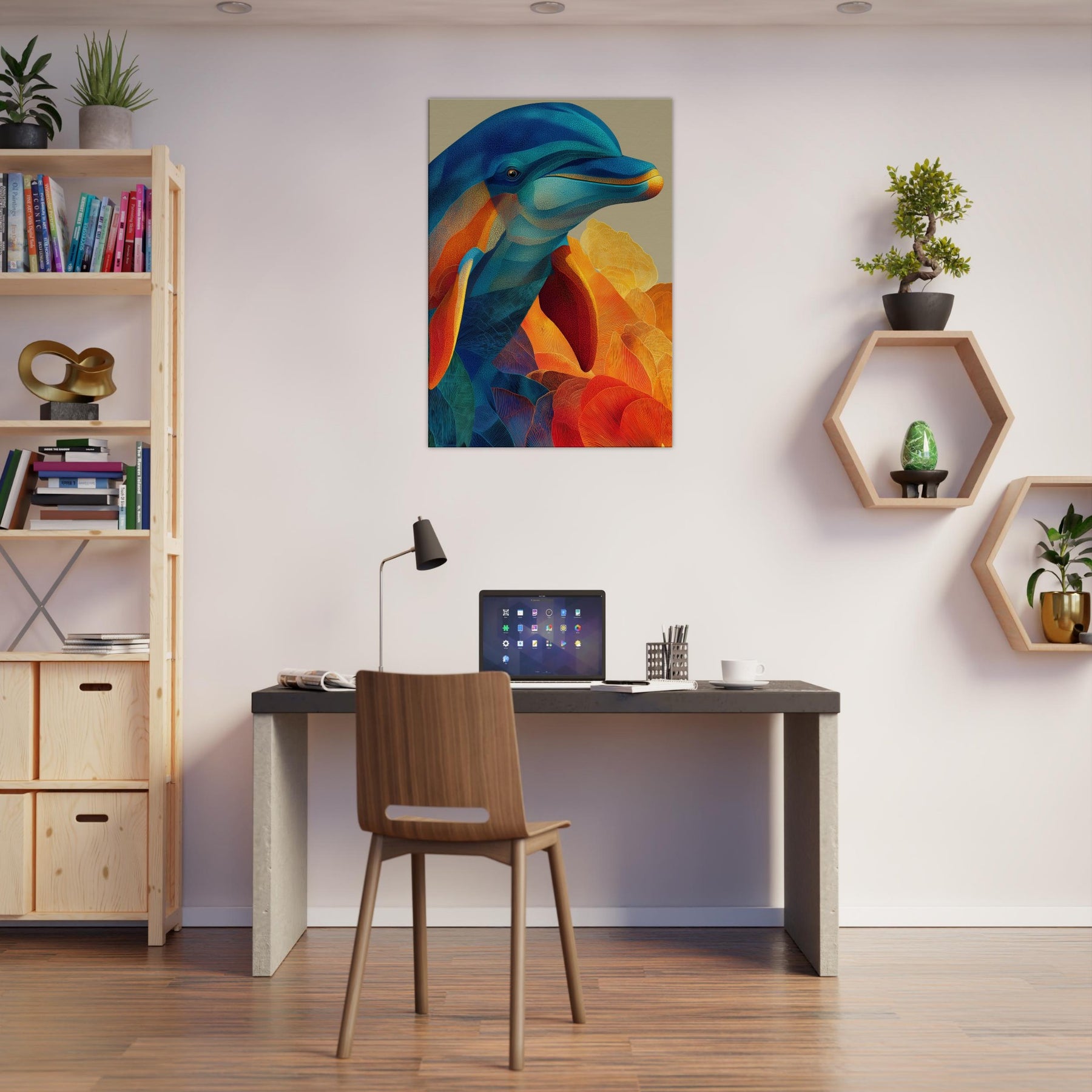 Let this abstract dolphin wash your living room in color and calm. The dolphin silhouette glides through a luminous sea of citrus, cobalt, and coral, as sunlight ripples across a tranquil underwater . The piece invites quiet reflection and movement, turning a plain wall into a living moment where form dissolves into feeling. A graceful focal point for modern decor, it pairs beautifully with textured textiles and warm wood, creating an inviting ambience that lingers after sunset.