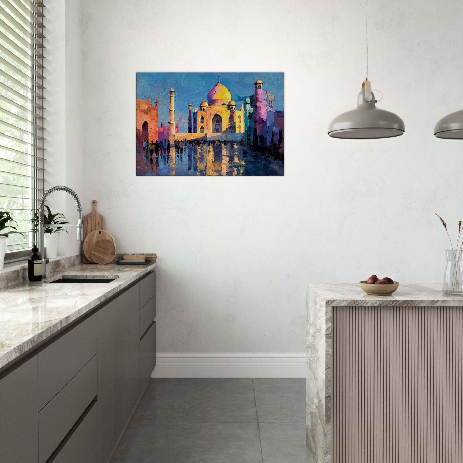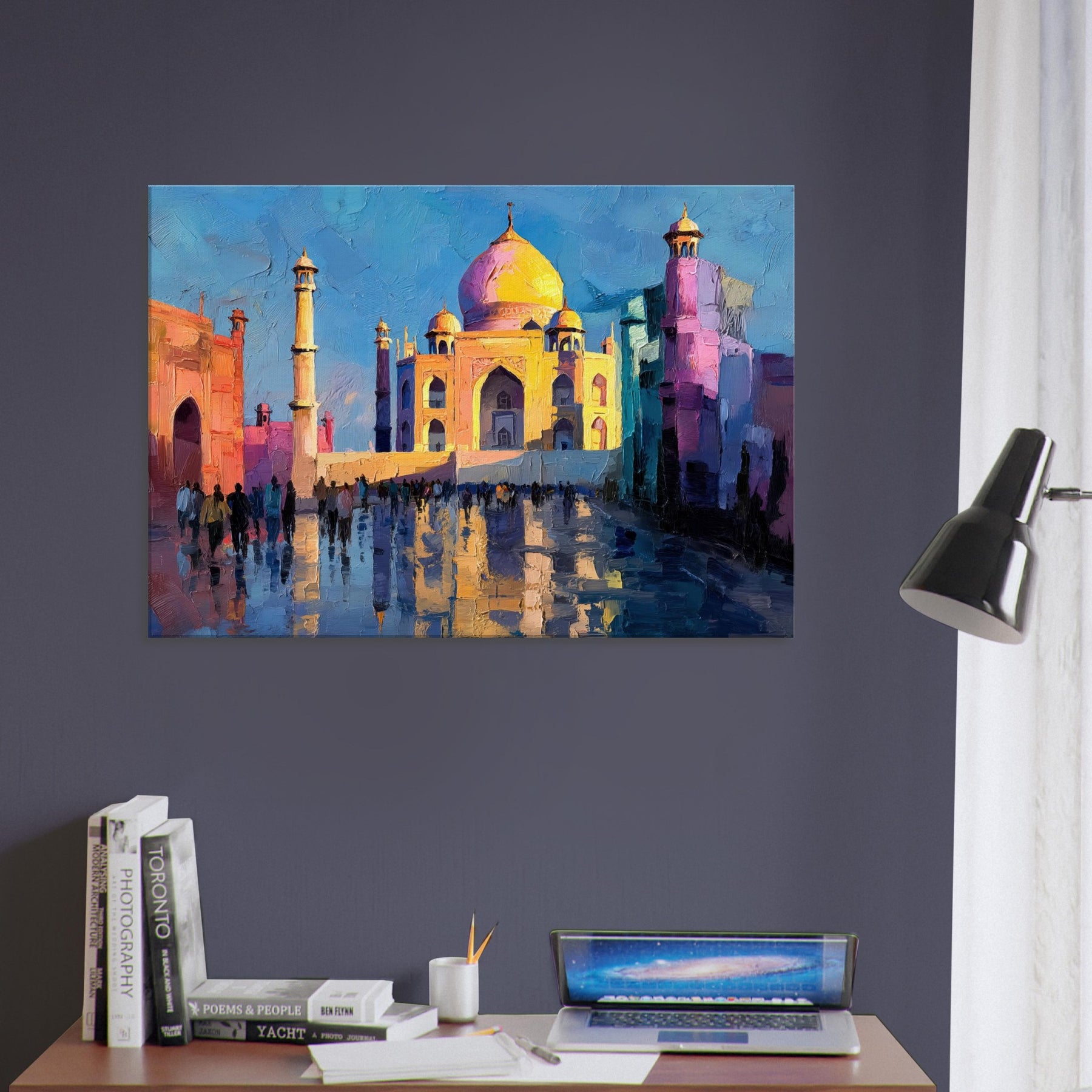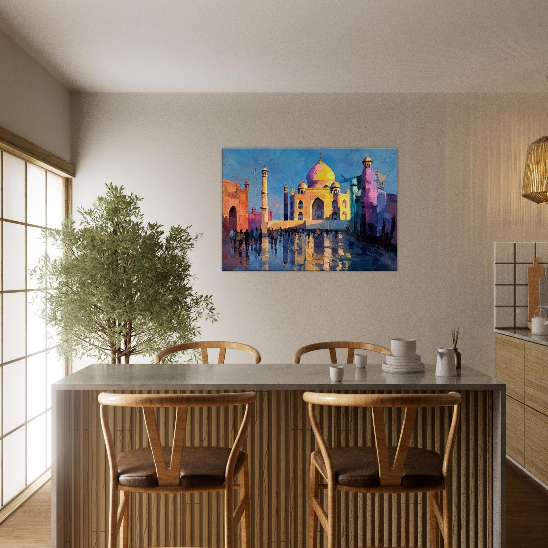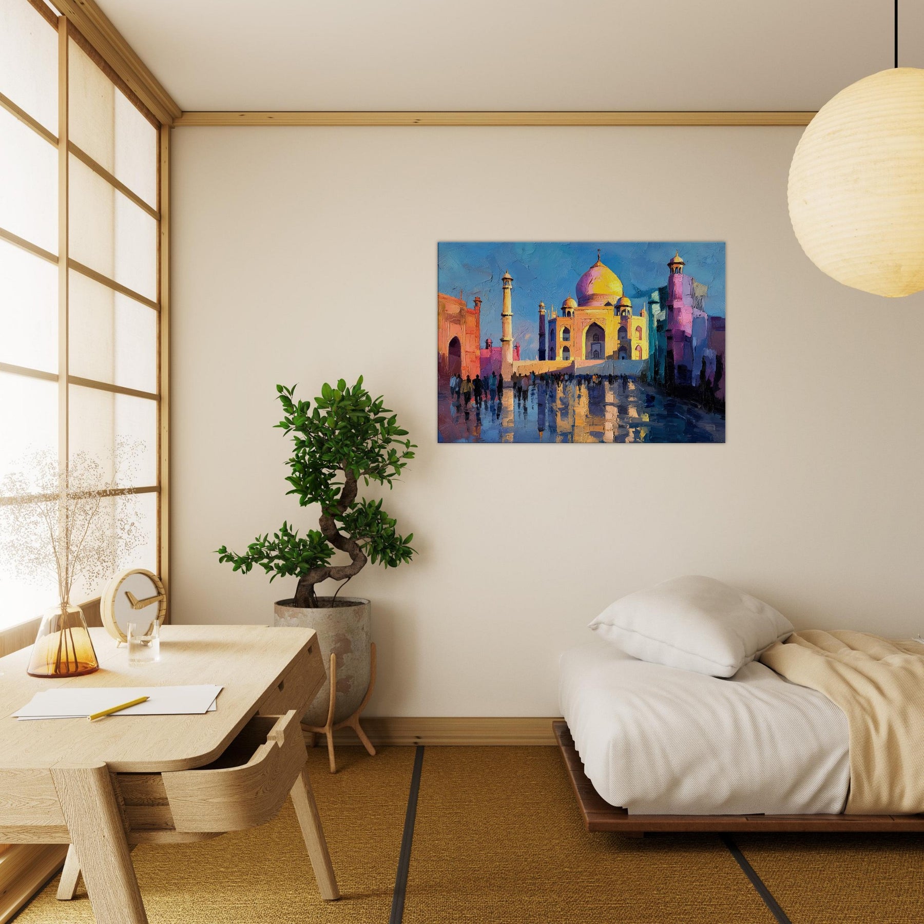 Let your walls breathe with a dreamlike procession toward the Taj Mahal, reimagined in sweeping color and sculpted light. This abstract interpretation dissolves architectural detail into vibrant blocks that shimmer like heat on marble, inviting curiosity and contemplation. The luminous yellows, pinks, and azure tones create a serene, Cathedral like ambience, while the softened edges soften modern interiors. In a living room or study, it becomes a quiet focal point evoking memory, wonder, and a timeless sense of travel.