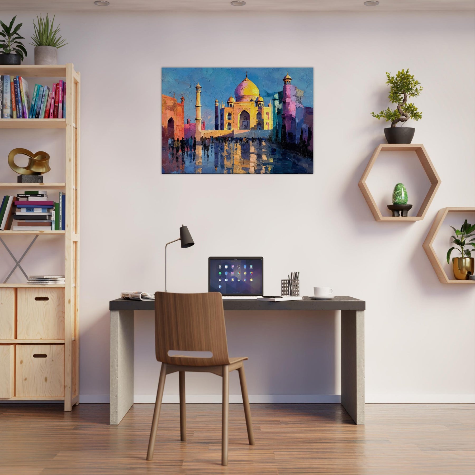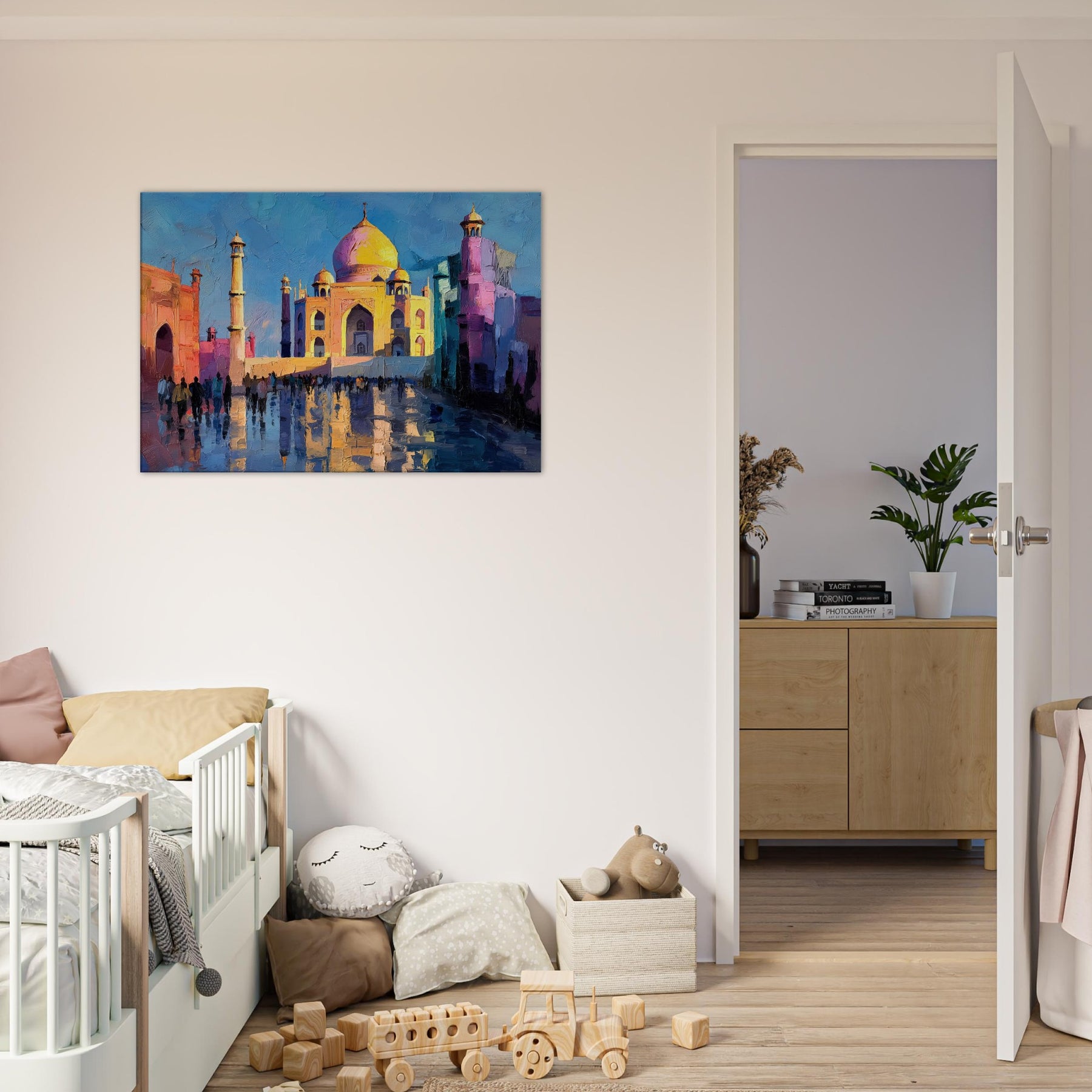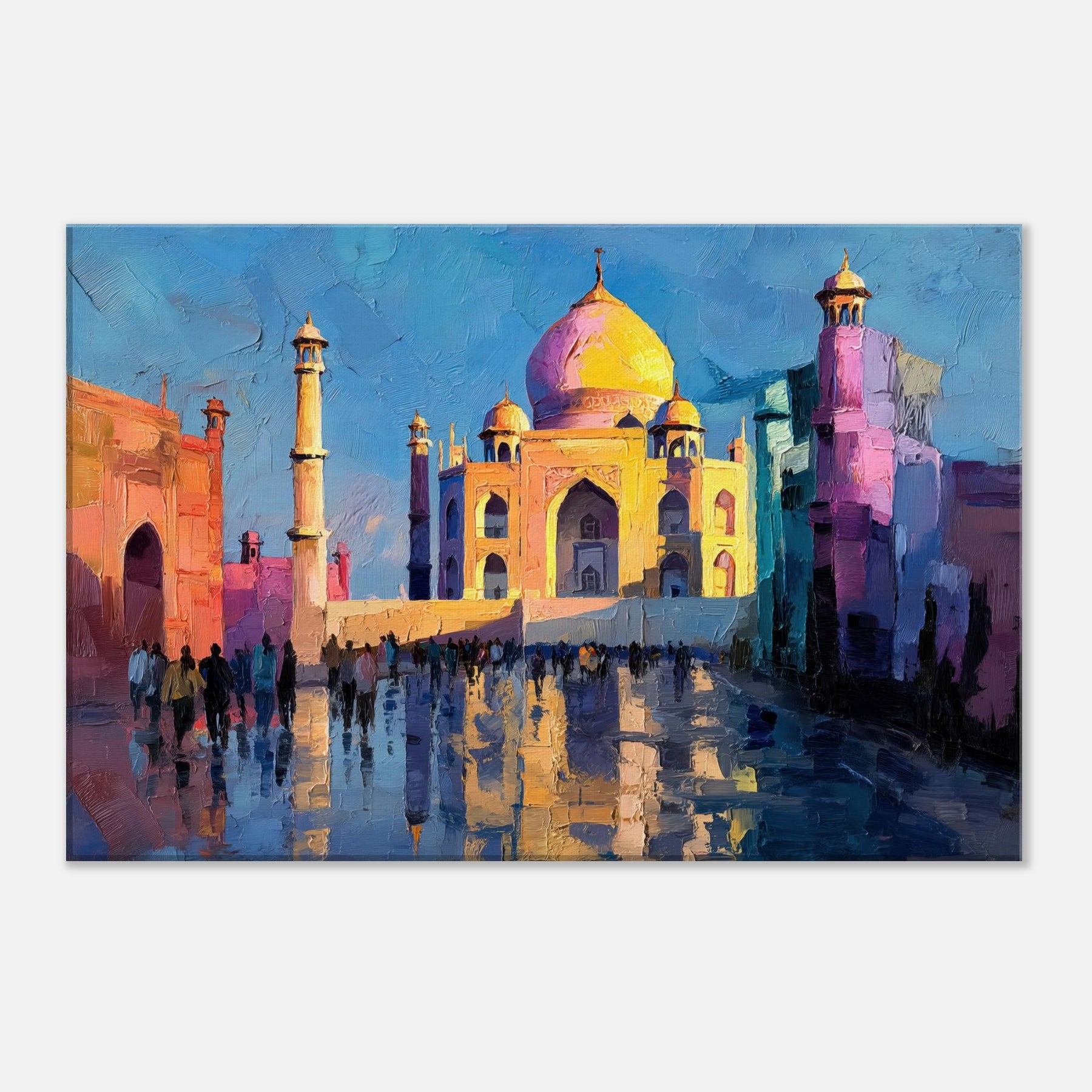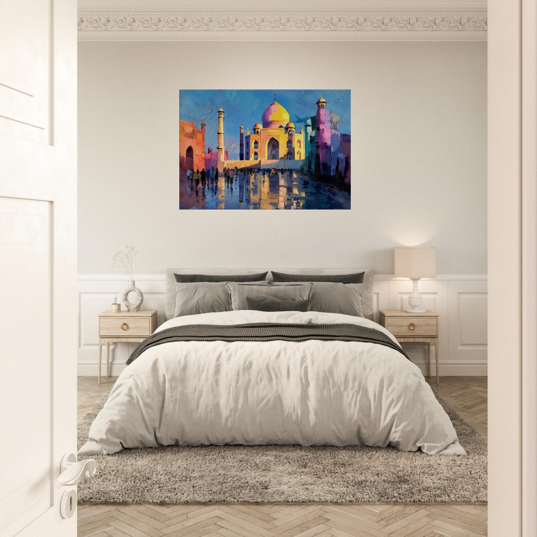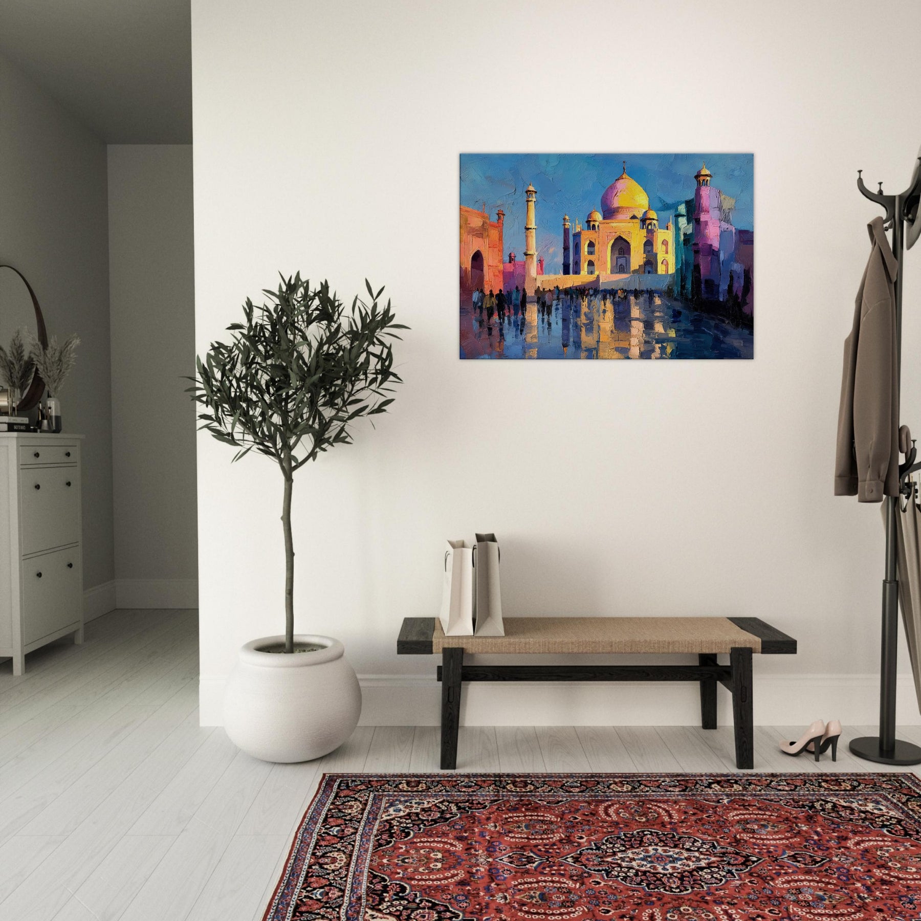 Let your walls breathe with a dreamlike procession toward the Taj Mahal, reimagined in sweeping color and sculpted light. This abstract interpretation dissolves architectural detail into vibrant blocks that shimmer like heat on marble, inviting curiosity and contemplation. The luminous yellows, pinks, and azure tones create a serene, Cathedral like ambience, while the softened edges soften modern interiors. In a living room or study, it becomes a quiet focal point evoking memory, wonder, and a timeless sense of travel.