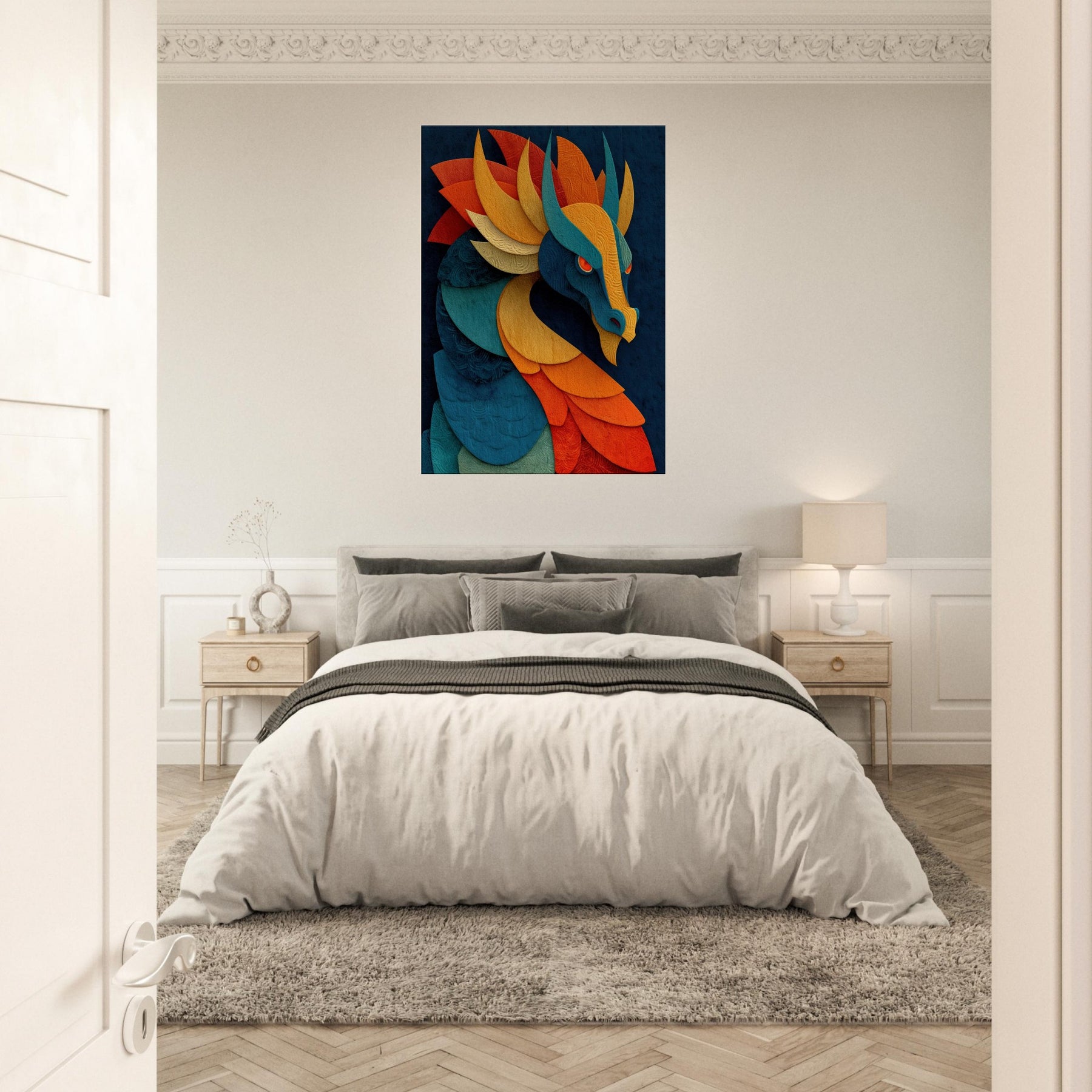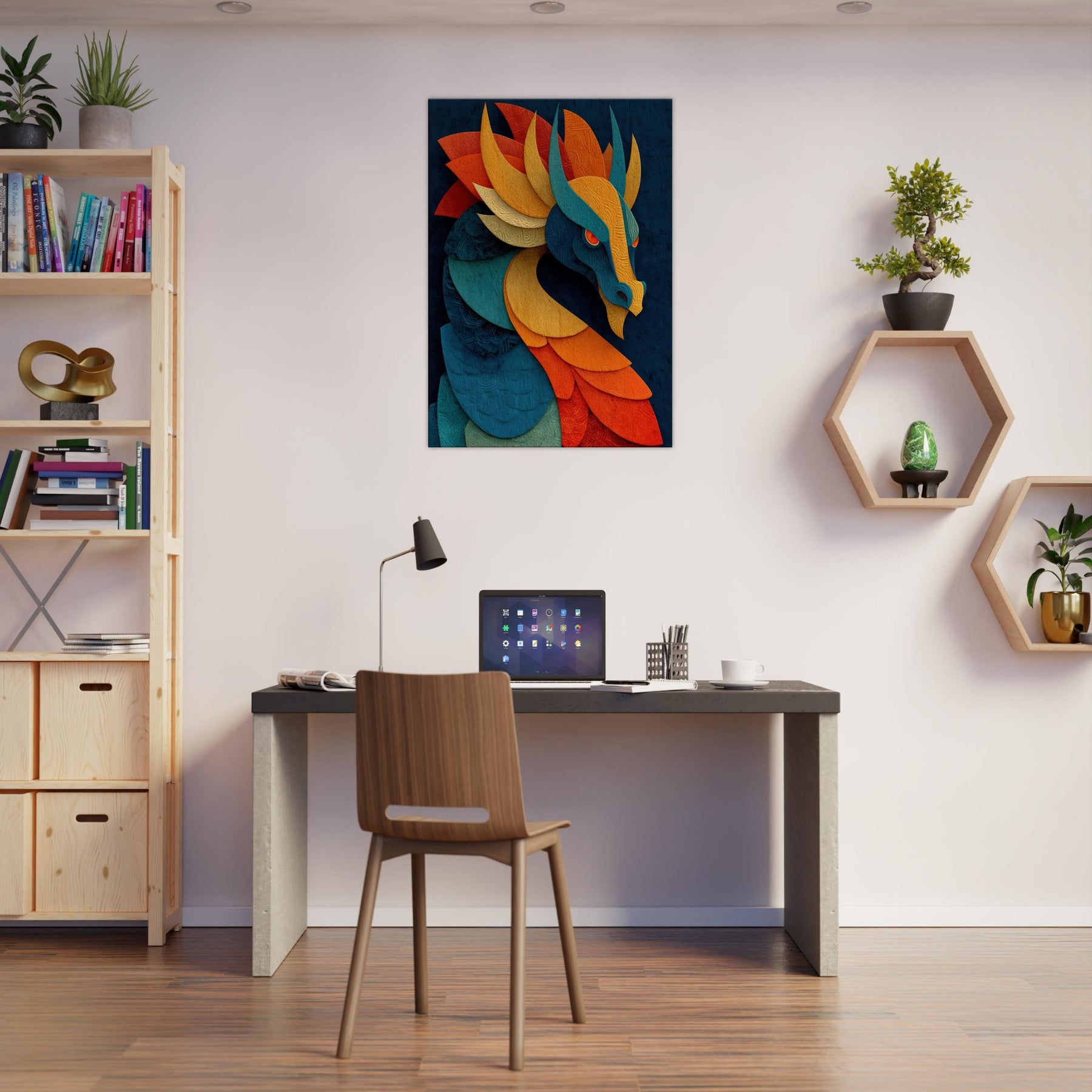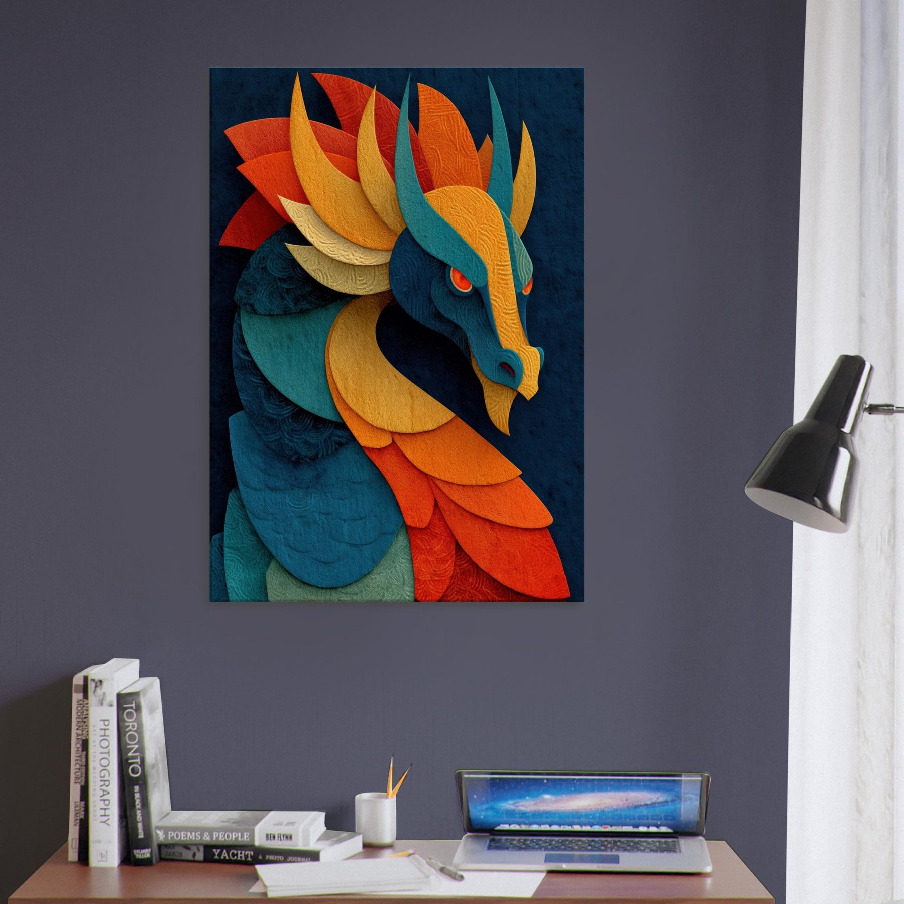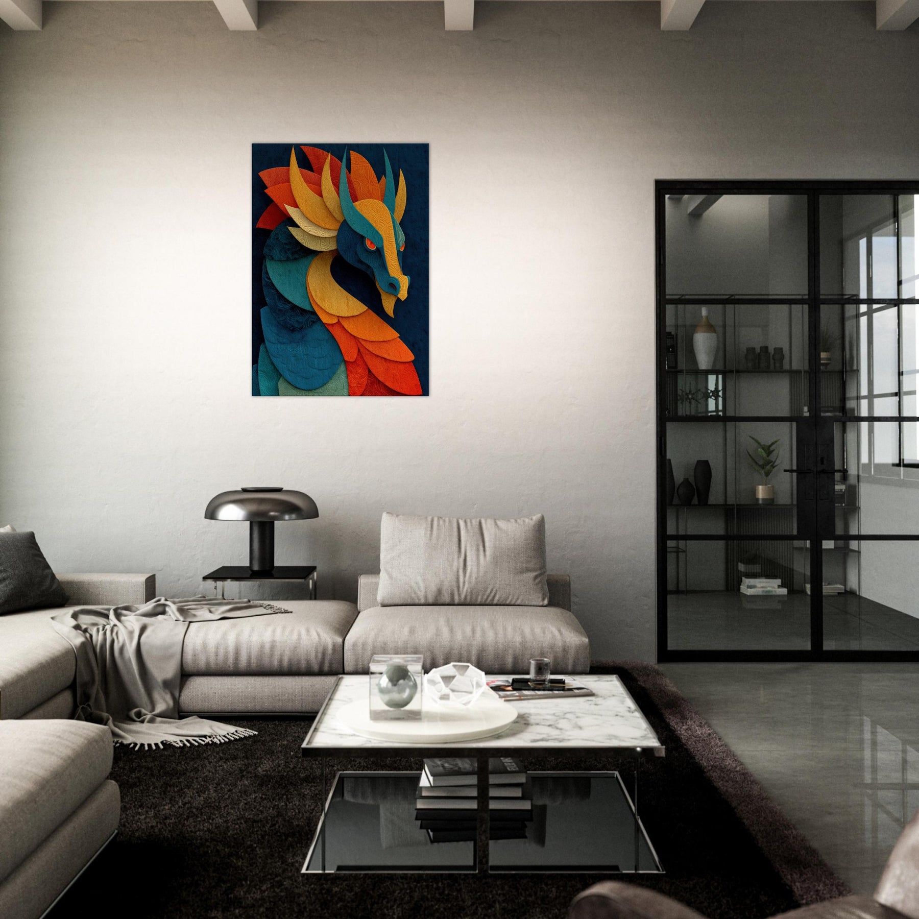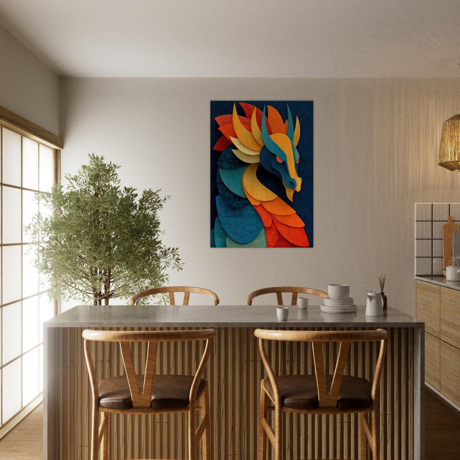 Immerse your space in the electric presence of a Chinese Dragon, reimagined in bold, overlapping shapes and a sunset of teal, saffron, and coral. This abstract composition glows with movement, as if the mythic guardian unfurls its scales across the wall, inviting warmth, curiosity, and a touch of legend. Perfect for a living room or study, it adds a tactile, sculptural texture and a dreamlike atmosphere that makes ordinary evenings feel epic.