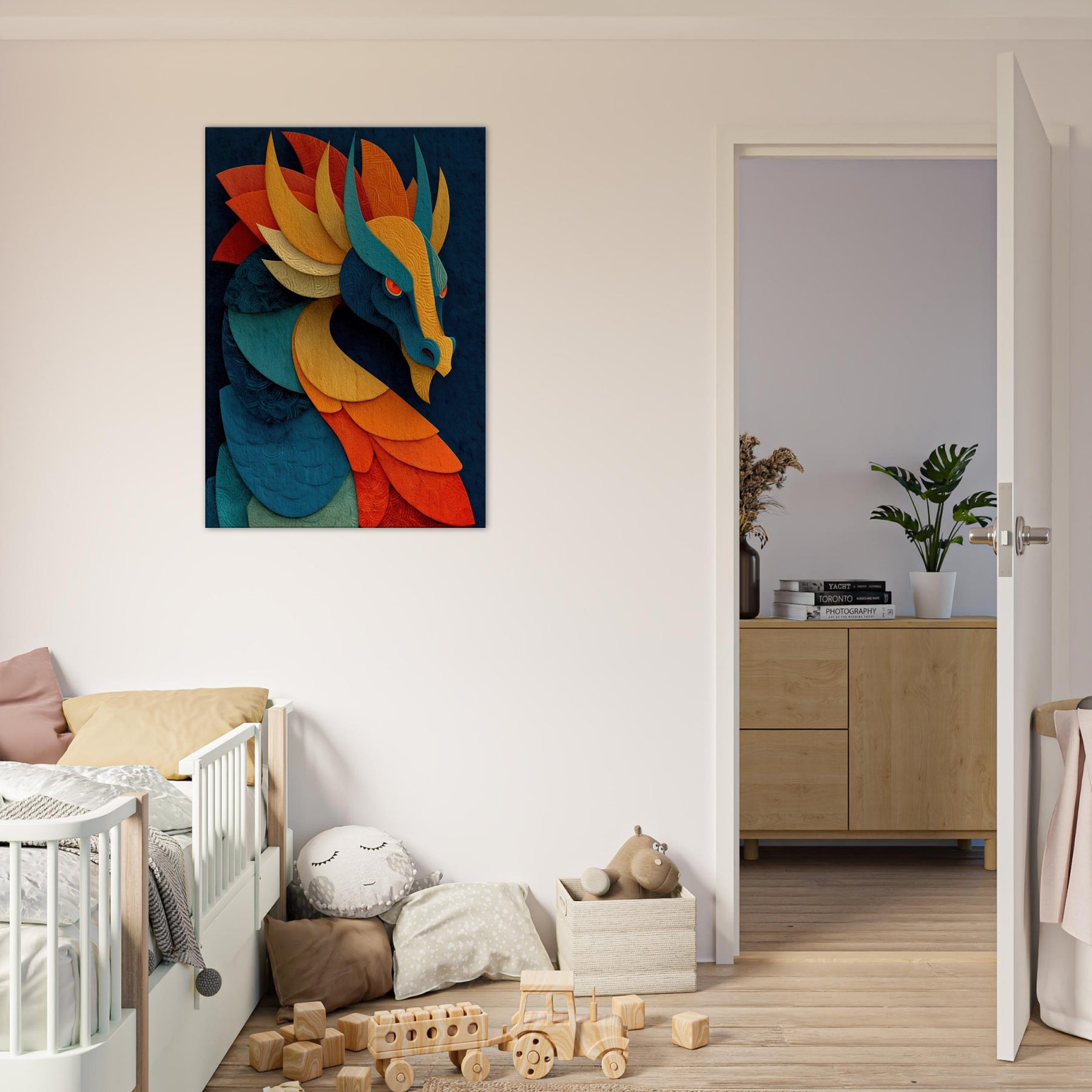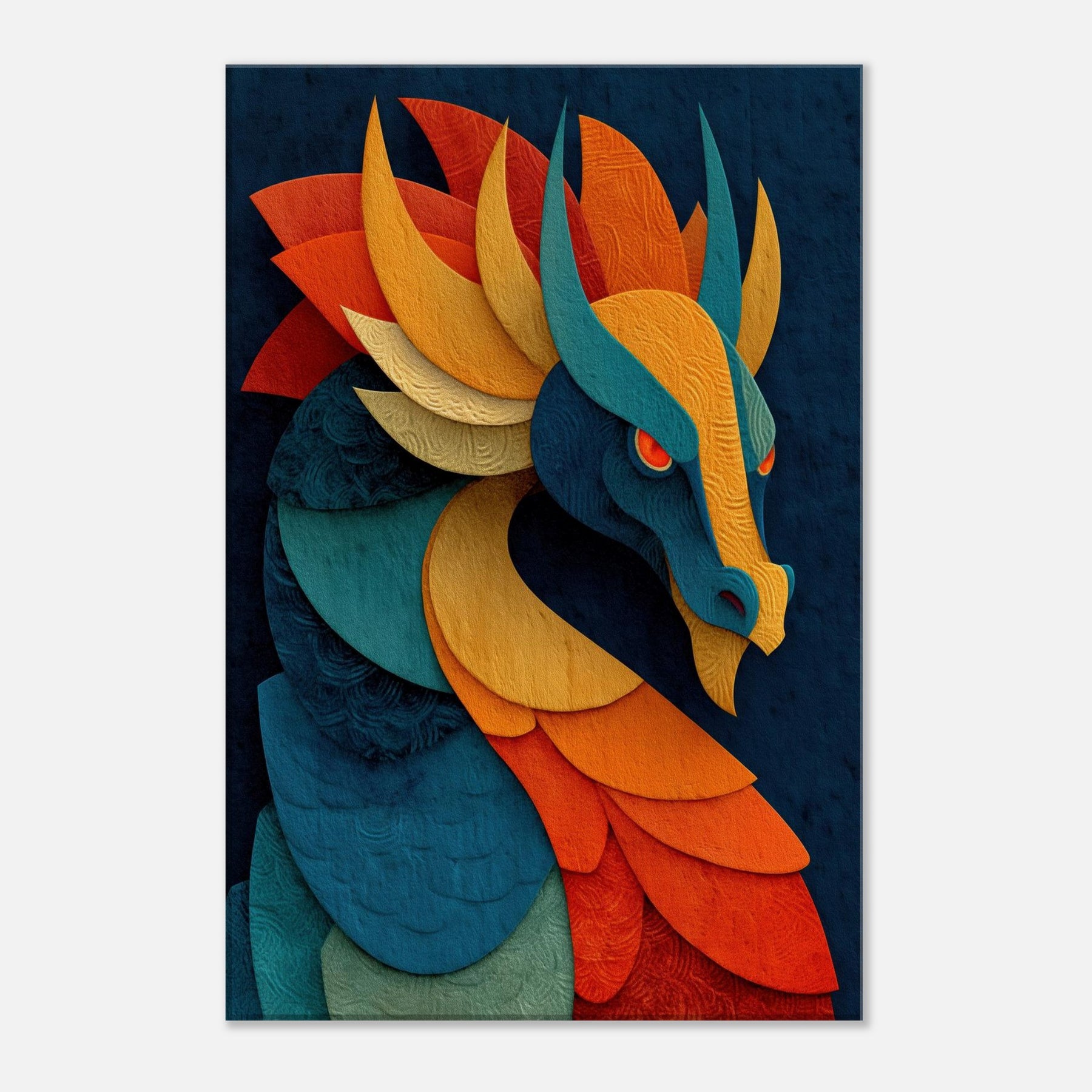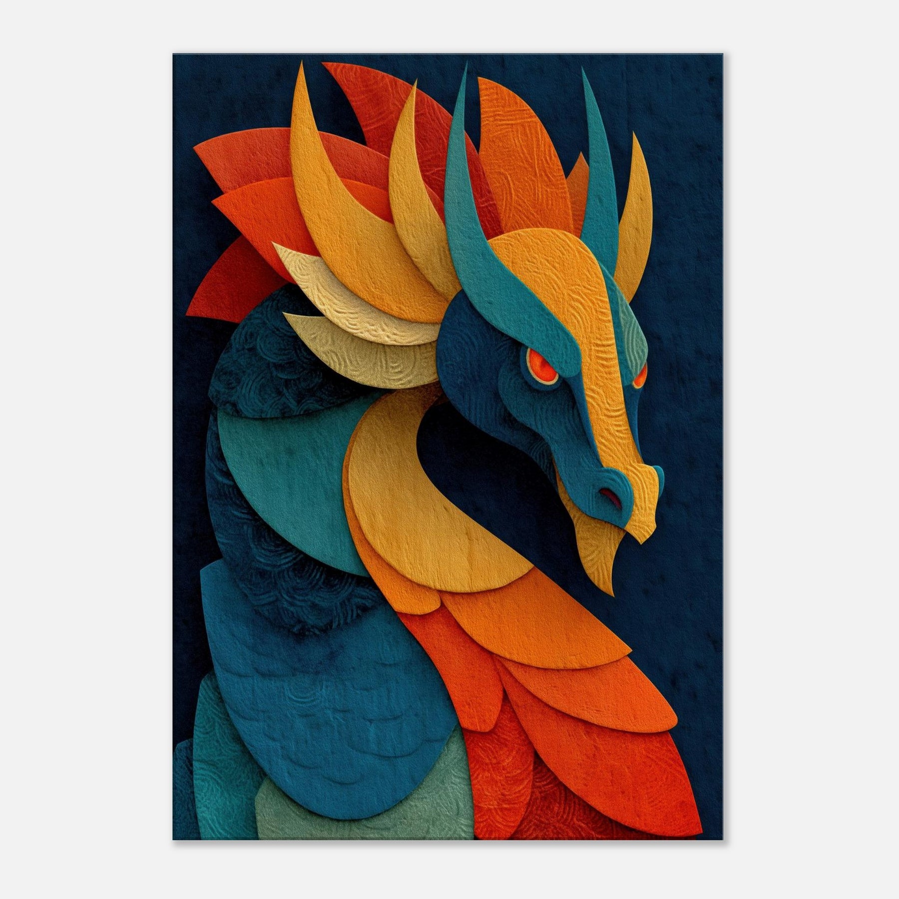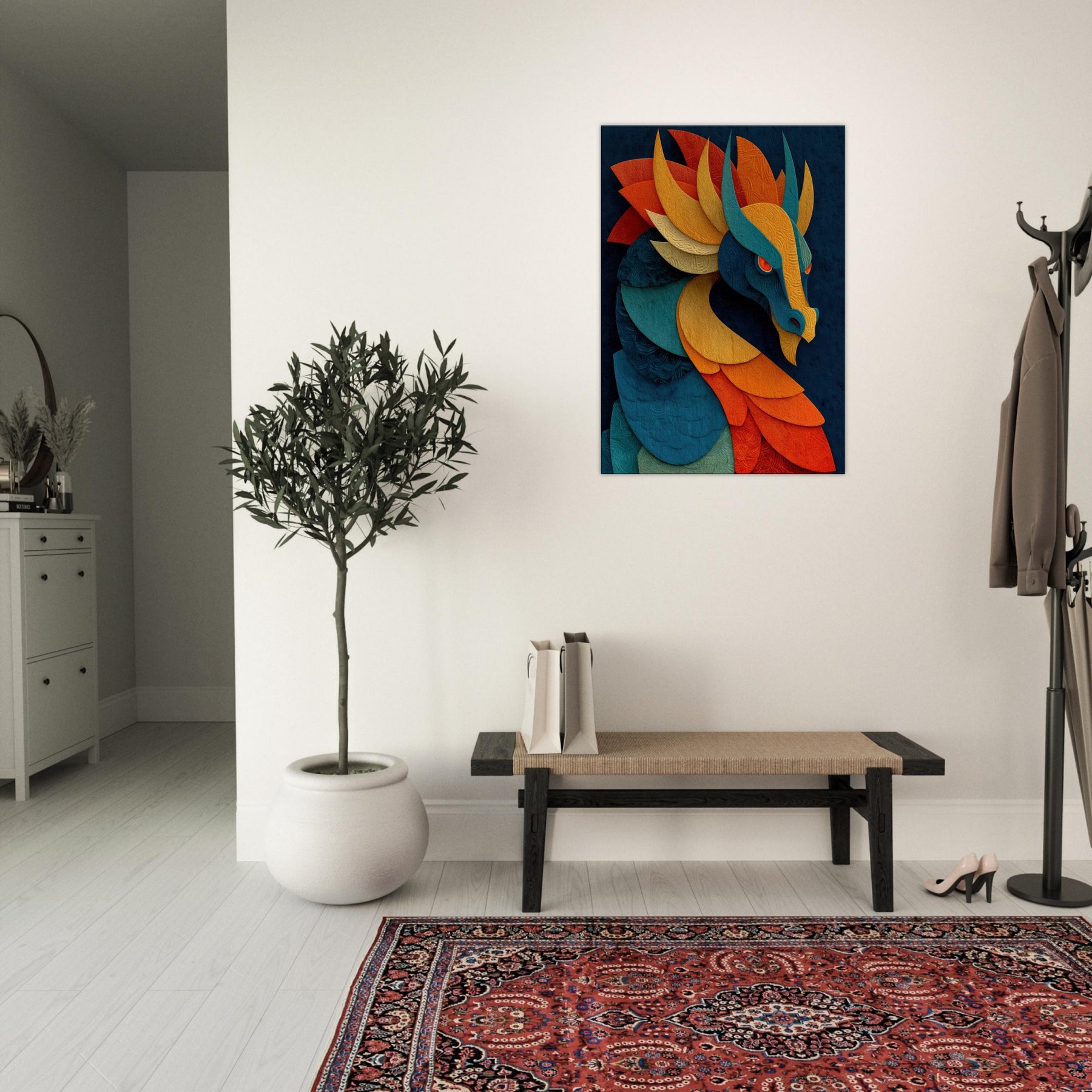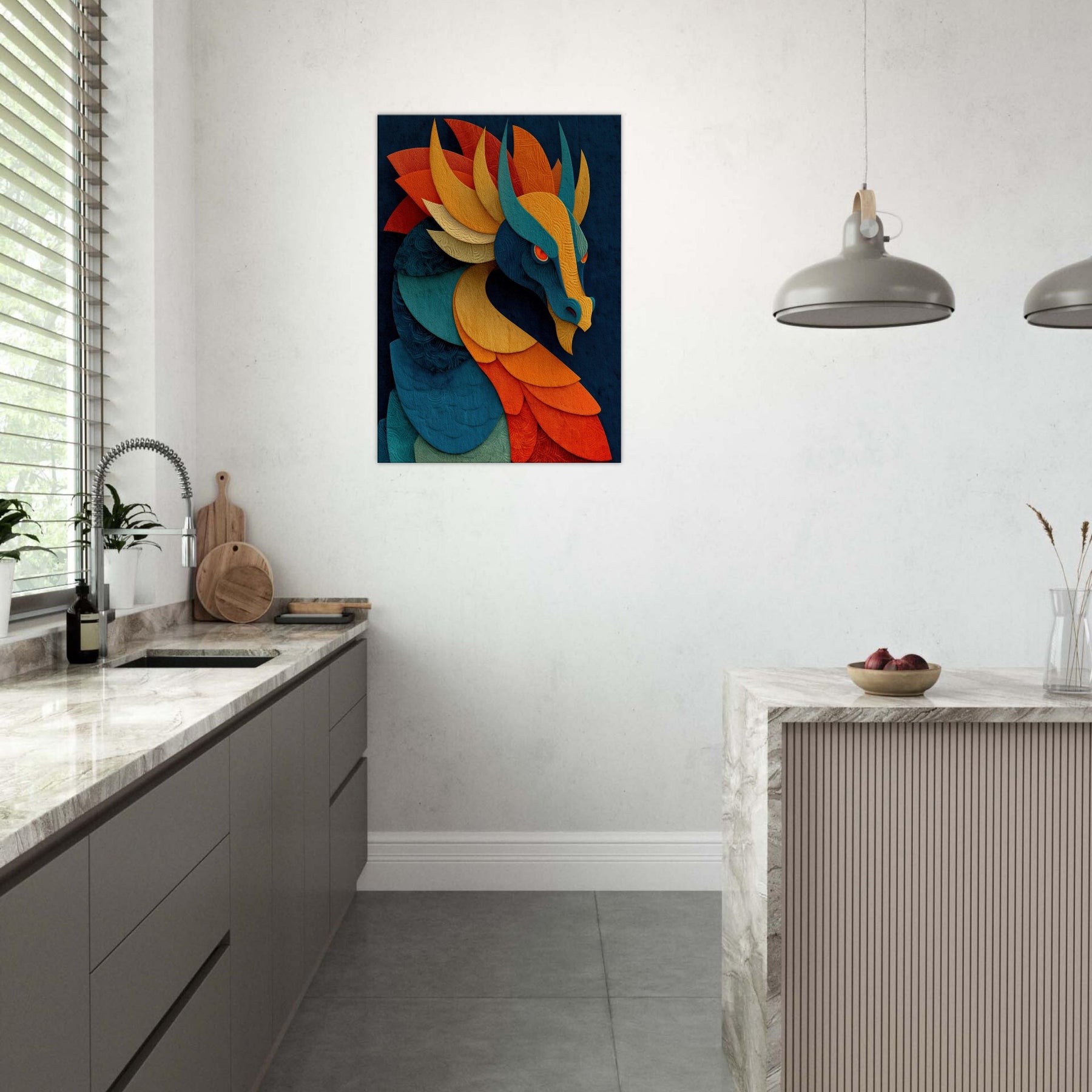 Immerse your space in the electric presence of a Chinese Dragon, reimagined in bold, overlapping shapes and a sunset of teal, saffron, and coral. This abstract composition glows with movement, as if the mythic guardian unfurls its scales across the wall, inviting warmth, curiosity, and a touch of legend. Perfect for a living room or study, it adds a tactile, sculptural texture and a dreamlike atmosphere that makes ordinary evenings feel epic.