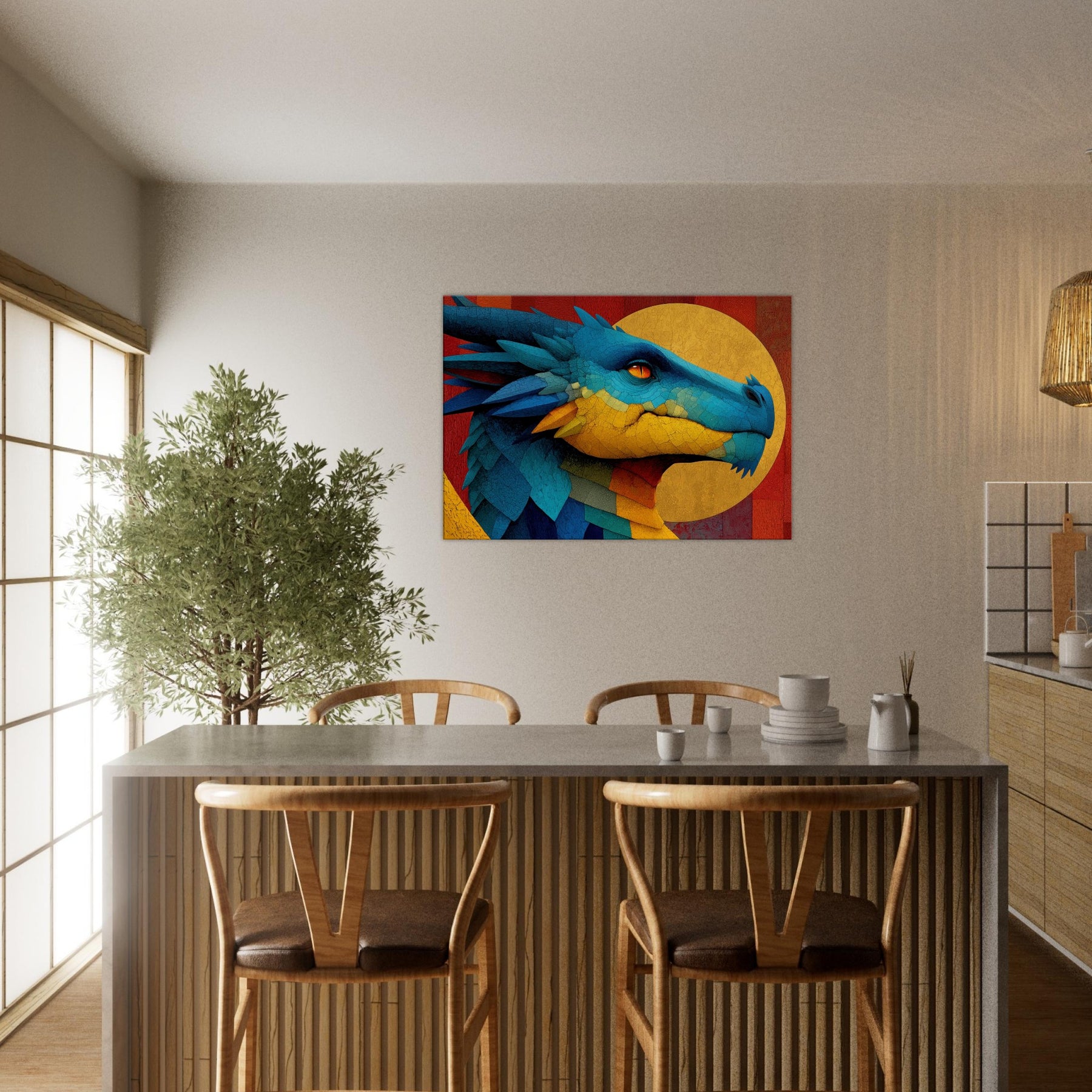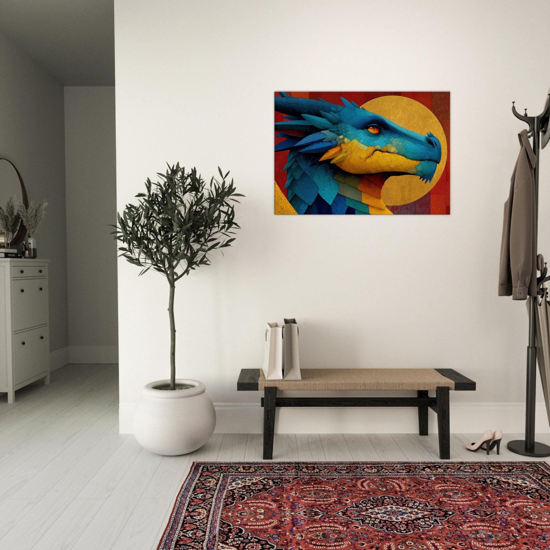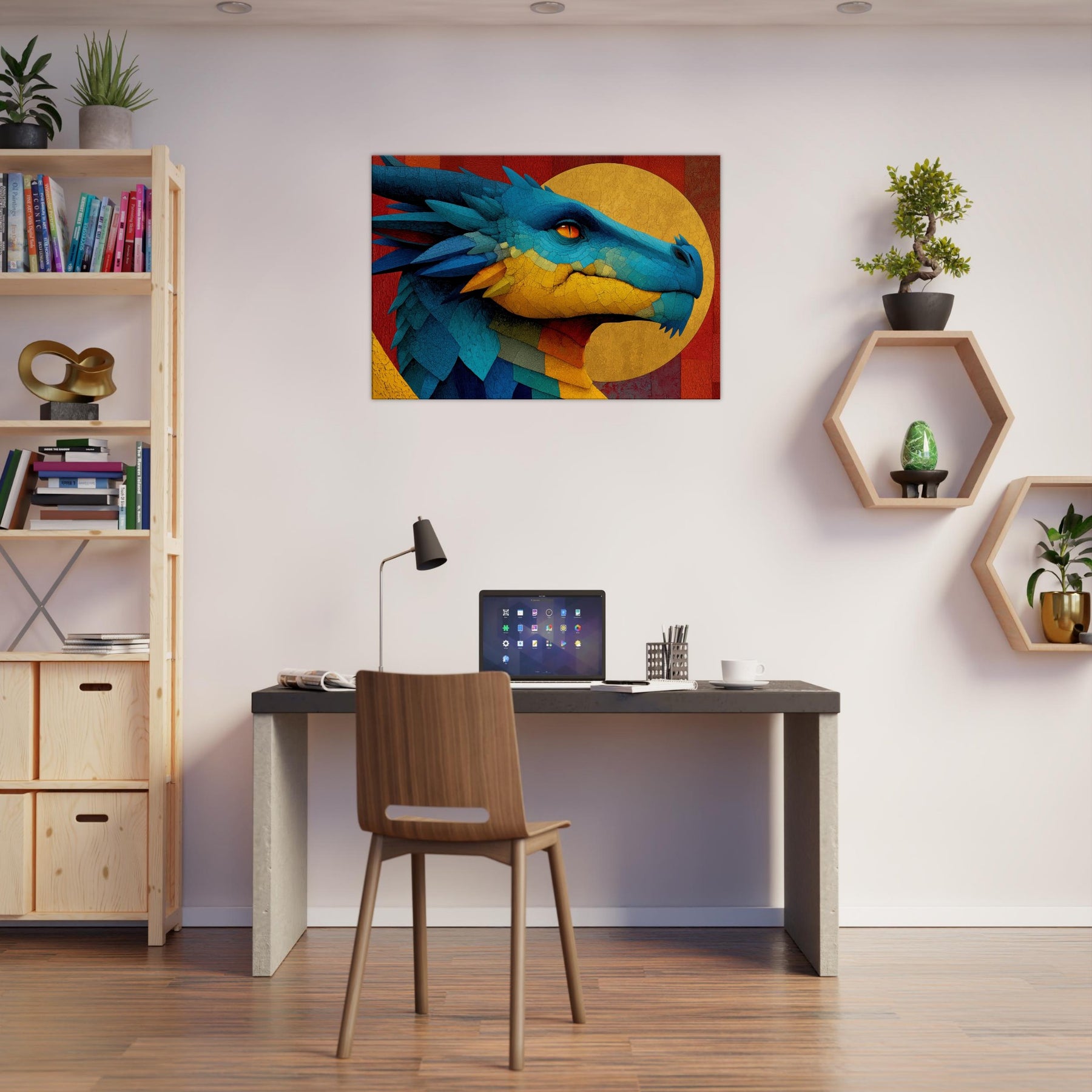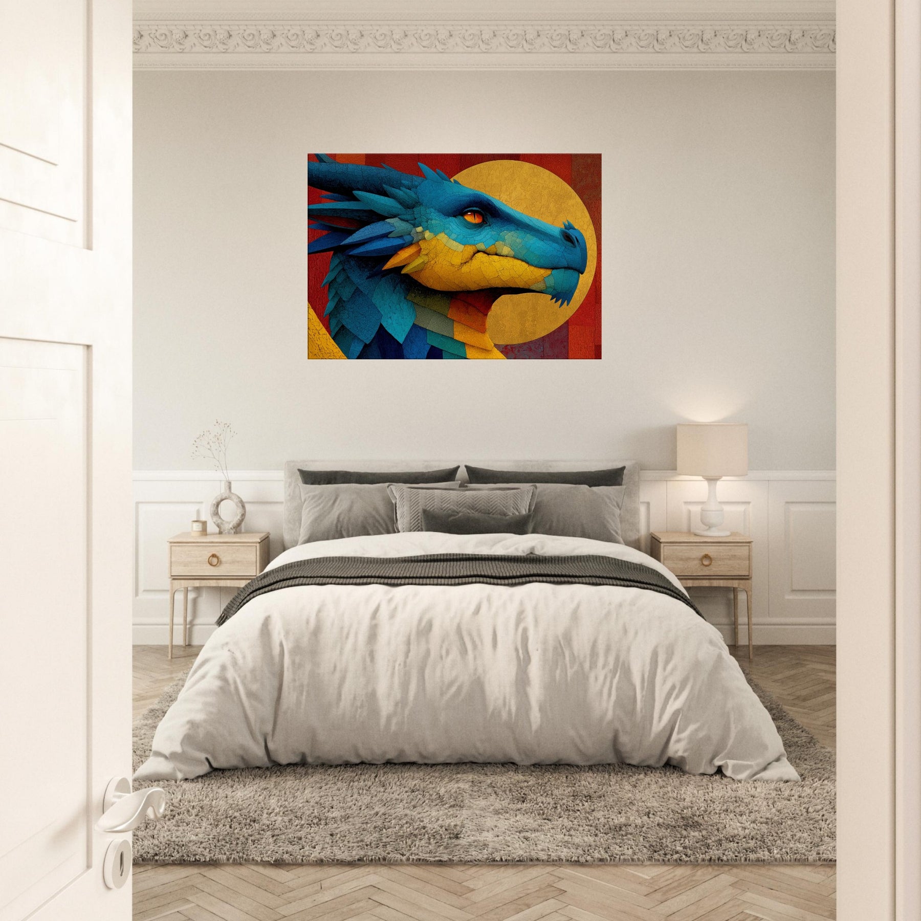 Majestic Dragon glides across a mosaic of color, its scales catching the light like sunlit tiles. This abstract fantasy invites warmth and wonder into a room, with cobalt blues and molten ochres that shift as you move. The dragon's vigilant amber eye seems to hold the room's quiet energy, while the layered textures create depth and a tactile texture. Perfect above a sofa or in a quiet study, it transforms walls into a living horizon dramatic, comforting, and endlessly inspiring.
