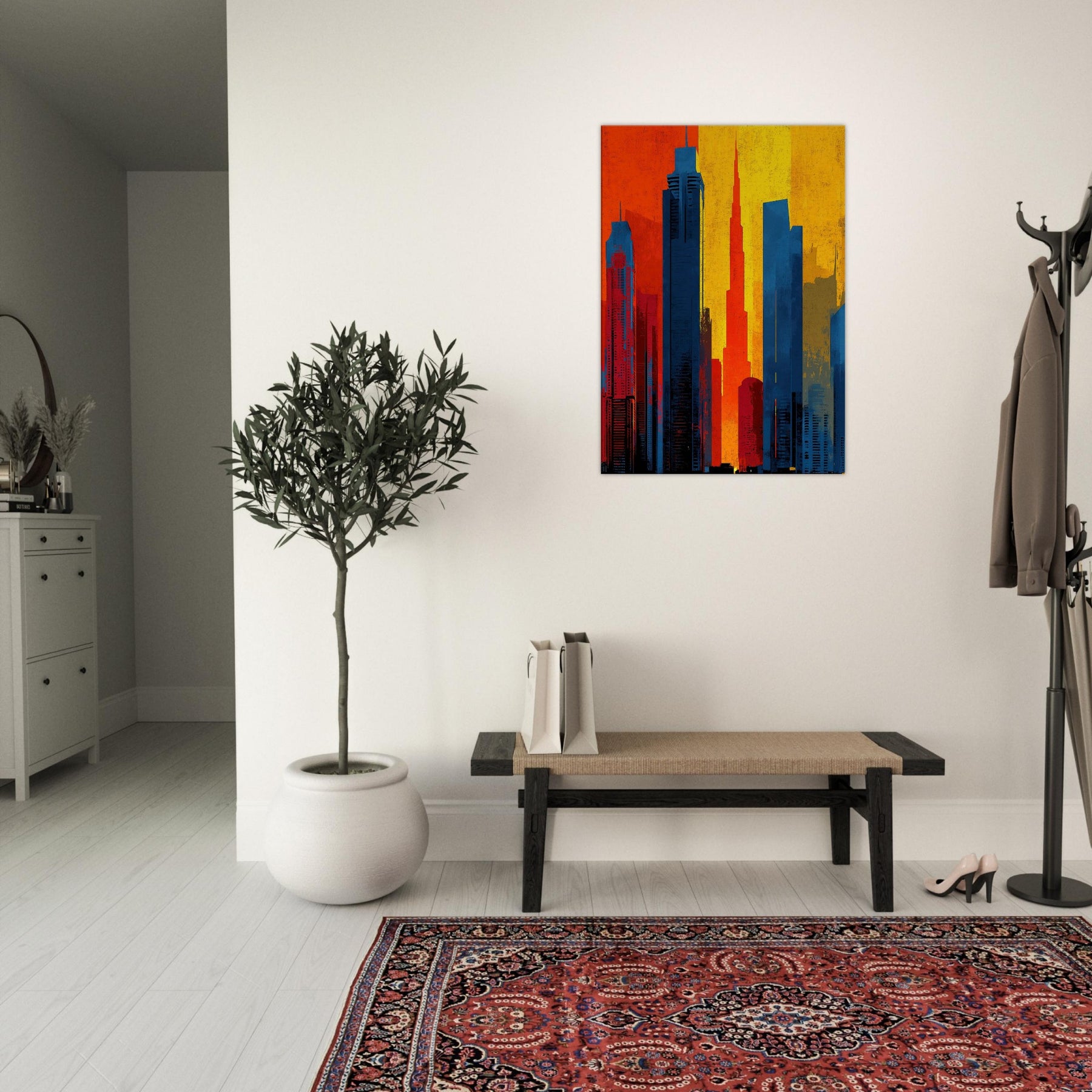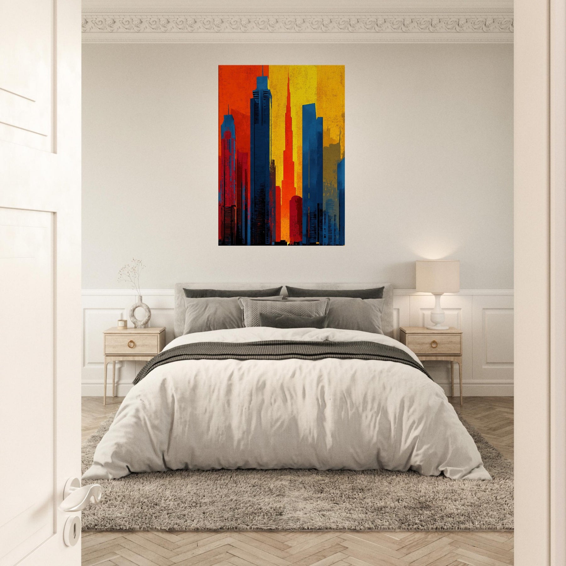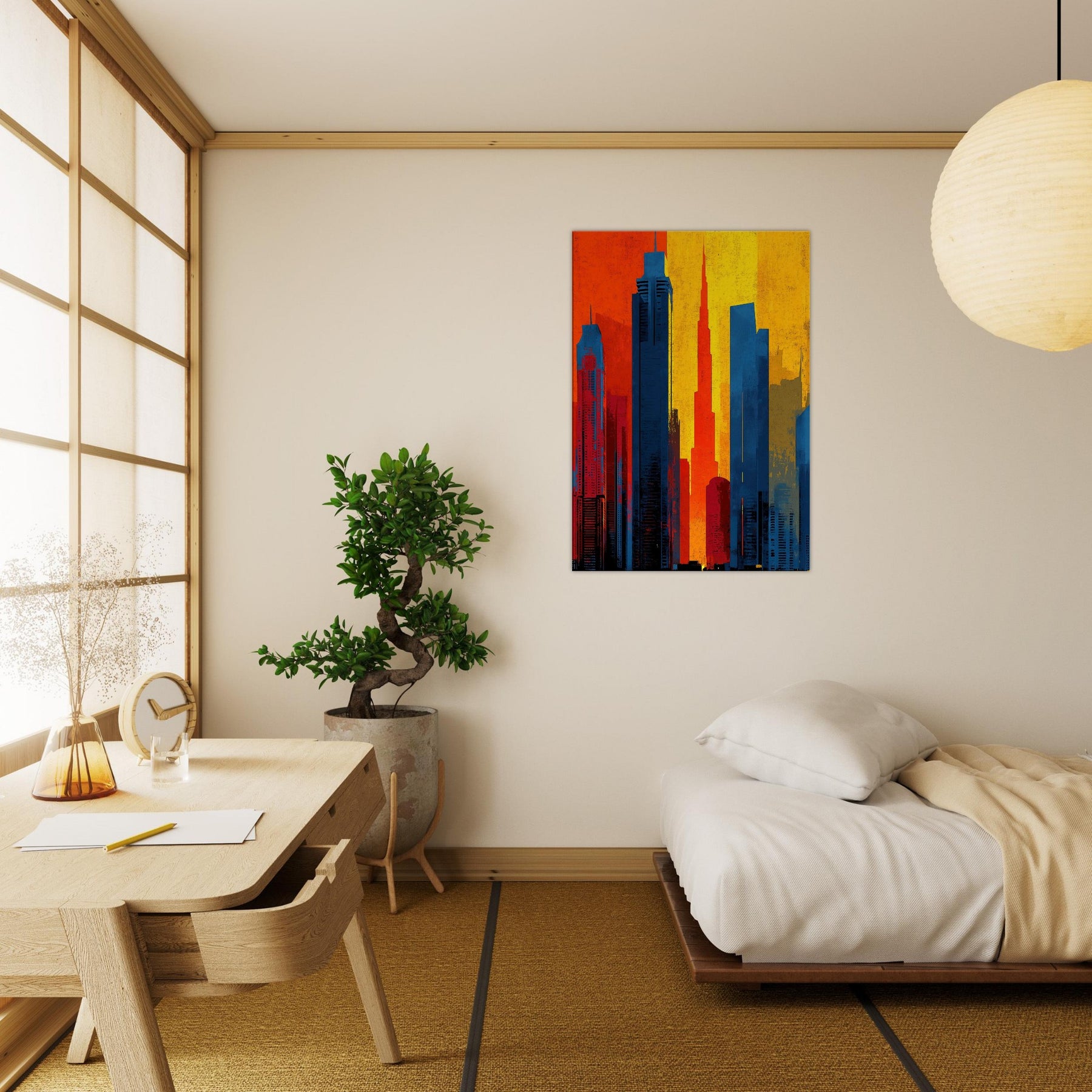 Dubai Neon Horizon electrifies the room with an electric ribbon of sunrise hues and midnight blues. This abstract cityscape breathes with momentum skyscrapers rising like prisms, bathed in warm reds and cool blues that echo desert sun and ocean dusk. A tactile texture of grain and grit adds depth, inviting touch and contemplation. Hung in a living room or office, it acts as a constant pulse of energy and aspiration, turning walls into a window to far horizons and the luminous heartbeat of Dubai.