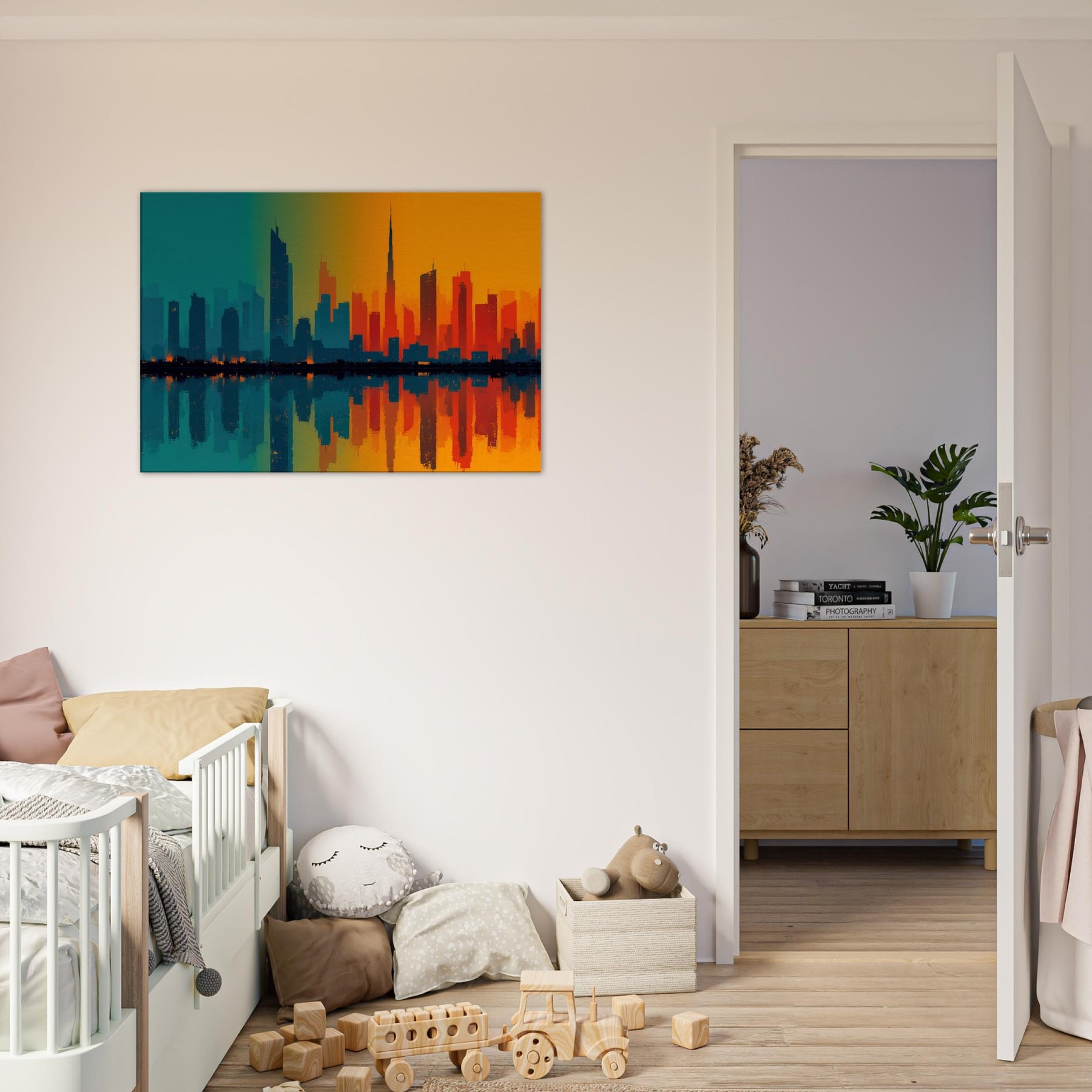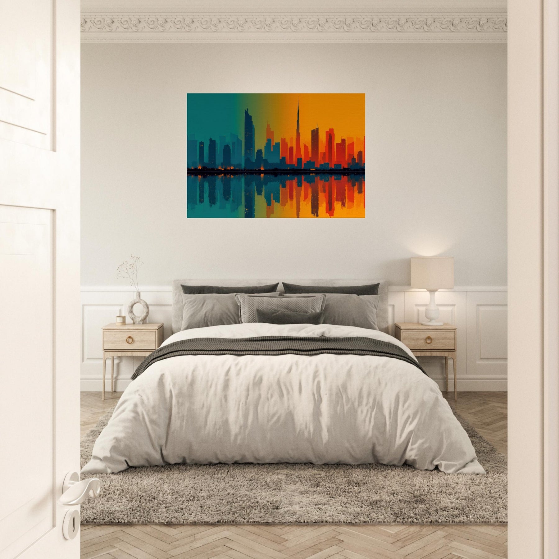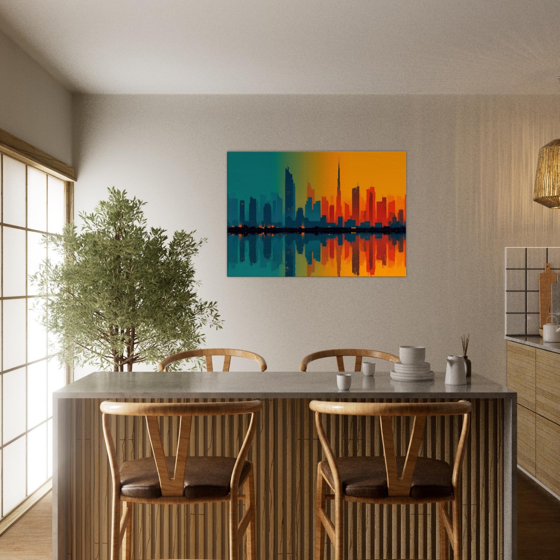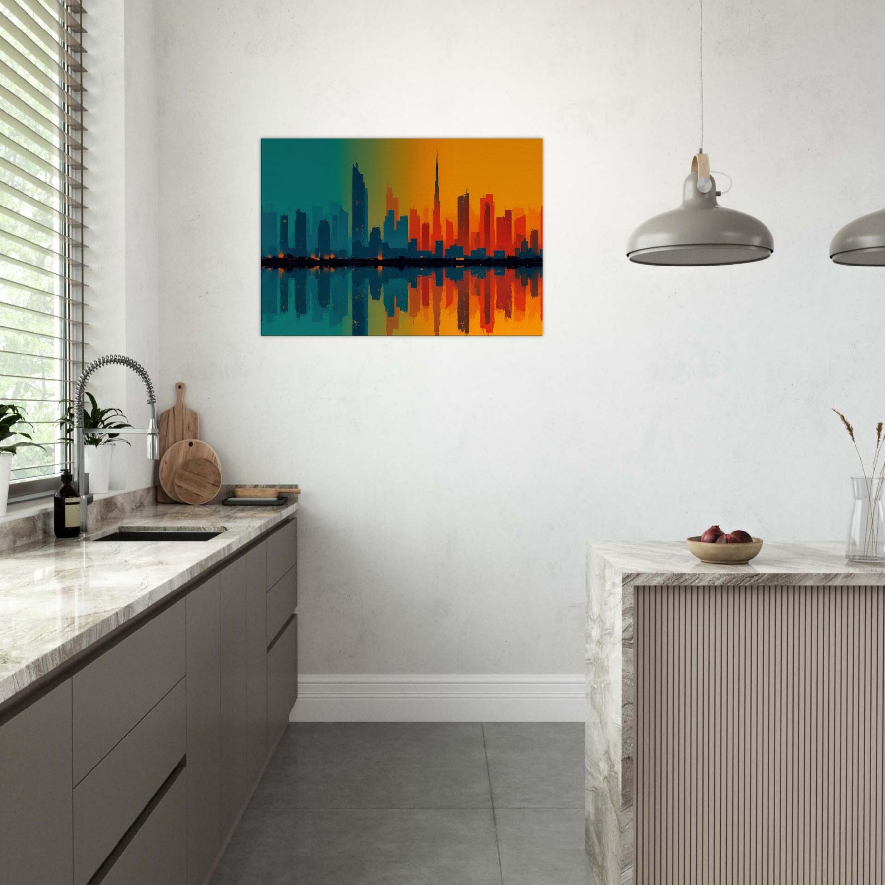 Dubai unfolds across this vibrant canvas, where the city's silhouette rises in bold, geometric strokes and a molten horizon that shifts from teal to sunlit orange. The abstract panorama invites the eye to wander along mirrored water, catching every pulse of lights and reflection as if standing at the shore at dusk. This piece brings a cinematic, breathable energy to a living space calm, immersive, and endlessly poetic perfect above a sofa or in a modern entryway to greet guests with warmth and wonder, day after day.
