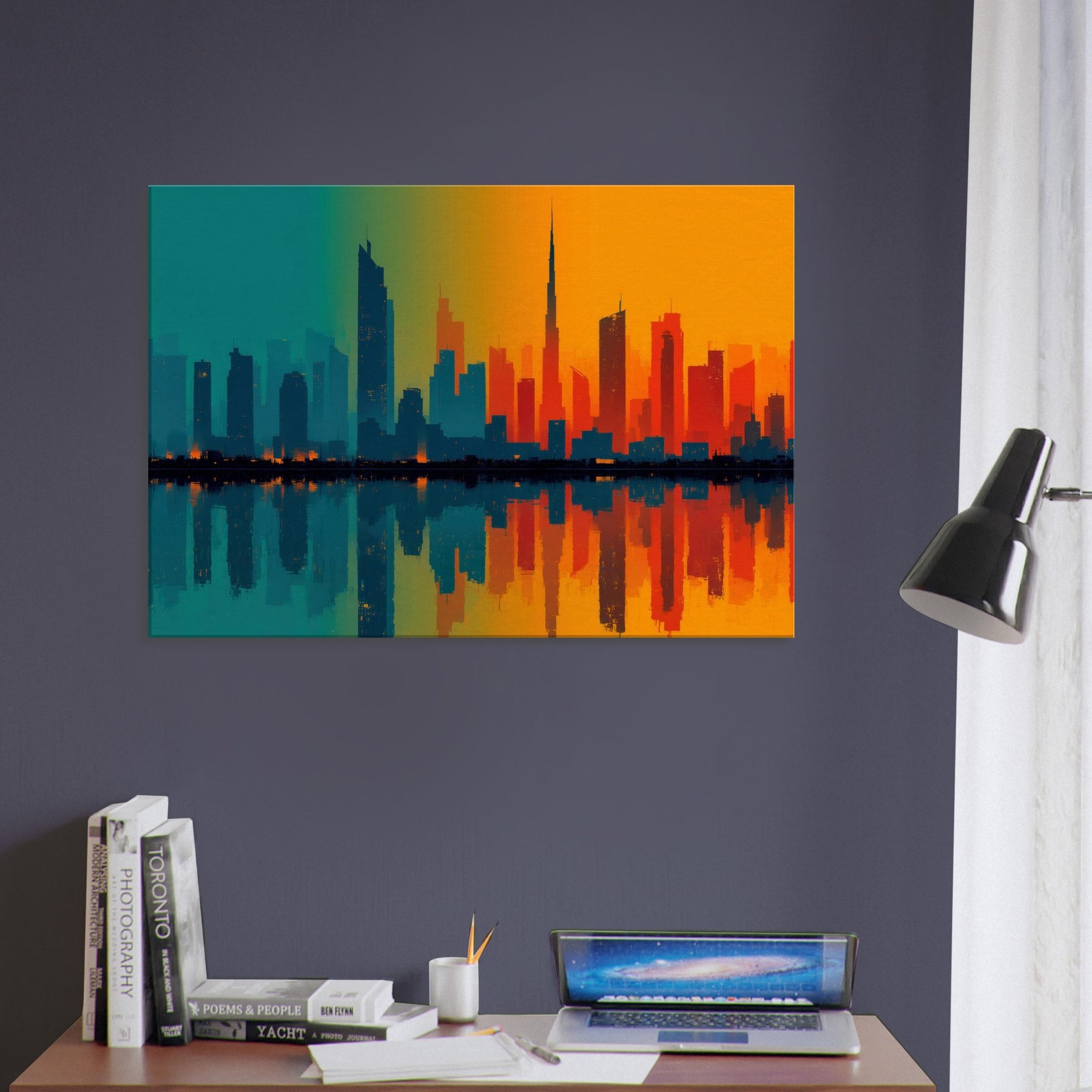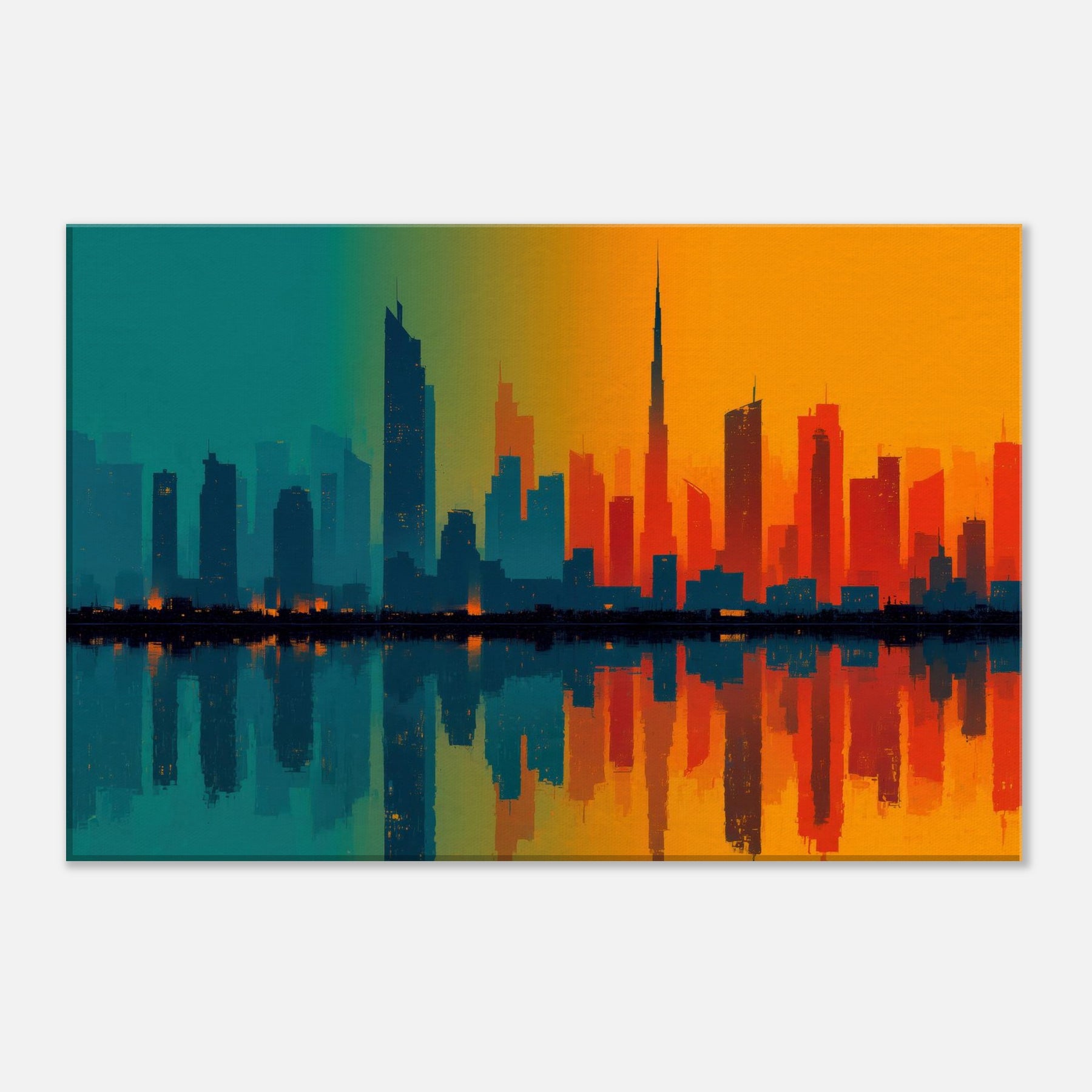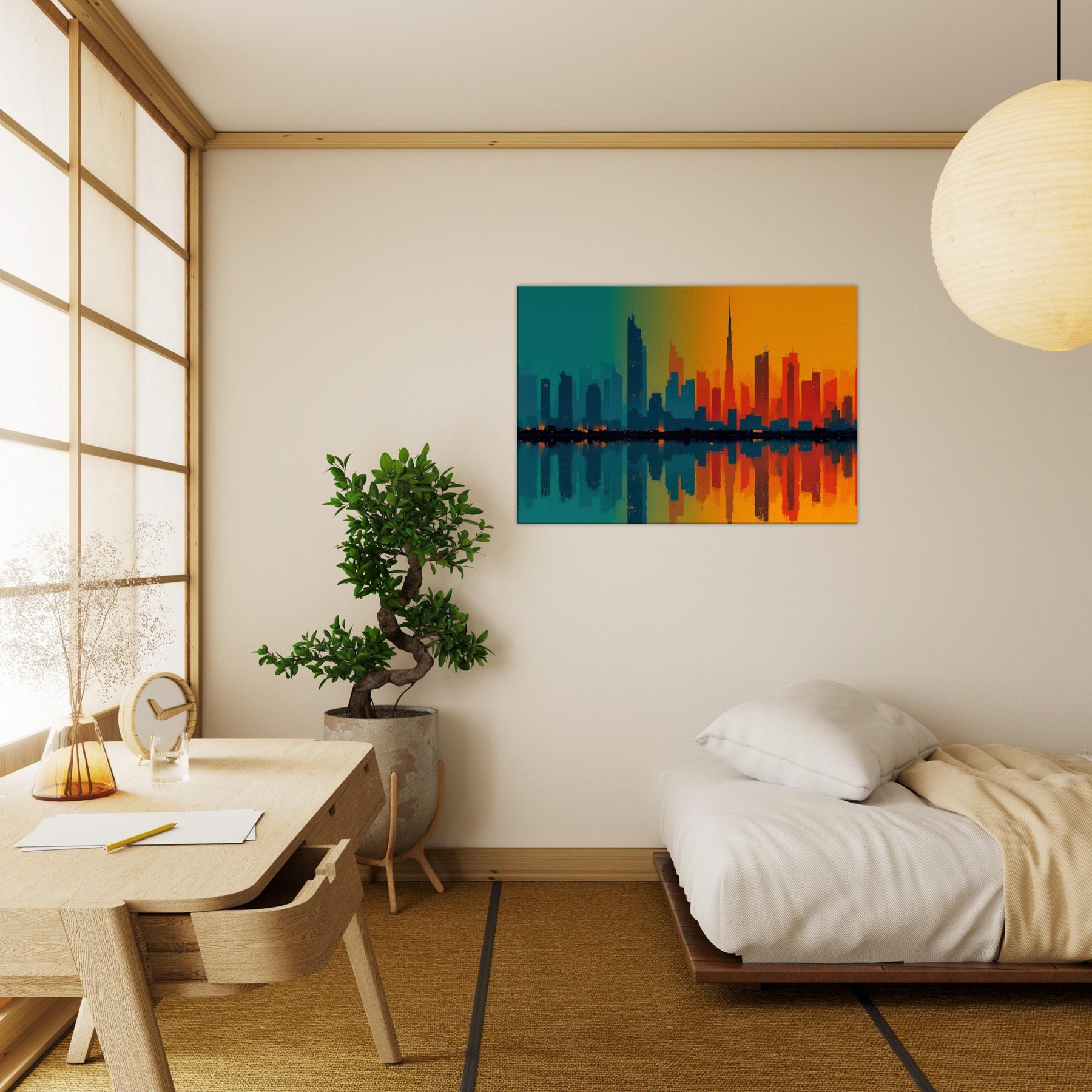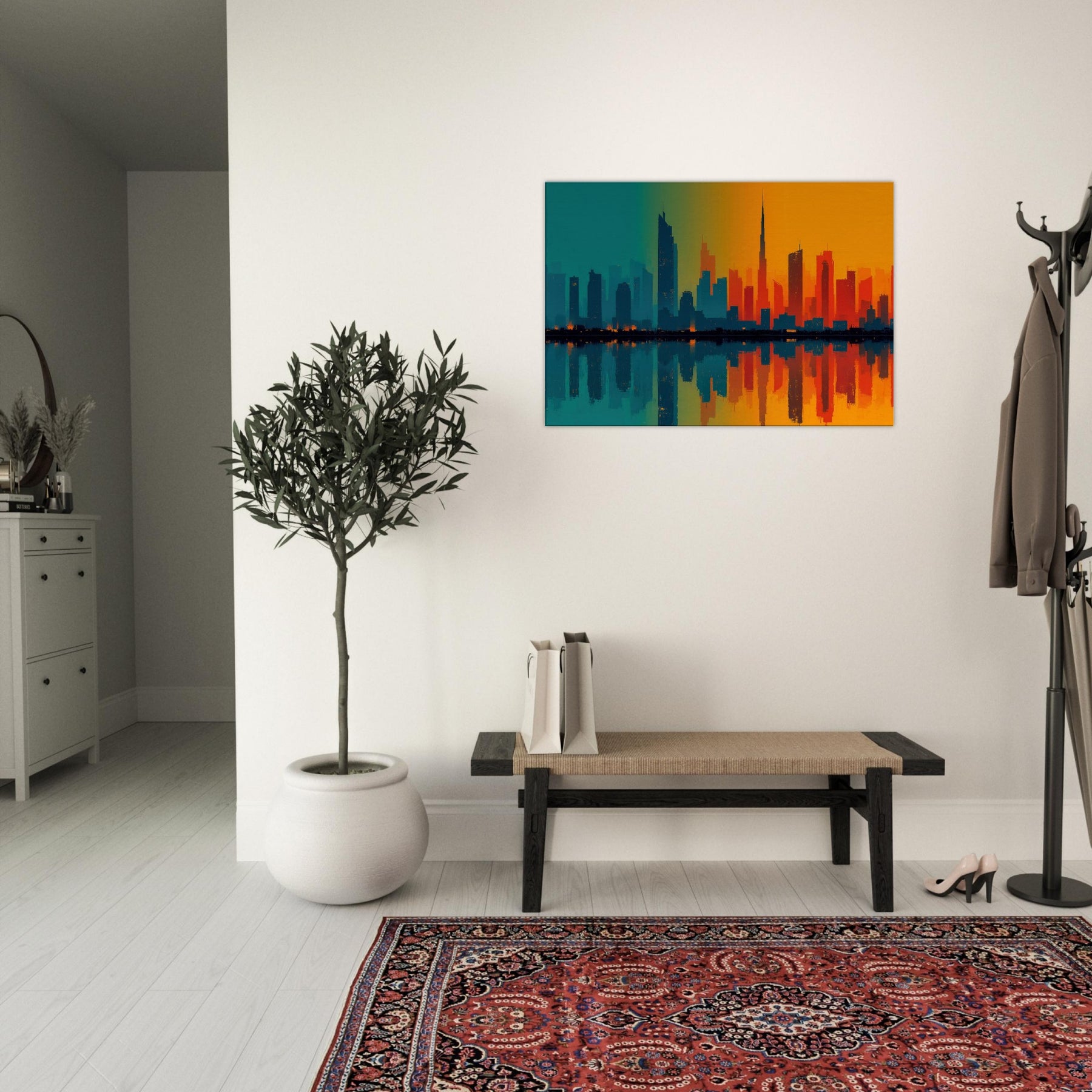 Dubai unfolds across this vibrant canvas, where the city's silhouette rises in bold, geometric strokes and a molten horizon that shifts from teal to sunlit orange. The abstract panorama invites the eye to wander along mirrored water, catching every pulse of lights and reflection as if standing at the shore at dusk. This piece brings a cinematic, breathable energy to a living space calm, immersive, and endlessly poetic perfect above a sofa or in a modern entryway to greet guests with warmth and wonder, day after day.