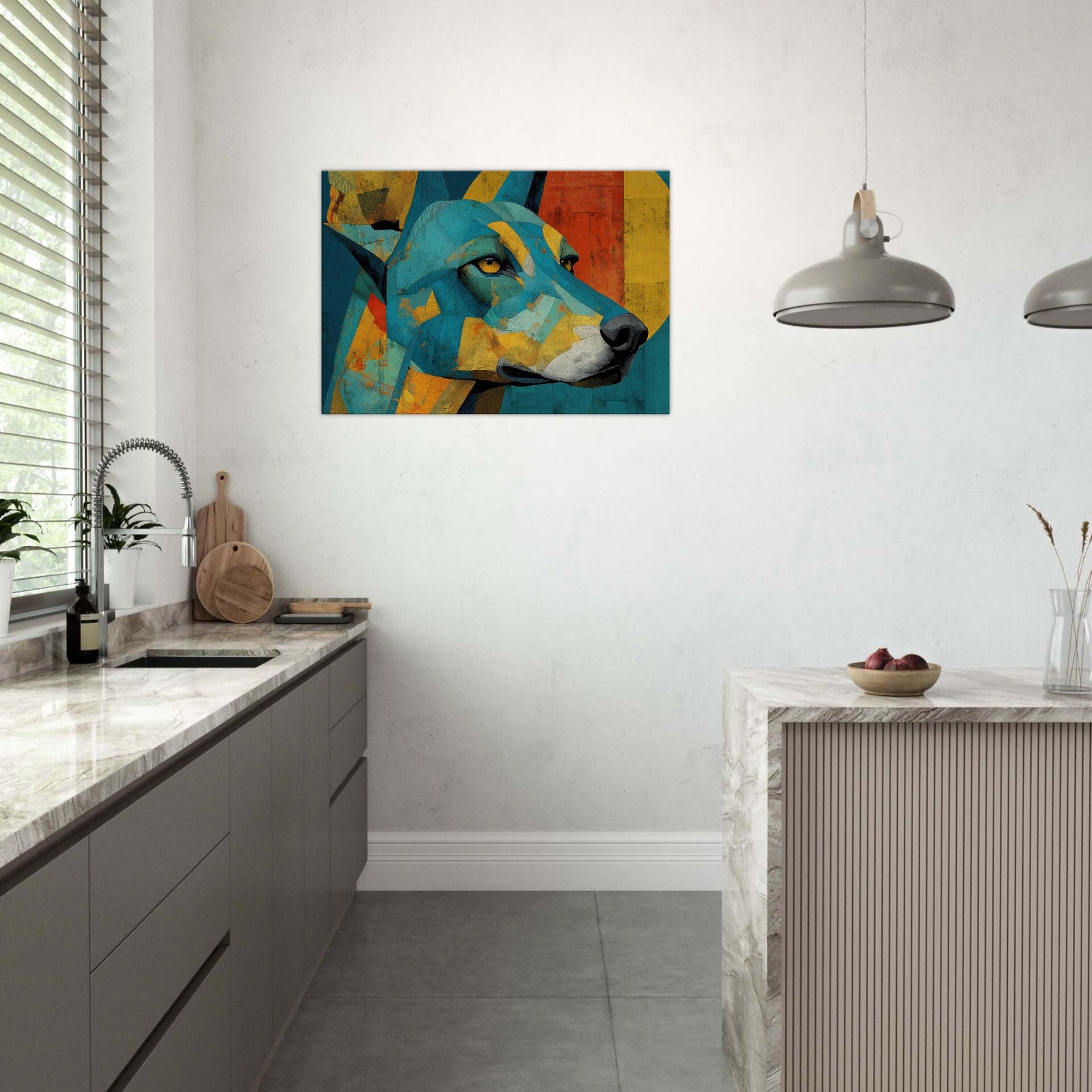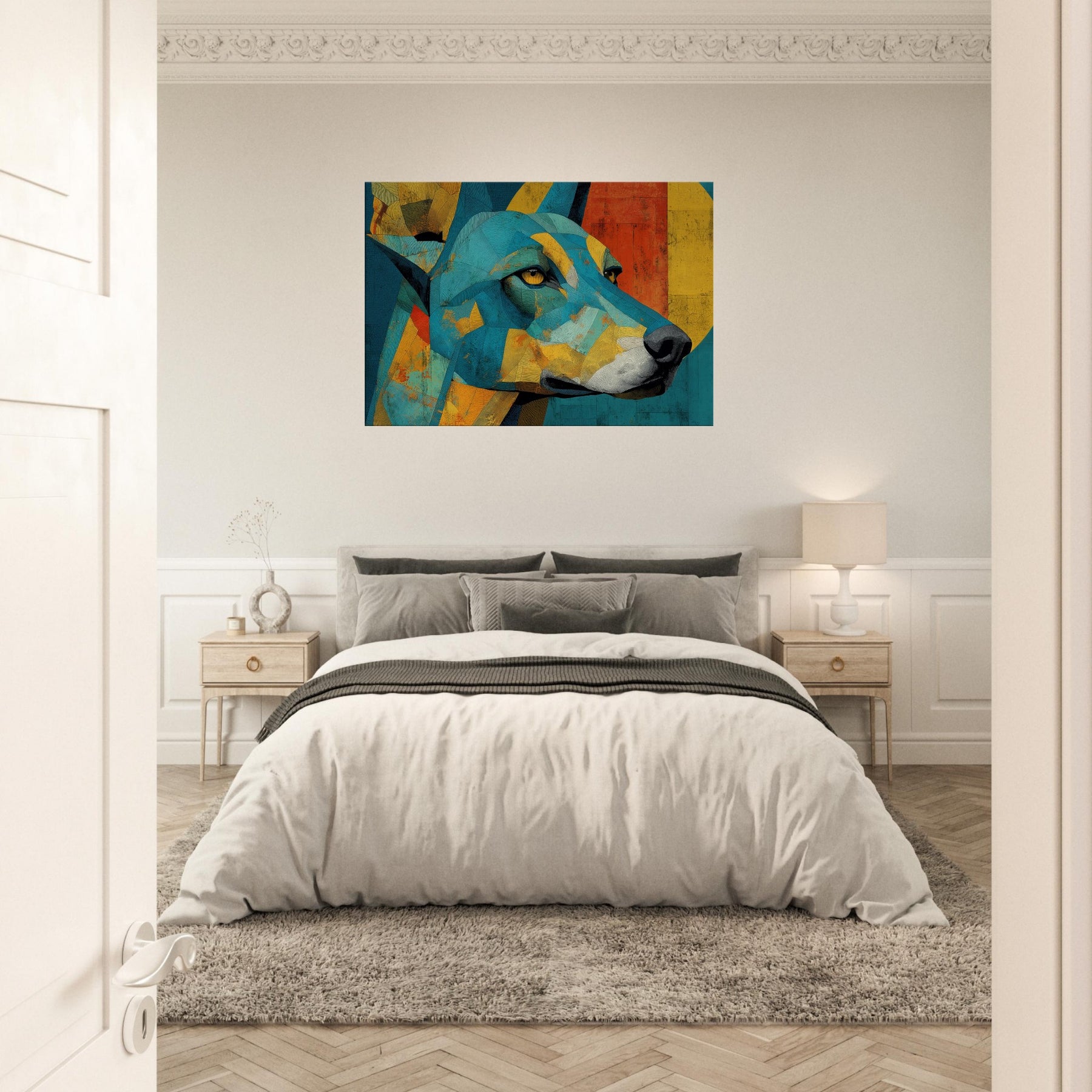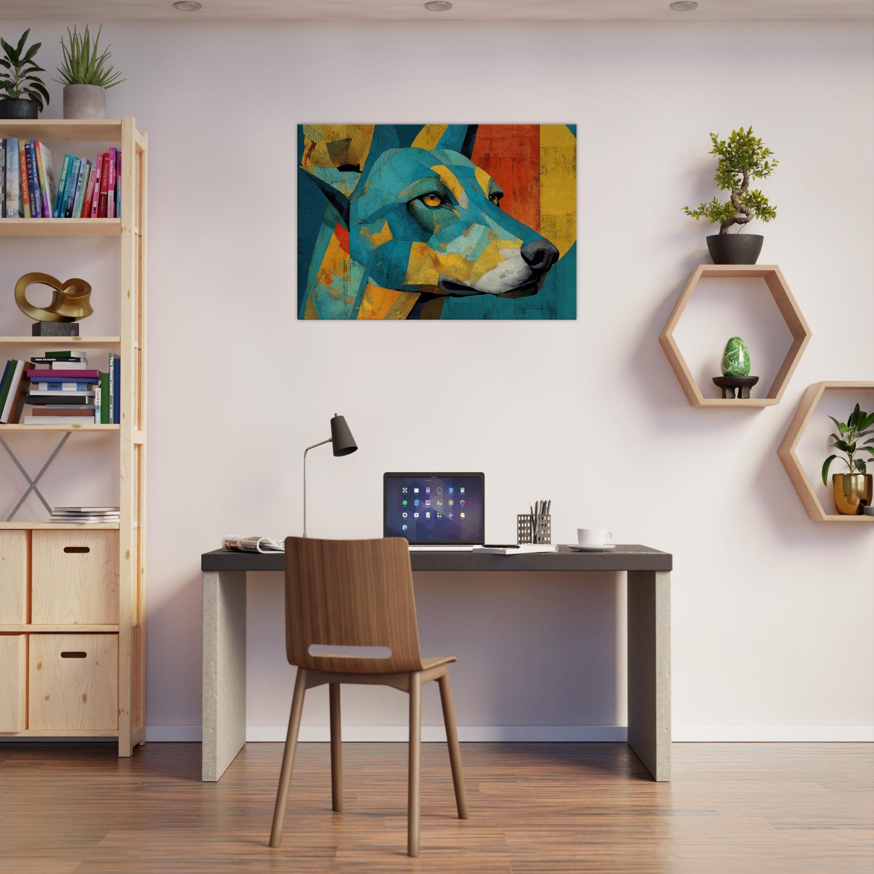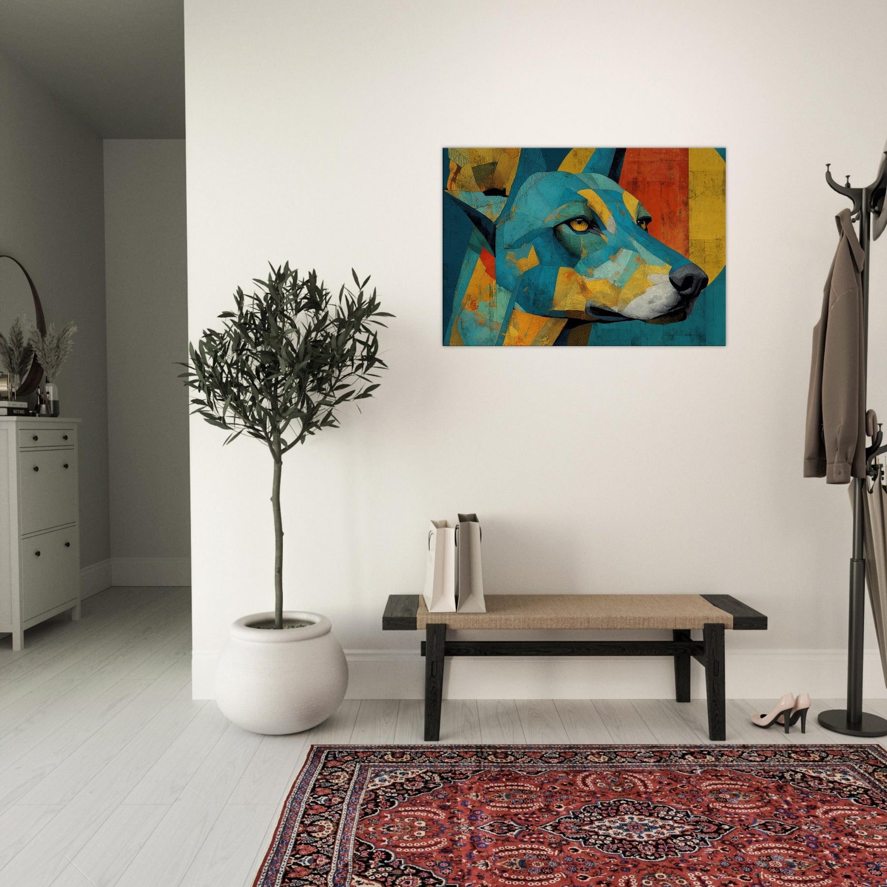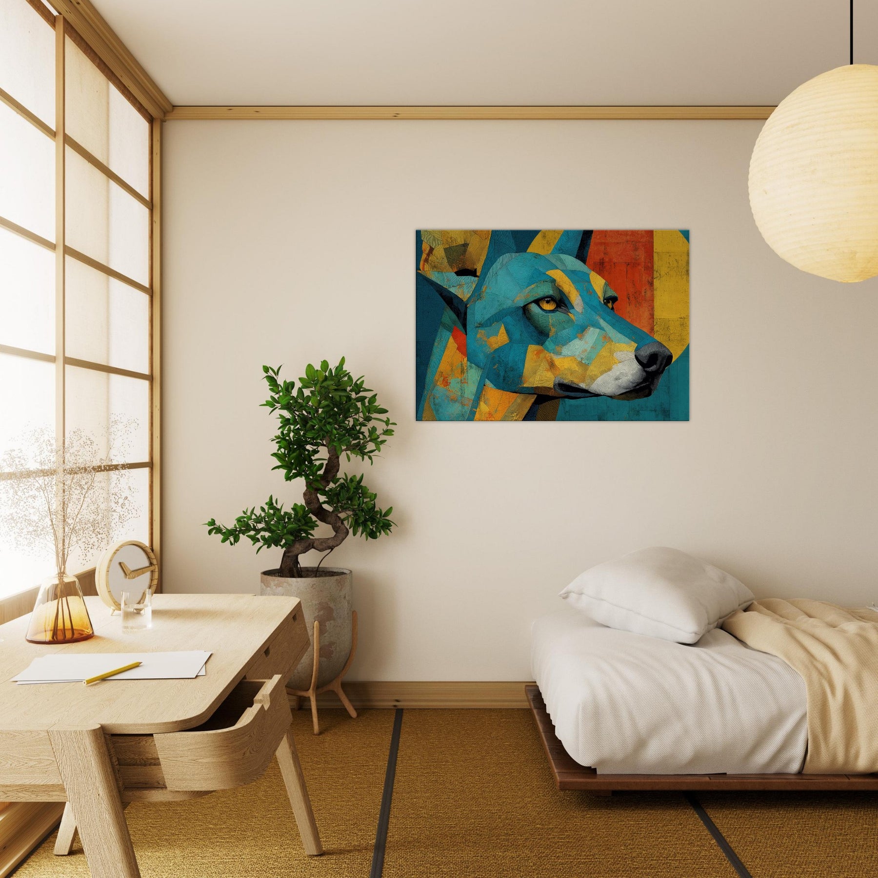 Immerse your space in the mythic presence of Anubis, the Egyptian God of Death with a Jackal Head, reimagined as a luminous abstract . The composition unfurls in vibrant shards of teal, gold, and sunset orange, each plane catching light and casting quiet, sculptural shadows. This piece invites contemplation rather than literal representation, turning walls into a portal between antiquity and modern fantasy. Place it above a sofa or in a entryway to summon ceremony, depth, and a serene, otherworldly mood.