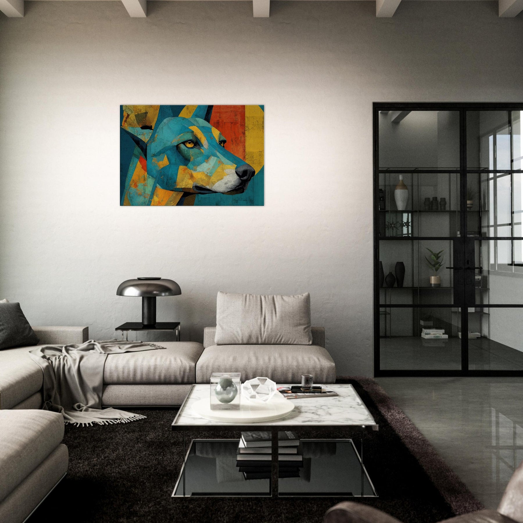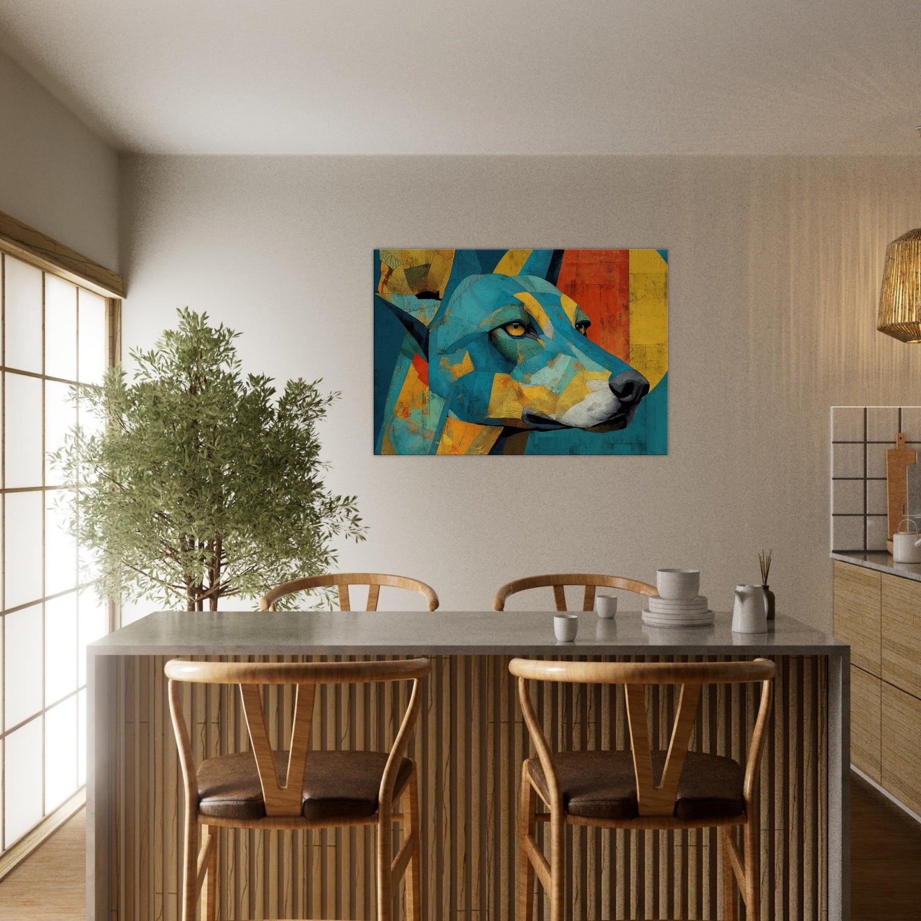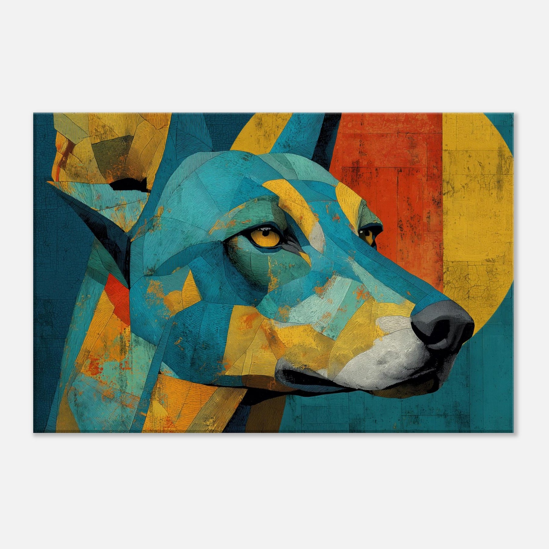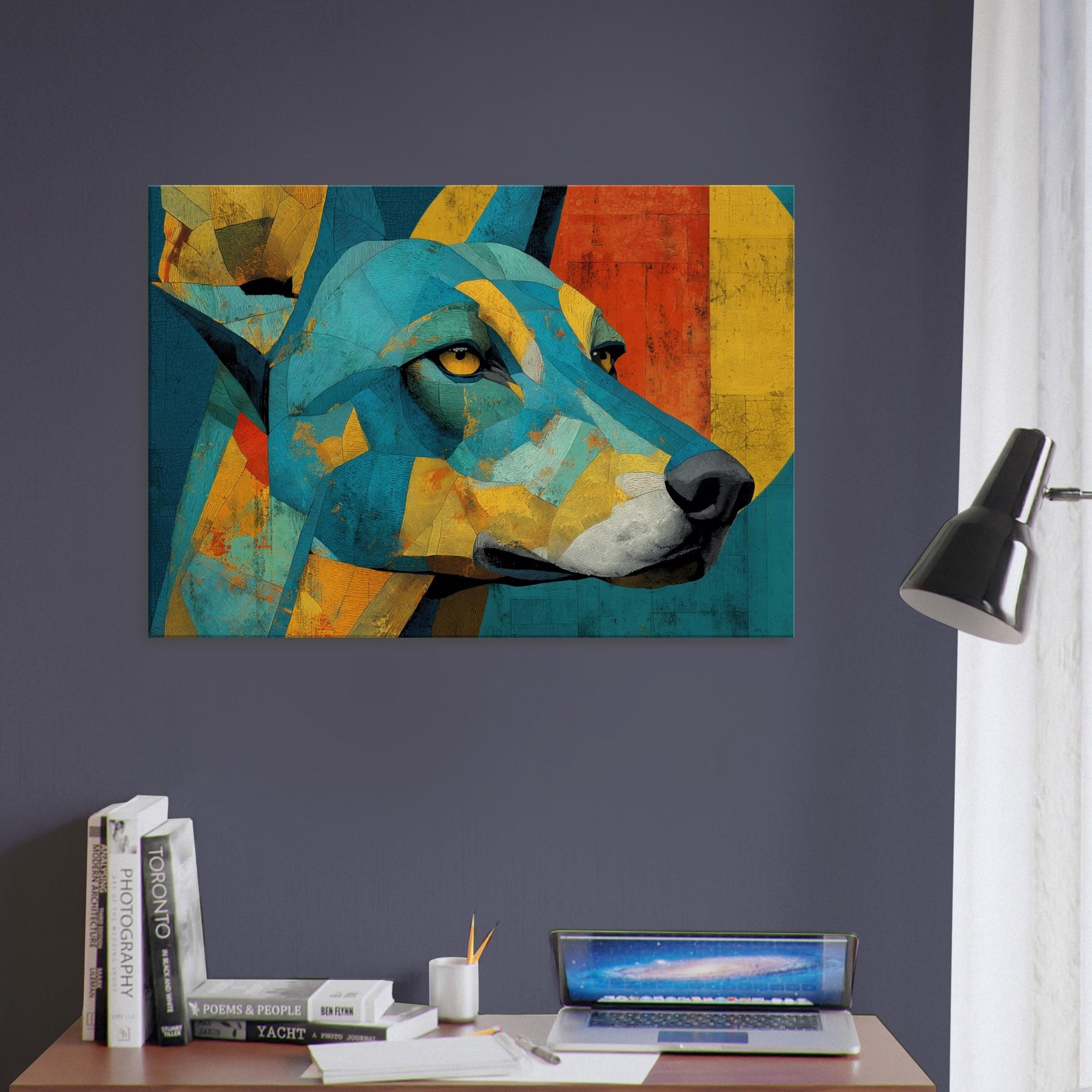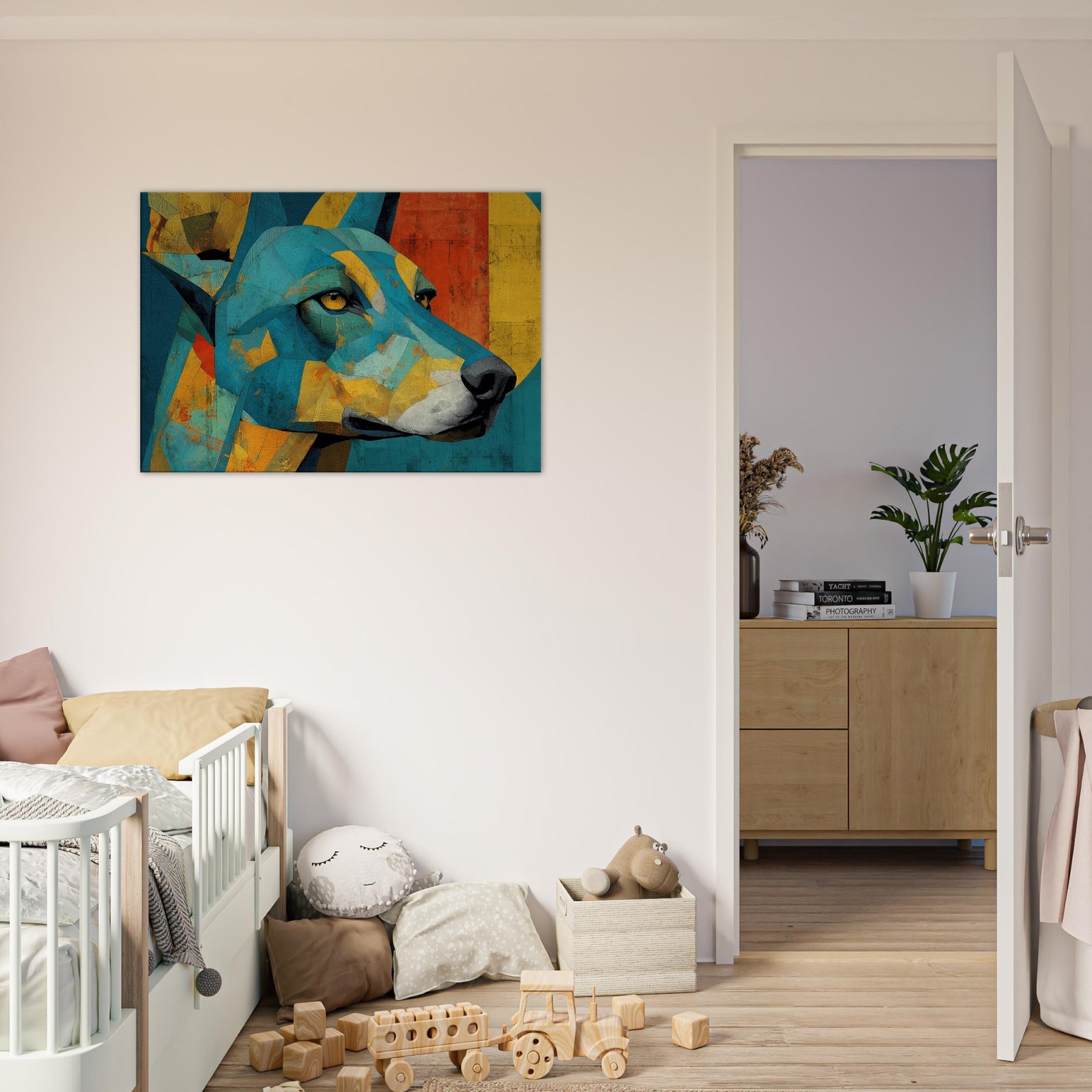 Immerse your space in the mythic presence of Anubis, the Egyptian God of Death with a Jackal Head, reimagined as a luminous abstract . The composition unfurls in vibrant shards of teal, gold, and sunset orange, each plane catching light and casting quiet, sculptural shadows. This piece invites contemplation rather than literal representation, turning walls into a portal between antiquity and modern fantasy. Place it above a sofa or in a entryway to summon ceremony, depth, and a serene, otherworldly mood.