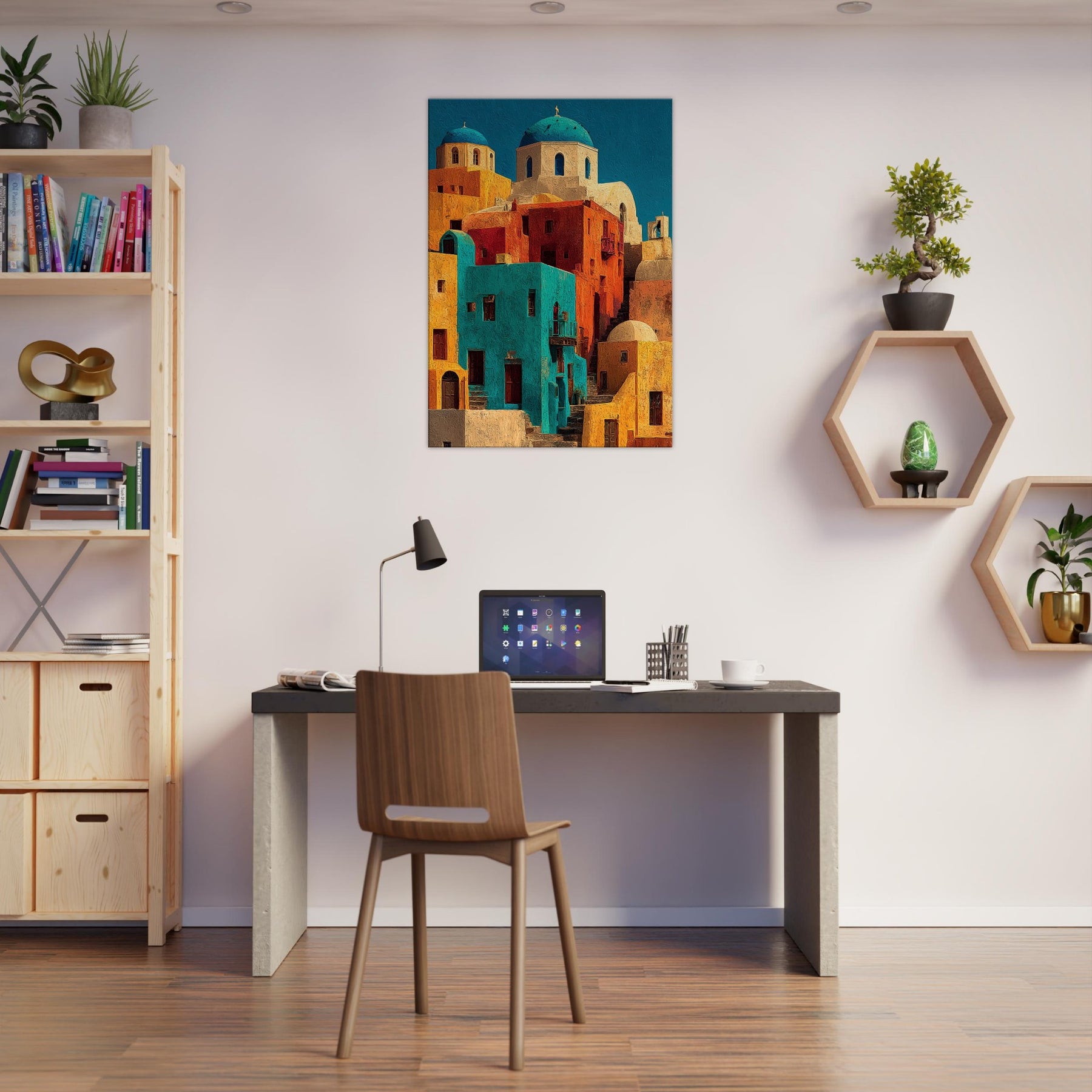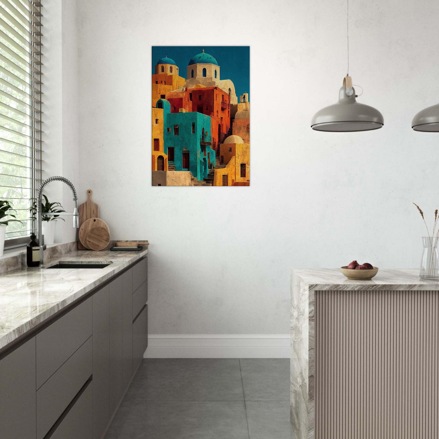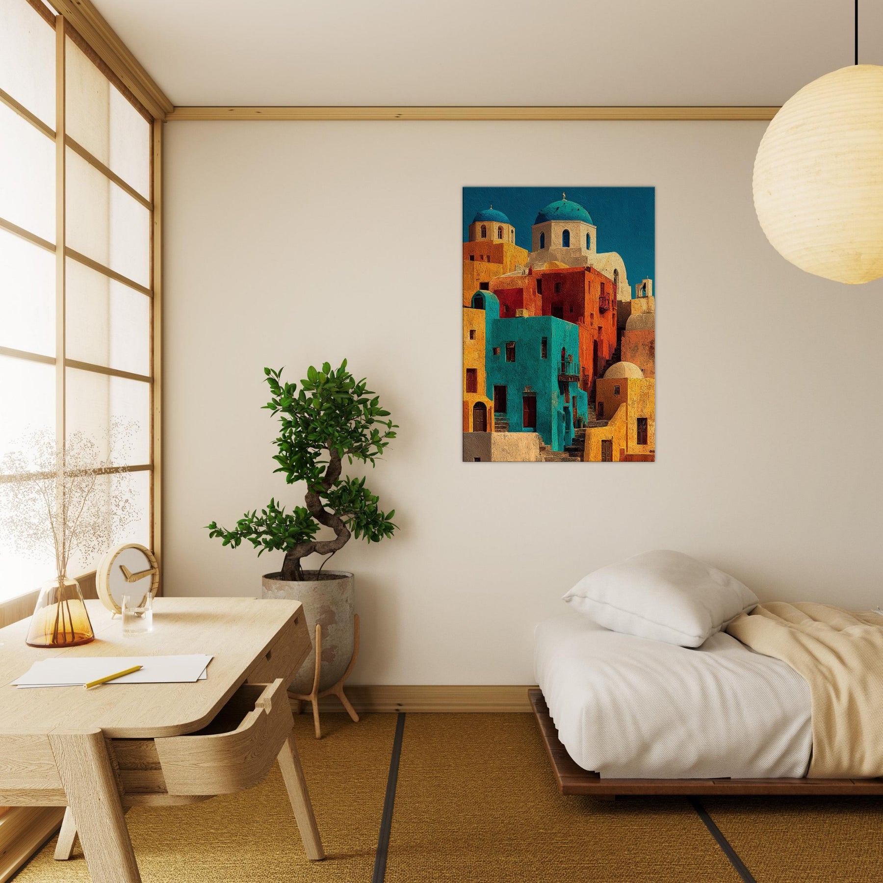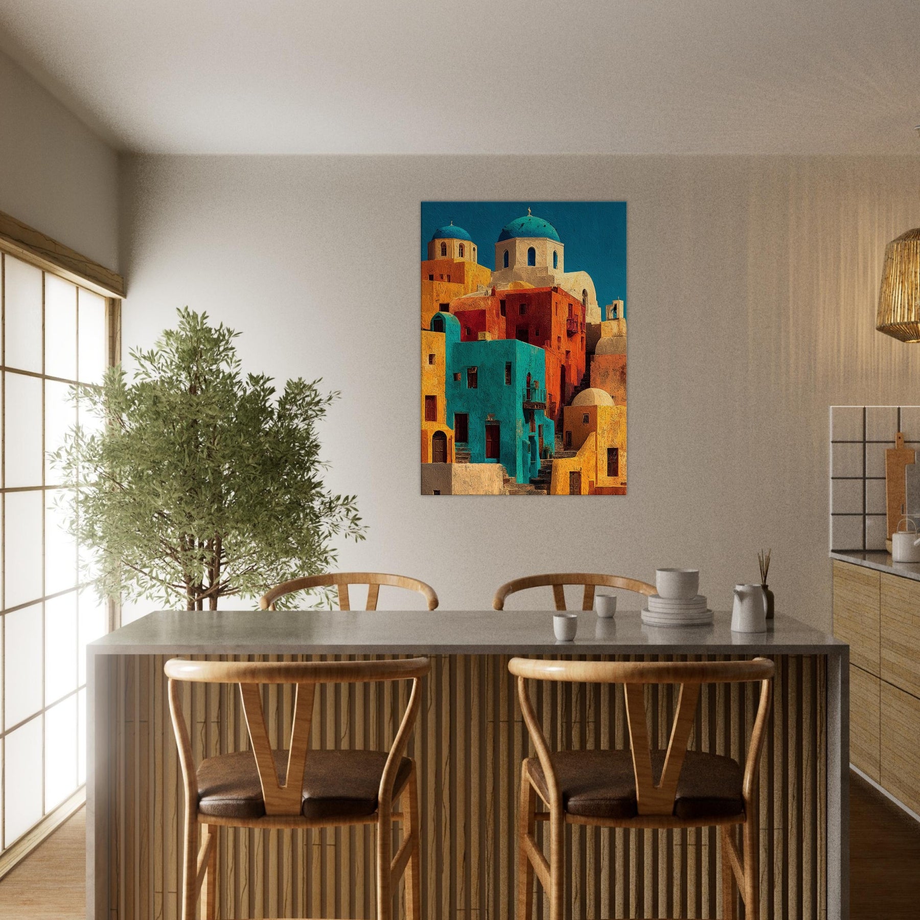 Let Santorini drift into your living room with a cascade of sun kissed color and sculpted light. This abstract cityscape conjures narrow stairways, blistering white walls, and turquoise domes bathed in a warm Mediterranean glow, inviting calm and curiosity in equal measure. The piece hums with a coastal breeze, turning everyday walls into a window for memory and dream. Hang it where morning sun meets evening shadow to fragrance the space with sea air, warmth, and the quiet drama of the Aegean.