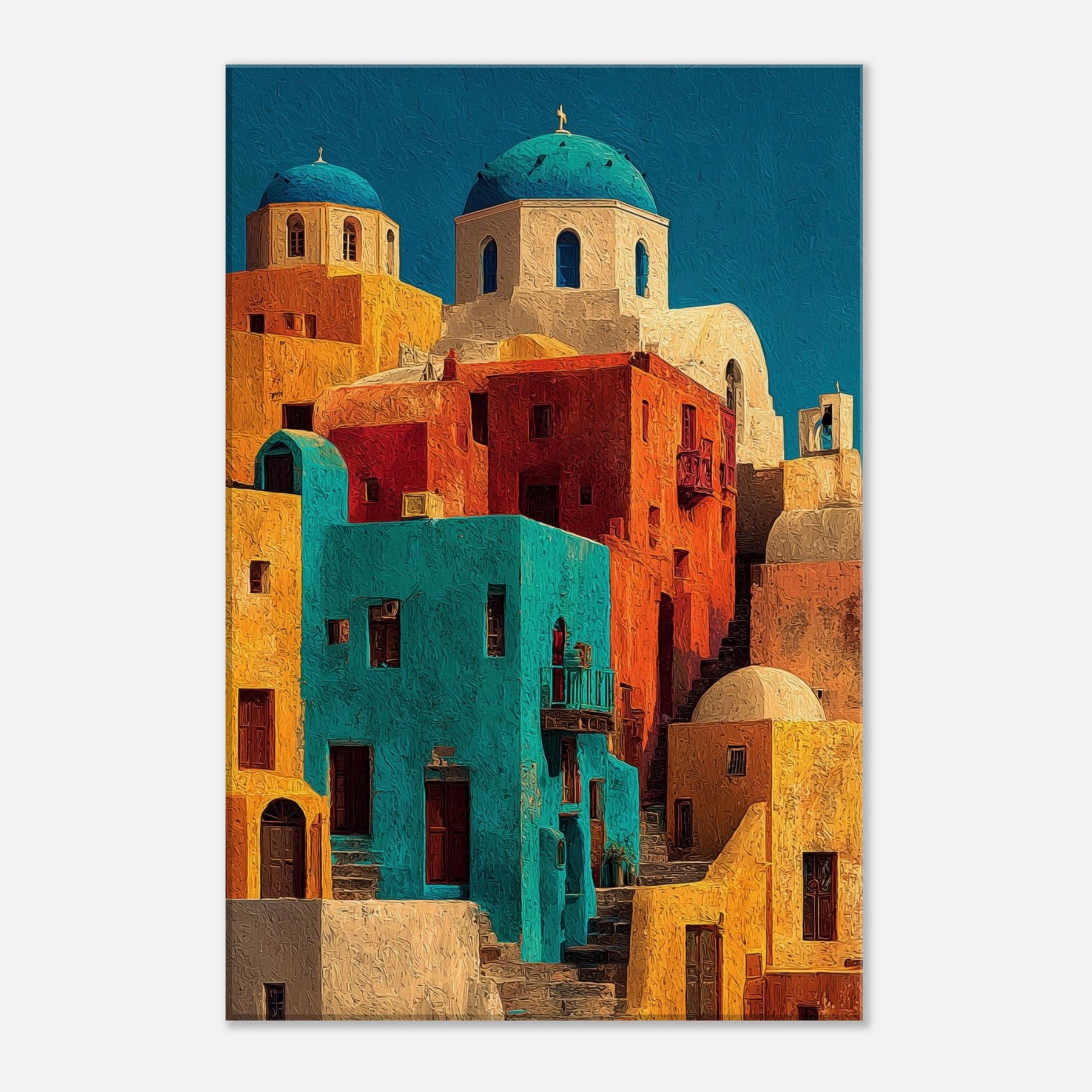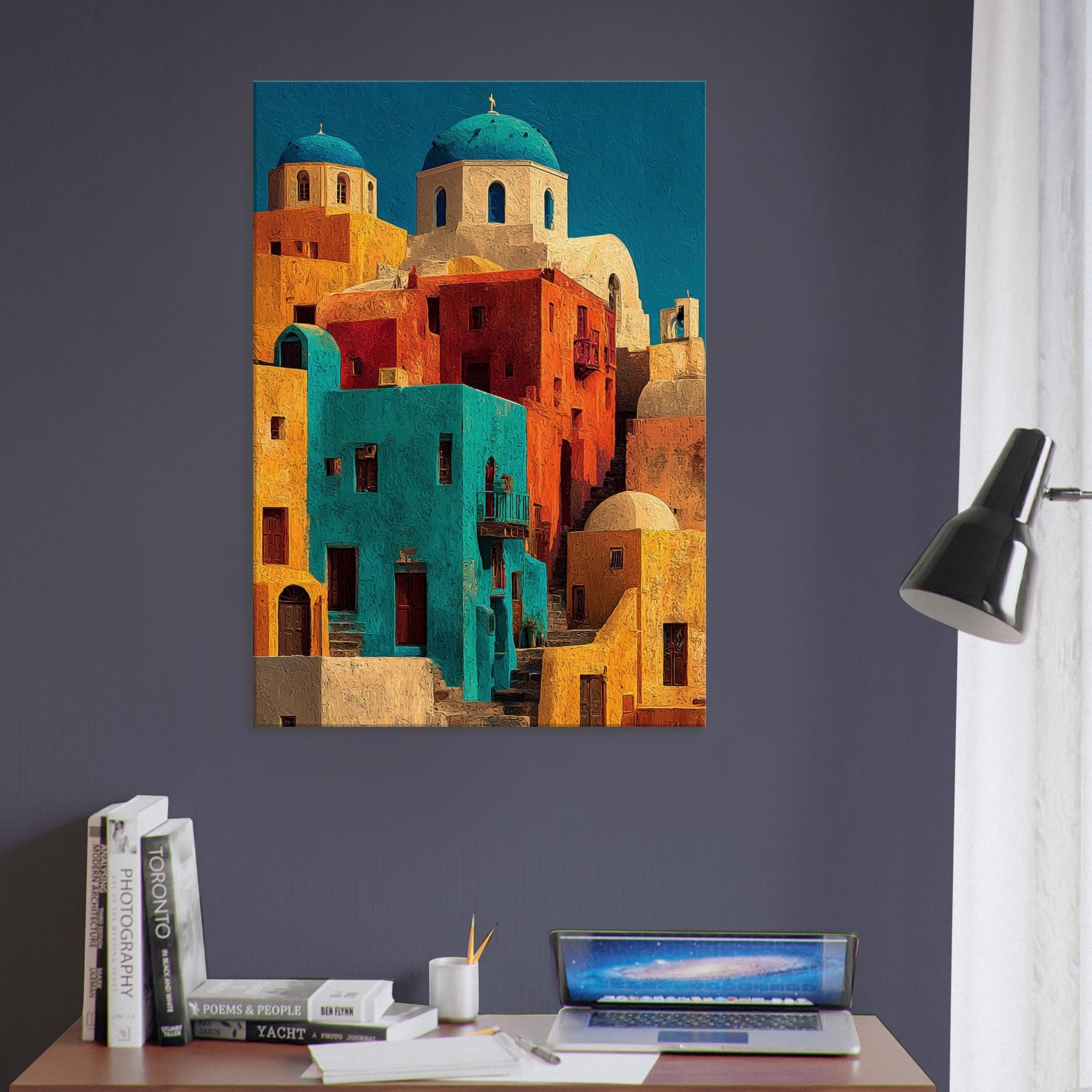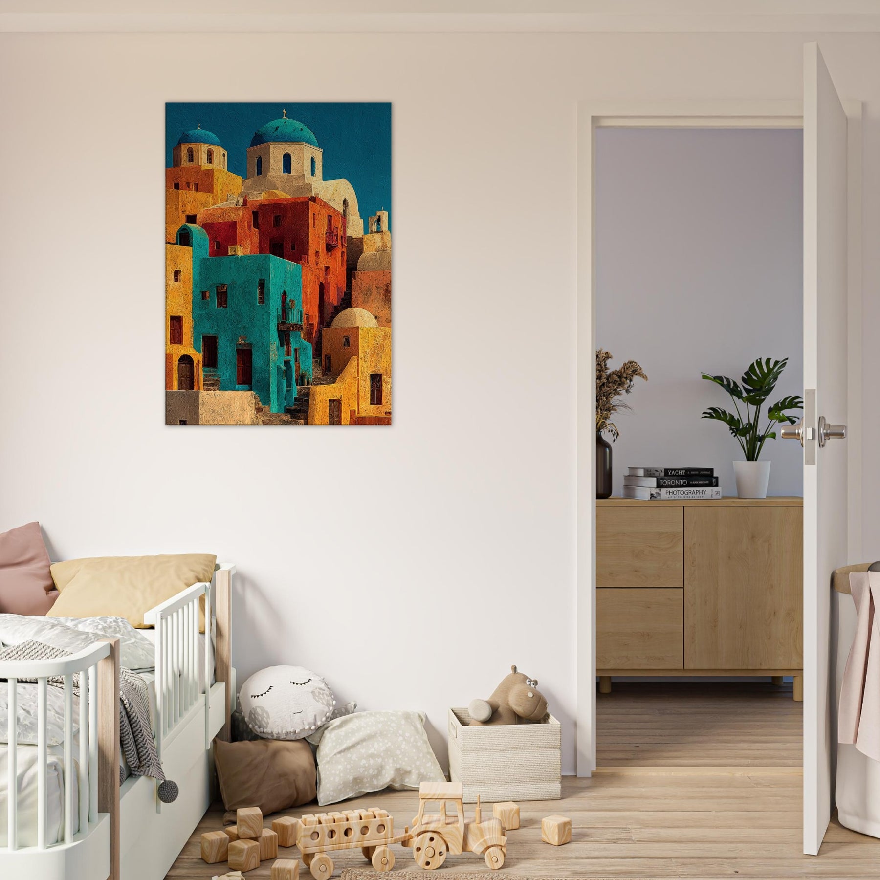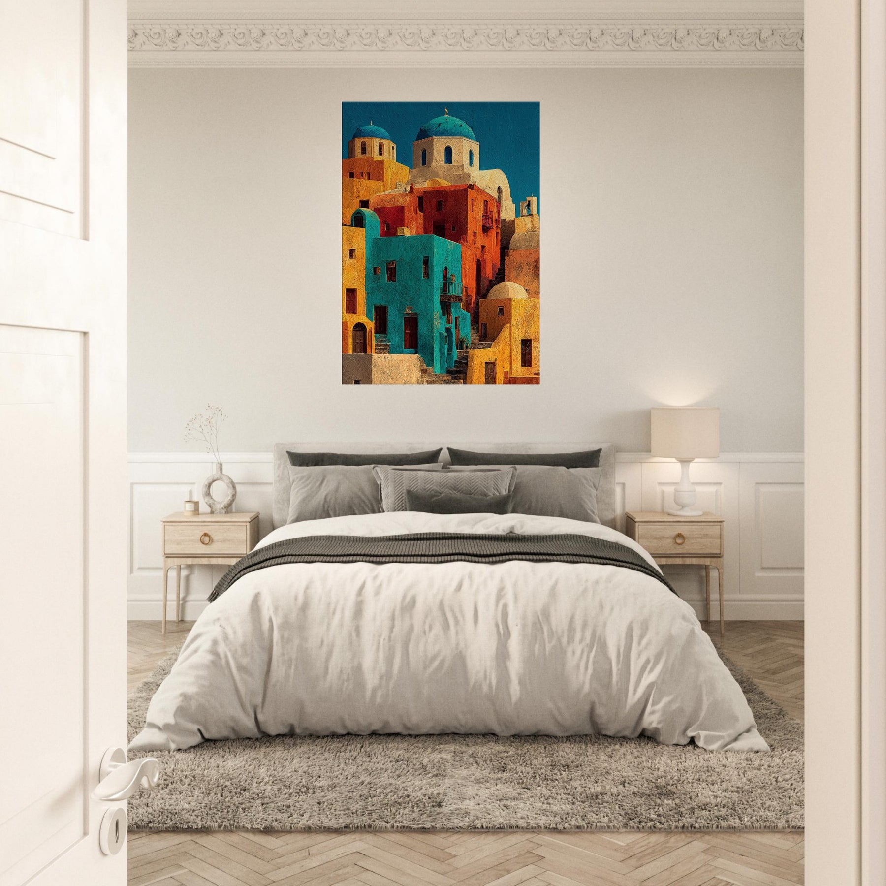 Let Santorini drift into your living room with a cascade of sun kissed color and sculpted light. This abstract cityscape conjures narrow stairways, blistering white walls, and turquoise domes bathed in a warm Mediterranean glow, inviting calm and curiosity in equal measure. The piece hums with a coastal breeze, turning everyday walls into a window for memory and dream. Hang it where morning sun meets evening shadow to fragrance the space with sea air, warmth, and the quiet drama of the Aegean.