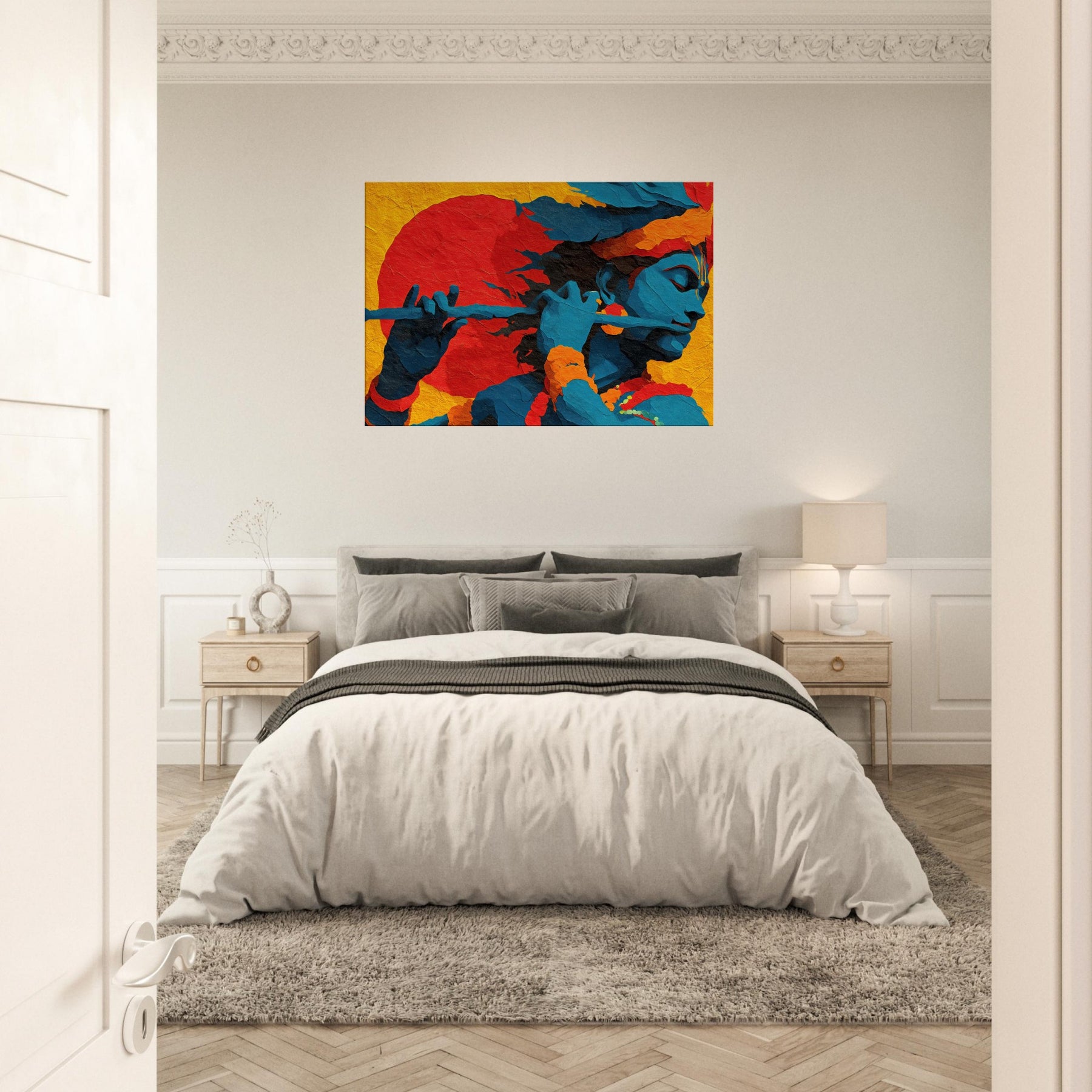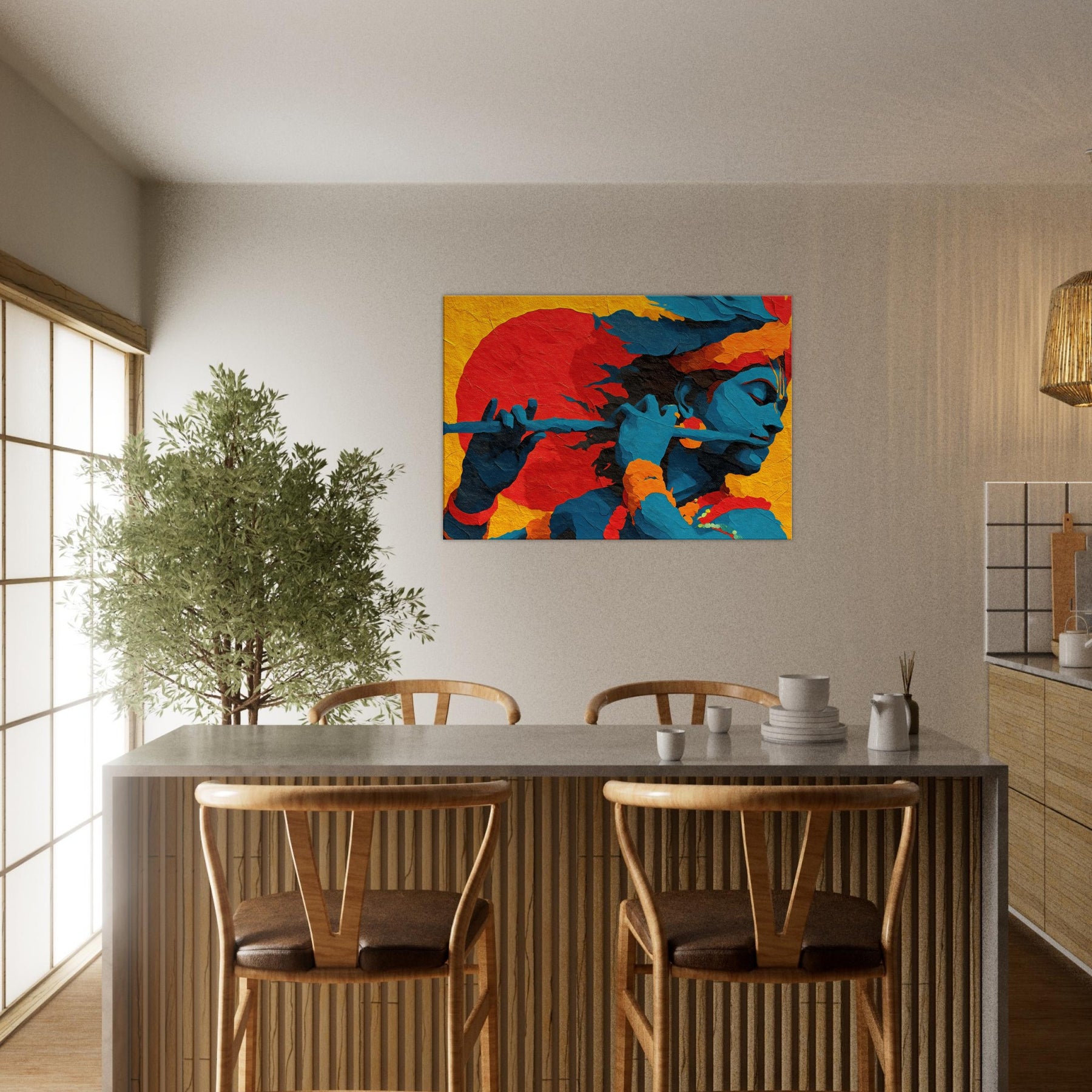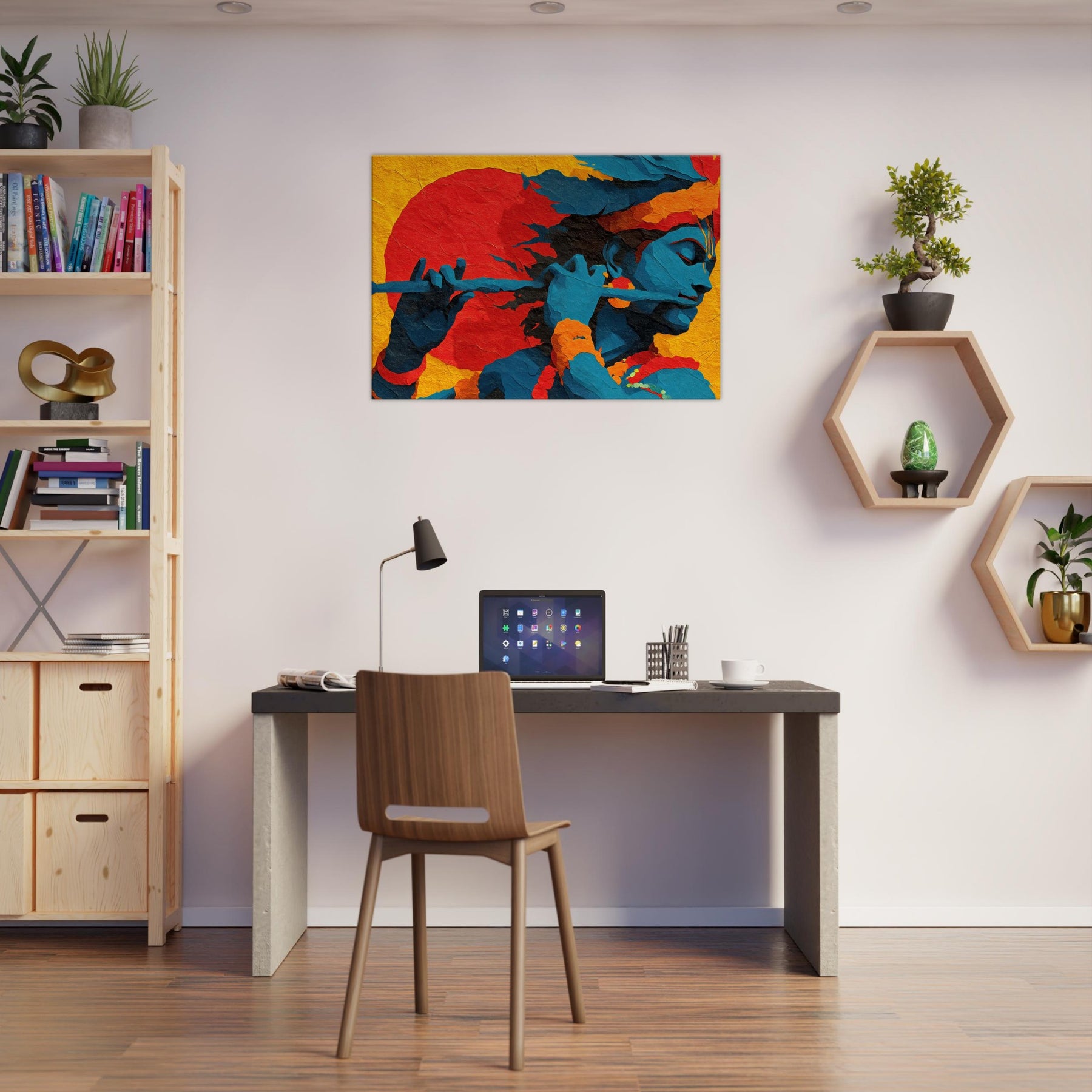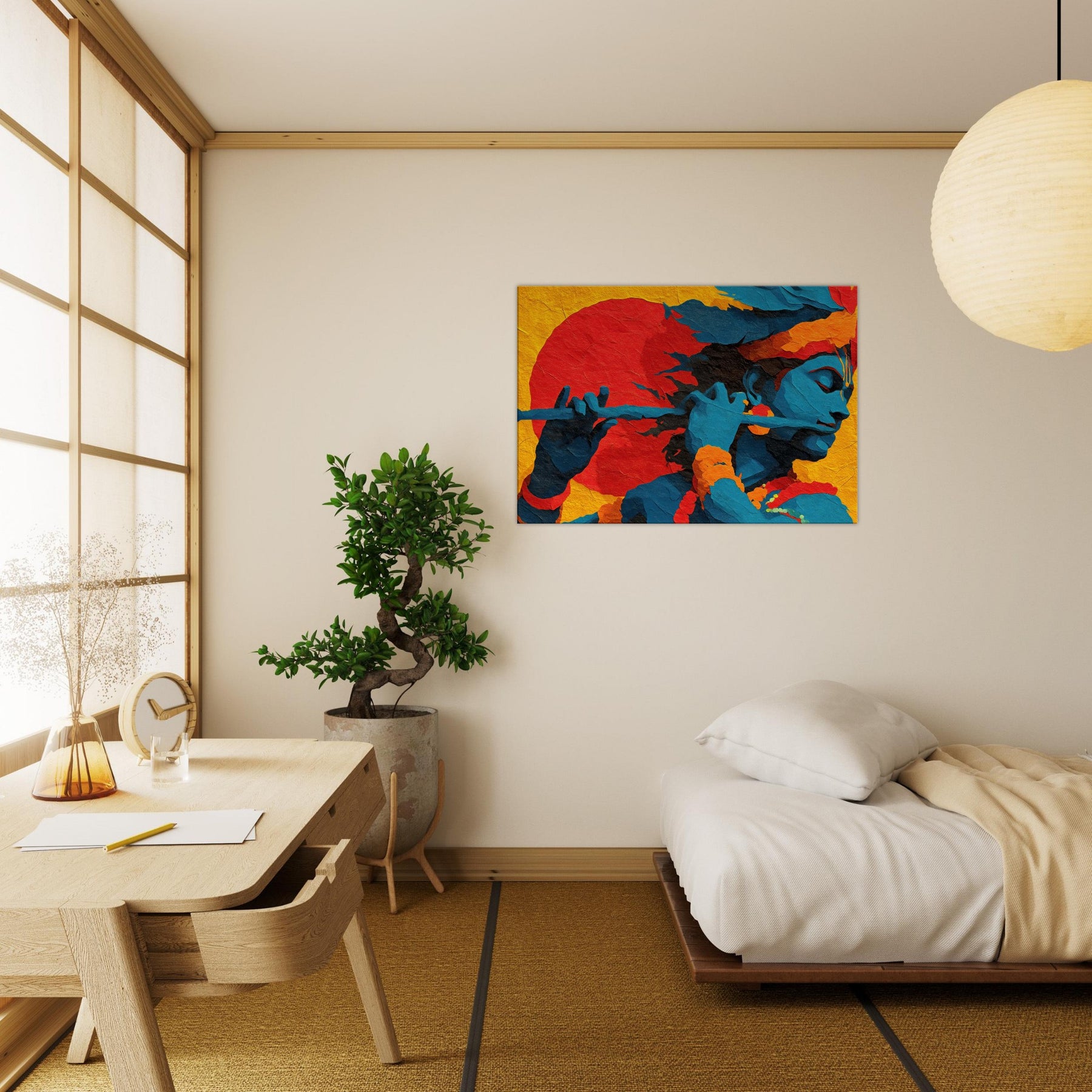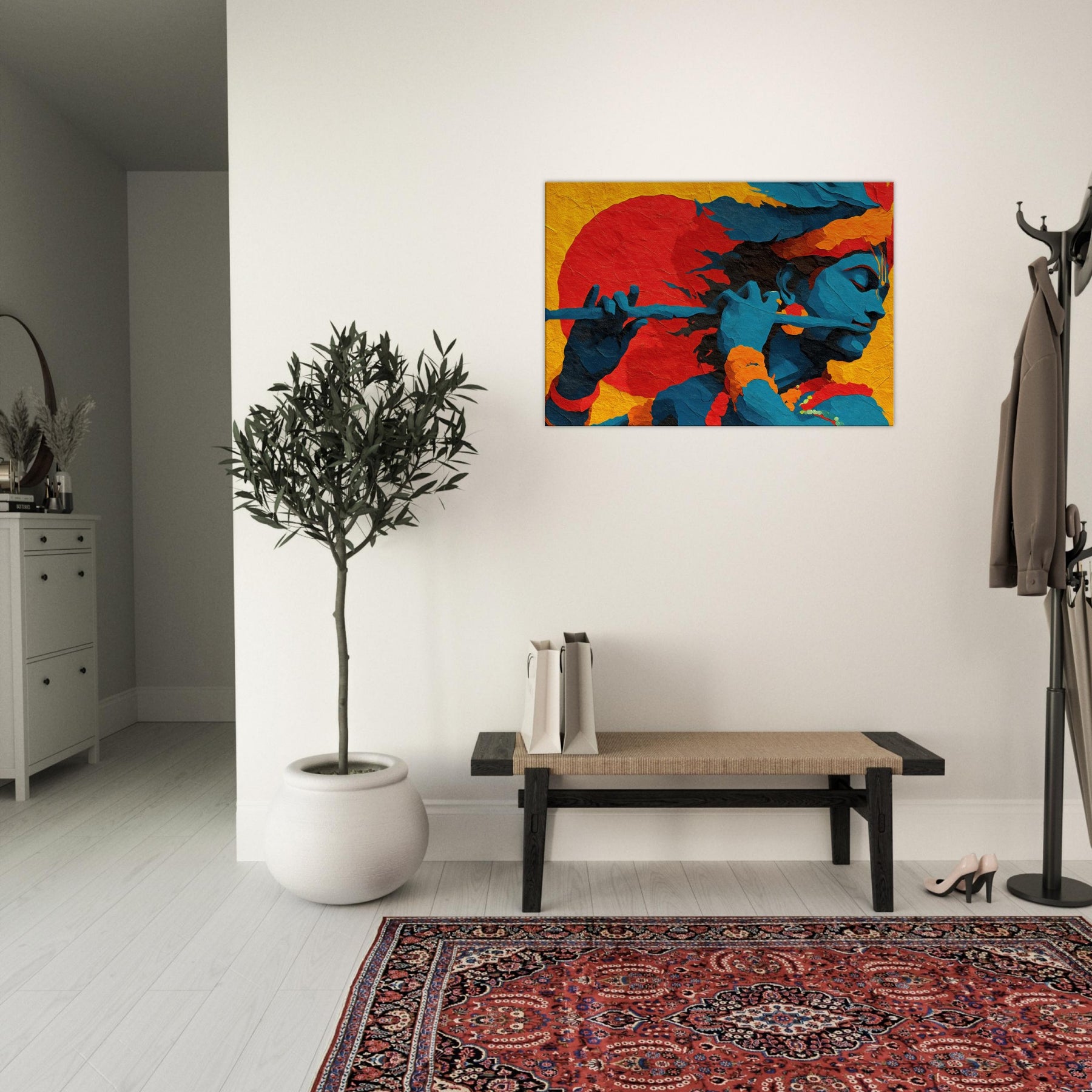 Immerse your space in a luminous meditation where color and form dissolve into sound. This piece centers Krishna with Flute in a radiant, abstract embrace, turning the act of listening into a visual hush that calms the room. The warm yellows and bold blues drift around the figure like a quiet hymn, inviting restful evenings and enlightened mornings. Printed to glow on a living room or study wall, it feels both ancient and alive, a doorway to serene wonder.