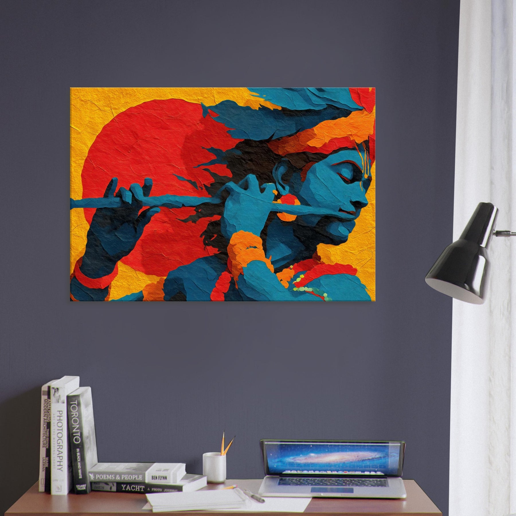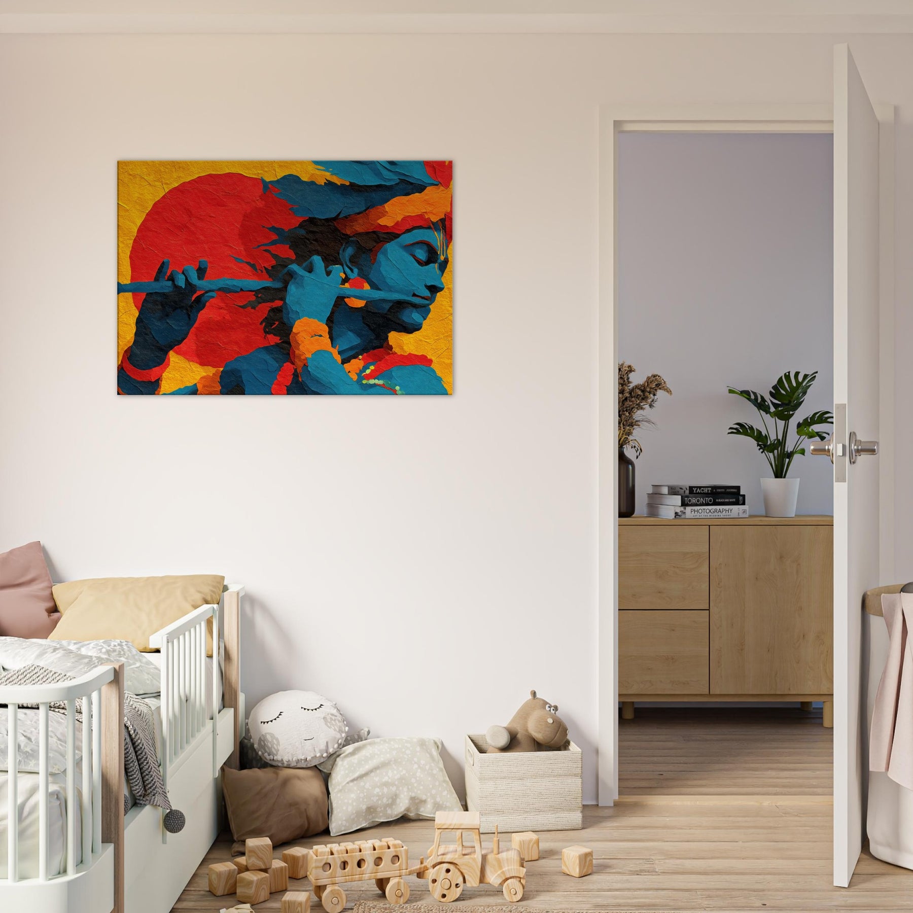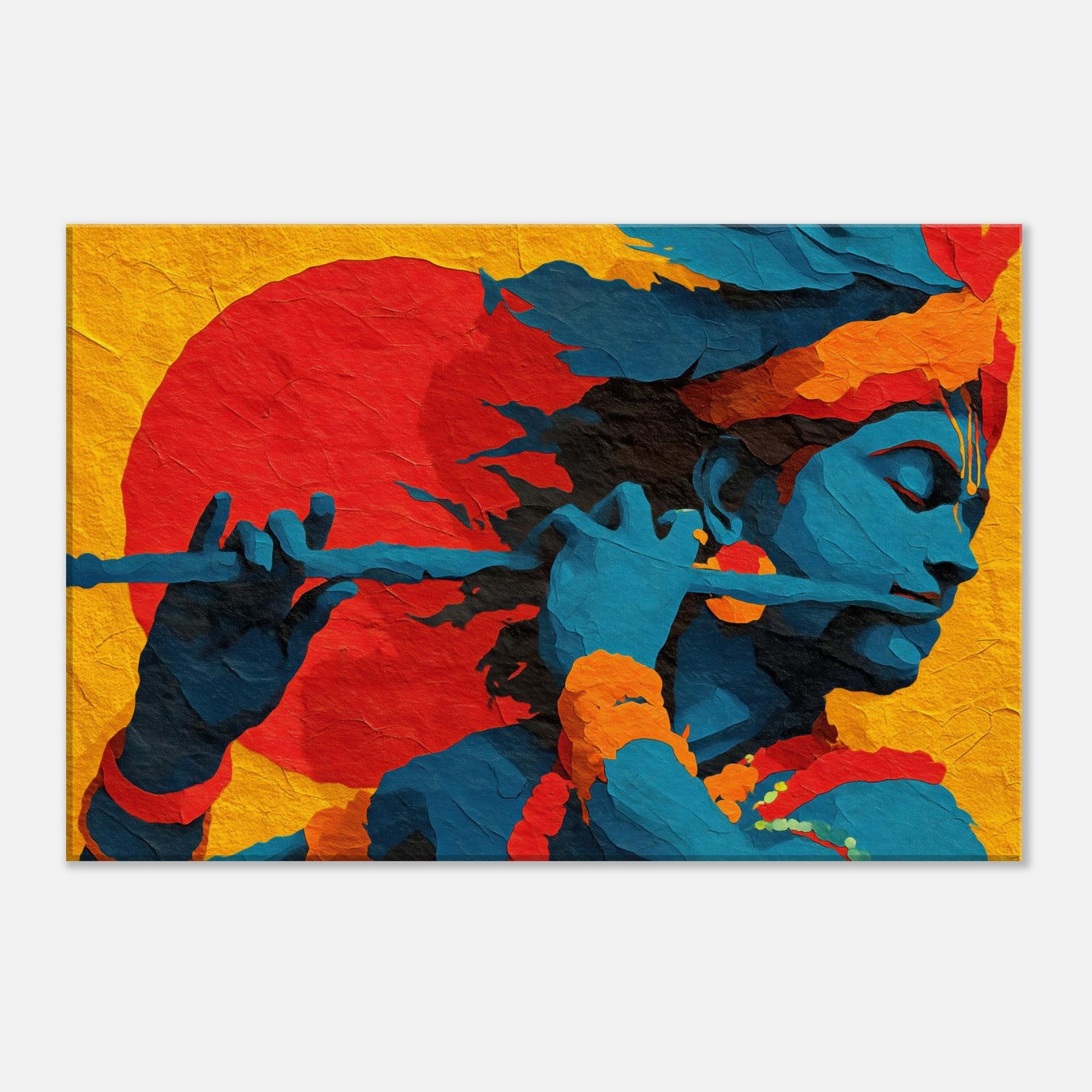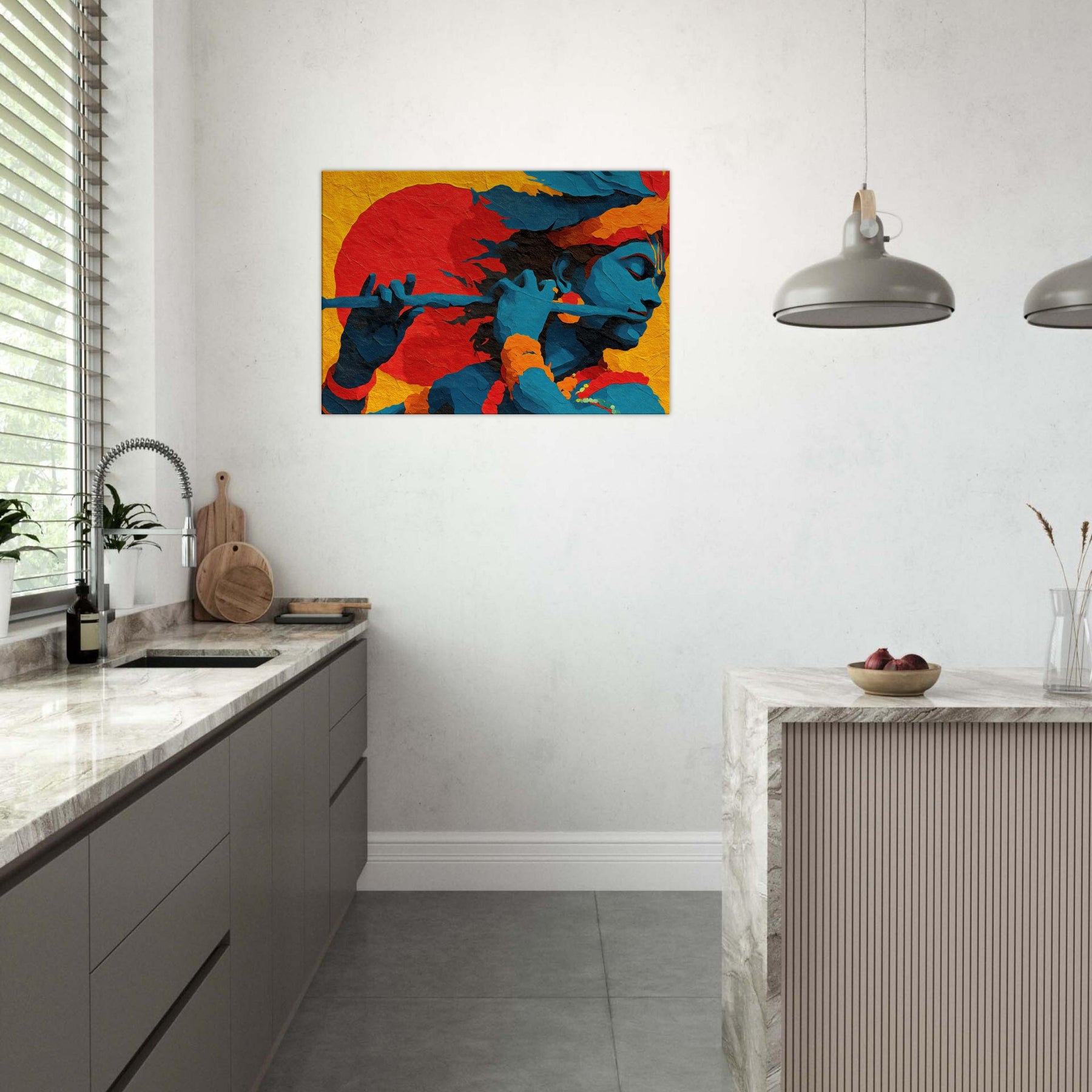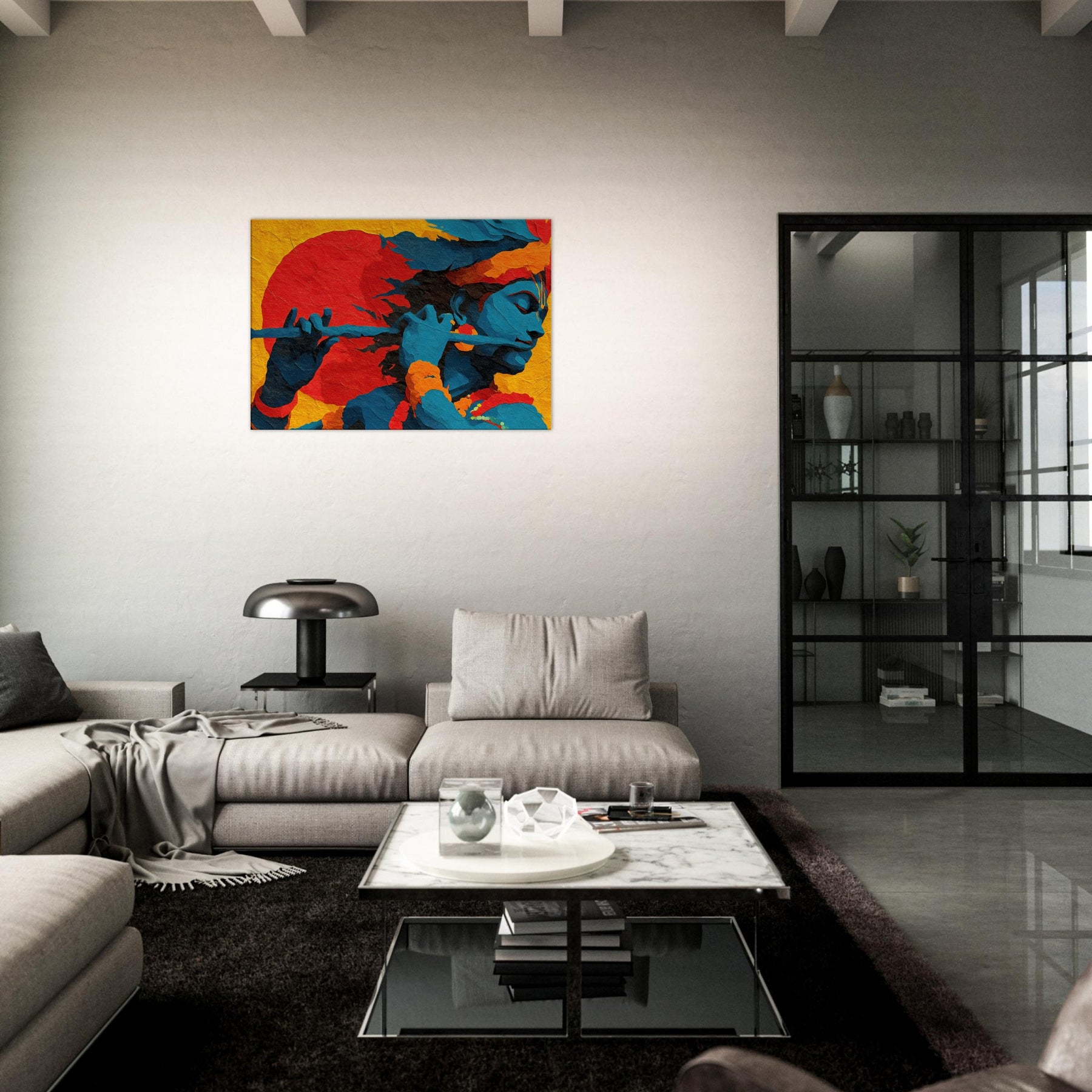 Immerse your space in a luminous meditation where color and form dissolve into sound. This piece centers Krishna with Flute in a radiant, abstract embrace, turning the act of listening into a visual hush that calms the room. The warm yellows and bold blues drift around the figure like a quiet hymn, inviting restful evenings and enlightened mornings. Printed to glow on a living room or study wall, it feels both ancient and alive, a doorway to serene wonder.