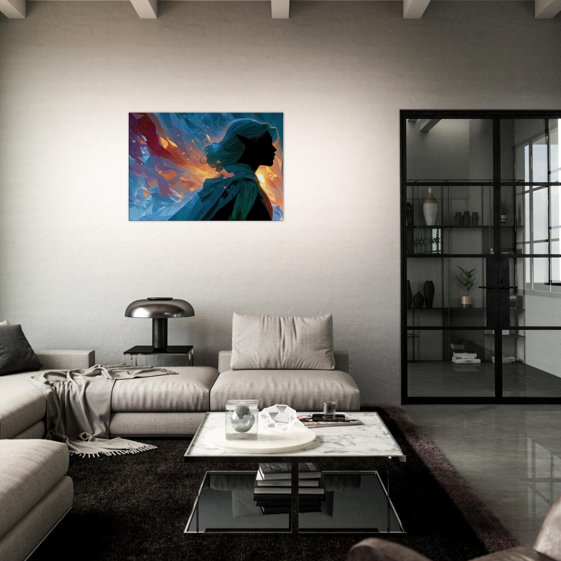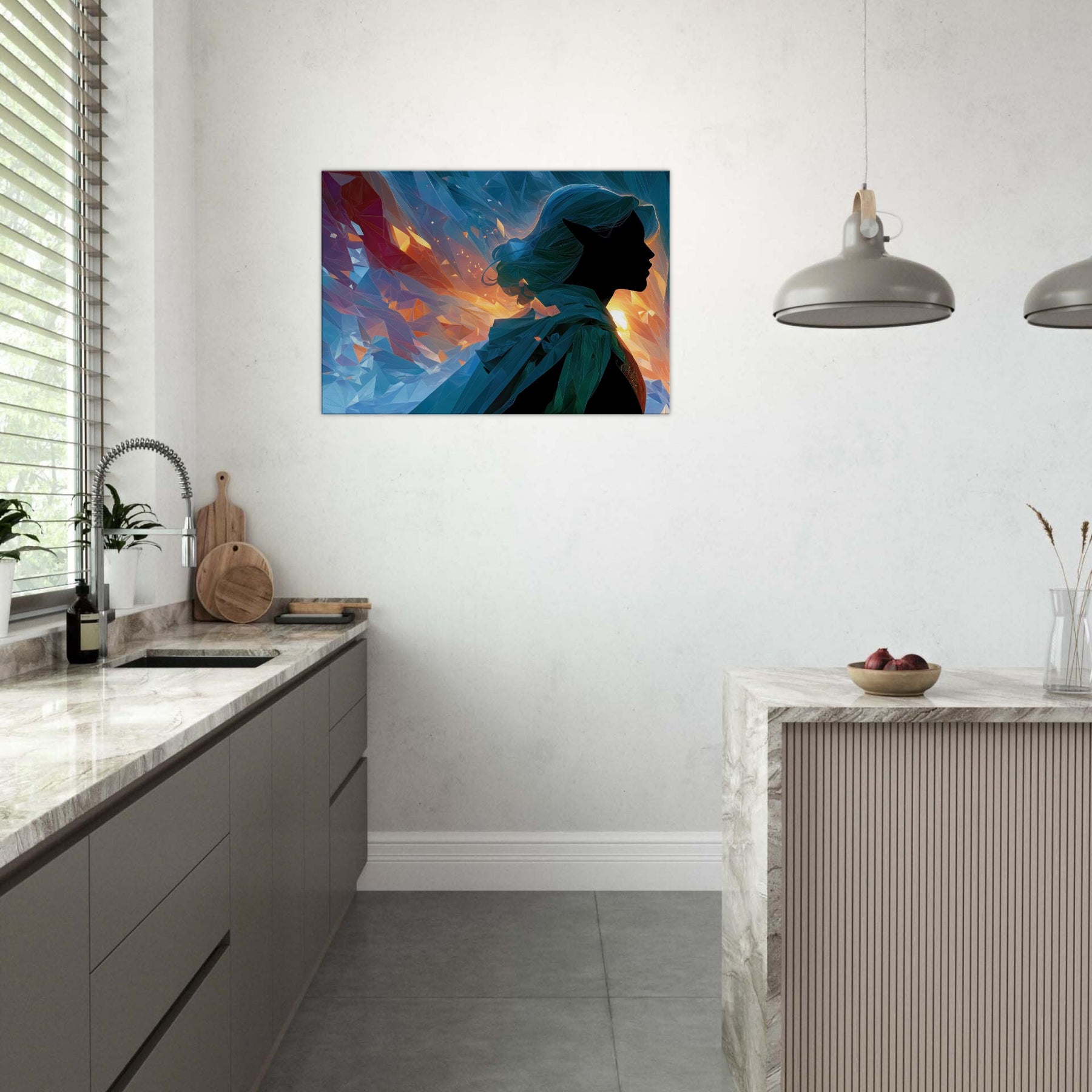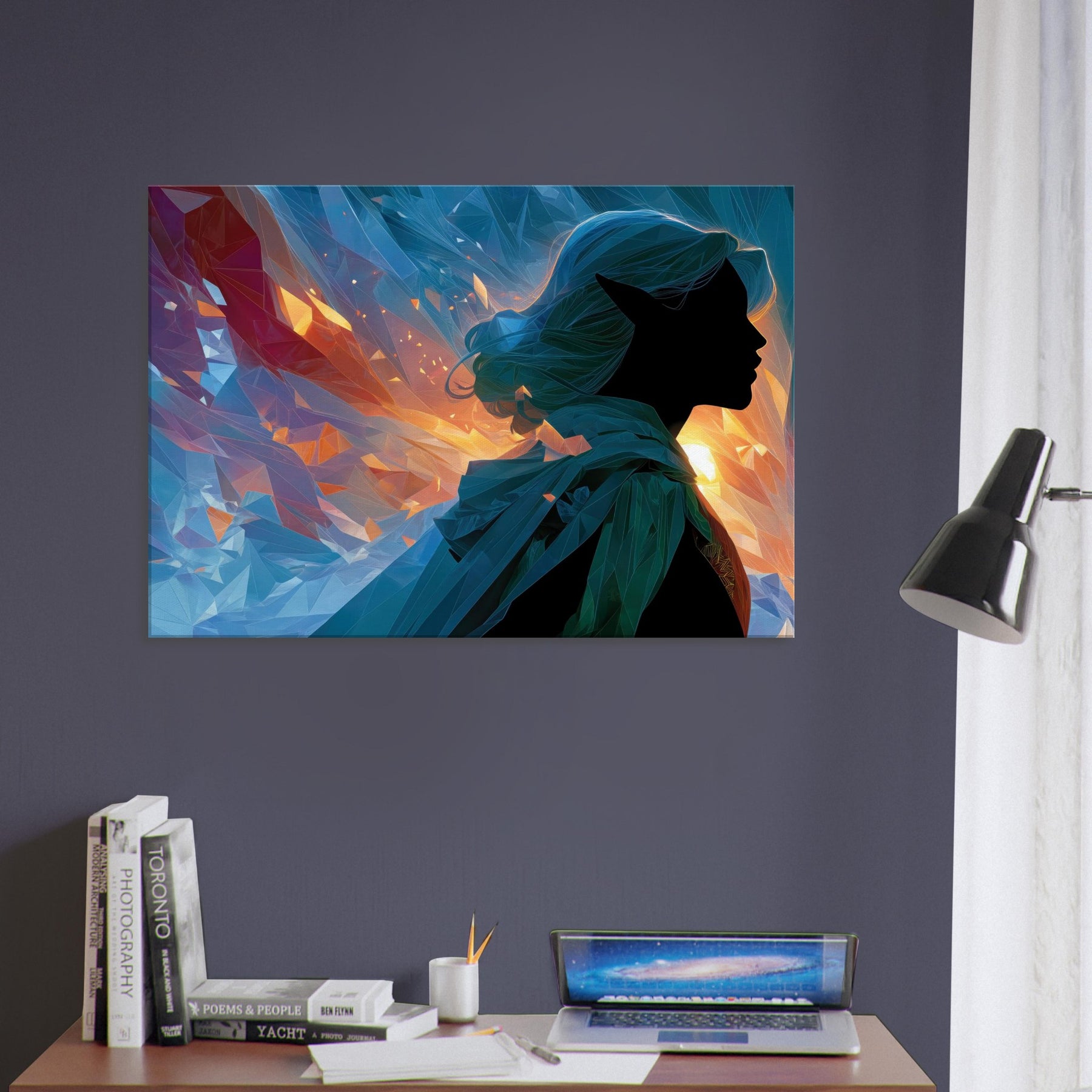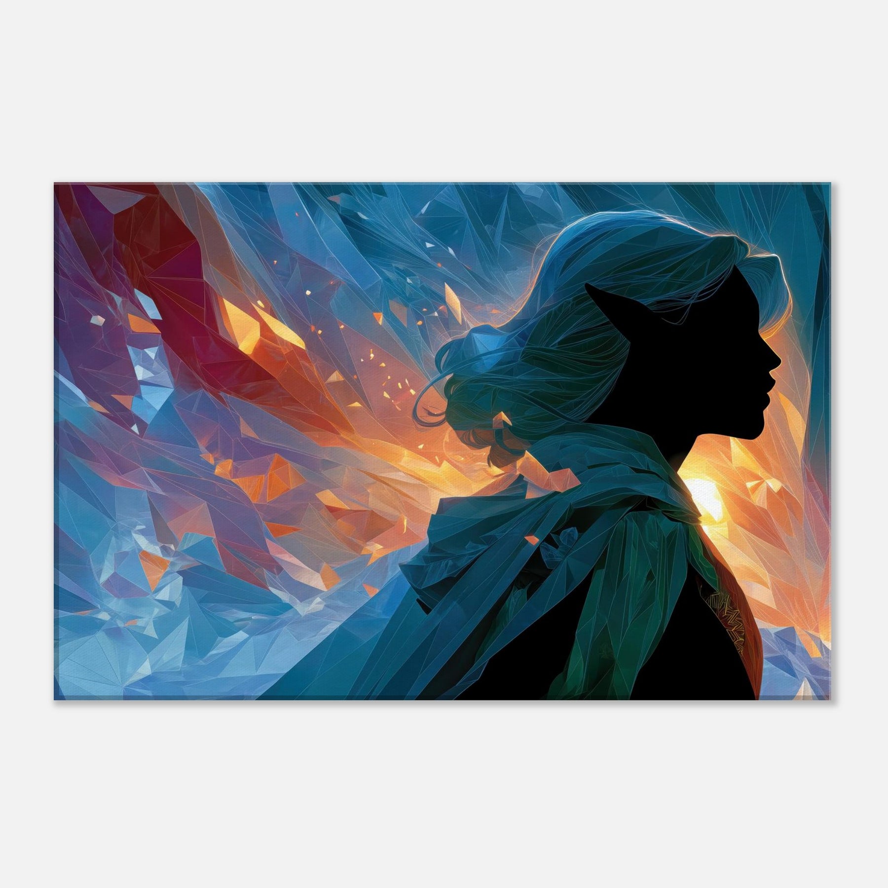 Let the Mystical Elf guiding silhouette drift into your room, where fiery golds meet cool blues in a whispering dance of light. This abstract composition gathers shards of color like memories of a dawn lit forest, inviting calm, curiosity, and a quiet sense of wonder. The glassy facets refract sunlit moments, casting shimmer across walls and cushions, turning any living space into a sanctuary for imagination. A striking focal point that balances mystery with serenity, it complements modern neutrals or bold palettes with timeless, ethereal charm.