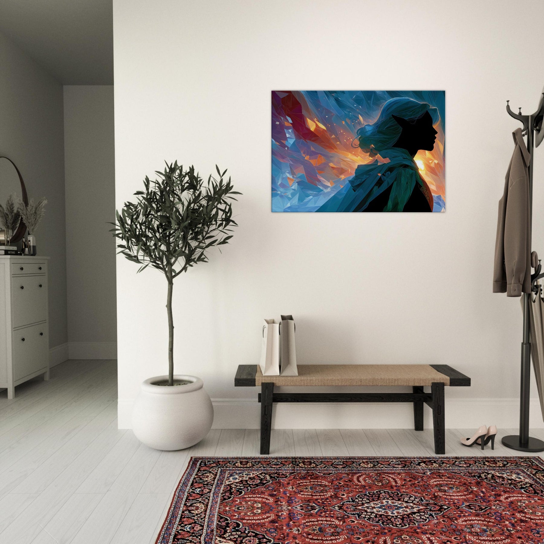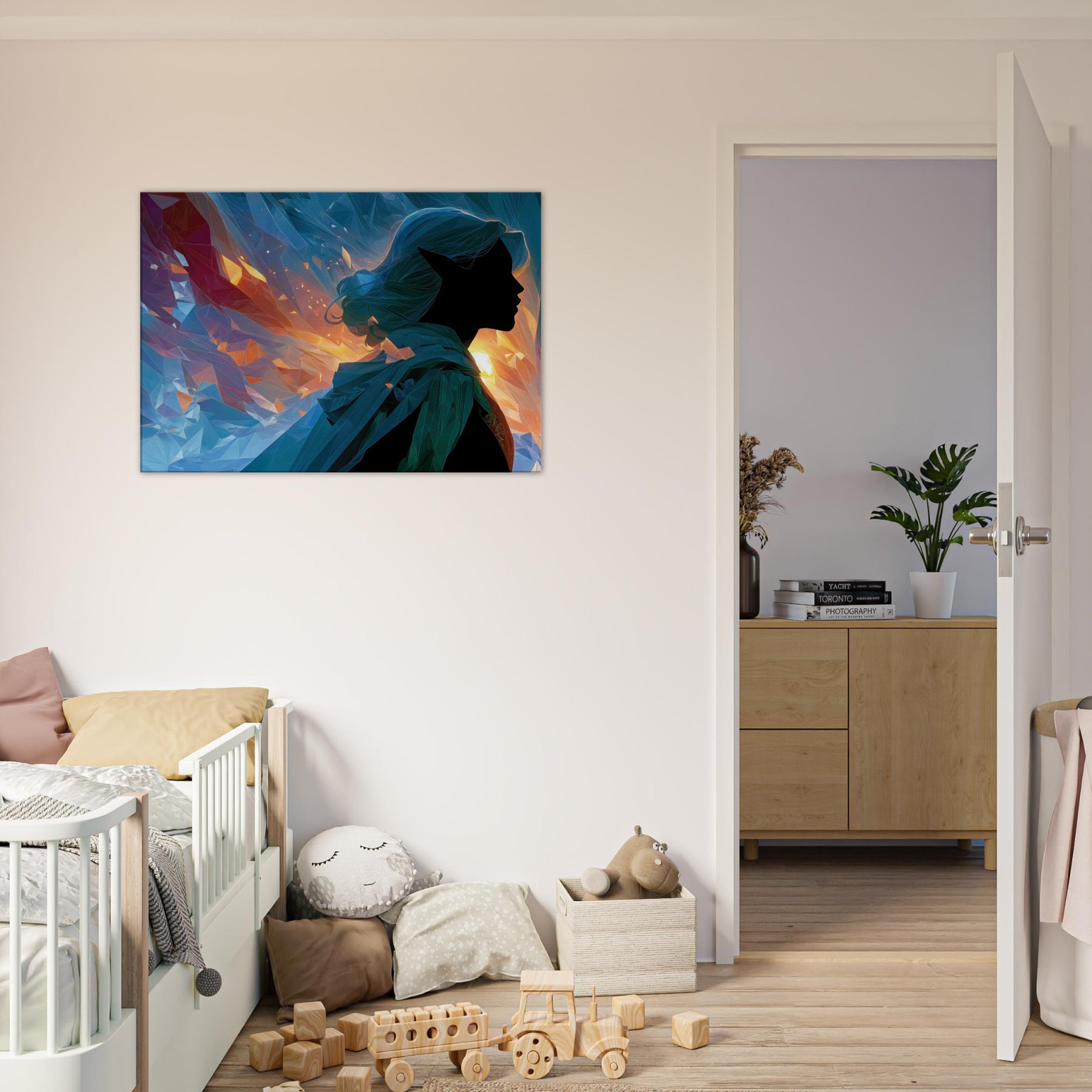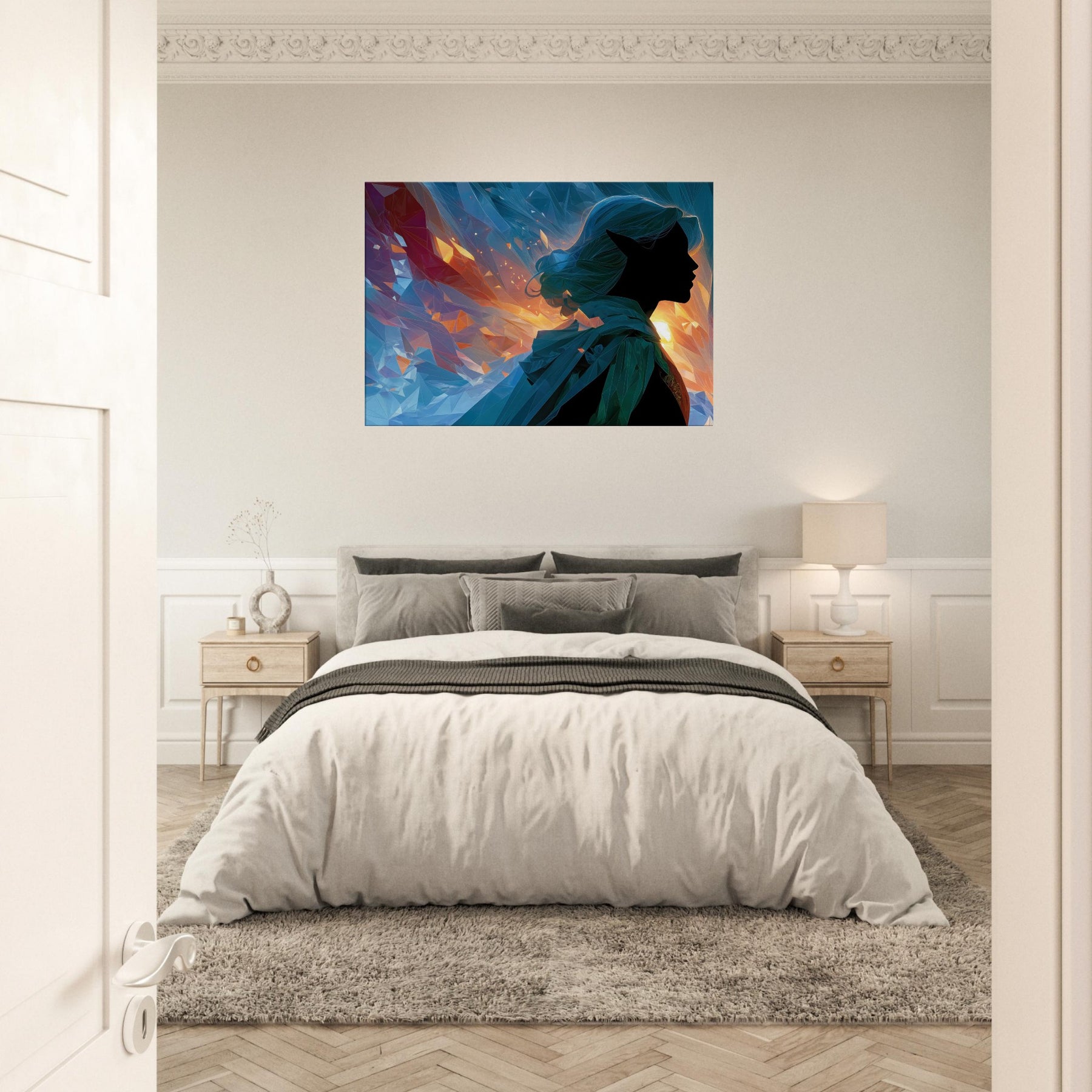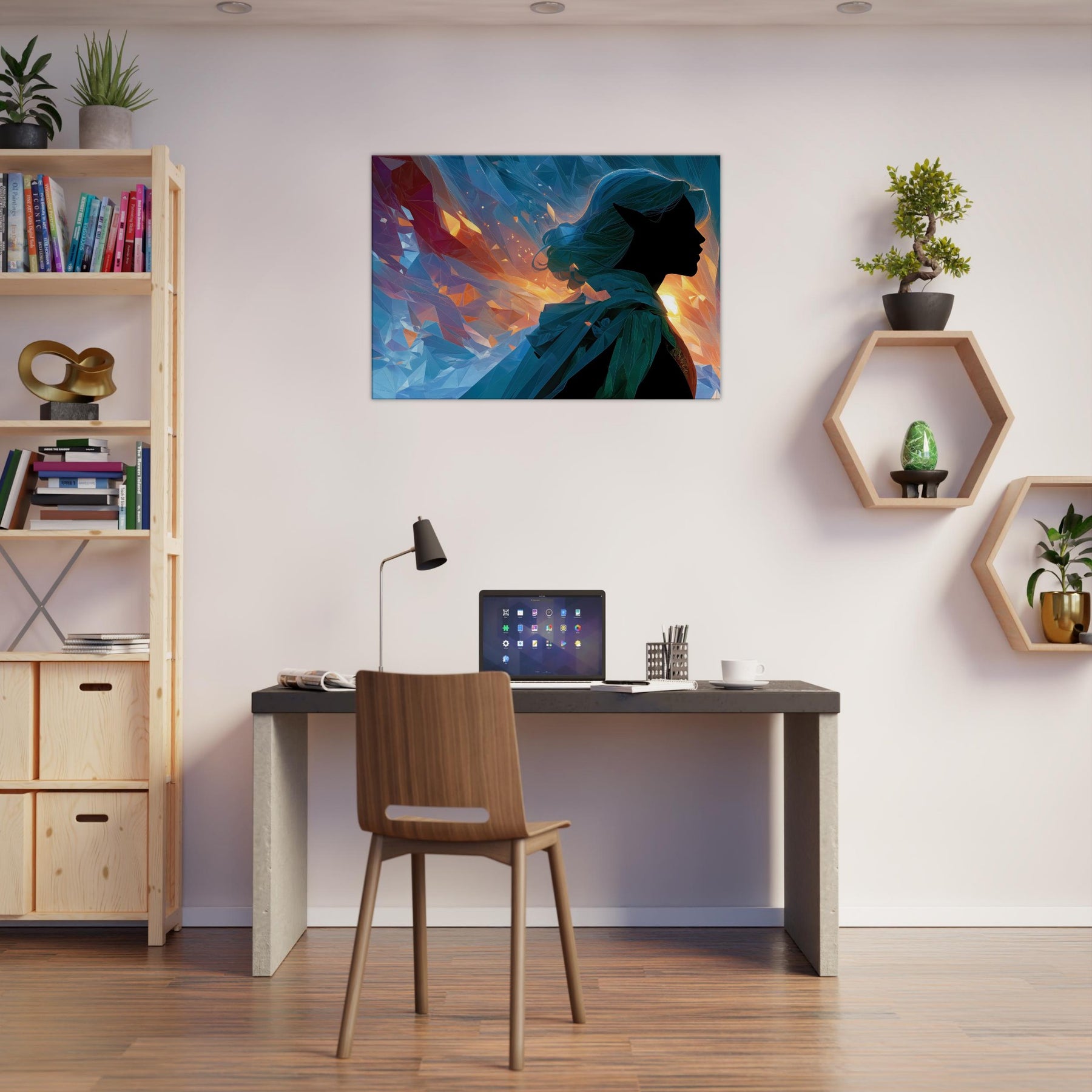 Let the Mystical Elf guiding silhouette drift into your room, where fiery golds meet cool blues in a whispering dance of light. This abstract composition gathers shards of color like memories of a dawn lit forest, inviting calm, curiosity, and a quiet sense of wonder. The glassy facets refract sunlit moments, casting shimmer across walls and cushions, turning any living space into a sanctuary for imagination. A striking focal point that balances mystery with serenity, it complements modern neutrals or bold palettes with timeless, ethereal charm.
