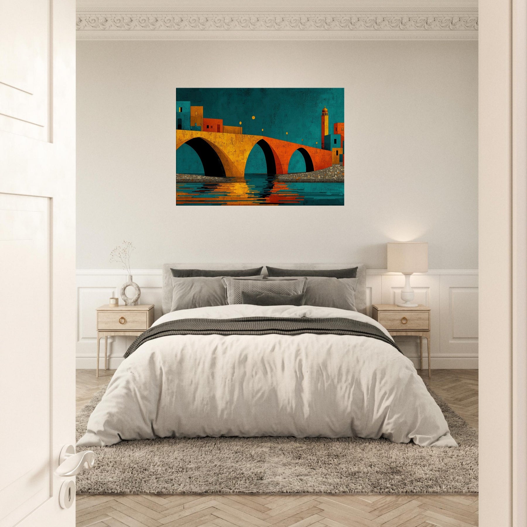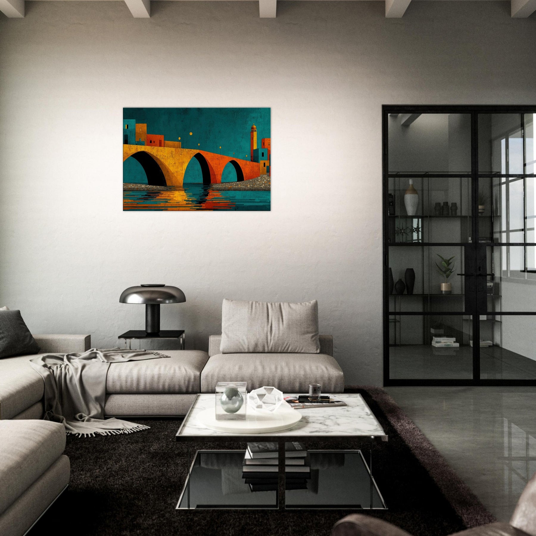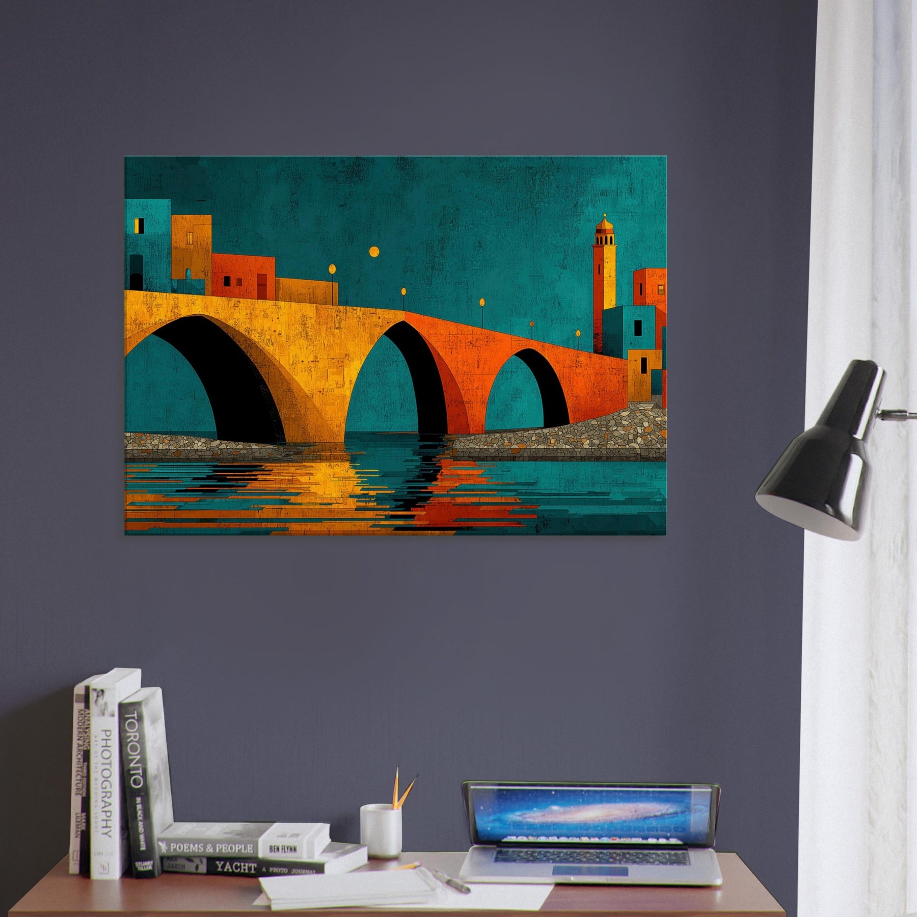 Arched Stone Bridge sweeps across a dreamlike river, rendered in bold blocks of teal, orange, and stone. This abstract view carries a quiet, cinematic rhythm that lingers in the room; you can feel the cool water, the warmth of sunlit bricks, and the pulse of distant lamps. It elevates a living space with color and texture, inviting lingered glances and imagined travels. The composition's airy arches and reflective surface turn walls into a harbor of calm energy an urban moment you can live with, night after night.