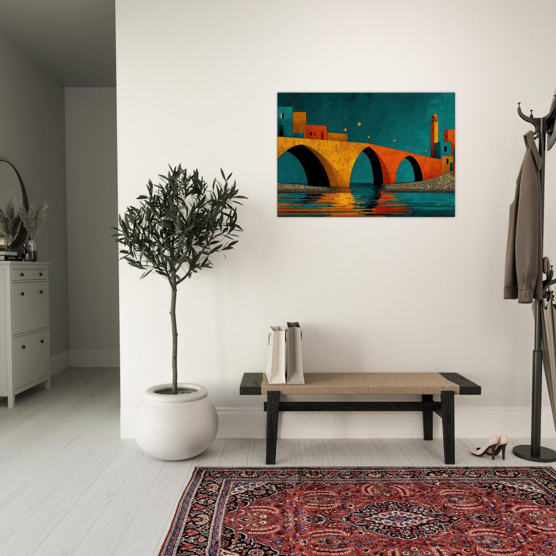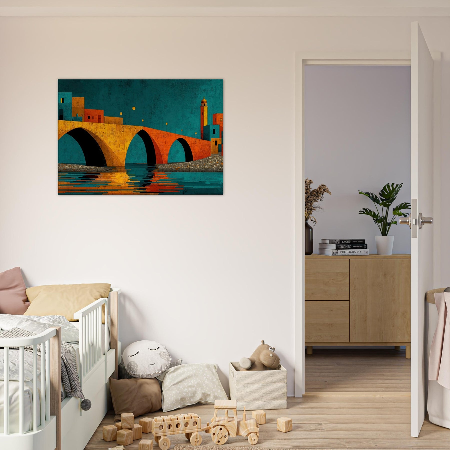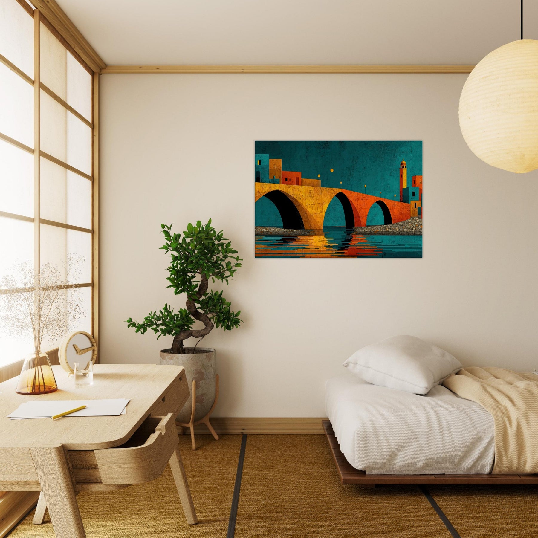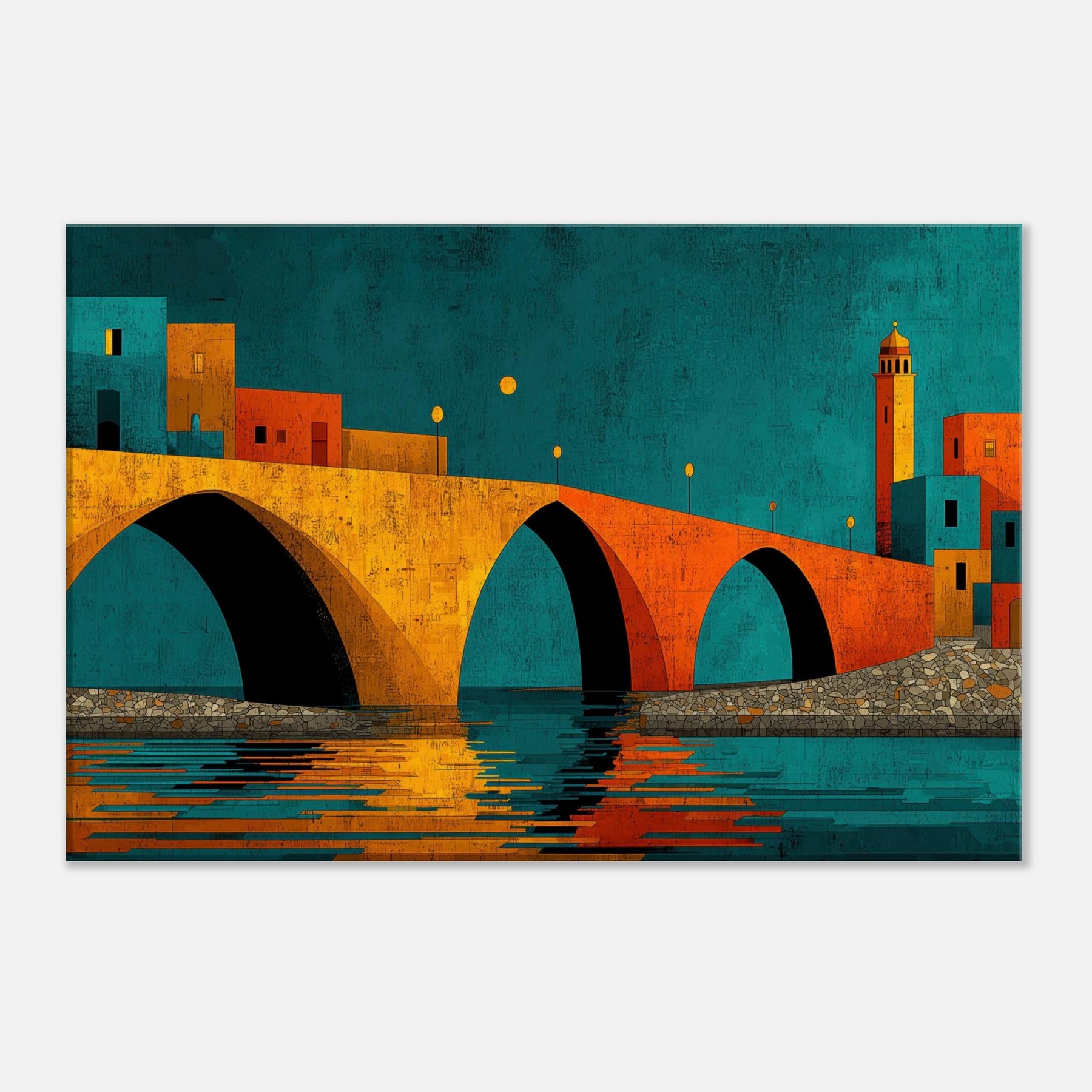 Arched Stone Bridge sweeps across a dreamlike river, rendered in bold blocks of teal, orange, and stone. This abstract view carries a quiet, cinematic rhythm that lingers in the room; you can feel the cool water, the warmth of sunlit bricks, and the pulse of distant lamps. It elevates a living space with color and texture, inviting lingered glances and imagined travels. The composition's airy arches and reflective surface turn walls into a harbor of calm energy an urban moment you can live with, night after night.