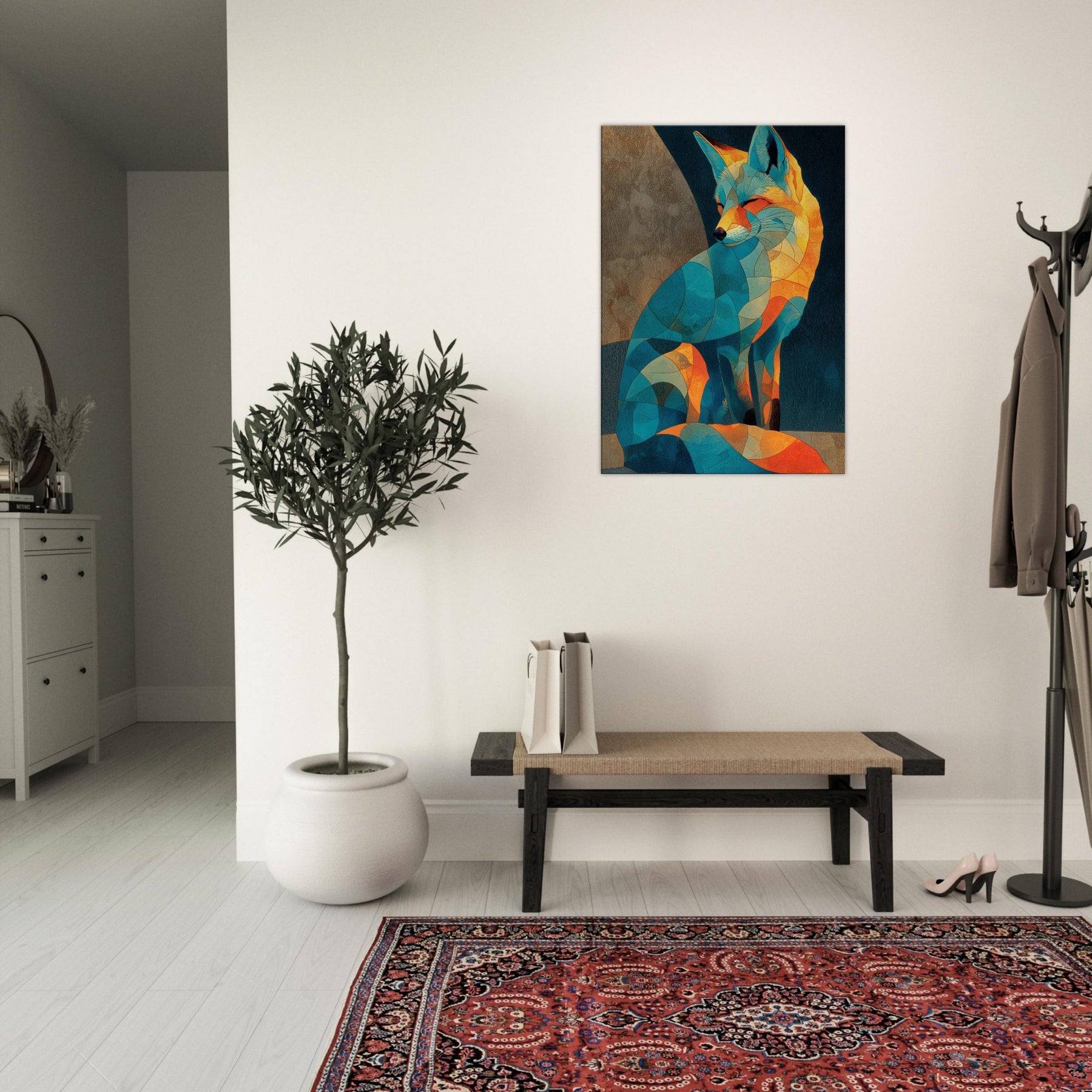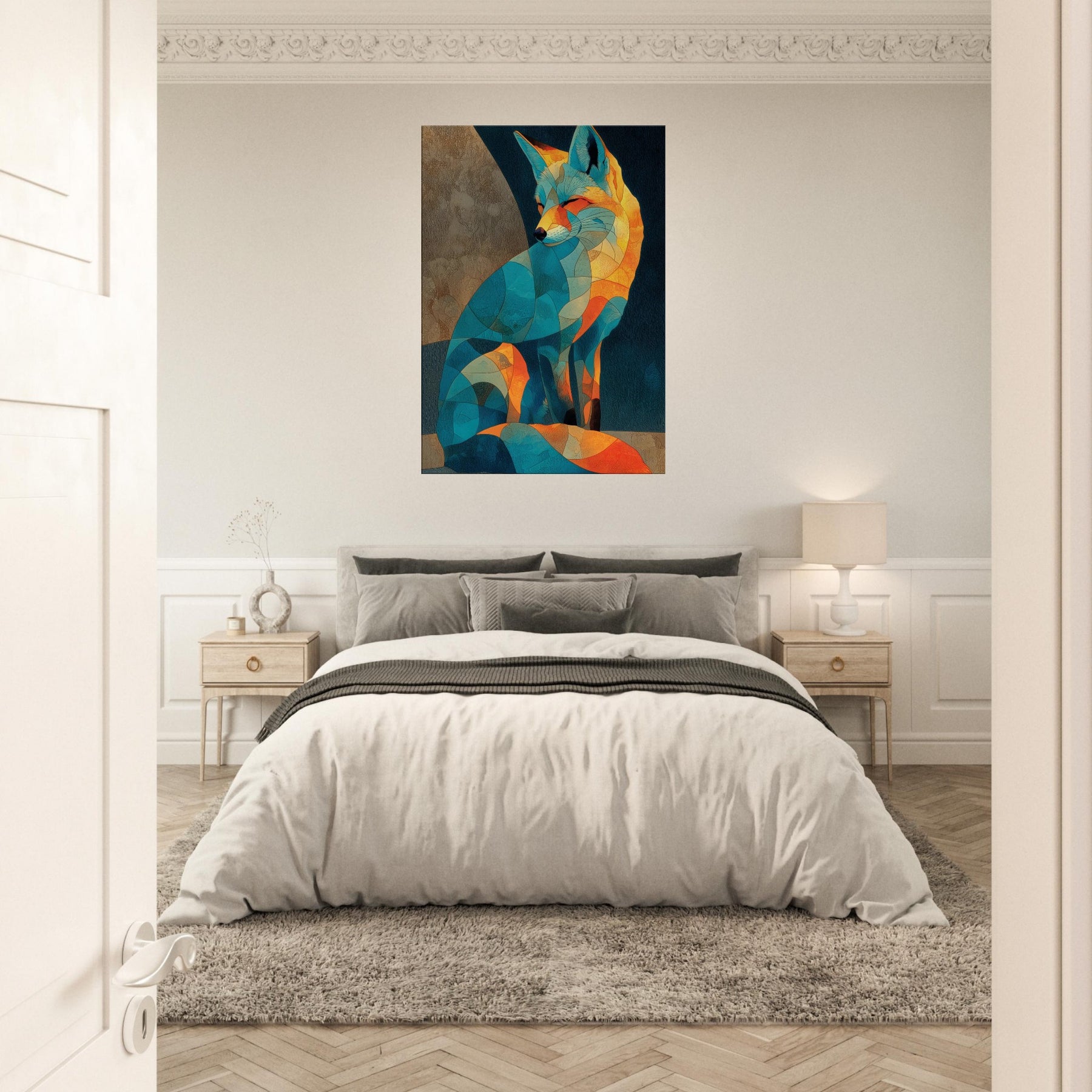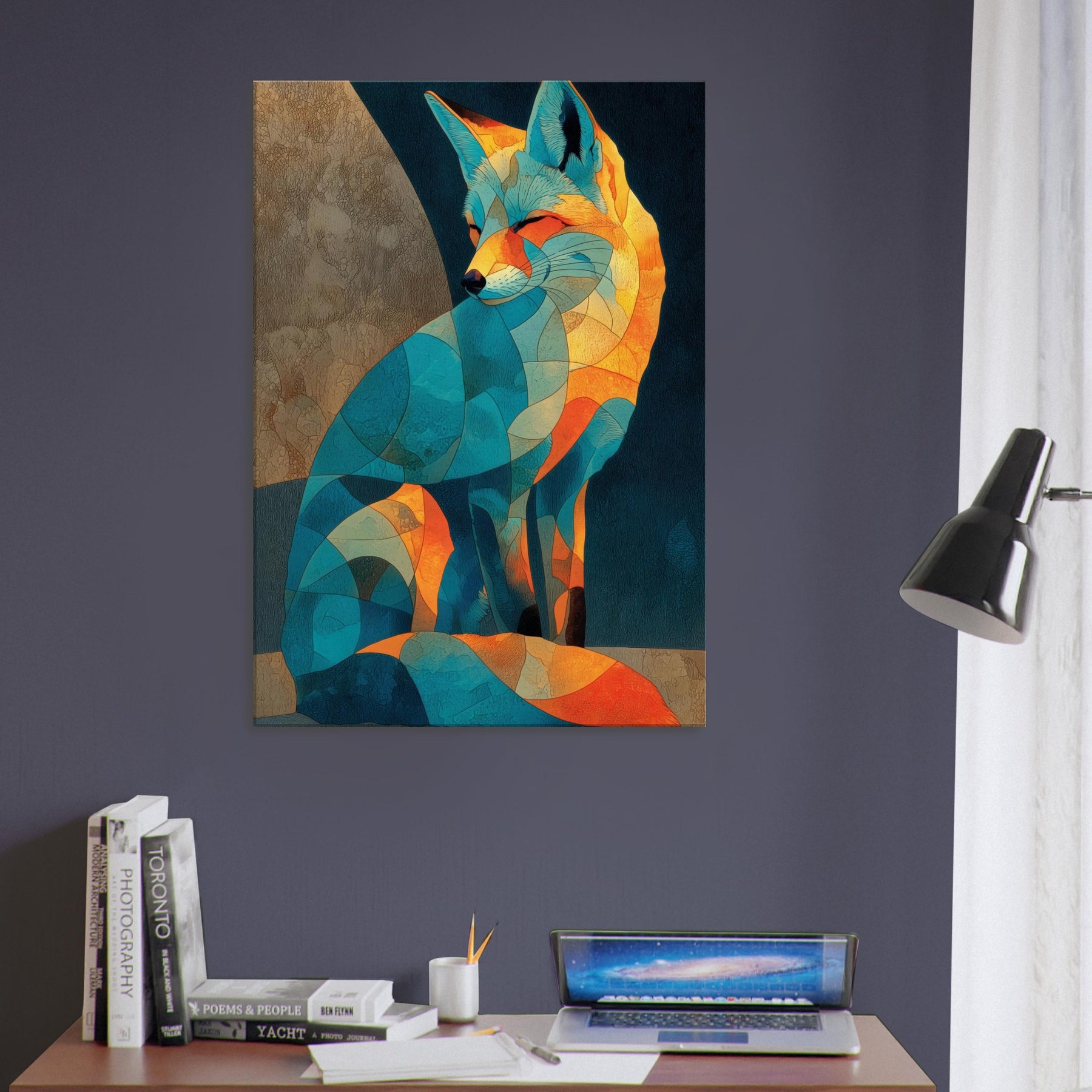 Let the Kitsune glow fill your space with quiet, shifting light. This abstract celebration of a fox spirit dissolves form into luminous panels of blue and amber, like twilight glass and moonlit fire. The result is a sensation of motion and mystery that makes a living room feel larger, calmer, and more magnetic. Hang it where conversation lingers above a sofa, in a hallway, or near a reading nook and let the fox's patient grace invite curiosity, warmth, and dreamlike wonder. The central subject is Kitsune (Fox Spirit).