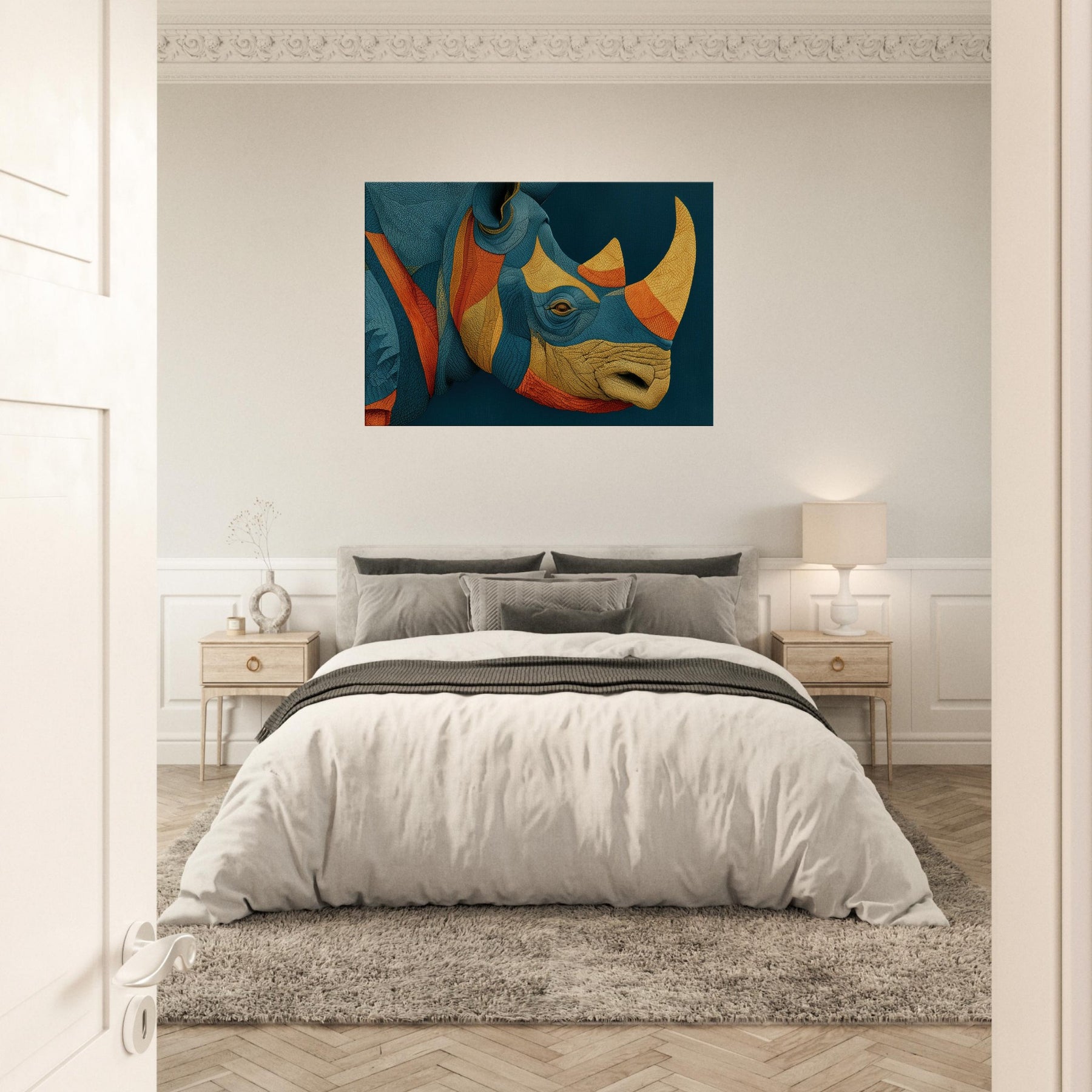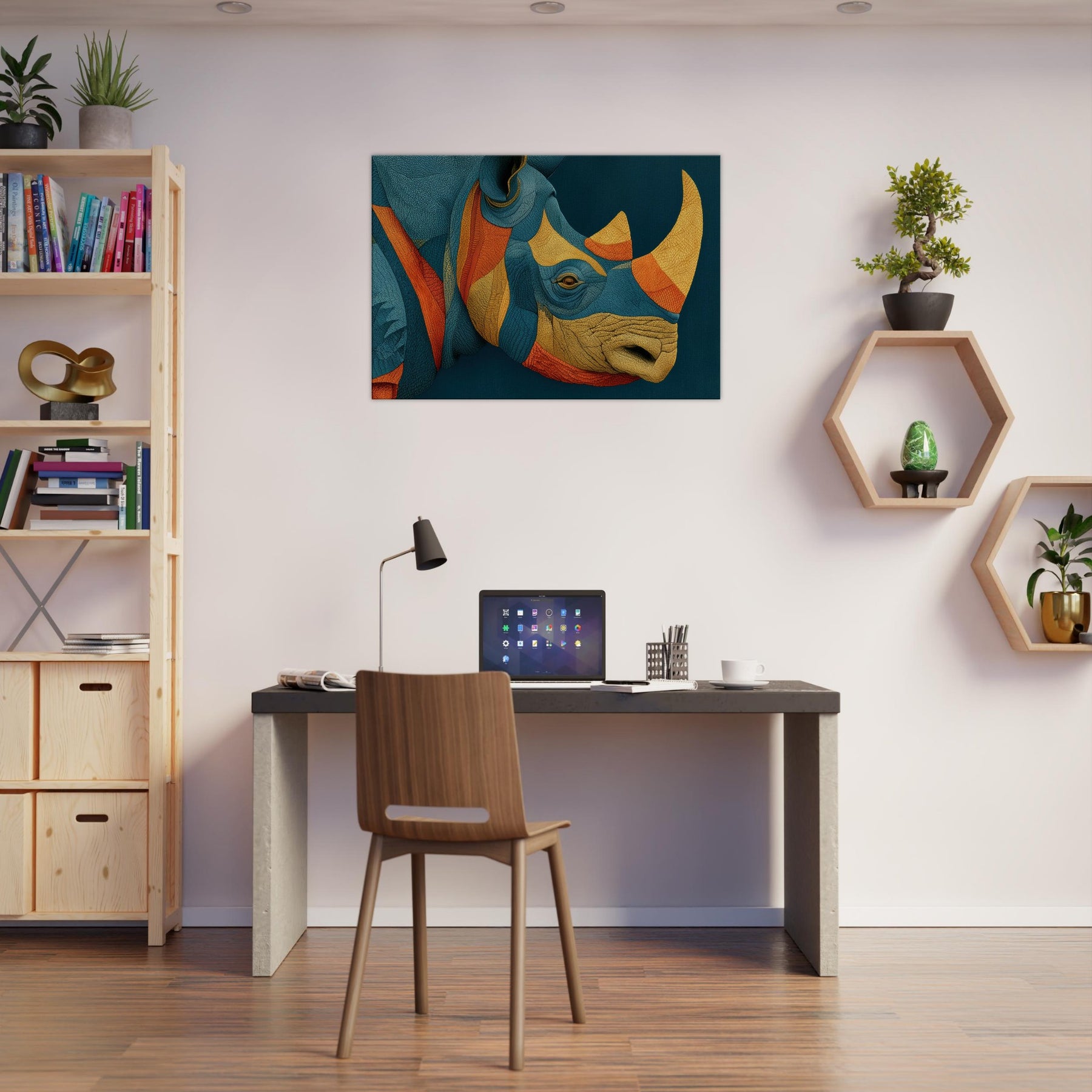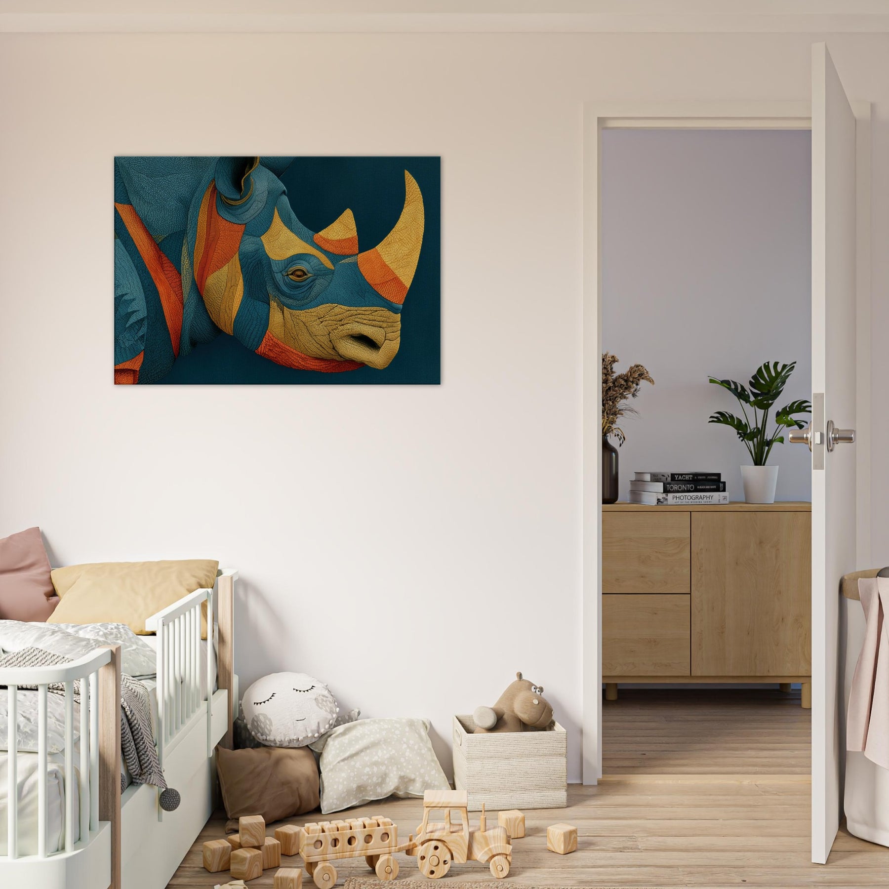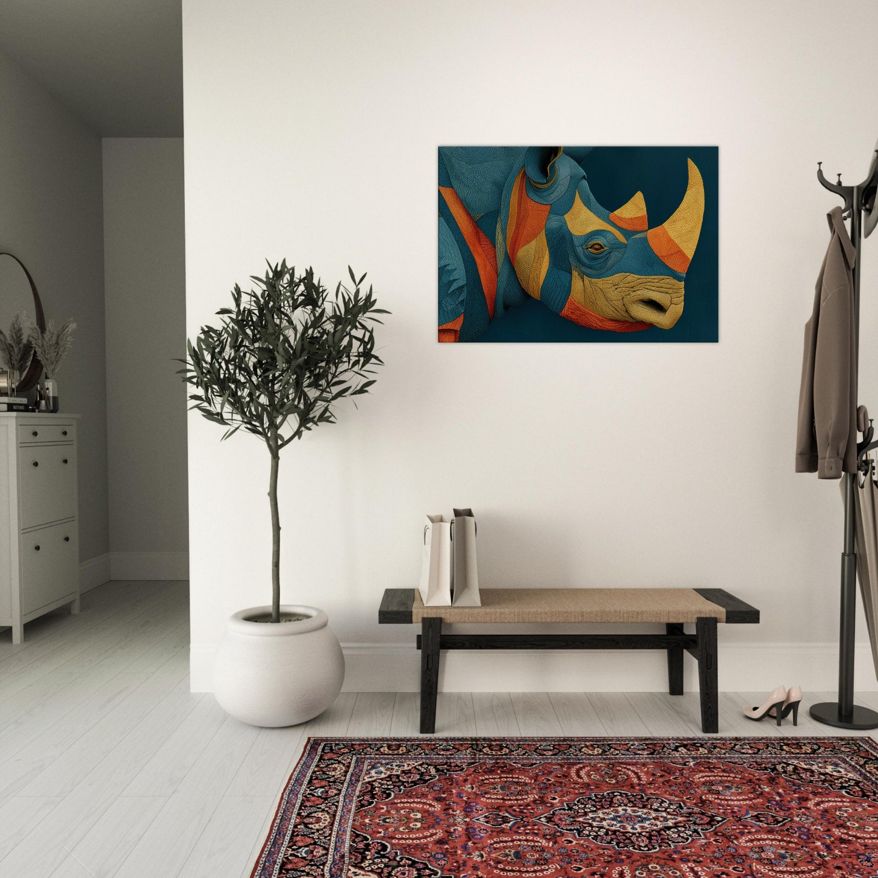 This bold composition centers a Rhinoceros rendered in a mosaic of teal, gold, and coral a quiet storm of color that breathes with life. The textured planes shimmer with warmth and depth, inviting the eye to travel along each crack and contour as if tracing a heartbeat. In a living room, it becomes a sculptural focal point a mood altering presence that blends serenity and energy, turning ordinary walls into a chamber of contemplation and unexpected joy.