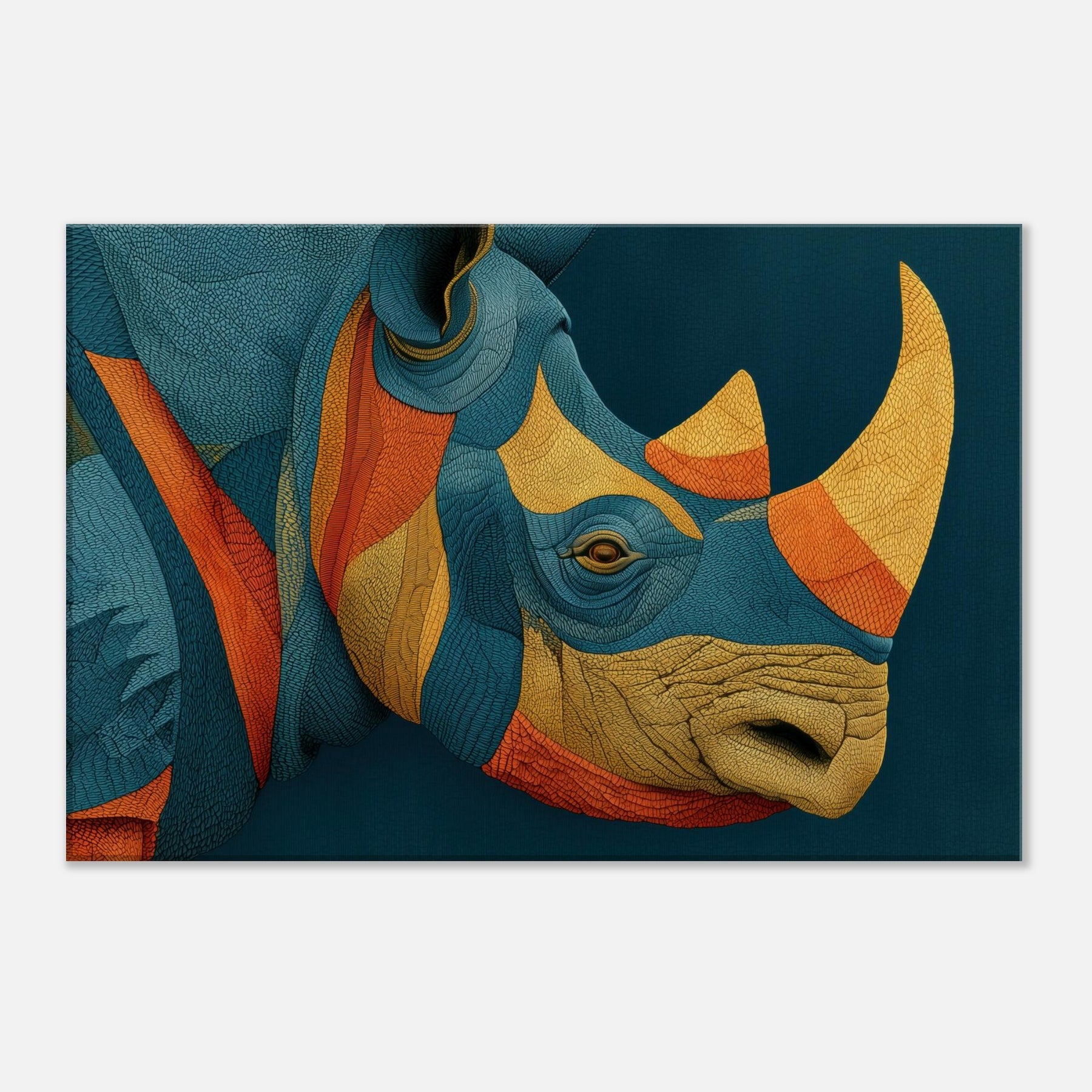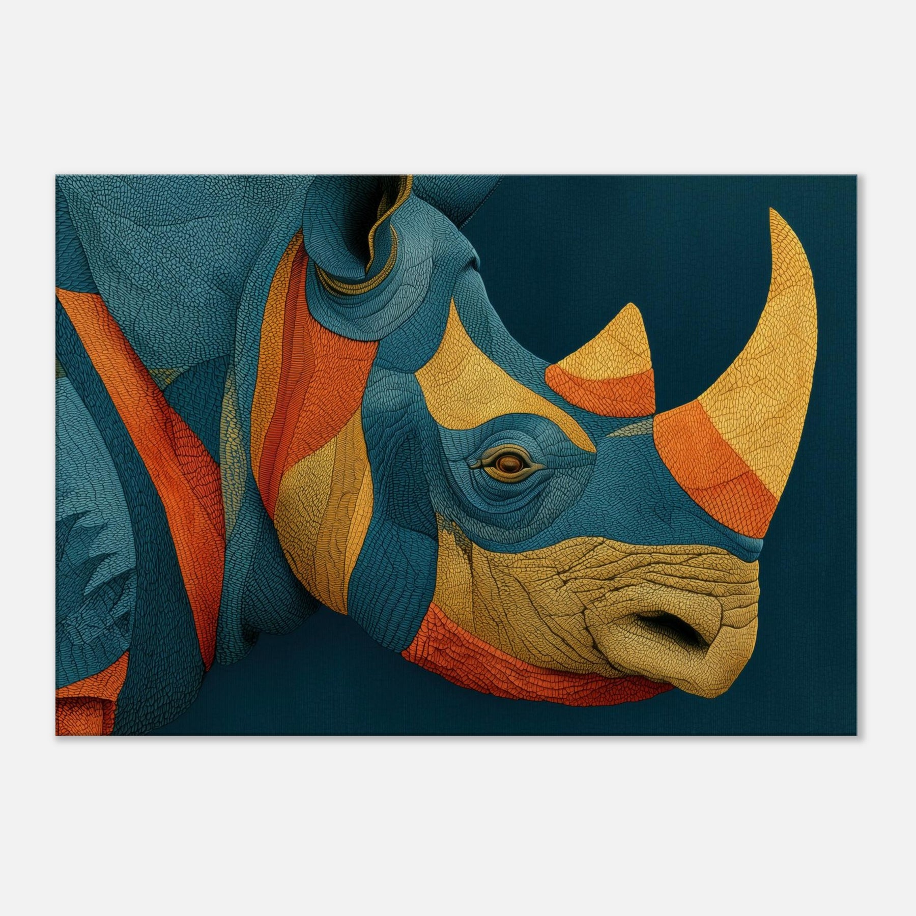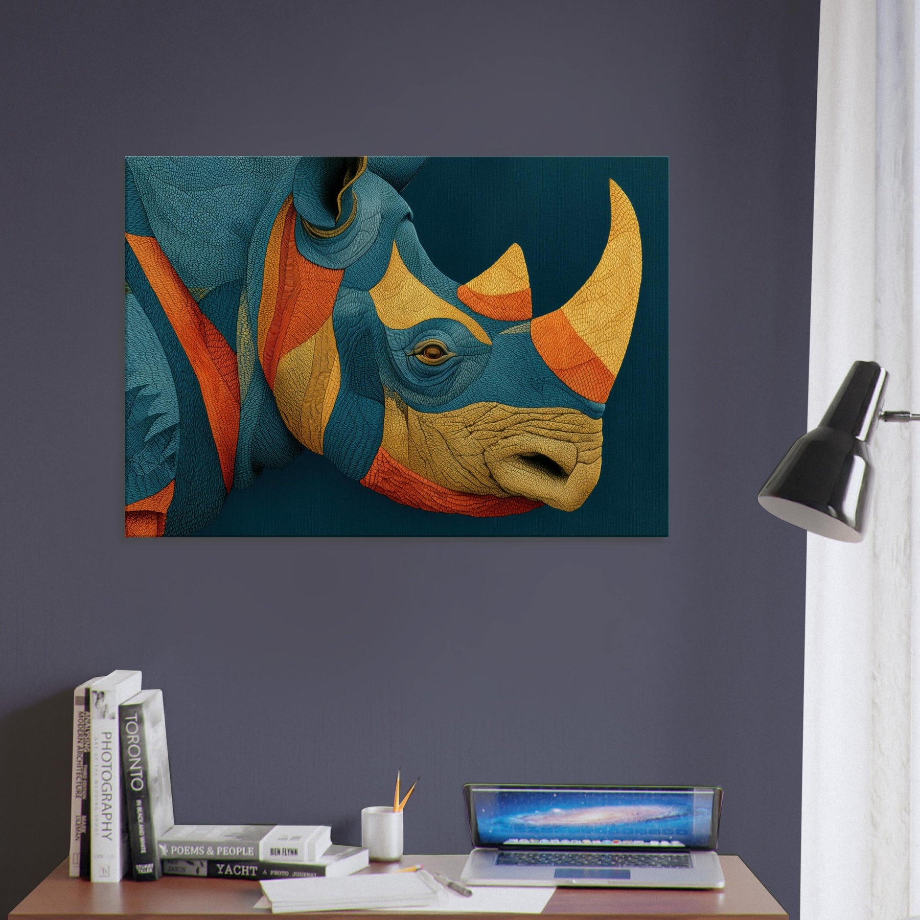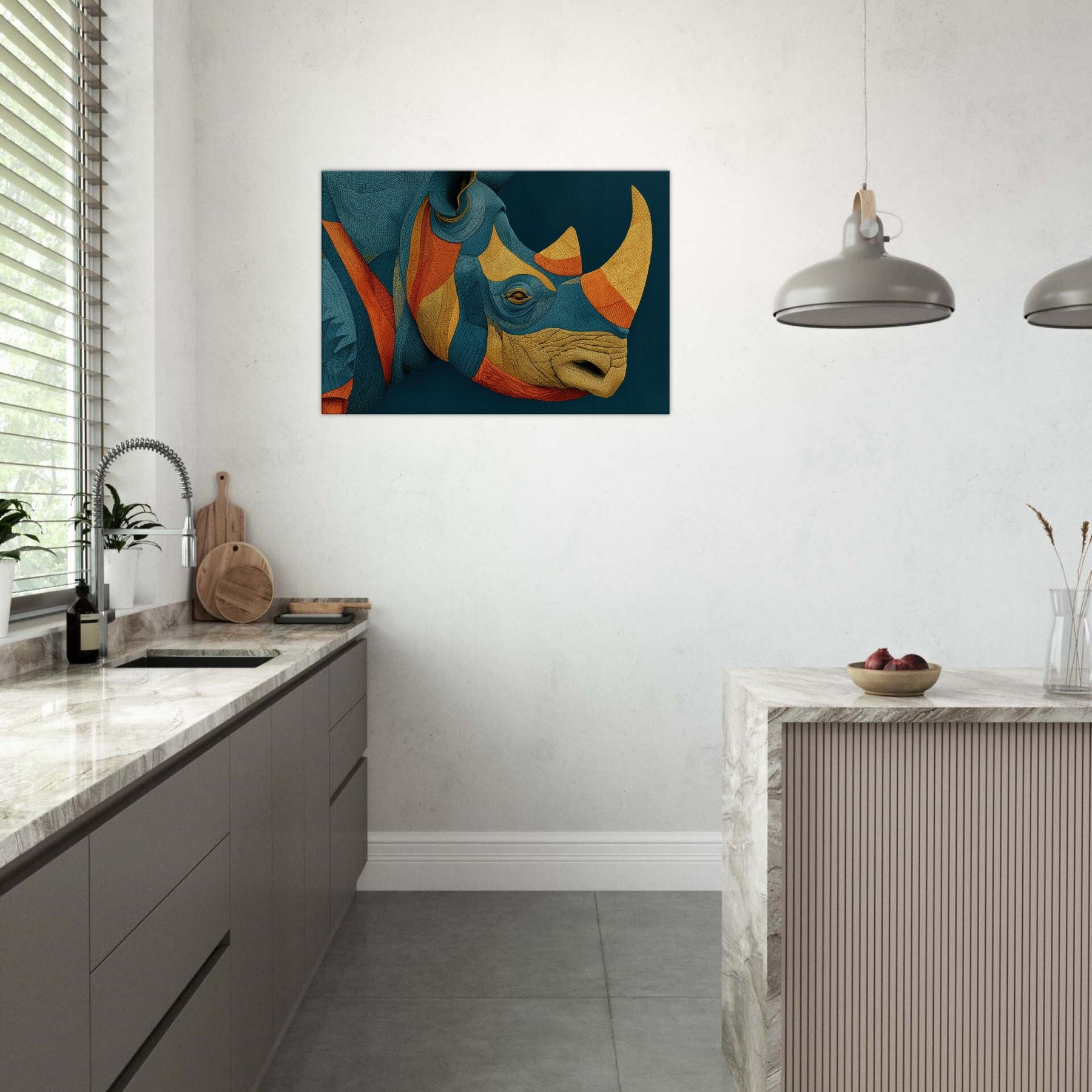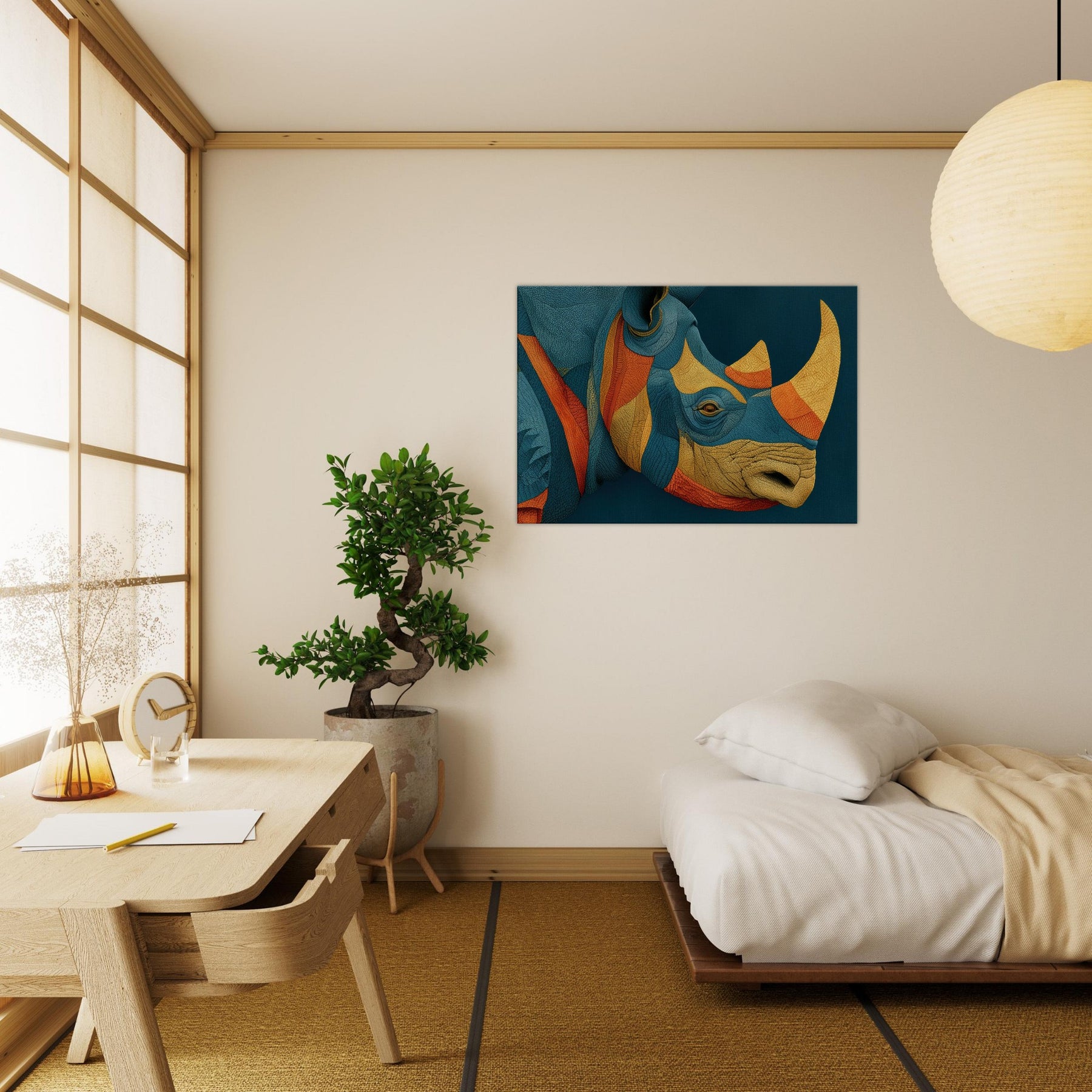 This bold composition centers a Rhinoceros rendered in a mosaic of teal, gold, and coral a quiet storm of color that breathes with life. The textured planes shimmer with warmth and depth, inviting the eye to travel along each crack and contour as if tracing a heartbeat. In a living room, it becomes a sculptural focal point a mood altering presence that blends serenity and energy, turning ordinary walls into a chamber of contemplation and unexpected joy.