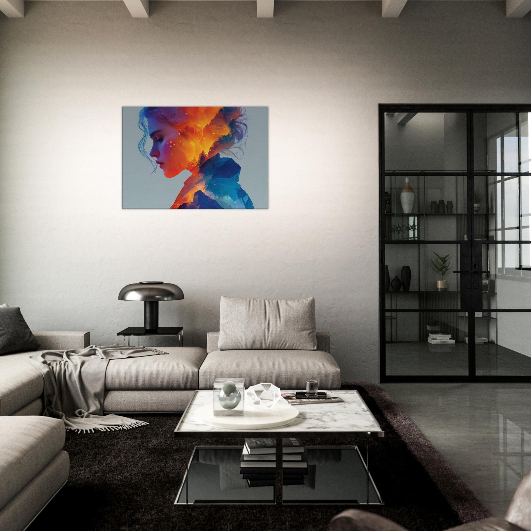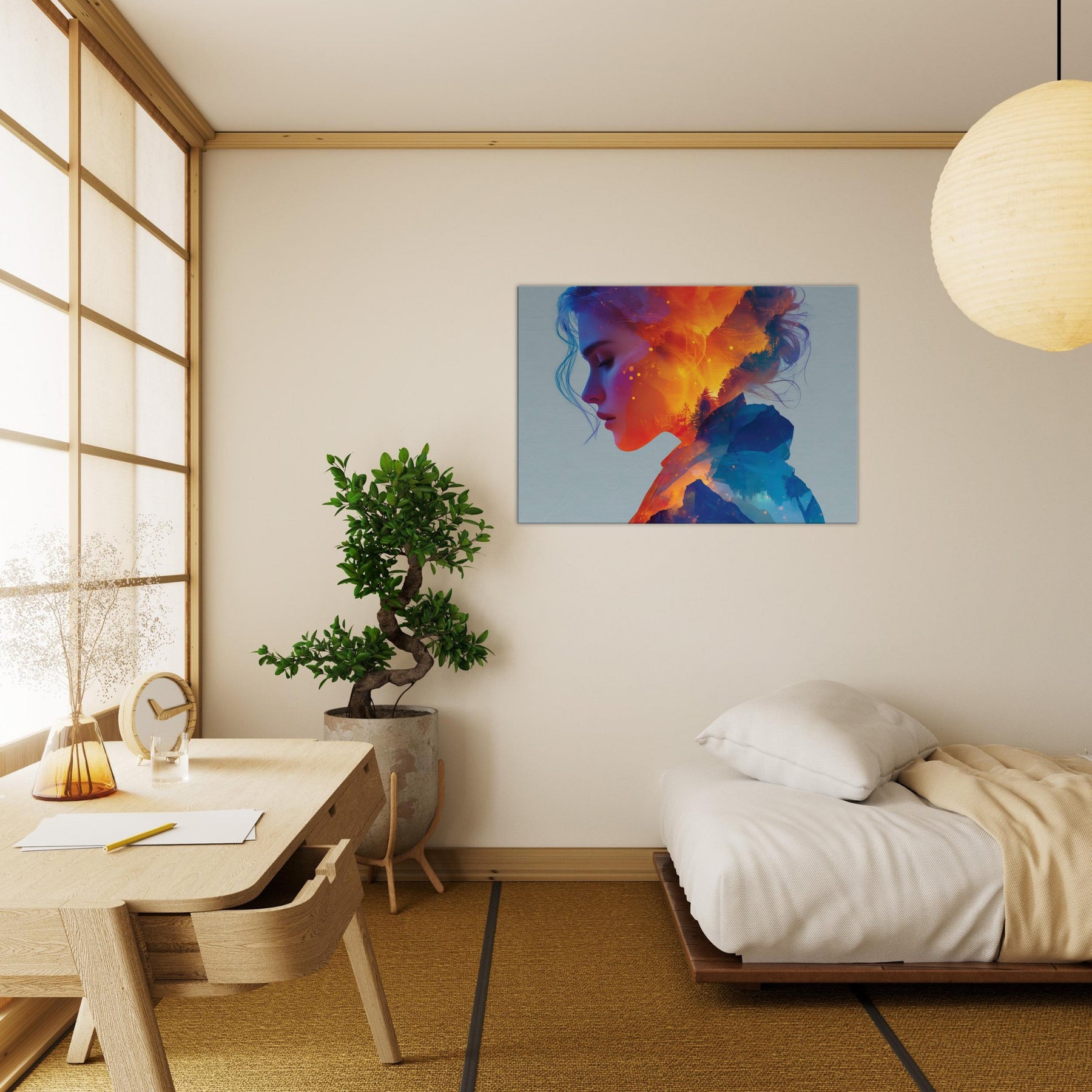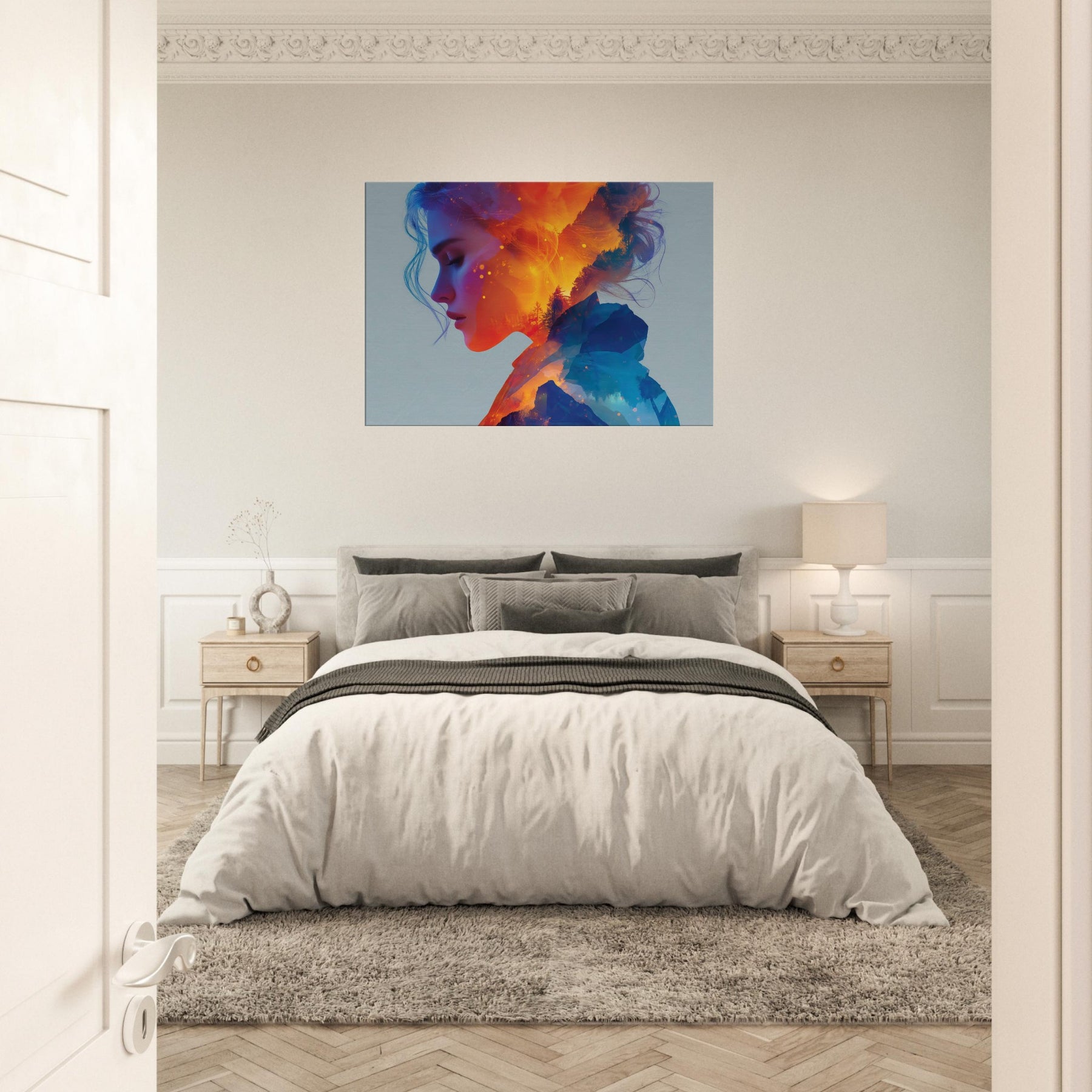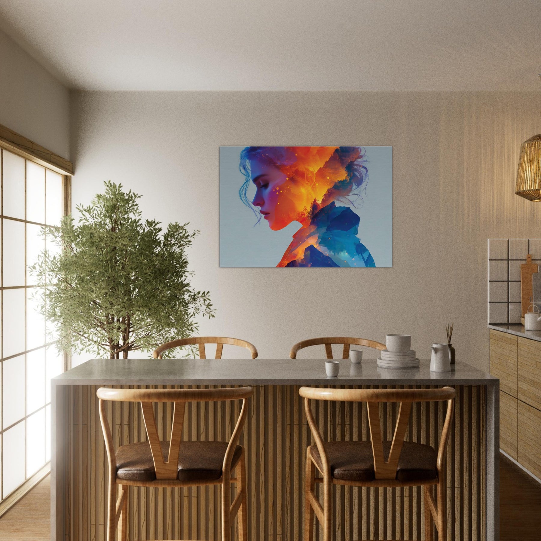 A luminous meditation in color, this piece centers the Female Silhouette as a quiet, living presence. Abstract layers fold like a dream, merging firelight and frost into a single, breathing form. The warm oranges and electric blues evoke dawn and dusk, while delicate specks hint at starlit thoughts. Hung in a sunlit hallway or a serene bedroom, it invites the eye to linger, widening the room's atmosphere with texture, movement, and intimate grace.