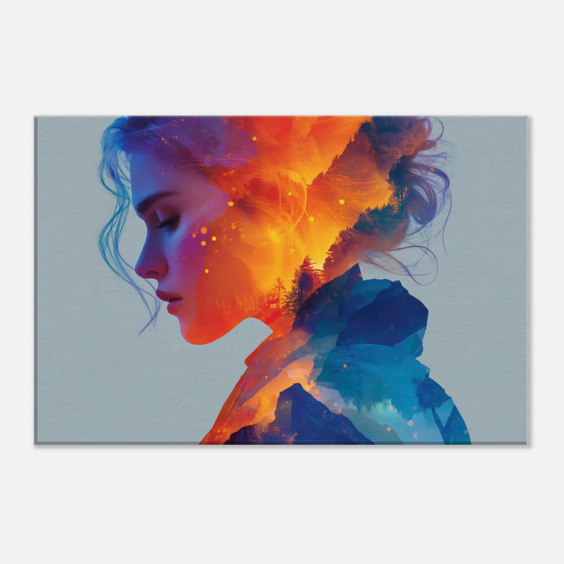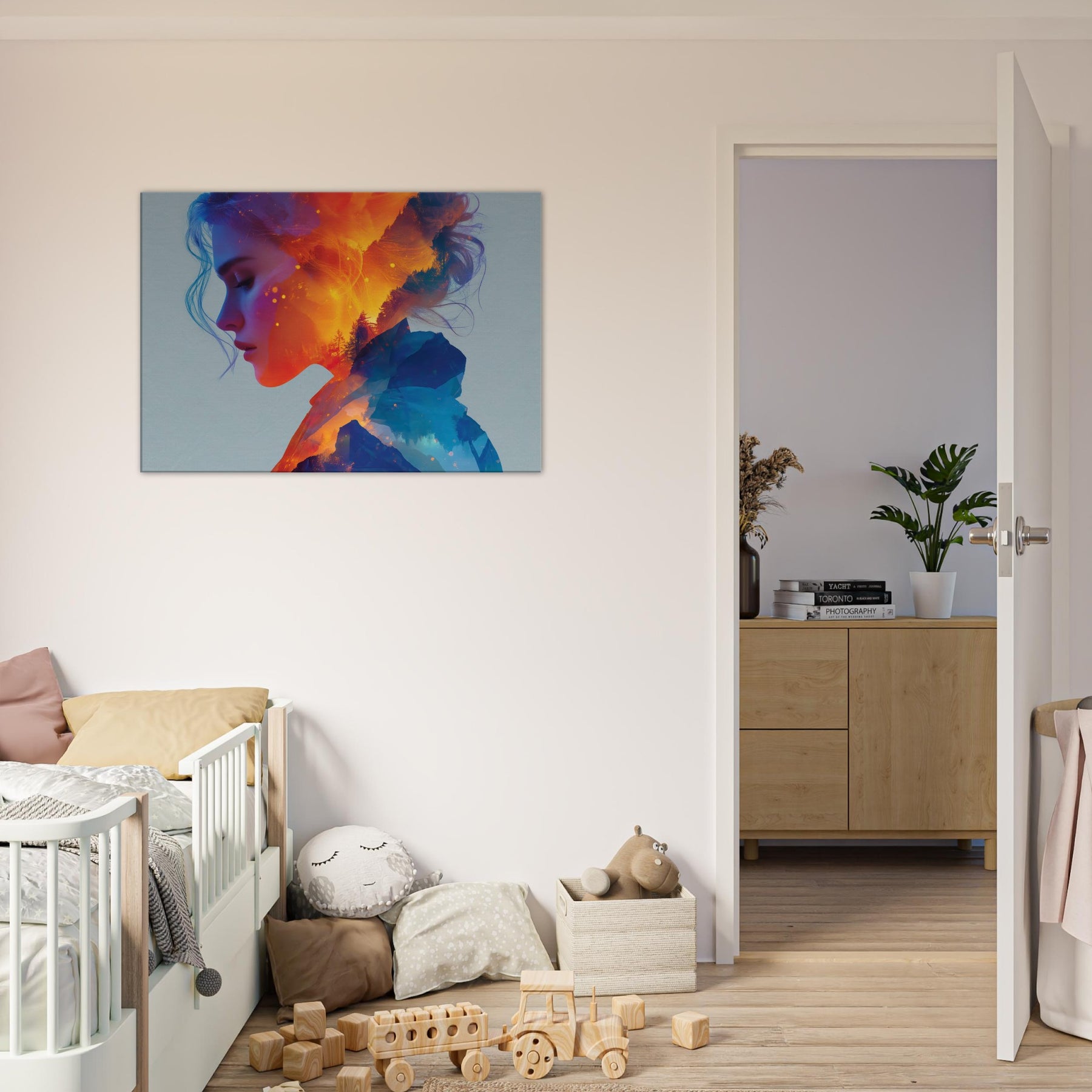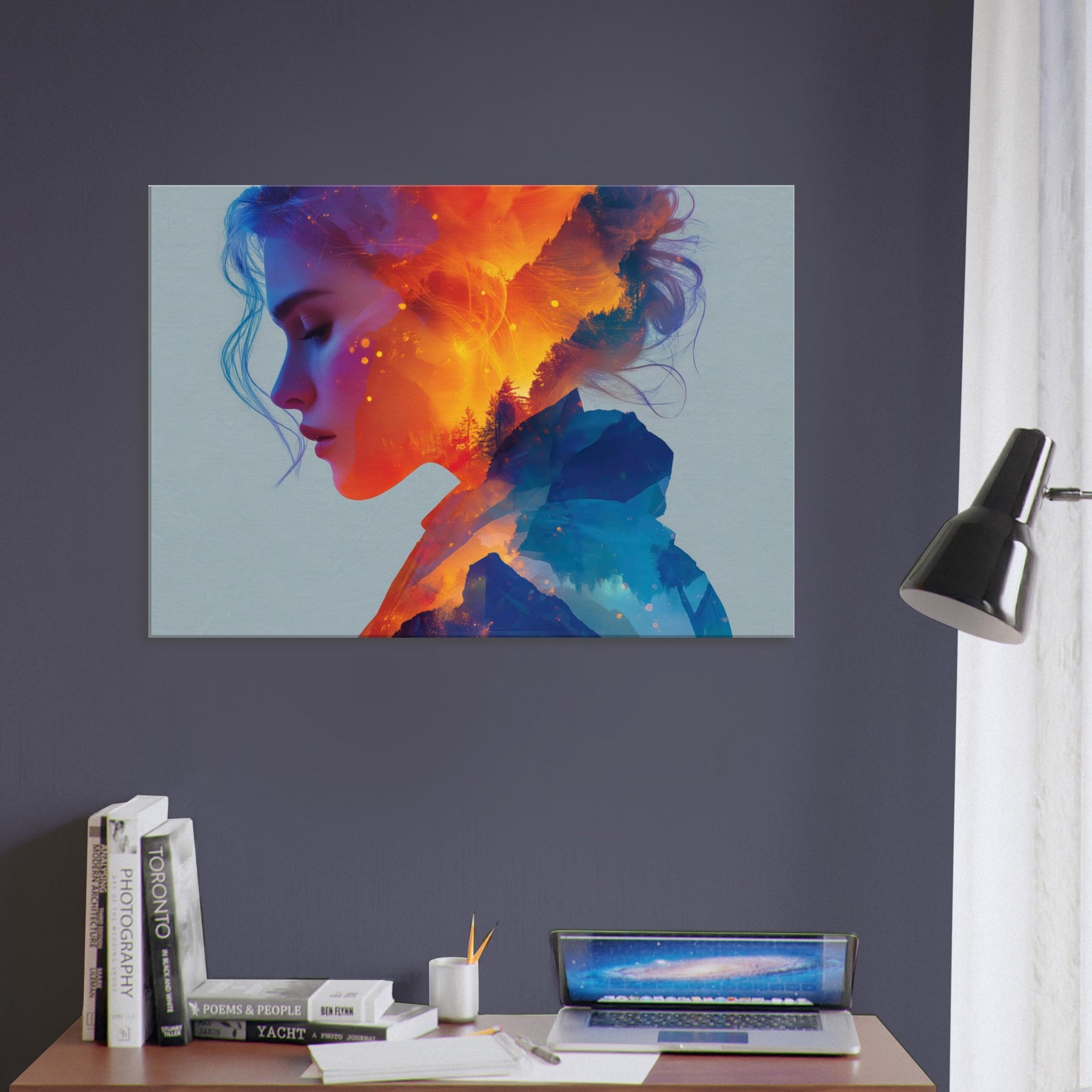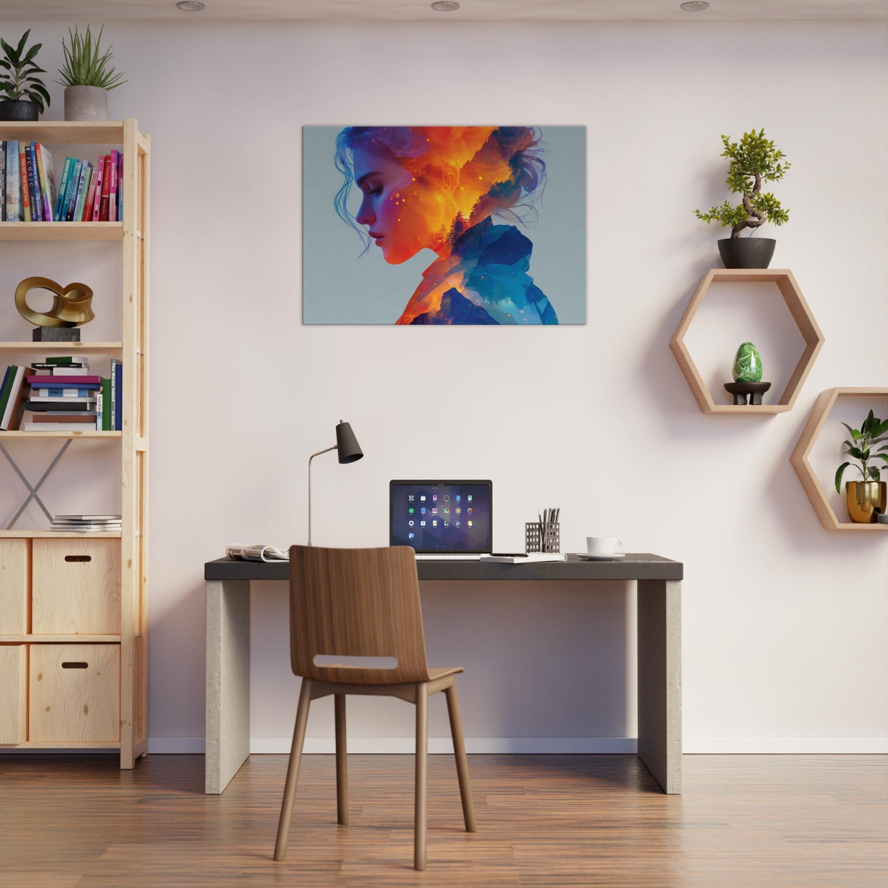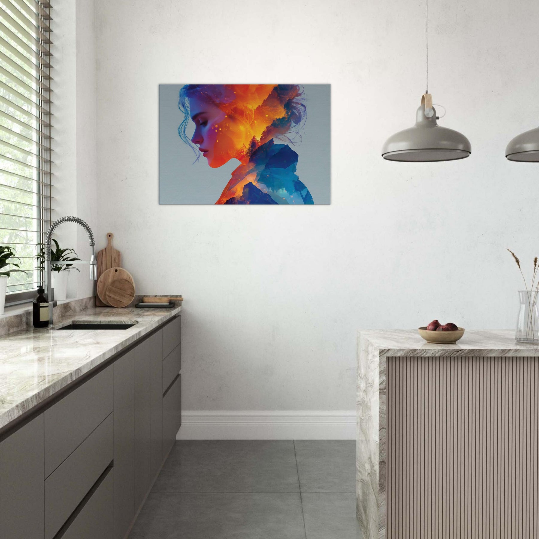A luminous meditation in color, this piece centers the Female Silhouette as a quiet, living presence. Abstract layers fold like a dream, merging firelight and frost into a single, breathing form. The warm oranges and electric blues evoke dawn and dusk, while delicate specks hint at starlit thoughts. Hung in a sunlit hallway or a serene bedroom, it invites the eye to linger, widening the room's atmosphere with texture, movement, and intimate grace.