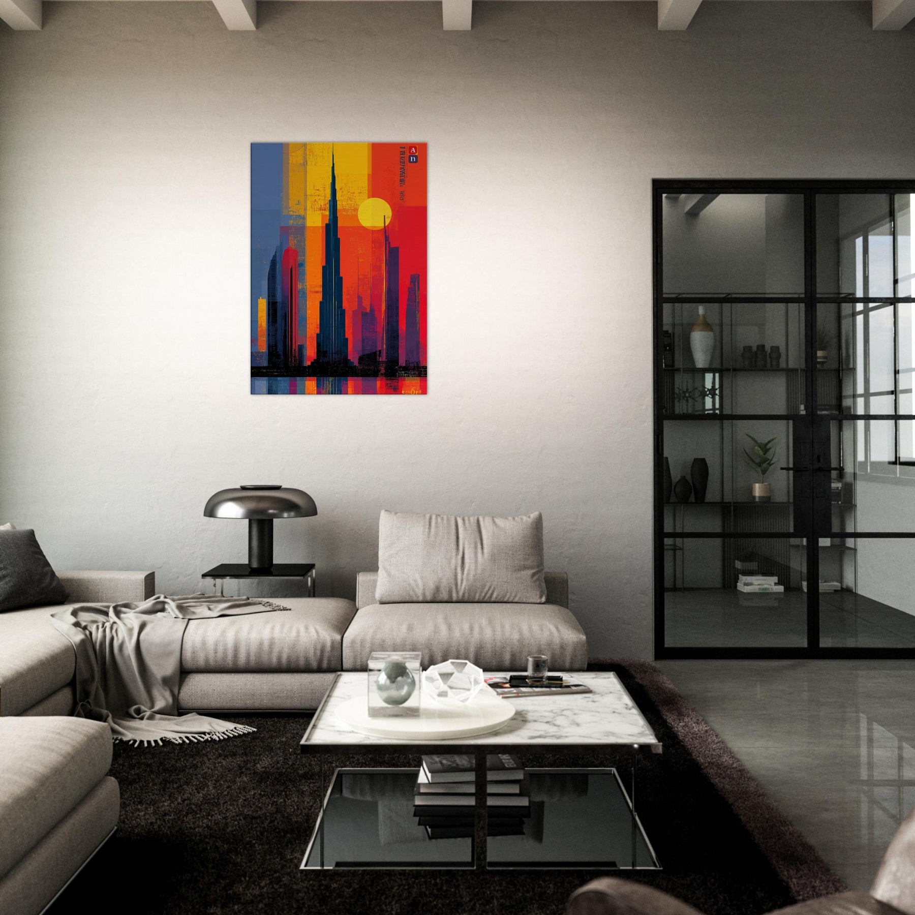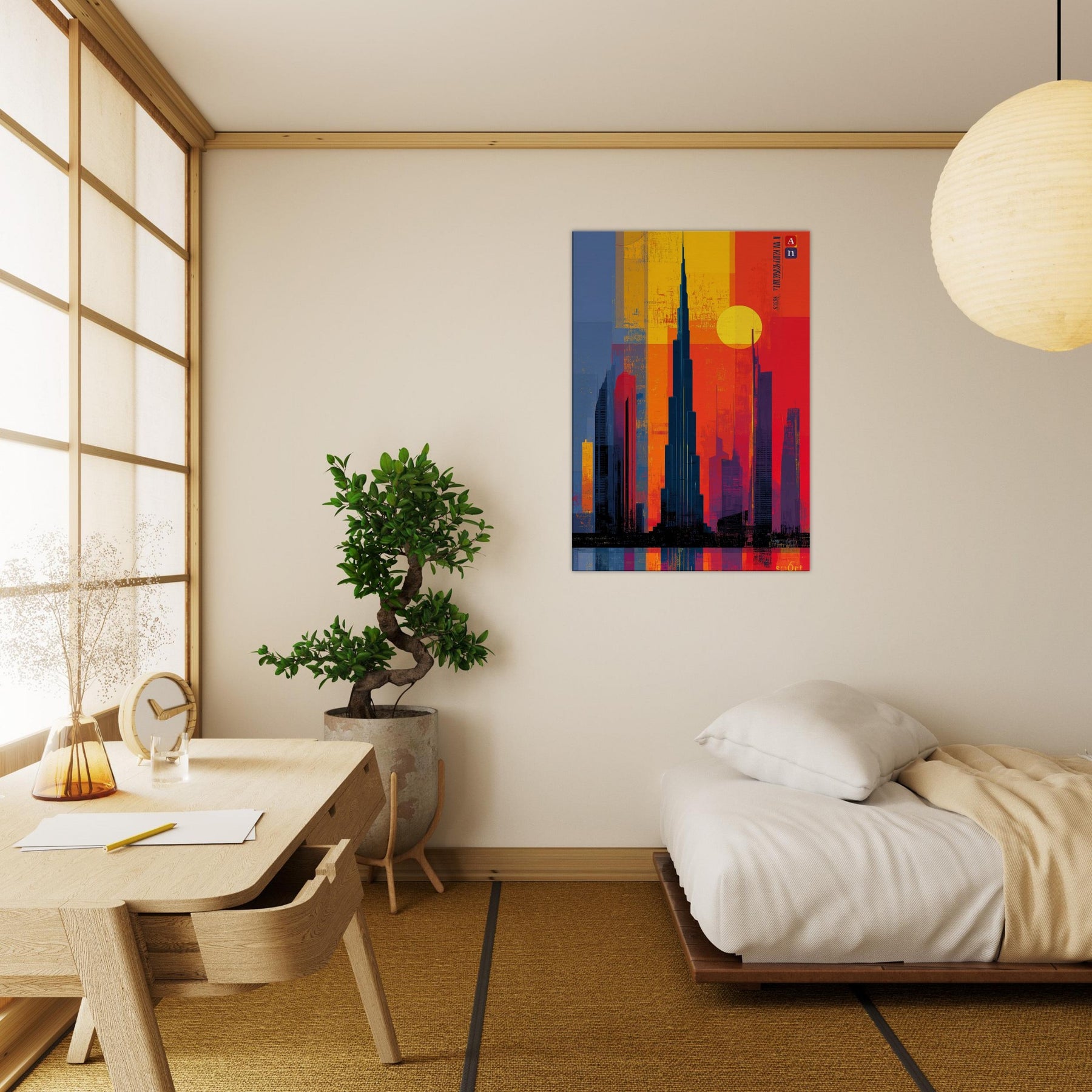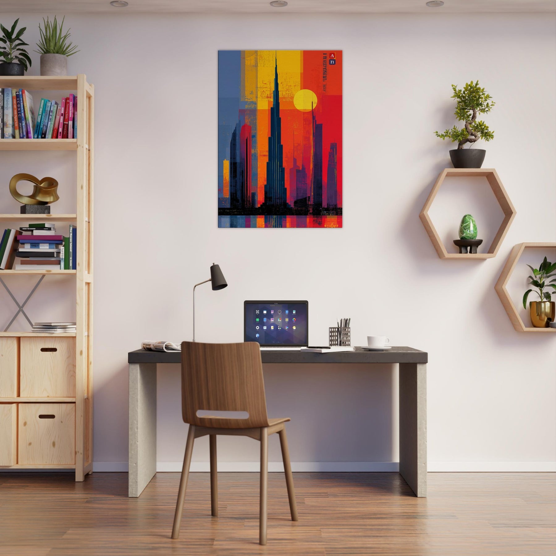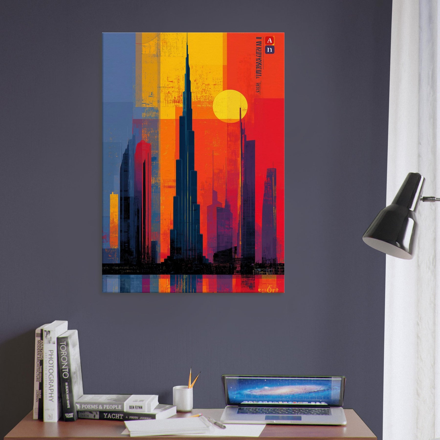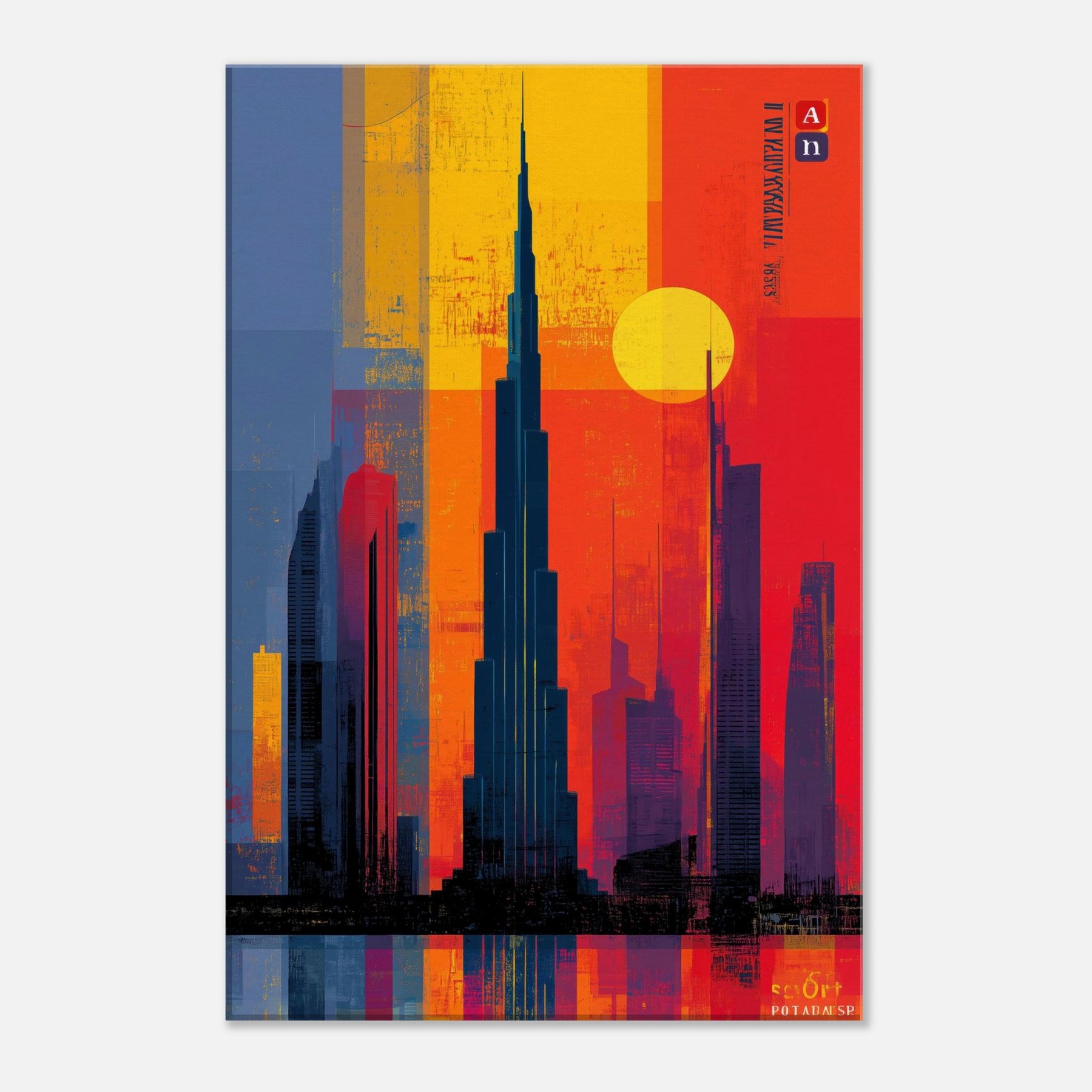 Immerse your space in the electric hush of a city at dusk. This abstract study of the Burj Khalifa frames a skyline of bold color blocks the glow of saffron, cobalt shadows, and molten rouge that feels like light bending around steel. The composition invites the eye to travel upward, to breathe in the warmth of evening air and the distant hum of a metropolis. A striking focal point that deepens rooms, elevates conversations, and turns a wall into a living moment of urban poetry.
