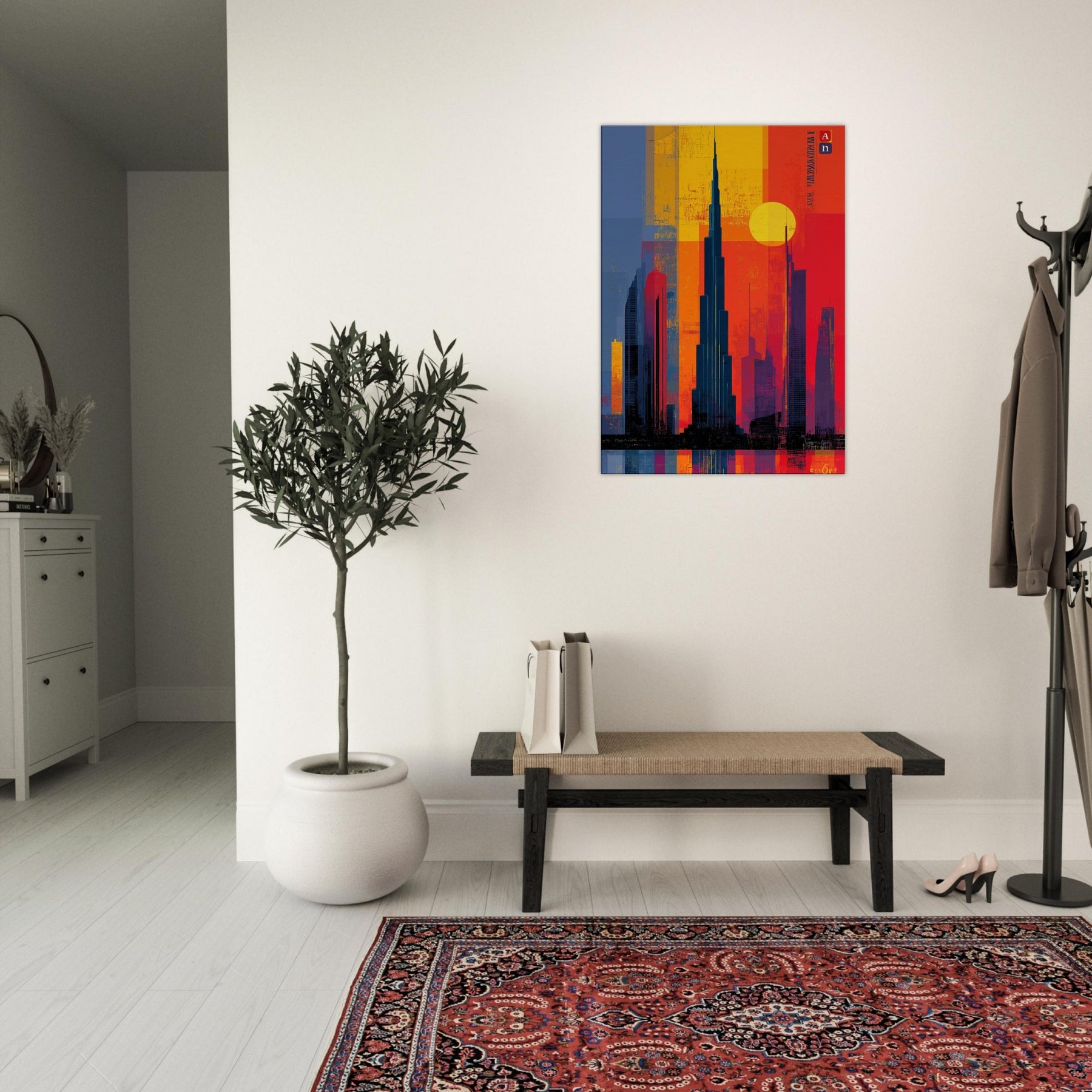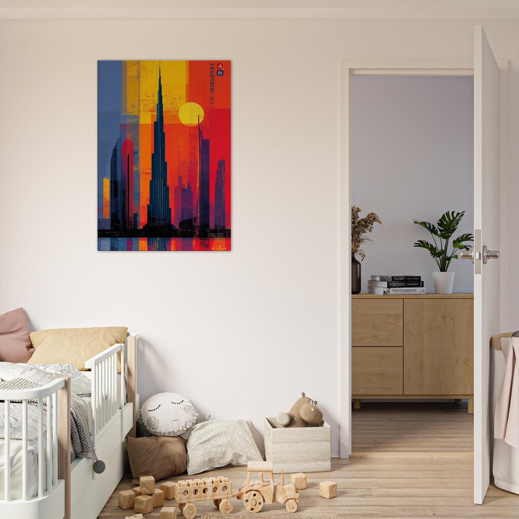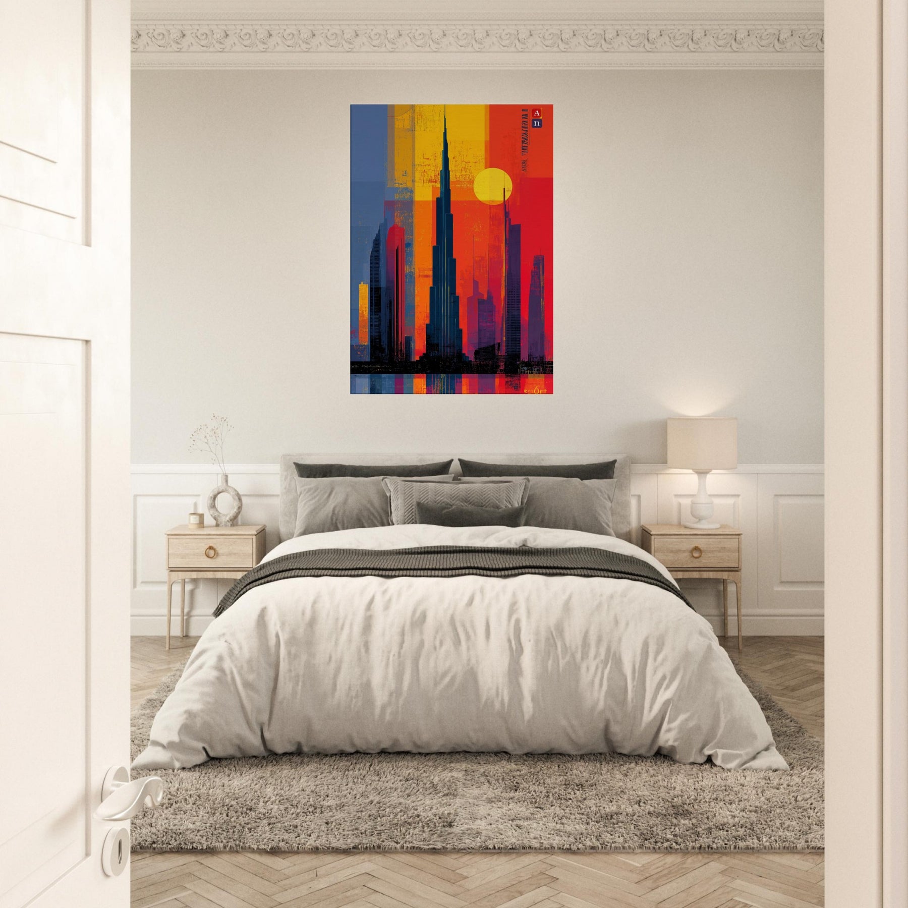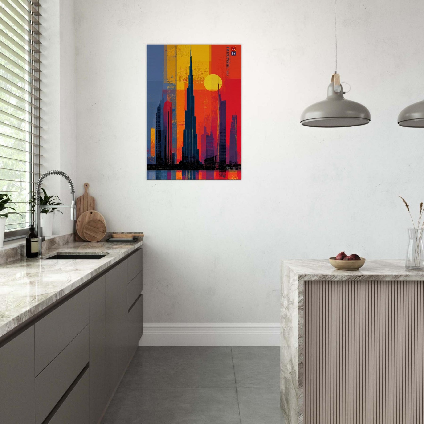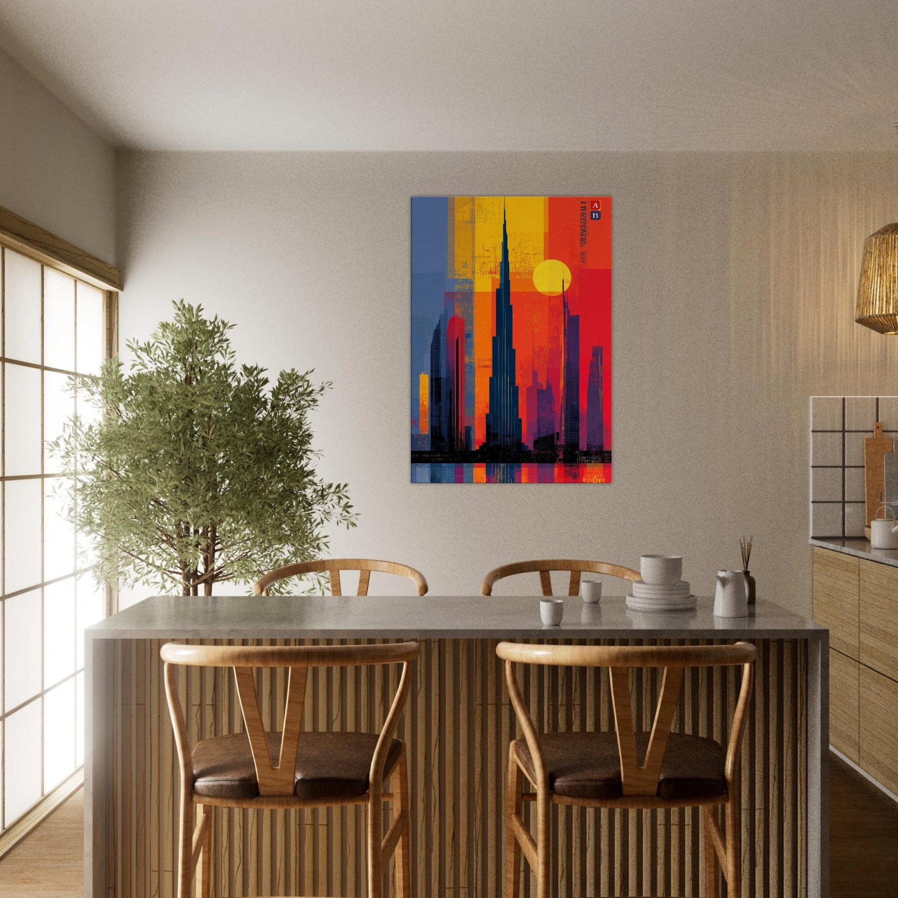 Immerse your space in the electric hush of a city at dusk. This abstract study of the Burj Khalifa frames a skyline of bold color blocks the glow of saffron, cobalt shadows, and molten rouge that feels like light bending around steel. The composition invites the eye to travel upward, to breathe in the warmth of evening air and the distant hum of a metropolis. A striking focal point that deepens rooms, elevates conversations, and turns a wall into a living moment of urban poetry.