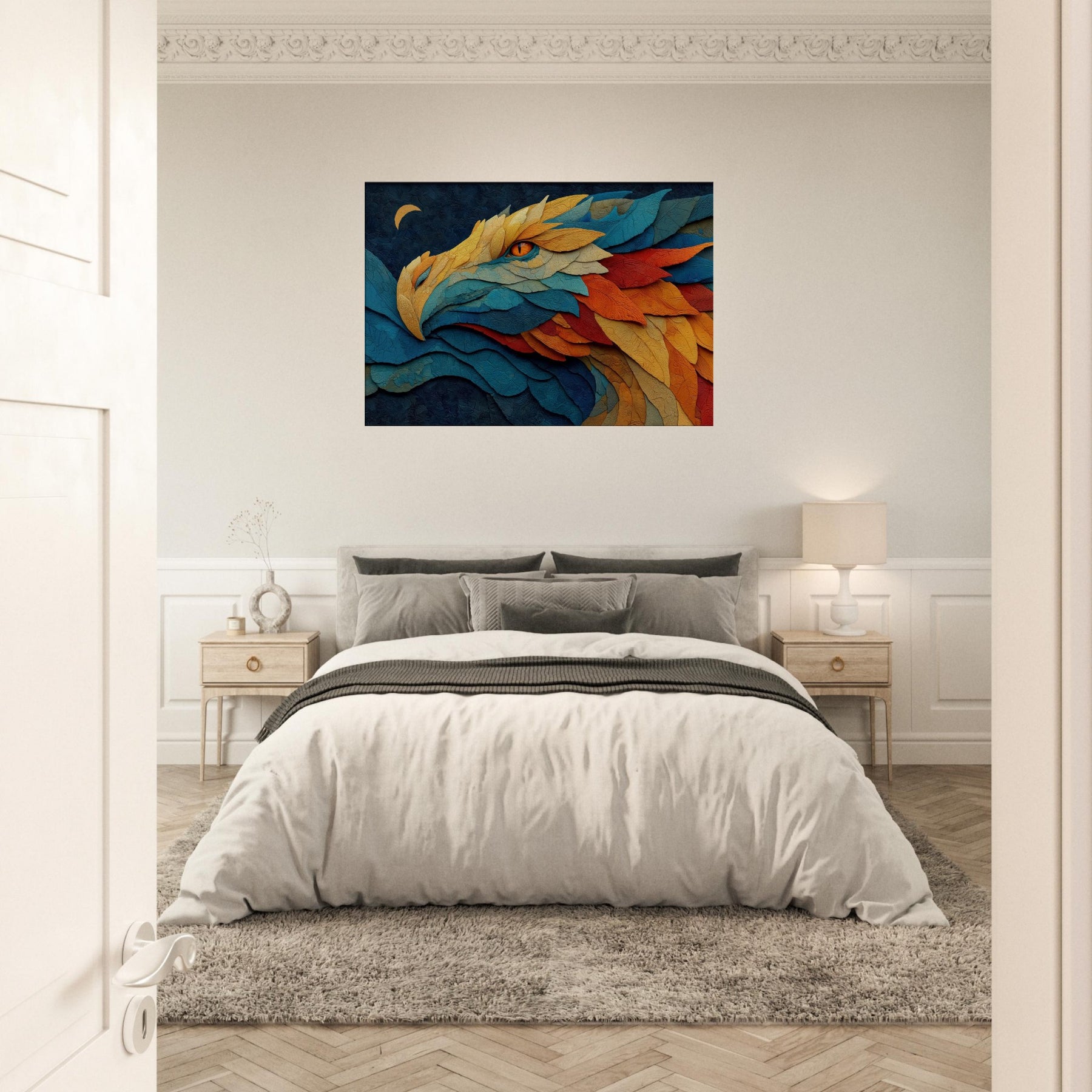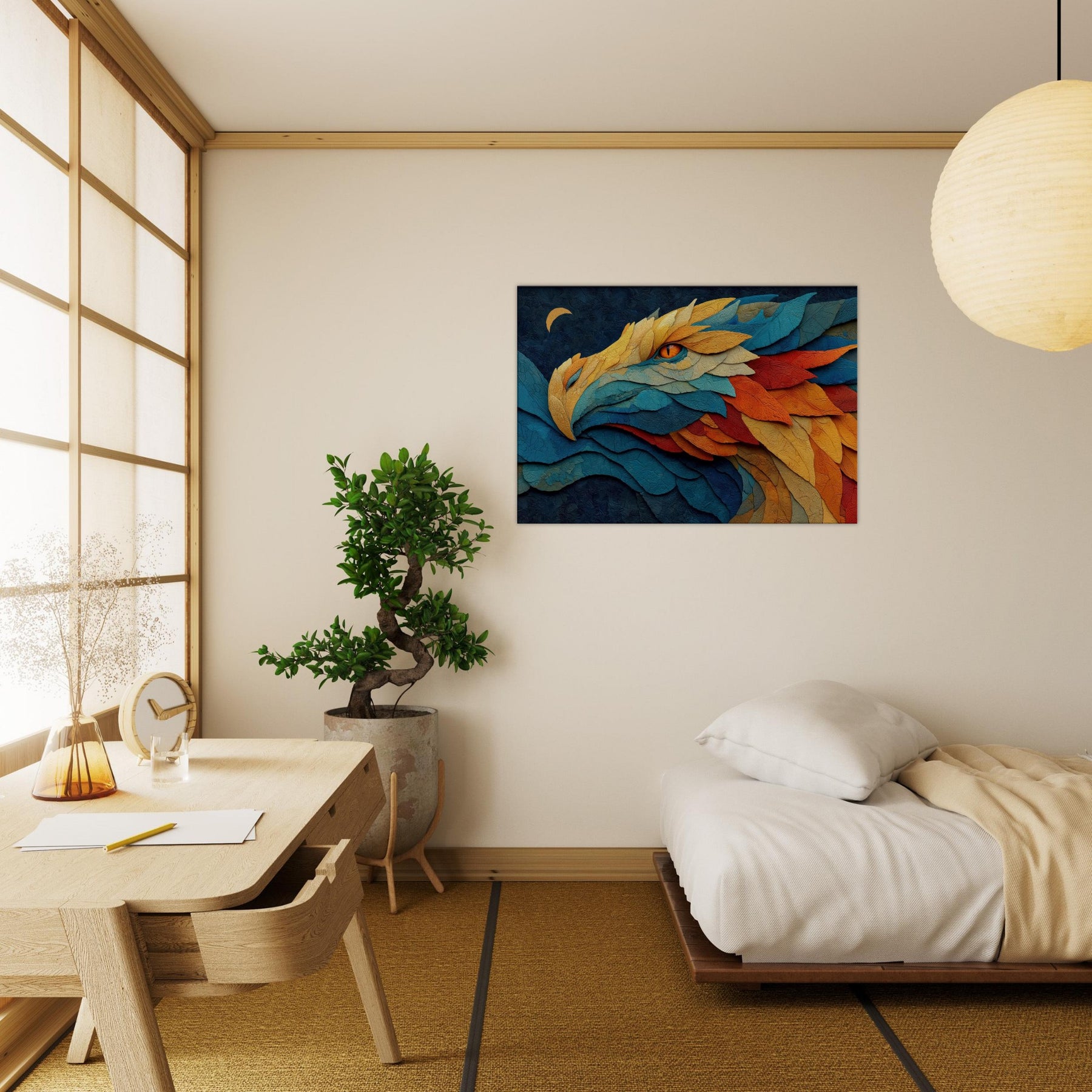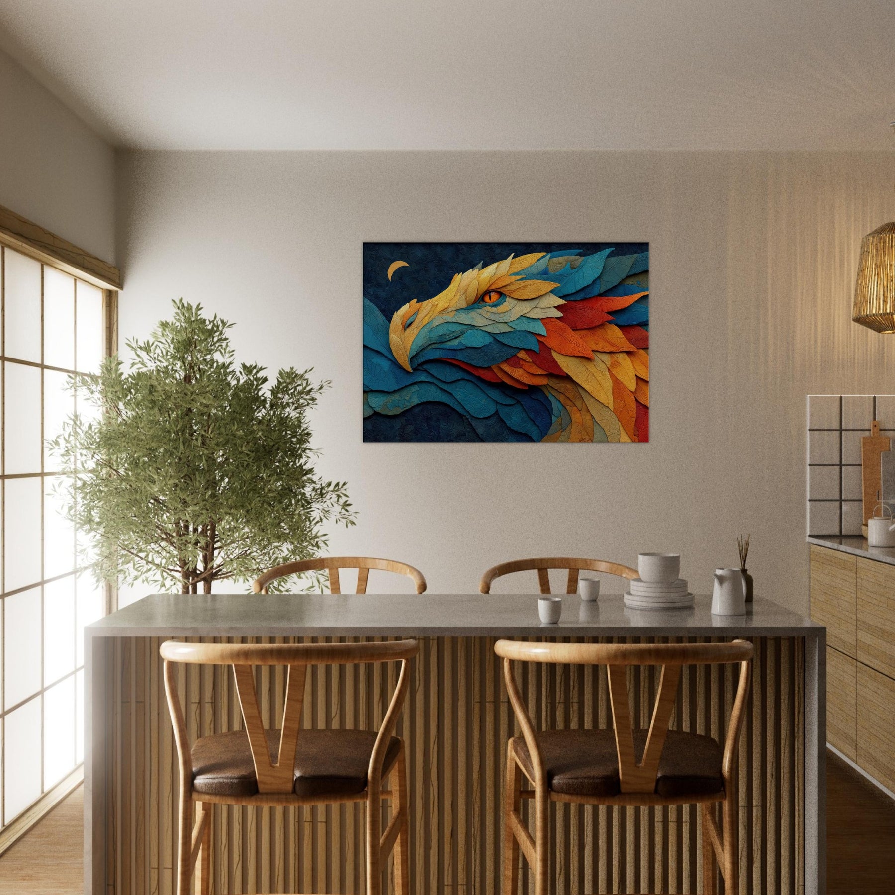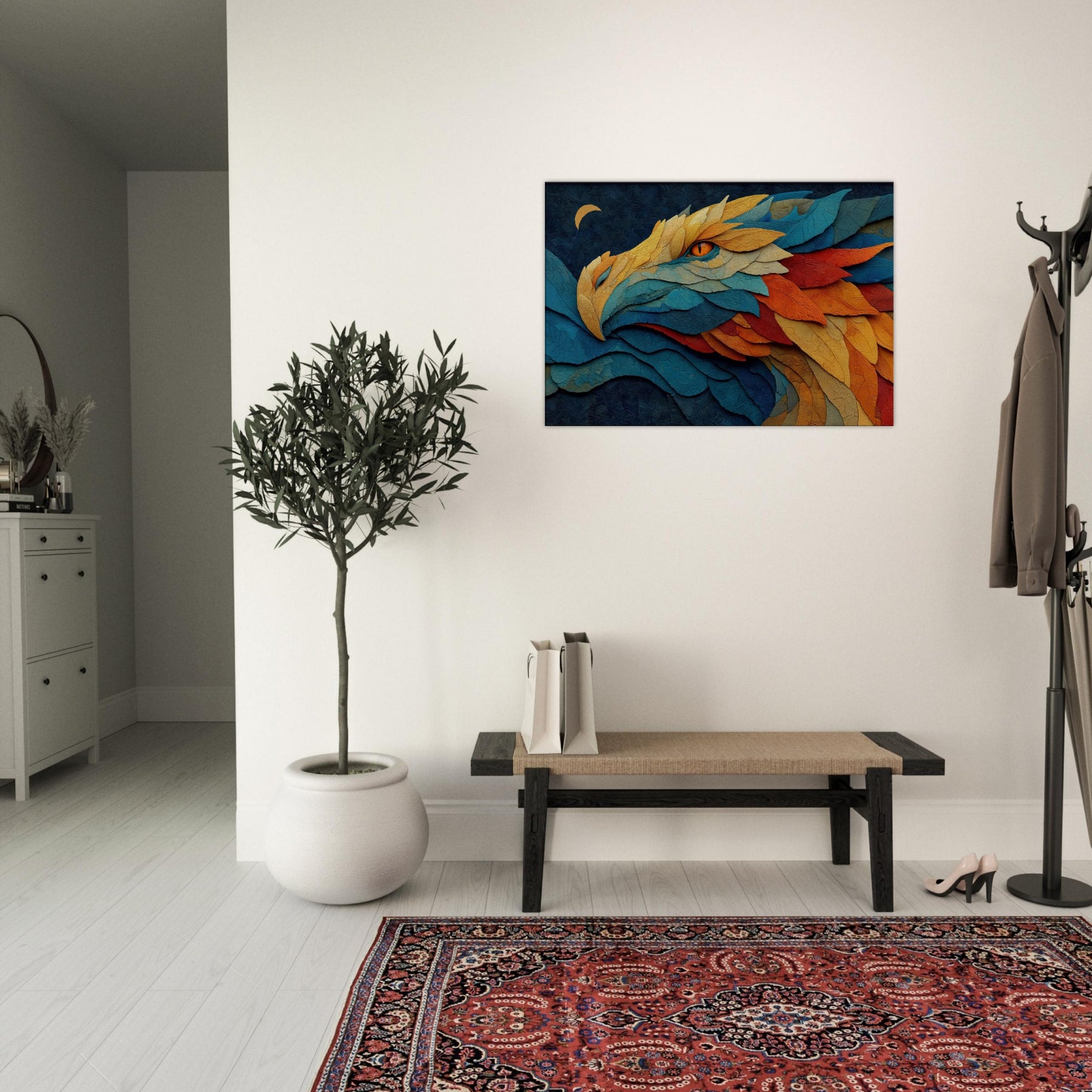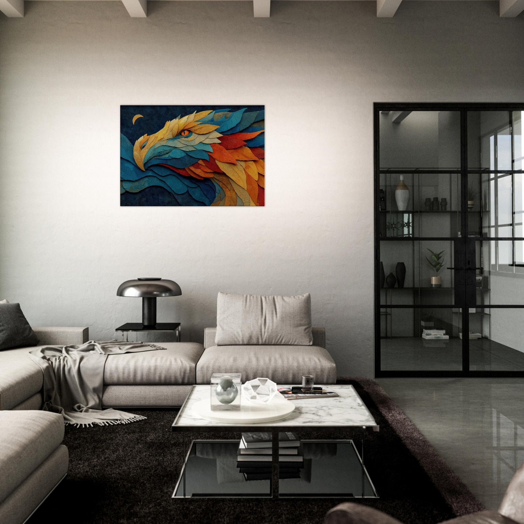 In this luminous homage to the Majestic Dragon, color and motion swirl into a single, breathy current of light. The abstract forms layer like scales of flame and sea, catching the eye with warm ambers, turquoise, and midnight blues. A moonlit eye anchors the scene, inviting quiet awe even in a bustling living room. Framed in soft shadows, it becomes a kinetic centerpiece a mood altering backdrop for conversation, dreams, and evenings when the space longs for mythic magic.