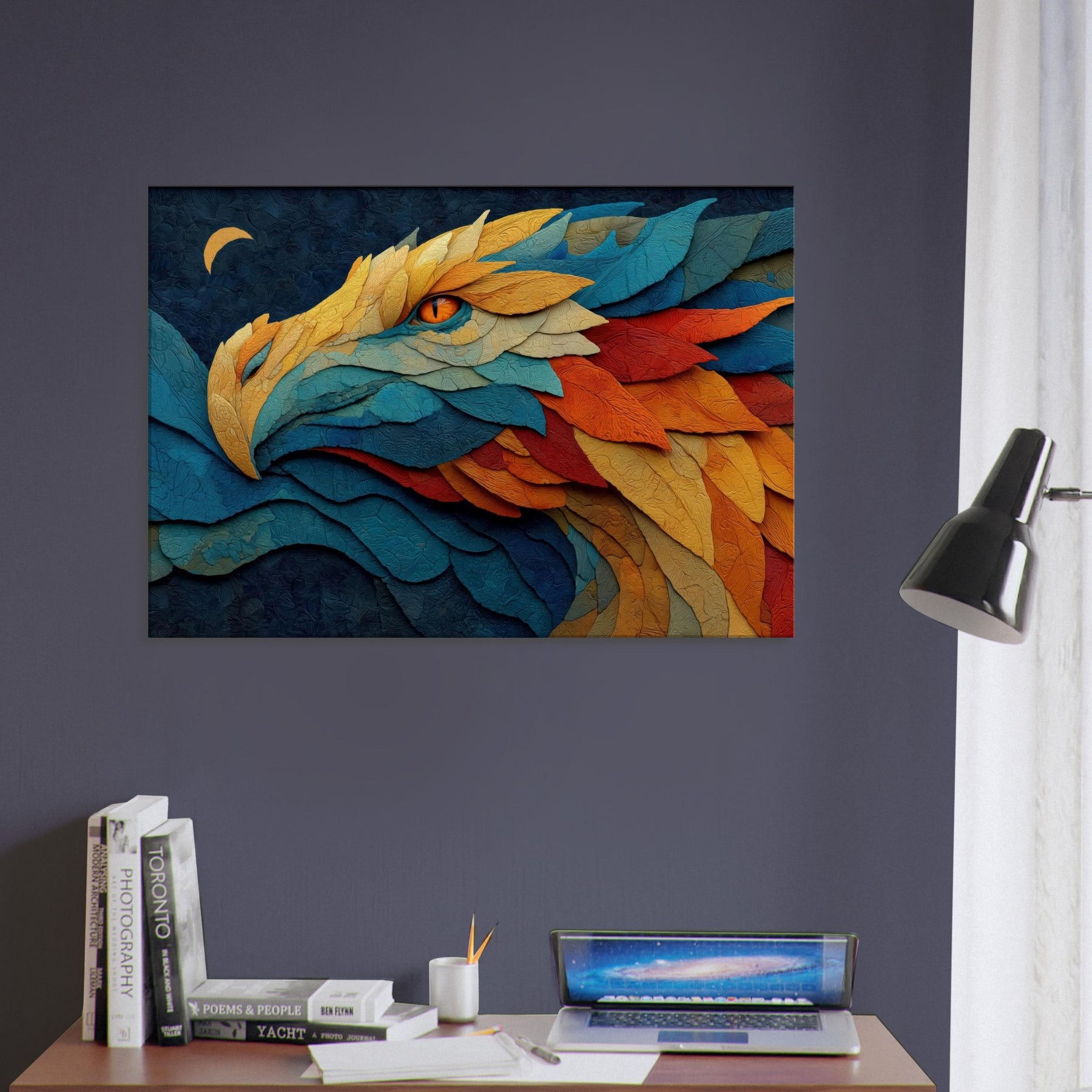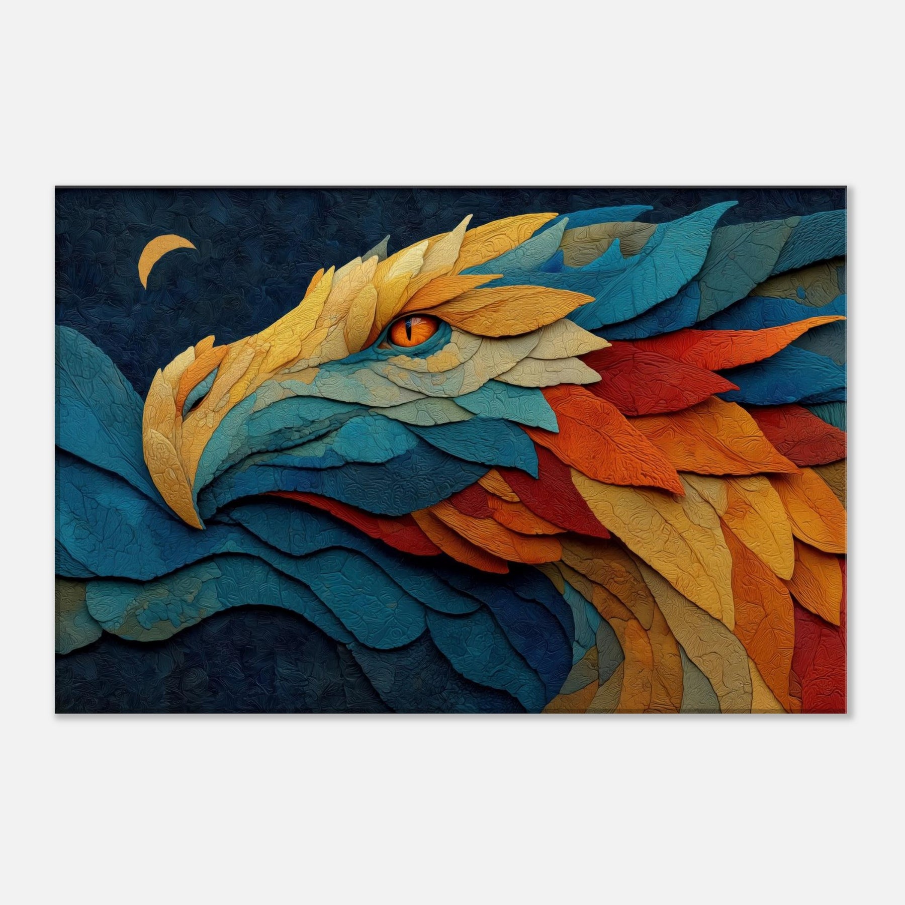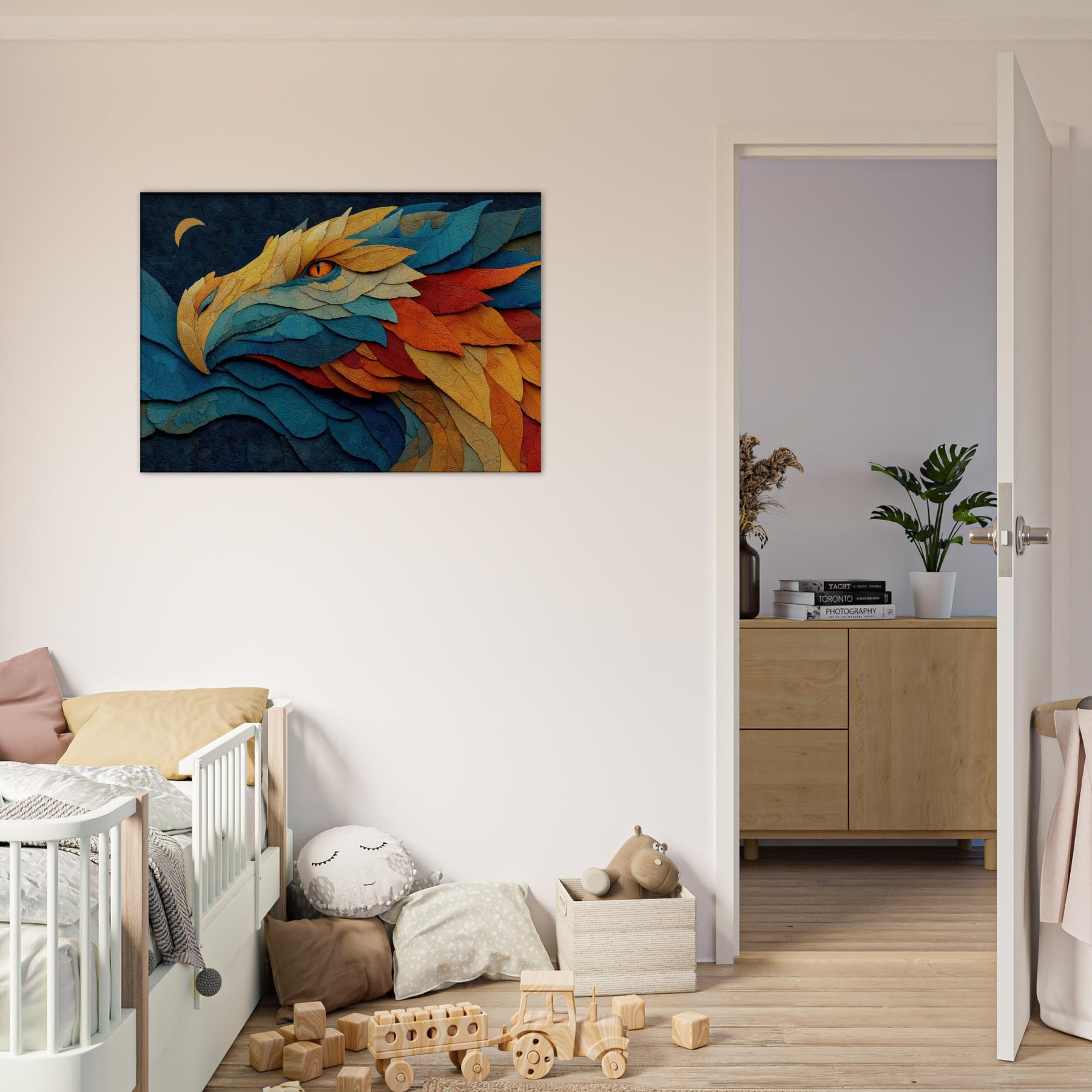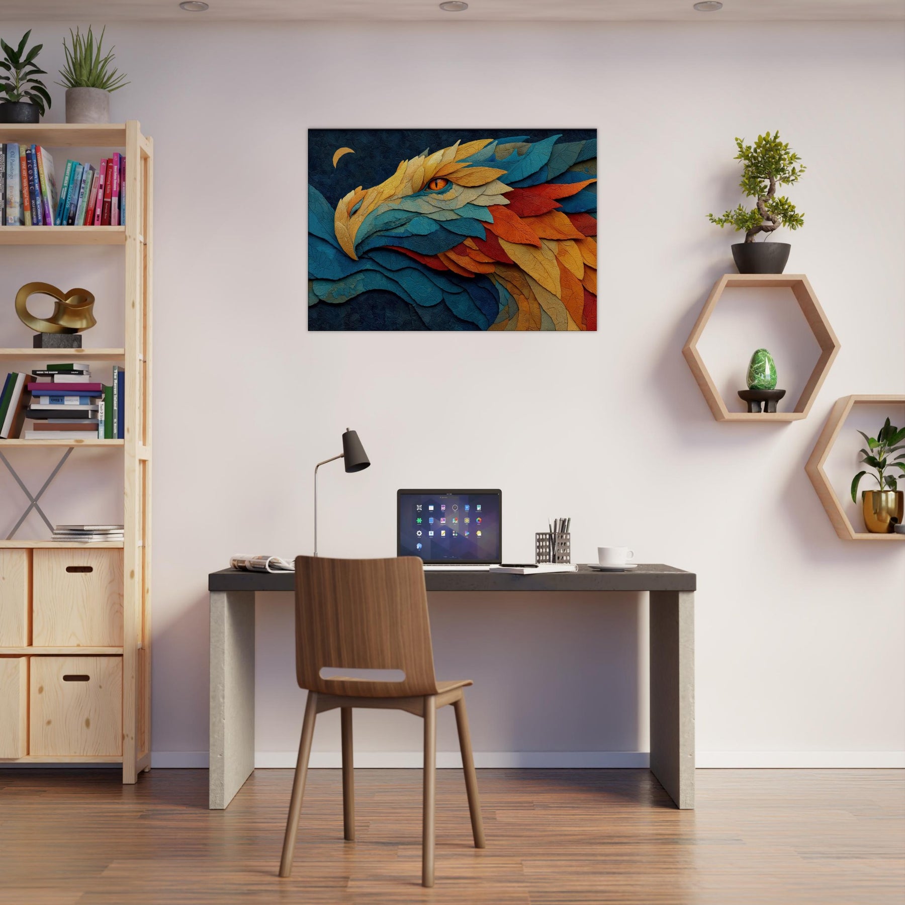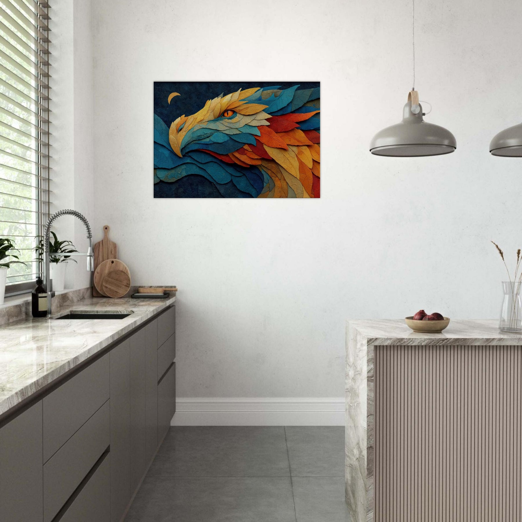 In this luminous homage to the Majestic Dragon, color and motion swirl into a single, breathy current of light. The abstract forms layer like scales of flame and sea, catching the eye with warm ambers, turquoise, and midnight blues. A moonlit eye anchors the scene, inviting quiet awe even in a bustling living room. Framed in soft shadows, it becomes a kinetic centerpiece a mood altering backdrop for conversation, dreams, and evenings when the space longs for mythic magic.