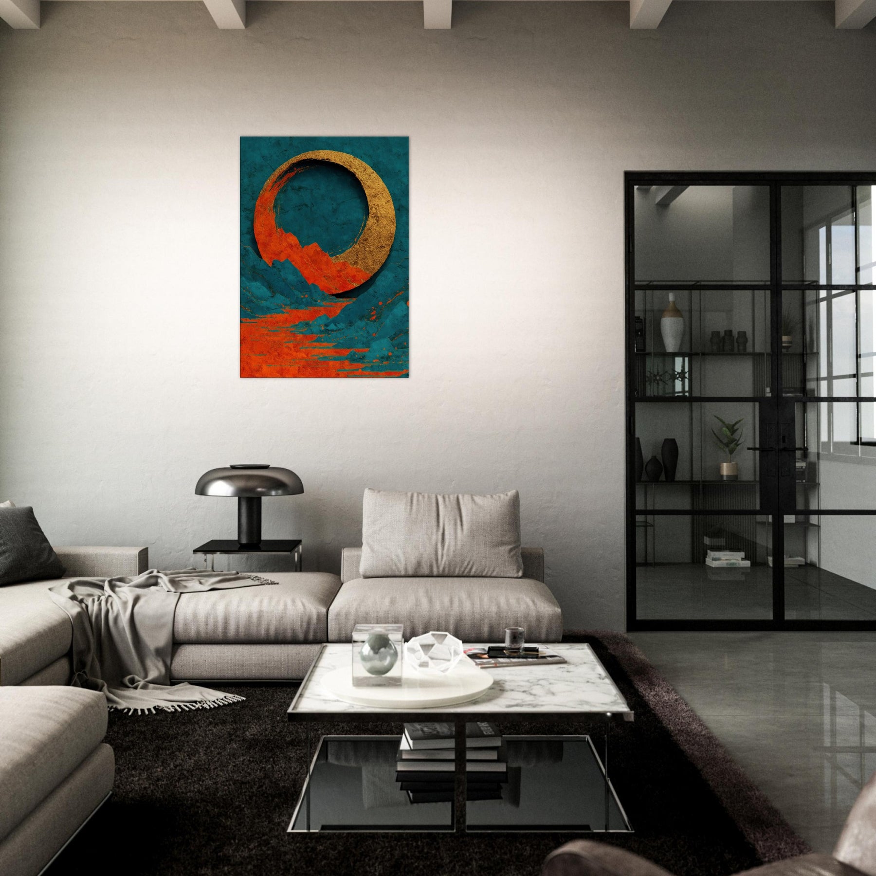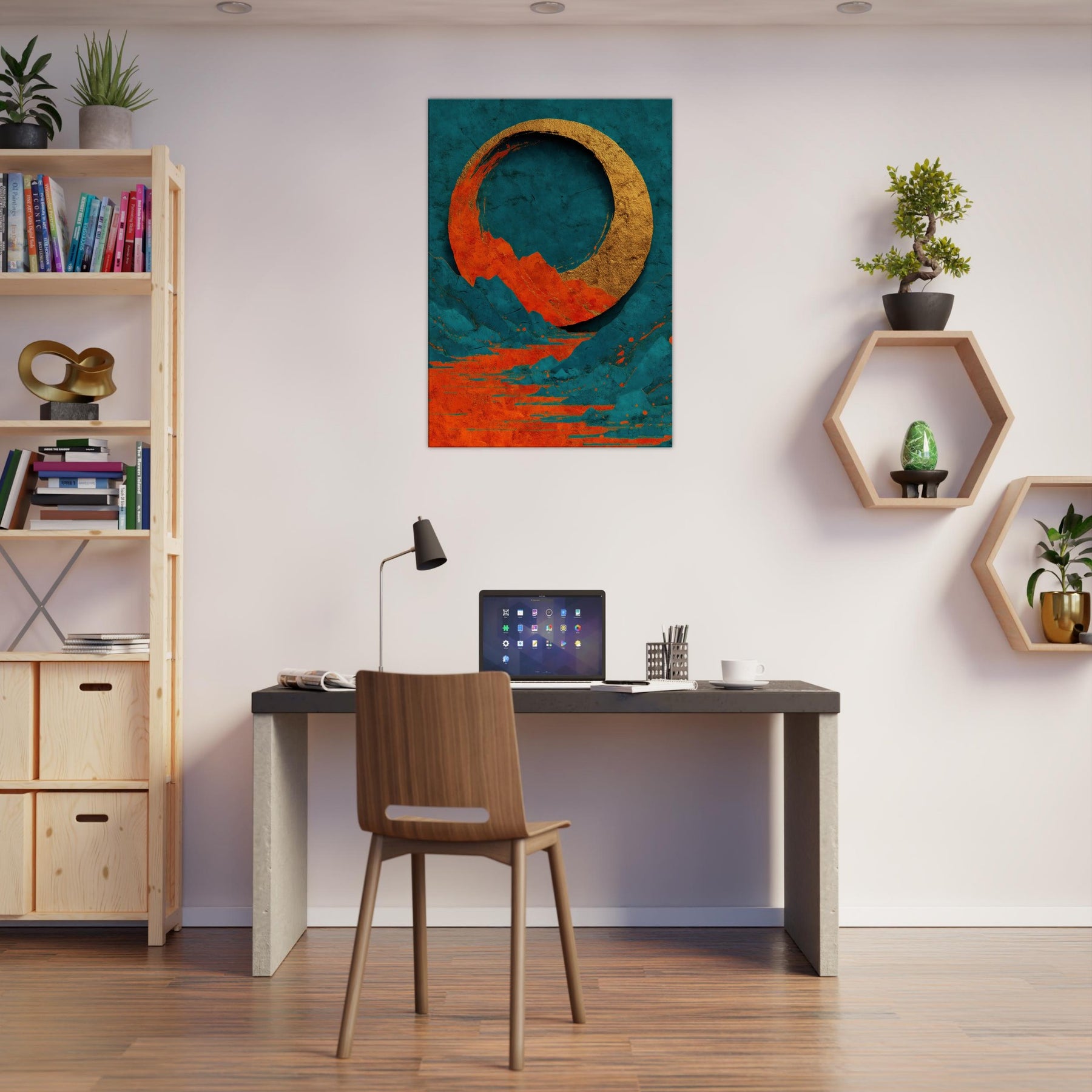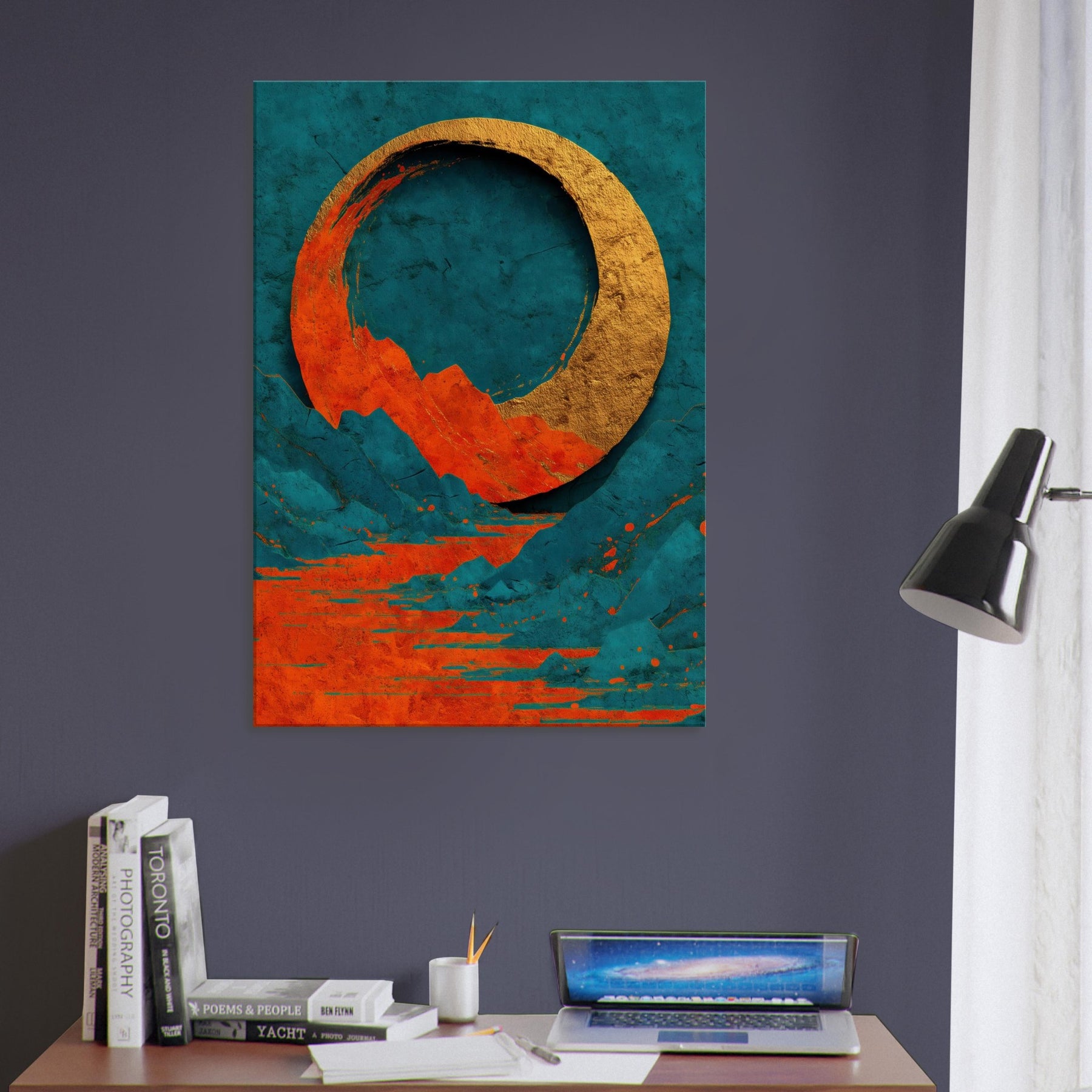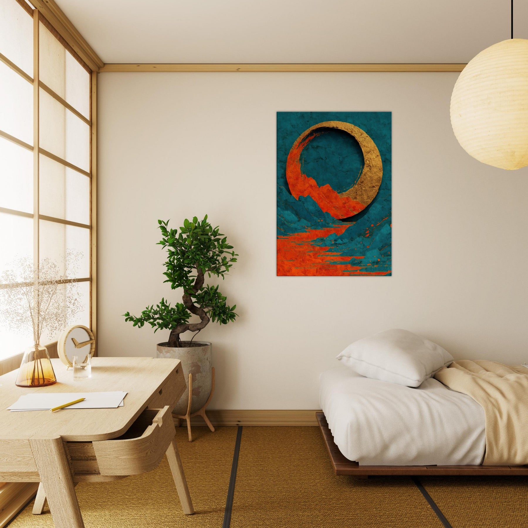 Ensō (Zen Circle) unfurls as a radiant, meditative trace across a field of teal and copper. The circle hovers like a moon above a quiet sea, while fractured strokes below summon wind and water into a single, breath held moment. This abstract, mystical composition invites contemplation, turning a living room wall into a sanctuary of stillness and focus. Pair it with warm wood tones or cool neutrals to amplify contrast, letting the piece seep calm into evenings and bright mornings alike.
