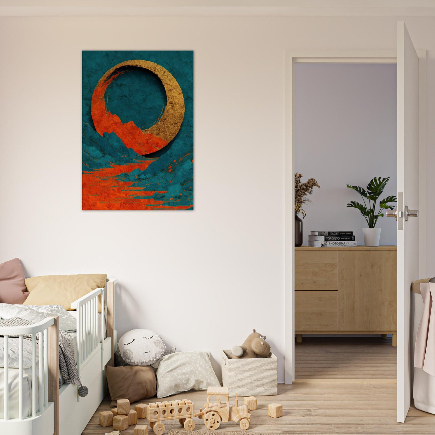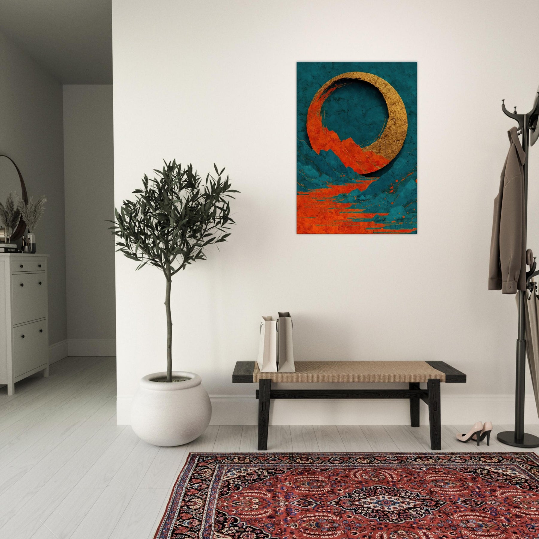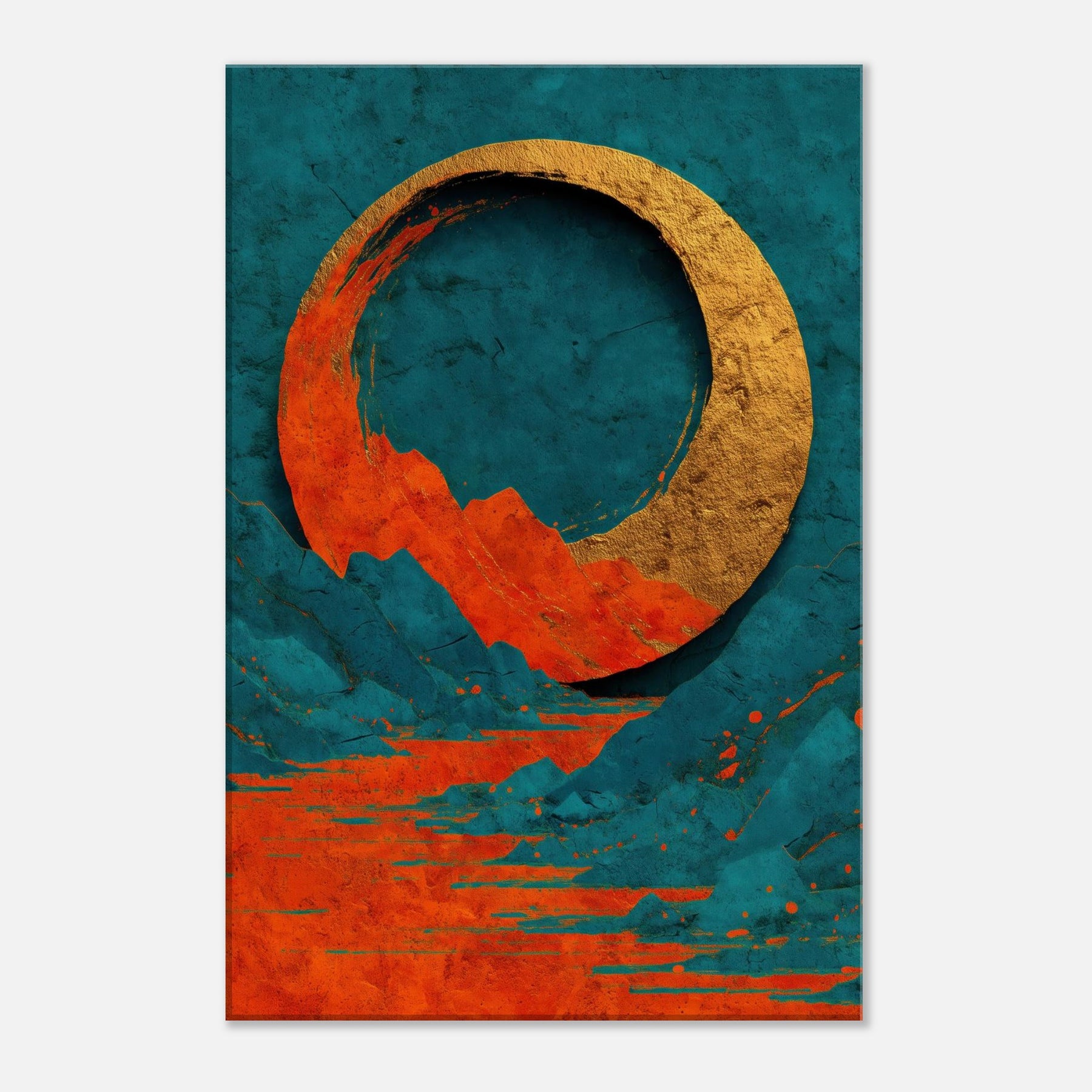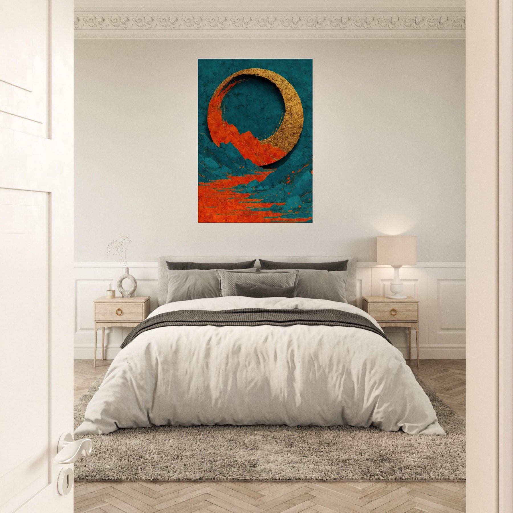 Ensō (Zen Circle) unfurls as a radiant, meditative trace across a field of teal and copper. The circle hovers like a moon above a quiet sea, while fractured strokes below summon wind and water into a single, breath held moment. This abstract, mystical composition invites contemplation, turning a living room wall into a sanctuary of stillness and focus. Pair it with warm wood tones or cool neutrals to amplify contrast, letting the piece seep calm into evenings and bright mornings alike.