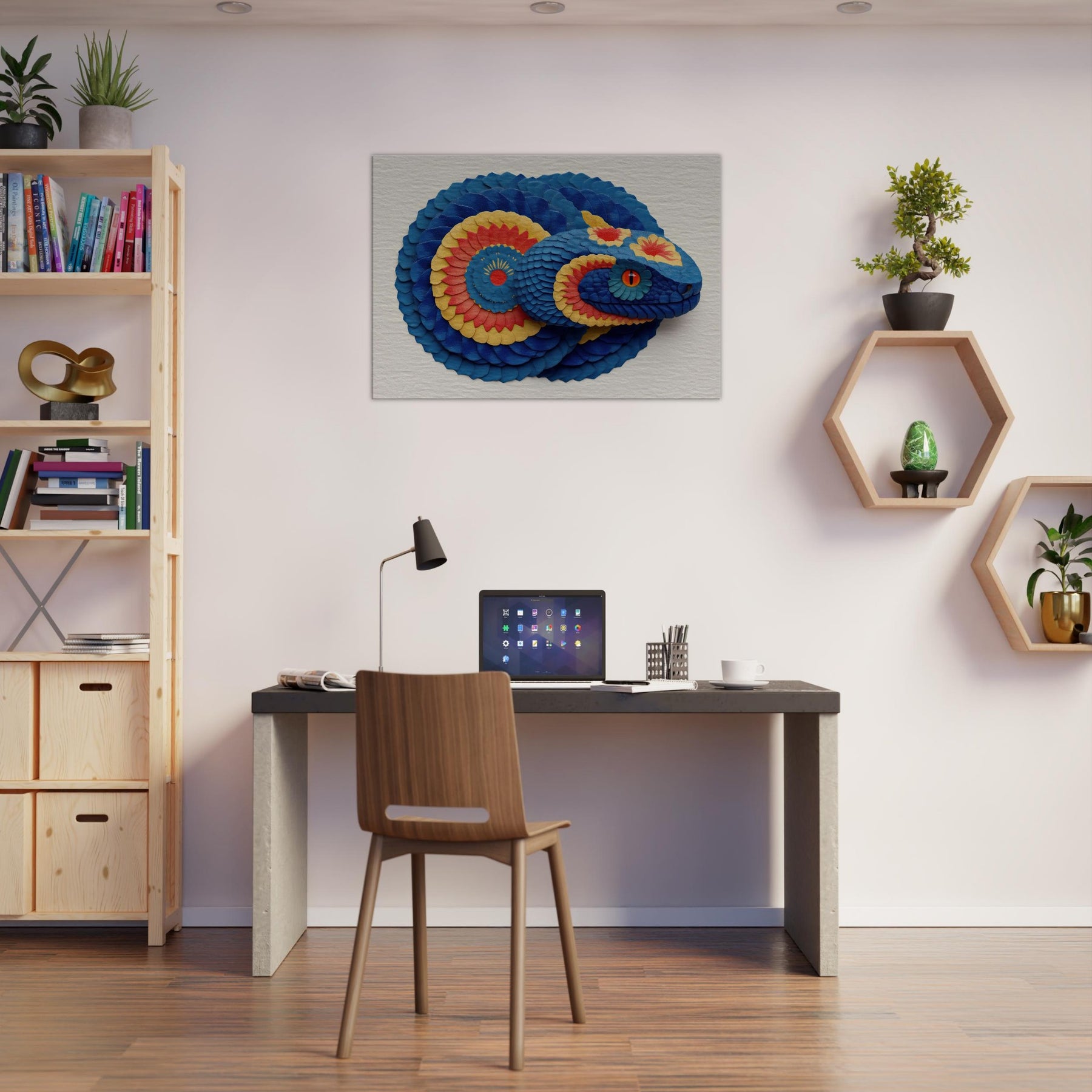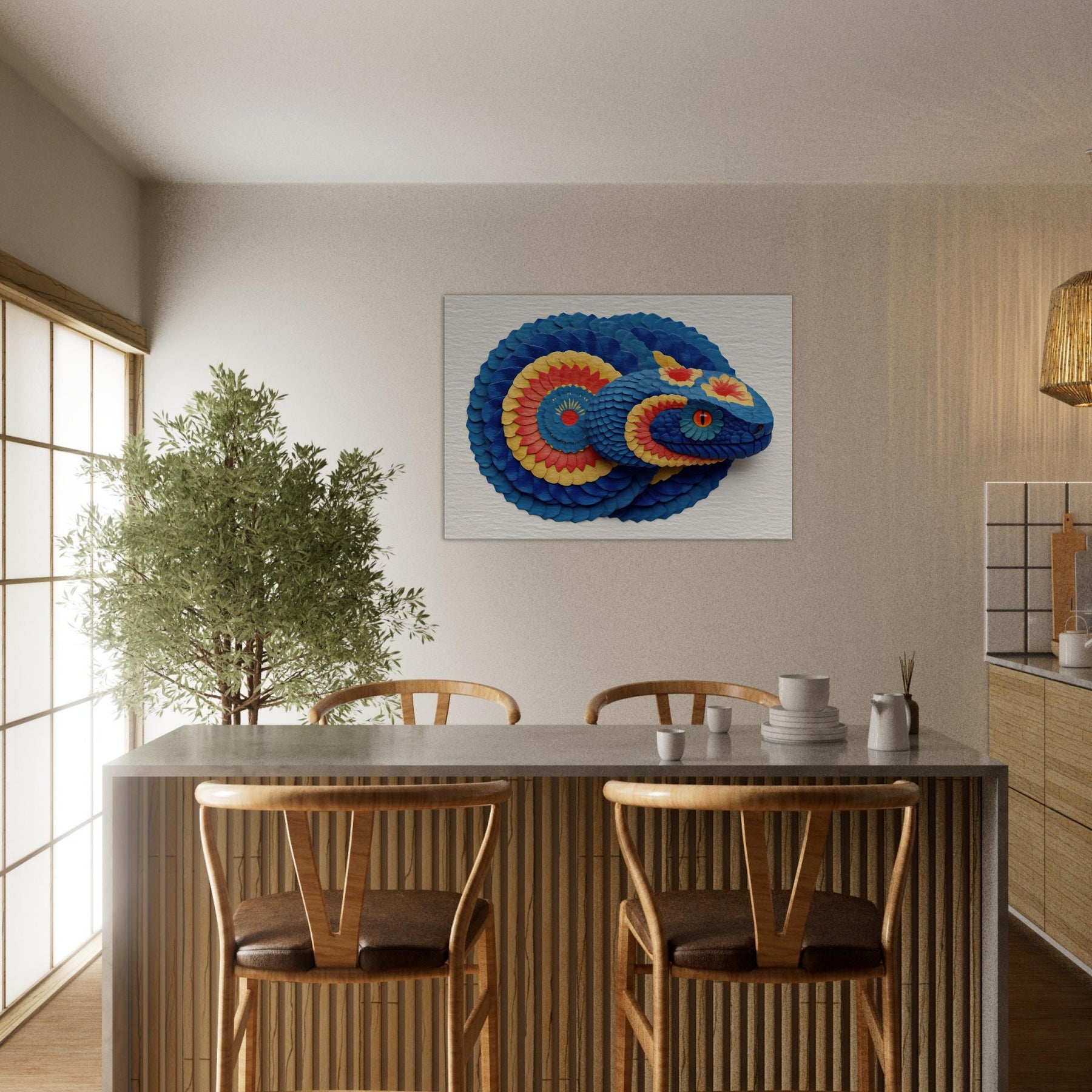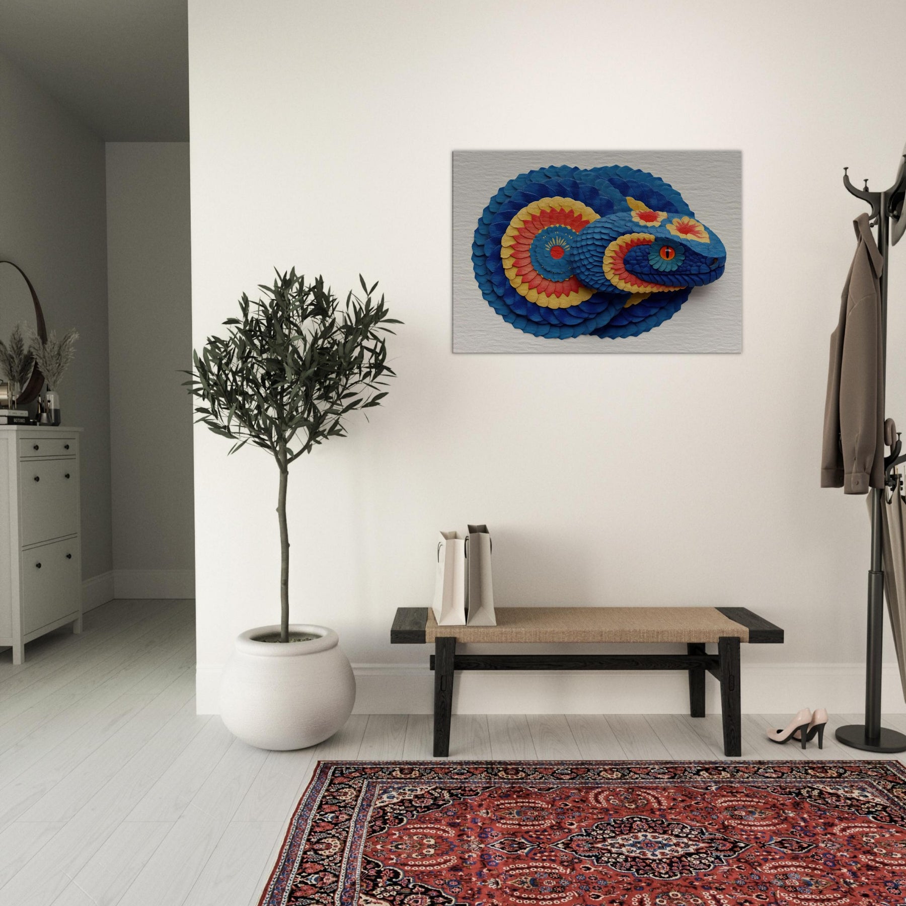 Infinity Serpent unfurls in a luminous spiral, a festival of color that hums beneath the surface of your room. Crafted as an abstract, scaled form, it shifts from cobalt to sunlit yellow and coral, each ring echoing a heartbeat. The piece bathes walls in a mystical glow, turning quiet evenings into rituals of presence and wonder. Place it above a sofa or in a foyer to invite contemplative calm, a magnetic focal point that deepens any contemporary space.
